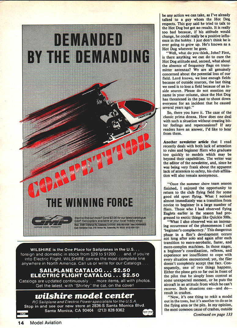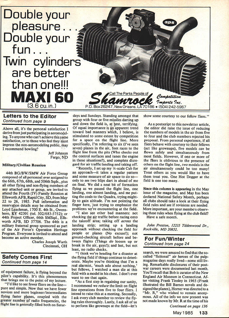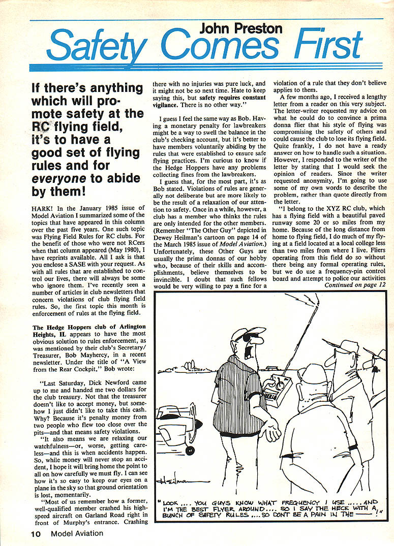John Preston Safety Comes First theres anything will pro mote safety RC flying field its have good set flying rules everyone abide HARK January 1985 issue Model Aviation summarized some topics have appeared column over past five years such topic Hying Field Rules RC clubs benefit RCers column appeared May 1980 have reprints available ask enclose SASE request As rules established con trol lives will always some ignore Ive recently seen number articles club newsletters concern violations club flying field rules So first topic month enforcement rules flying field Hedge Hoppers club Arlington Heights IL appears have obvious solution rules enforcement mentioned clubs Secretary Treasurer Bob Mayhercy recent newsletter Under title View Rear Cockpit Bob wrote Last Saturday Dick Newford came up handed two dollars club treasury treasurer doesnt like accept money some just didnt like take cash Because its penalty money two people flew too close over pitsand means safety violations also means relaxing watchfulnessor worse getting care lessand accidents happen So money will never stop acci dent hope will bring home point carefully must fly can see its easy keep eyes plane sky ground orientation lost momentarily Most us remember former well-qualified member crashed highspeed aircraft Garland Road right front Murphys entrance Crashing no injuries pure luck might next time Hate keep saying safety requires constant vigilance no other way guess feel same way Bob Hav ing monetary penalty lawbreakers might way swell balance clubs checking account its better have members voluntarily abiding rules established ensure safe flying practices Im curious know Hedge Hoppers have problems collecting fines lawbreakers guess part its Bob stated Violations rules gener ally deliberate likely result relaxation atten tion safety Once however club has member thinks rules intended other members Remember Other Guy depicted Dewey Heilmans cartoon page 14 March 1985 issue Model Aviation Unfortunately Other Guys usually prima donnas hobby because skills accom plishments believe themselves invincible doubt such fellows would very willing pay fine violation rule dont believe applies few months ago received lengthy letter reader very subject letter-writer requested advice what could convince prima donna flier style flying compromising safety others could cause club lose its flying field Quite frankly have ready answer handle such situation However responded writer letter stating would seek opinion readers Since writer requested anonymity Im going use some own words describe problem rather quote directly letter belong XYZ RC club has flying field beautiful paved runway some 20 miles home Because long distance home flying field much fly ing field located local college less two miles live Fliers operating field being formal operating rules use frequency-pin control board attempt police activities Continued page 12 . a~ L4YS 14OW HAr Ft4eNCY USE t M 114E BEST F1.VER AUND.. THE HCZ WITH BLJNCI4 C SAFElY RULES..SD CMrEAPAJN N ThE odel Aviation Plans Accessories 516-234-5038 by Nick Ziroli 29 Edgar Dr Smlthtown NY 11787 USA Fiberglass CowlingsAll Balsa Canopies Available s sent Post-Paid within USA Send 22 stamp Full Catalog A6M5ZERO2Y191Span$2700 F4U CORSAIR2193 Span$2700 CURTISS P402% 1 94 Span$2700For RK-20 RK-740 Ducred Fans AT-8TEXAN24 1 101Span$2700F4PHANTOM$850 F8FBBARCAT2% 1 86 Span$2700 FOKKER DR-i271 63 Tripe$250035 Wing Span400 sq Wing Area SOPWITH TABLOID Quarter Scala77 Span$2400SAAB 37 VIGGEN$850 SOPWITI4 TABLOID 2% Span$180032 Wing Span400 sq Wing Area Practical Sized Giant Scale Models Popular Aircraft regarding safety 13 years Ive flown college field have very few safety-related incidents feel record field excellent considering volume flying takes place bulk fliers AMA members good job pro moting AMA safety Now problem have recurring problem individual mid-twenties has flying RC since about five years old give credit due must say probably best flier area flies Pattern extreme proficiency has won contests over years both state neighboring state thing prevents him becoming Worldclass flier time money can fly anything Gliders Helicopters very proficiently problem Oscar Mayer Syndrome Hot Dog must king cheese wherever goes knows good Ask him hell tell newer fliers field will ooh ahh ability very impressive first glance possesses unmatched air confidence places 1 1Oo confidence equipment problem flier has group cronies tag along him will never fraction good pilot try Oh try accident group ies trying emulate him groupie going roll takeoff soon airplane high enough wing tip clear ground Well airplane got cattywampus impacted door car about $200 damage car airplane nar rowly missed several people standing near car including four-year-old boy incident have several other less-serious occur rences Im afrmd big yet happen recent fad guy group ies put frequency flags transmitters rationale behind Without frequency flags other fliers forced ask what frequency Vhen received reply just kept cool walked away guy flies field partially because locale mainly because no formal controls field has censured XYZ field because incidents non-conform ity under no formal agreement college time could say dont want anymore Hot Dog knows knows wont go college officials problem because possi bility losing field Therefore other fliers walk around white-knuckled because antics basically beyond reproach doesnt seem Continued page 14 12 Model Aviation Giant Scale Models action can take Ive already talked guy Hot Dog respects guy said tried talk Hot Dog got no results really too bad because attitude would change could really positive influ ence hobby just dont think ever going grow up Hes known Hot Dog wherever goes Well what think John First anything can cure Hot Dog attitude second what about absence frequency flags trans niitter antennas genuinely concerned about potential loss field Lord knows lose enough fields because outside sources last thing need los
