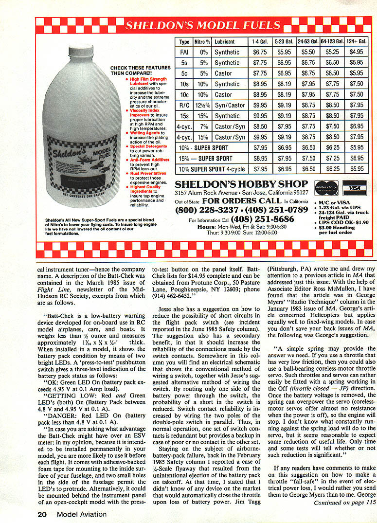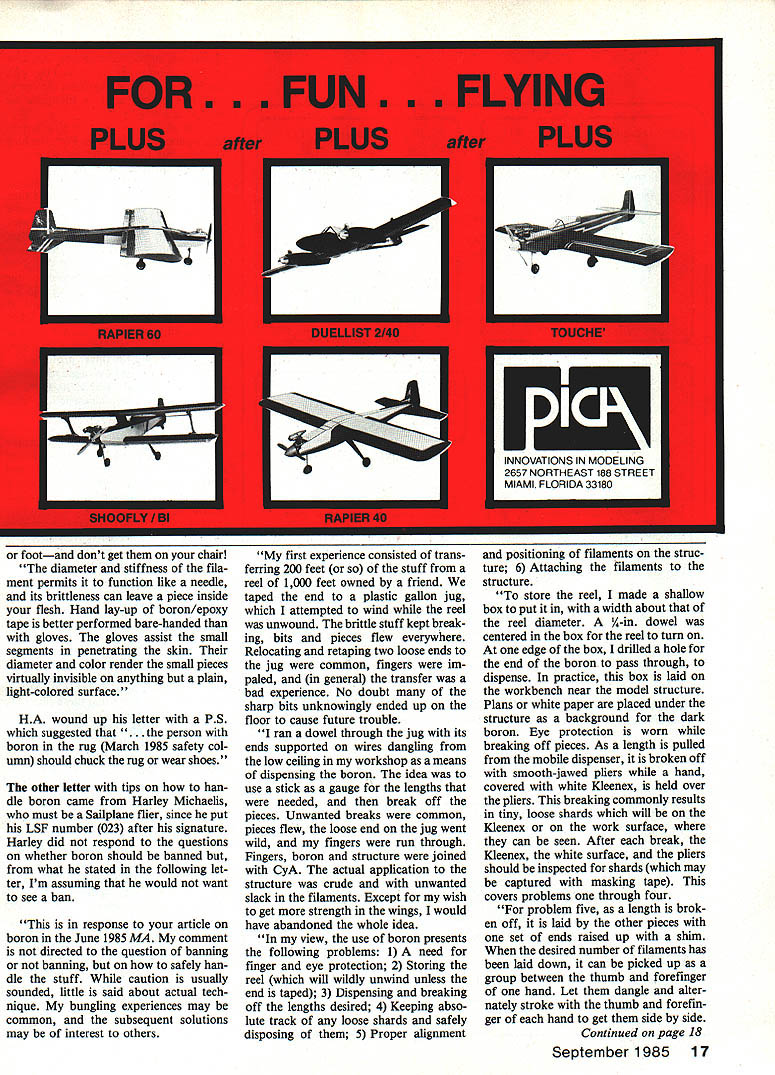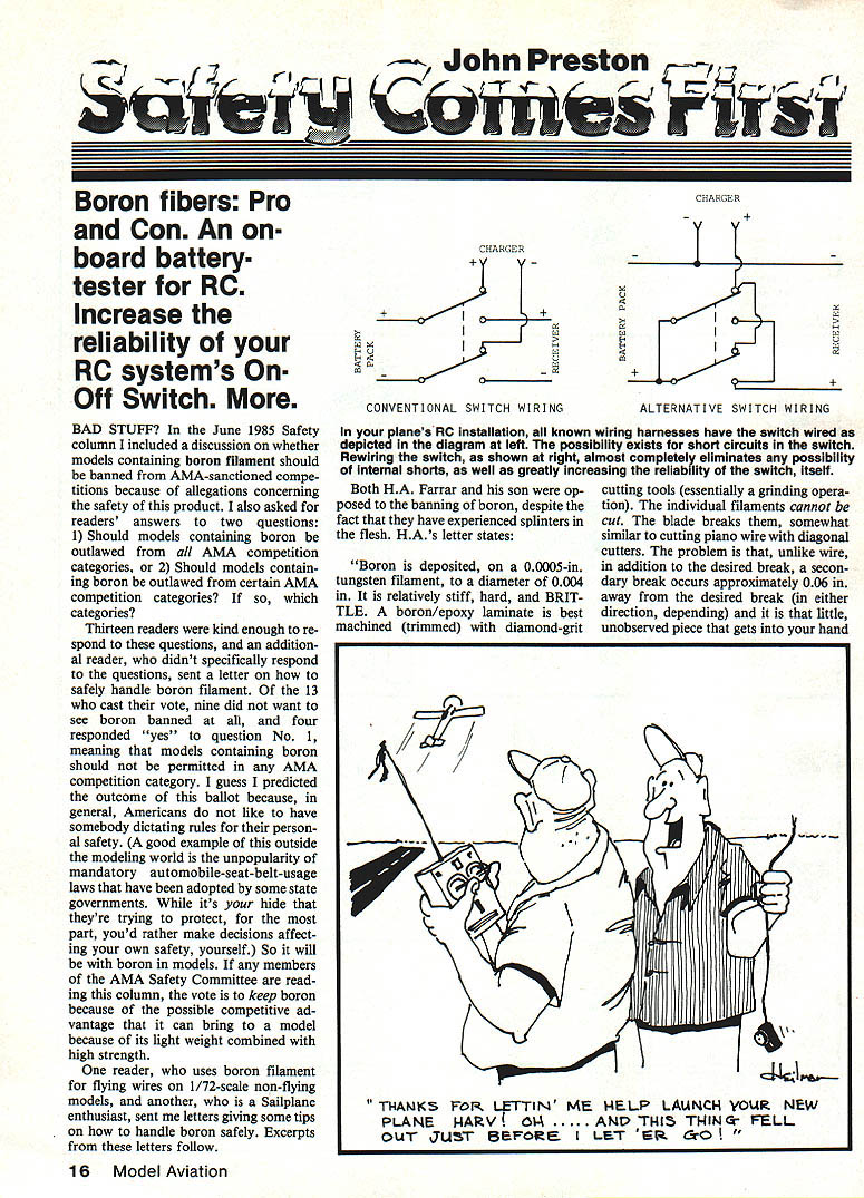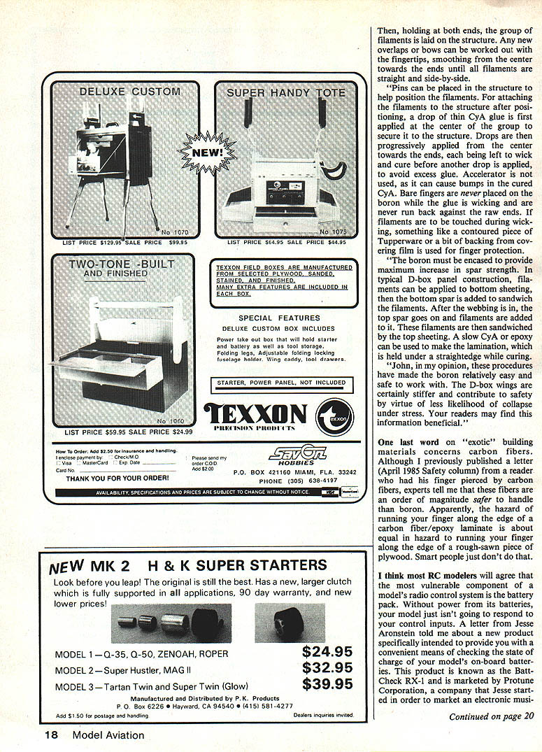 & ~ John PrestonPrr Cl Boron fibers Pro Con An board battery tester RC Increase reliability RC systems Off Switch CRARGER CHARGER CH 9 0 CONVENTiONAL SWITCH WIRING HH H H HI2 H ERNATIVE SWITCH WIRING BAD STUFF June 1985 Safety column included discussion whether models containing boron fIlament should banned AMA-sanctioned compe titions because allegations concerning safety product also asked readers answers two questions 1 Should models containing boron outlawed AMA competition categories 2 Should models contain ing boron outlawed certain AMA competition categories categories Thirteen readers kind enough re spond questions addition al reader didnt specifically respond questions sent letter safely handle boron filament 13 cast vote nine did want see boron banned four responded yes question No 1 meaning models containing boron should permitted AMA competition category guess predicted outcome ballot because general Americans like have somebody dictating rules person al safety good example outside modeling world unpopularity mandatory automobile-seat-belt-usage laws have adopted some state governments its hide theyre trying protect part youd rather make decisions affect ing own safety yourself So will boron models members AMA Safety Committee read ing column vote keep boron because possible competitive ad vantage can bring model because its light weight combined high strength reader uses boron filament flying wires 1/72-scale non-flying models another Sailplane enthusiast sent letters giving some tips handle boron safely Excerpts letters follow planes RC installation known wiring harnesses have switch wired depicted diagram left possibility exists short circuits switch Rewiring switch shown right aimost completely cilminates possibility internal shorts well greatly increasing reliability switch itself Both HA Farrar son op posed banning boron despite fact have experienced splinters flesh HAs letter states Boron deposited 00005-in tungsten filament diameter 0004 relatively stiff hard BRIT TLE boron/epoxy laminate best machined trimmed diamond-grit cutting tools essentially grinding opera tion individual filaments cannot cut blade breaks somewhat similar cutting piano wire diagonal cutters problem unlike wire addition desired break secon dary break occurs approximately 006 away desired break either direction depending little unobserved piece gets hand 16 Model Aviation e . fV V ThA11K3 F5R LETTIN ME HELP LAUNCH VOUR NEW PLANE NARYAN THl THINIG- FELL OUT JU3T 8BFORE L5T ER C7rO or footand dont get chair diameter stiffness fila ment permits function like needle its brittleness can leave piece inside flesh Hand lay-up boron/epoxy tape better performed bare-handed gloves gloves assist small segments penetrating skin diameter color render small pieces virtually invisible anything plain light-colored surface HA wound up letter PS suggested .. on boron rug March 1985 safety col umn should chuck rug wear shoes other letter tips han dle boron came Harley Michaelis must Sailplane flier since put LSF number 023 after signature Harley did respond questions whether boron should banned what stated following let ter Im assuming would want see ban response article boron June 1985 MA comment directed question banning banning safely han dle stuff caution usually sounded little said about actual tech nique bungling experiences may common subsequent solutions may interest others first experience consisted trans ferring 200 feet stuff reel 1000 feet owned friend taped end plastic gallon jug attempted wind reel unwound brittle stuff kept break ing bits pieces flew everywhere Relocating retaping two loose ends jug common fingers im paled general transfer bad experience No doubt sharp bits unknowingly ended up floor cause future trouble ran dowel through jug its ends supported wires dangling low ceiling workshop means dispensing boron idea use stick gauge lengths needed break off pieces Unwanted breaks common pieces flew loose end jug went wild fingers run through Fingers boron structure joined CyA actual application structure crude unwanted slack filaments Except wish get strength wings would have abandoned whole idea view use boron presents following problems 1 need finger eye protection 2 Storing reel will wildly unwind unless end taped 3 Dispensing breaking off lengths desired 4 Keeping abso lute track loose shards safely disposing 5 Proper alignment positioning filaments struc ture 6 Attaching filaments structure store reel made shallow box put width about reel diameter -in dowel centered box reel turn edge box drilled hole end boron pass through dispense practice box laid workbench near model structure Plans white paper placed under structure background dark boron Eye protection worn breaking off pieces As length pulled mobile dispenser broken off smooth-jawed pliers hand covered white Kleenex held over pliers breaking commonly results tiny loose shards will Kleenex work surface can seen After break Kleenex white surface pliers should inspected shards may captured masking tape covers problems through four problem five length brok en off laid other pieces set ends raised up shim desired number filaments has laid down can picked up group between thumb forefinger hand Let dangle alter nately stroke thumb forefin ger hand get side side Continued page 18 September1985 17 TEXXON FtELD BOXES ARE MANUFACTURED FROM SELECTED PLYWOOD SANDED STAINED FINISHED MANY EXTRA FEATURES ARE INCLUDED IN EACH BOX SPECIAL FEATURES DELUXE CUSTOM BOX INCLUDES Power take out box wilt hold starter battery well tool storage Folding legs Adjustable folding locking tuselage holder Wing caddy tool drawers STARTER POWER PANEL NOT INCLUDED N 9 Oder Add 5250 tor Insaracce handting MasterCardEny Daleorder COD enclose payment 01ChecklMOplease send wy VwaHOBBIES CardNOAdd$200PO BOX 421160 MtAMt FLA 33242 THANK YOU FOR YOUR ORDER PHONE 305 638-4197 K. ing both ends group filaments laid structure Any new overlaps bows can worked out fingertips smooth