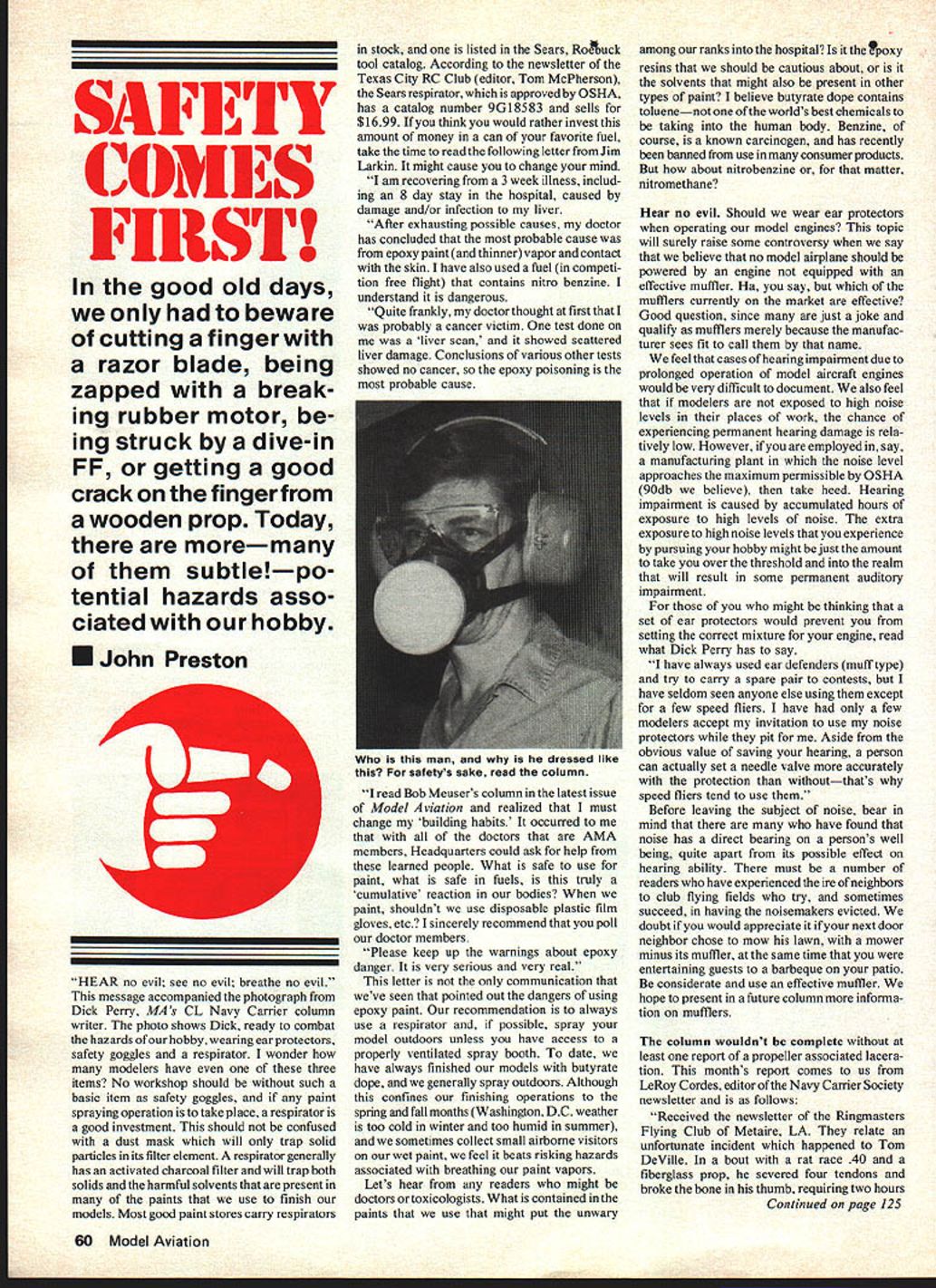 QIuuruUT ~IILI1 COMES FIRST good old days beware cutting finger razor blade being zapped break ing rubber motor ing struck dive-in FF getting good crack finger wooden prop Today moremany subtlelpo tential hazards asso ciated hobby U John Preston HEAR no evil see no evil breathe no evil message accompanied photograph Dick Perry MAs CL Navy Carrier column writer photo shows Dick ready combat hazards hobby wearing ear protectors safety goggles respirator wonder modelers have three items No workshop should such basic item safety goggles paint spraying operation take place respirator good investment should confused dust mask will trap solid particles its filter element respirator generally has activated charcoal filter will trap both solids harmful solvents present paints use finish models Most good paint stores carry respirators stock listed Sears Rouck tool catalog According newsletter Texas City RC Club editor Tom McPherson Sears respirator approved OSHA has catalog number 9G18583 sells $1699 think would rather invest amount money can favorite fuel take time read following letter Jim Larkin might cause change mind am recovering 3 week illness includ ing 8 day stay hospital caused damage and/or infection liver After exhausting possible causes doctor has concluded probable cause epoxy paint thinner vapor contact skin have also used fuel competi tion free flight contains nitro benzine understand dangerous Quite frankly doctor thought first probably cancer victim test done liver scan showed scattered liver damage Conclusions various other tests showed no cancer epoxy poisoning probable cause read Bob Meusers column latest issue Model Aviation realized must change building habits occurred doctors AMA members Headquarters could ask help learned people What safe use paint what safe fuels truly cumulative reaction bodies paint shouldnt use disposable plastic film gloves etc sincerely recommend poll doctor members Please keep up warnings about epoxy danger very serious very real letter communication weve seen pointed out dangers using epoxy paint recommendation always use respirator possible spray model outdoors unless have access properly ventilated spray booth date have always finished models butyrate dope generally spray outdoors Although confines finishing operations spring fall months Washington DC weather too cold winter too humid summer sometimes collect small airborne visitors wet paint feel beats risking hazards associated breathing paint vapors Lets hear readers might doctors toxicologists What contained paints use might put unwary among ranks hospital epoxy resins should cautious about solvents might also present other types paint believe butyrate dope contains toluenenot worlds best chemicals taking human body Benzine course known carcinogen has recently banned use consumer products about nitrobenzine matter nitromethane Hear no evil Should wear ear protectors operating model engines topic will surely raise some controversy say believe no model airplane should powered engine equipped effective muffler Ha say mufflers currently market effective Good question since just joke qualify mufflers merely because manufac turer sees fit call name feel cases hearing impairment due prolonged operation model aircraft engines would very difficult document also feel modelers exposed high noise levels places work chance experiencing permanent hearing damage rela tively low However employed say manufacturing plant noise level approaches maximum permissible OSHA 90db believe take heed Hearing impairment caused accumulated hours exposure high levels noise extra exposure high noise levels experience pursuing hobby might just amount take over threshold realm will result some permanent auditory impairment might thinking set ear protectors would prevent setting correct mixture engine read what Dick Perry has say have always used ear defenders muff type try carry spare pair contests have seldom seen anyone else using except few speed fliers have few modelers accept invitation use noise protectors pit Aside obvious value saving hearing person can actually set needle valve accurately protection withoutthats speed fliers tend use Before leaving subject noise bear mind have found noise has direct bearing persons well being quite apart its possible effect hearing ability must number readers have experienced ire neighbors club flying fields try sometimes succeed having noisemakers evicted doubt would appreciate next door neighbor chose mow lawn mower minus its muffler same time entertaining guests barbeque patio considerate use effective muffler hope present future column informa tion mufflers column wouldnt complete least report propeller associated lacera tion months report comes us LeRoy Cordes editor Navy Carrier Society newsletter follows Received newsletter Ringmasters Flying Club Metaire LA relate unfortunate incident happened Tom DeVille bout rat race 40 fiberglass prop severed four tendons broke bone thumb requiring two hours Continued page 125 60 Model Aviation man dressed like safetys sake read column Z LEN Z5OL AEROBATIC QUARTER SCALE MODEL n0 S C ENGINE 90 WINGSPAN 80 $4995 CONSTRUCTION Foam WingBalsa Fuselage Tail WING AREA 1122 sq FLYING WEIGHT 10 11 lbs Fiberglas Cowl 3/16 Aluminium Landing Gear OHIO SUPERSTAR MODEL PRODUCTS INC 5630 CHEROKEE DRIVE CANTON OH 44720 having convivial sip two owner remarked absence RC fliers loyal band speculated perhaps due large volume mail-ordering doing having own party down post office offer item detract RC modeling get thinking about things hobby dealer means besides just place buy little low-profit goodies cant get elsewhere cheaper Persevere start new model project week plan make FAG AMA Nats take neighbor kid flying field Saturday morning patient humble colum nist slow answering mail Its time inspired building Bill Warner 423-C San Vicente Blvd Santa Monica CA 90402 SAFETY/ PRESTON continued page 60 surgery stainless steel pin wood nylon prop injury would probab