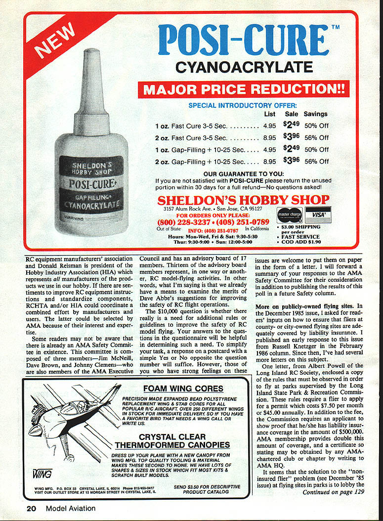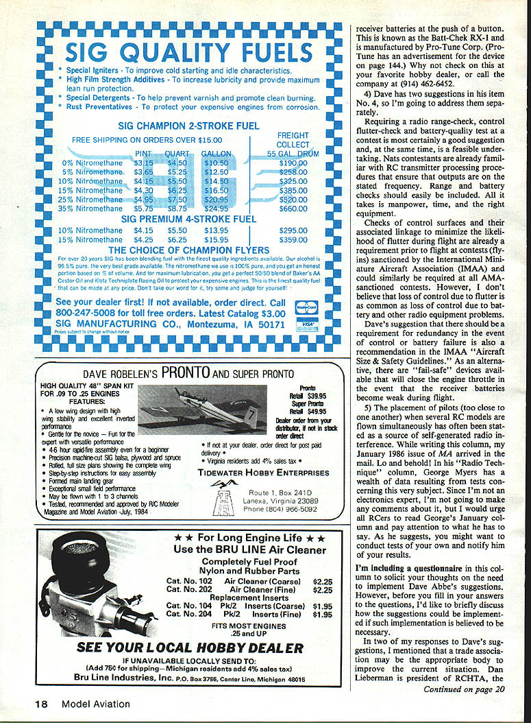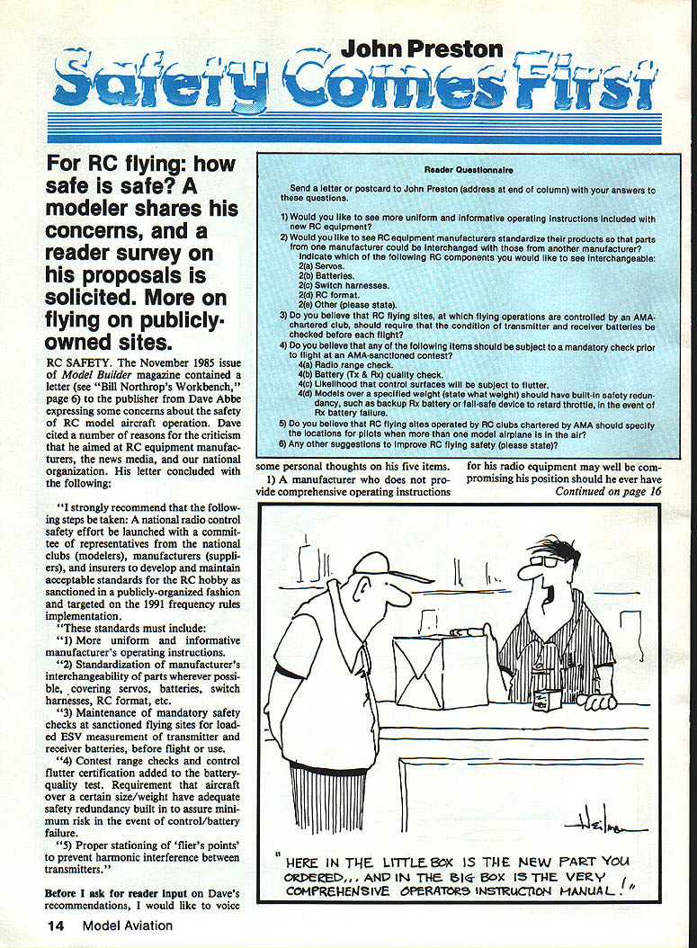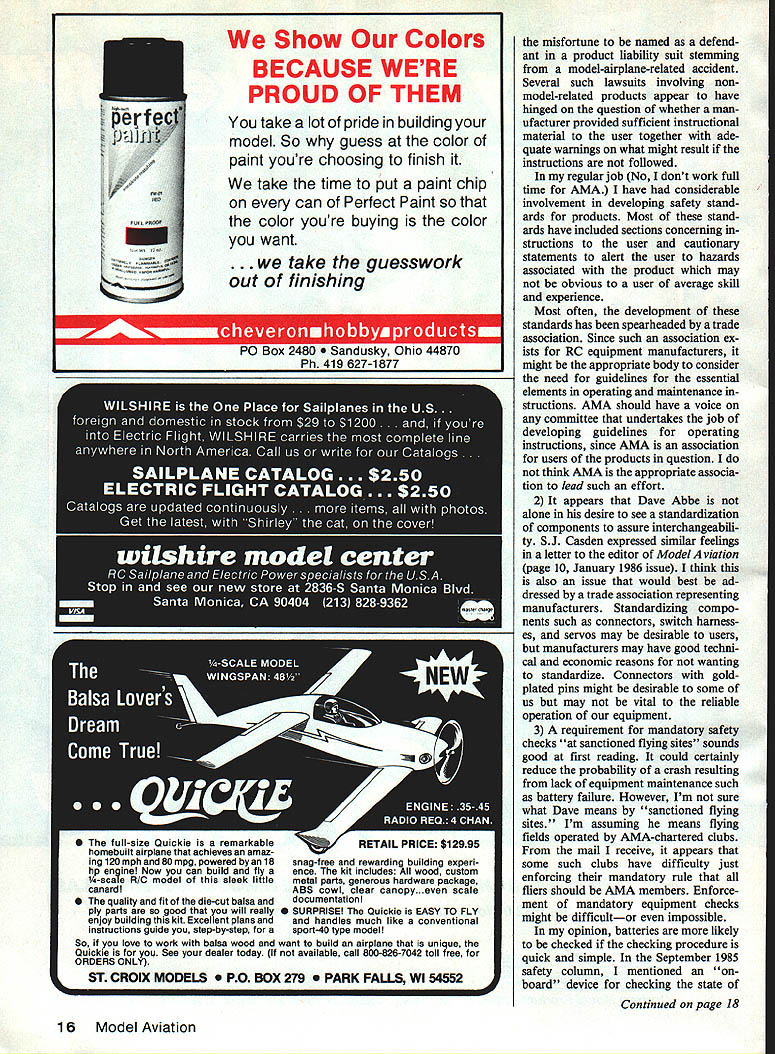 Preston ~p RC flying safe safe modeler shares concerns reader survey proposals solicited flying publicly owned sites RC SAFETY November 1985 issue Model Builder magazine contained letter see Bill Northrops Workbench page 6 publisher Dave Abbe expressing some concerns about safety RC model aircraft operation Dave cited number reasons criticism aimed RC equipment manufac turers news media national organization letter concluded following some personal thoughts five items 1 manufacturer does pro vide comprehensive operating instructions radio equipment may well com promising position should ever have Continued page 16 strongly recommend follow ing steps taken national radio control safety effort launched commit tee representatives national clubs modelers manufacturers suppli ers insurers develop maintain acceptable standards RC hobby sanctioned publicly-organized fashion targeted 1991 frequency rules implementation standards must include 1 uniform informative manufacturers operating instructions 2 Standardization manufacturers interchangeability parts wherever possi ble covering servos batteries switch harnesses RC format etc 3 Maintenance mandatory safety checks sanctioned flying sites load ed ESV measurement transmitter receiver batteries before flight use 4 Contest range checks control flutter certification added batteryquality test Requirement aircraft over certain size/weight have adequate safety redundancy built assure mini mum risk event control/battery failure 5 Proper stationing fliers points prevent harmonic interference between transmitters Before ask reader input Daves recommendations would like voice K II REE IN ThE U1TLES5X IS TJIE NEW FAT YOL4 OEI, AMP IN THE BI 50K ThE VY COMReJ4EAJSIVE 6PgATe INSTRUCflON l-1AIJUAL 14 Model Aviation Reader Questlonnaim Send letter postcard John Preston address end column answers questions 1 Would like see uniform informative operating instructions included new RC equipment 2 Would like see RC equipment manufacturers standardize products parts manufacturer could interchanged another manufacturer indicate following RO components would like see interchangeable 2a Servos 2b BatterIes 2c Switch harnesses 2d RC format 2e Other please state 3 Do believe RO flying sites flying operations controlled AMA chartered club should require condition transmitter receiver batteries checked before flight 4 Do believe following Items should subject mandatory check prior flight AMA-sanctioned contest 4a Radio range check 4b Battery TX & Rx quality chock 4c Likelihood control surfaces will subject flutter 4d Models over specified weight state what weight should have built-in safety redun dancy such backup Rx battery fall-safe device retard throttle event Rx battery failure 5 Do believe RO flying sites operated RO clubs chartered AMA should specify locations pilots model airplane air 6 Any other suggestions improve RC flying safety ptease state Show Colors BECAUSE WERE PROUD OF THEM take lot pride building model So guess color paint youre choosing finish take time put paint chip can Perfect Paint color youre buying color want . take guesswork out finishing P0 Box 2480 usky Ohio 44870 Ph 419 627-1877 So love work balsa wood want build airplane unique Quickie See dealer today available call 800-826-7042 toll free ORDERS ONLY h ST CROIX MODELS OX 279 S PARK FALLS WI 54552 misfortune named defend ant product liability suit stemming model-airplane-related accident Several such lawsuits involving nonmodel-related products appear have hinged question whether man ufacturer provided sufficient instructional material user together ade quate warnings what might result instructions followed regular job No dont work full time AMA have considerable involvement developing safety stand ards products Most stand ards have included sections concerning structions user cautionary statements alert user hazards associated product may obvious user average skill experience Most often development standards has spearheaded trade association Since such association ex ists RC equipment manufacturers might appropriate body consider need guidelines essential elements operating maintenance structions AMA should have voice committee undertakes job developing guidelines operating instructions since AMA association users products question think AMA appropriate associa tion lead such effort 2 appears Dave Abbe alone desire see standardization components assure interchangeabili ty SJ Casden expressed similar feelings letter editor Model Aviation page 10 January 1986 issue think also issue would best ad dressed trade association representing manufacturers Standardizing compo nents such connectors switch harness es servos may desirable users manufacturers may have good techni cal economic reasons wanting standardize Connectors goldplated pins might desirable some us may vital reliable operation equipment 3 requirement mandatory safety checks sanctioned flying sites sounds good first reading could certainly reduce probability crash resulting lack equipment maintenance such battery failure However Im sure what Dave means sanctioned flying sites Im assuming means flying fields operated AMA-chartered clubs mail receive appears some such clubs have difficulty just enforcing mandatory rule fliers should AMA members Enforce ment mandatory equipment checks might difficultor impossible opinion batteries likely checked checking procedure quick simple September 1985 safety column mentioned board device checking state Continued page 18 16 Model Aviation full-size Quickie remarkable homebuilt airplane achieves amaz ingl20mphand80mpgpowered byan 18 hp eninel Now can build fly /4-scale RIC model sleek little canard quality fit die-cut balsa ply parts good will really enjoy building kit Excellent plans instructions guide step-by-step snag-Tree rewarding building experi ence kit includes wood custom metal parts generous hardware package ABS cowl clear canopy.even scale documentation SURPRISE Quickie EASY TO FLY handles 