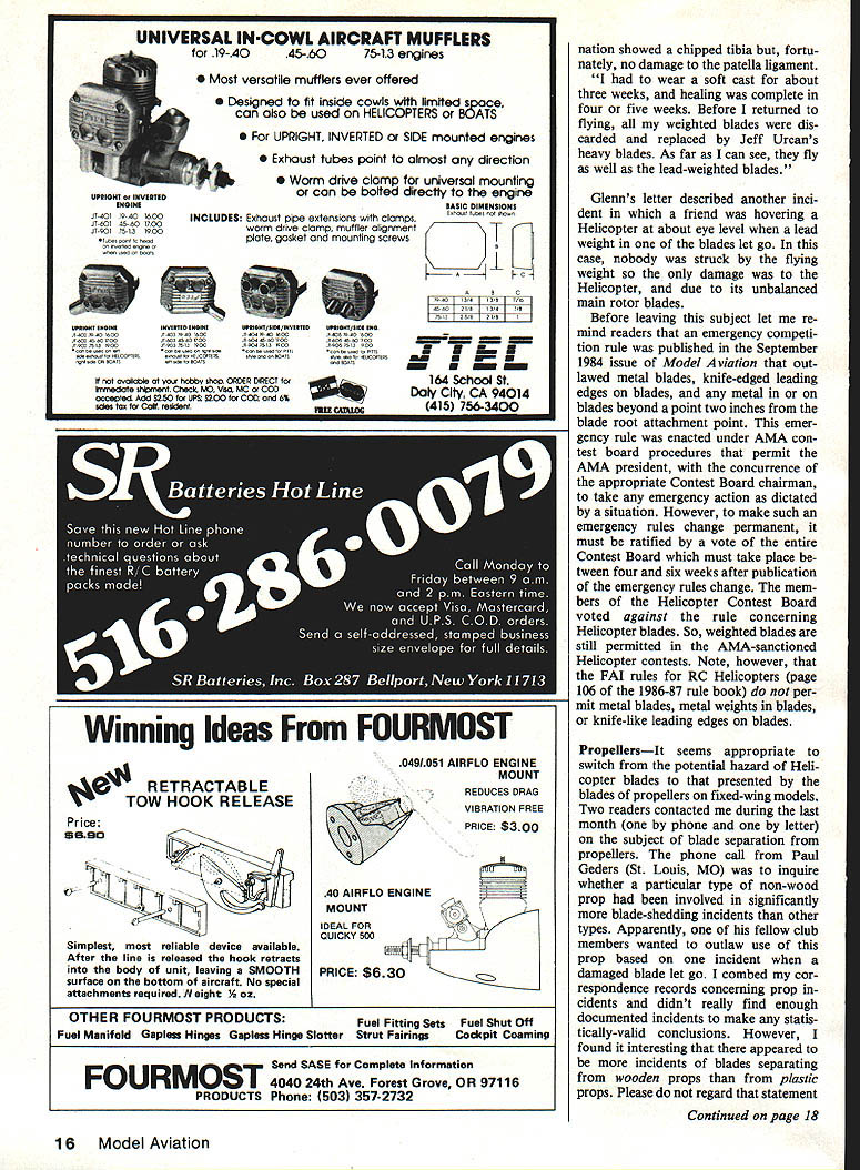 ___John Preston___________________________ Safety Comes First weighted blades RC Heli copters safety hints propel lers legal RC frequencies prob lem surfaces again eliminating flutter buzz CORRECTION I recently received let ter Glenn Scillian concerning report accident flying RC Helicopter reported column January 1986 issue Model Aviation seems report accident completely wrong may disservice RC Helicopter builders fliers previous report stated Glenn struck leg unweighted rotor blade thrown off models Glenn states let ter struck one-ounce lead weight come loose rotor blades letter Glenn enclosed copy letter wrote November 1984 Larry Jolly described accident dont believe Larry ever reported incident RC Helicopters column set record straight Im going use Glenns own words describe what really happened also apologize wrong account January issue summer 1983 suffered serious accident struck lead weight blade Heli copter found added ounce lead shape disk about inch diameter about A-inch thick blade model flew beau tifullymuch better unweight ed blades As far can recall blades never touched ground tall boom slugs epoxied cavity about three inches outside end blade cavity half hardwood half balsa grant long slender slug nesting en tirely hardwood would have safer disk shape recommended manufacturer use its Helicopters day revving engine up Helicopter sitting OR 004 ON Li Reader David Lewis suggests Iactoryappiied stickers RC transmitters system boxes such could help salespersons hobby shops sell legal radios novice RC hobbyists Preston discusses problem column ground about 12 feet front tail toward Just moment lift-off slug chunk wood blade let go struck right shin two inches below kneecap knocked down still held transmitter shut throttle down now-unbalanced copter thrashed violently ground literally tore off tail boom friend finally stopped blades pulled off fuel line Other friends applied some clean towels wound bleeding moderately drain ing bone-marrow oil driven nearest hospital about five miles away treated outpatient Exami Continued page 16 t II I5 ITS O5VIOLALY FRLAENCY AIkCY-AET cLY 14 Model Aviation UNIVERSAL IN-COWL AIRCRAFT MUFFLERS 19-4045-6075-13 engines UPSIONT ox INVICIED ENOINE Jt-40119-401600 JI-OGi45-901700 11-90175-131900 TTLAS0577 0T0530le0705e0 DUN tSmee 0e5 soc OATS 757 bA 7550 77 5577 504 Most versatile mufflers ever offered Designed fit inside cowls lImited soace can also used HELICOPTERS BOATS 0 For UPRIGHT INVERTED SIDE mounted engines 0 Exhaust tubes point almost direction S Worm drive clamp universal mounting can bolted directly engine BASIC DIMENSIONS INCLUDES Exhaust pipe extensions clamps553003737003007370700 worm drive clomp muffler alignment 0i plate gasket mounting screws S nOt 3073~IC 9031 hObby shop ORDER DIRECT tar rxnedote s9ment Check MO Visa MC COD accepted Add S260 tar UPS S200 tar COD 6% IcieR tax tar Cdt resident RETRACTABLE OW HOOK RELEASE Price SS90 Simplest reliable device available After line released hook retracts body unit leaving SMOOTH surface bottom aircraft No special attachments required N eight Y5 oz OTHER FOURMOST PRODUCTS 03C [5 ZAO[SW[TZ[5-] a S 164 School St Daly CIty CA 94014 415 756-3400 049/051 AIRFLO ENGINE MOUNT REDUCES DRAG VIBRATION FREE PRICE $300 40 AIRFLO ENGINE MOUNT IDEAL FOR QUICKY 500 PRICE $630 Fuel Fitting Sets Fuel Shut Off Fuel Manifold Gapless Hinges Gapless Hinge Slotter Strut Fairings Cockpit Coaming nation showed chipped tibia fortu nately no damage patella ligament wear soft cast about three weeks healing complete four five weeks Before returned flying weighted blades dis carded replaced Jeff Urcan s heavy blades As far can see fly well lead-weighted blades Glenns letter described another inci dent friend hovering Helicopter about eye level lead weight blades let go case nobody struck flying weight damage Helicopter due its unbalanced main rotor blades Before leaving subject let re mind readers emergency competi tion rule published September 1984 issue Model Aviation out lawed metal blades knife-edged leading edges blades metal blades beyond point two inches blade root attachment point emer gency rule enacted under AMA con test board procedures permit AMA president concurrence appropriate Contest Board chairman take emergency action dictated situation However make such emergency rules change permanent must ratified vote entire Contest Board must take place tween four six weeks after publication emergency rules change mem bers Helicopter Contest Board voted against rule concerning Helicopter blades So weighted blades still permitted AMA-sanctioned Helicopter contests Note however FAI rules RC Helicopters page 106 1986-87 rule book per mit metal blades metal weights blades knife-like leading edges blades PropellersIt seems appropriate switch potential hazard Heli copter blades presented blades propellers fixed-wing models Two readers contacted during last month phone letter subject blade separation propellers phone call Paul Geders St Louis MO inquire whether particular type non-wood prop involved significantly blade-shedding incidents other types Apparently fellow club members wanted outlaw use prop based incident damaged blade let go combed cor respondence records concerning prop cidents didnt really find enough documented incidents make statis tically-valid conclusions However found interesting appeared incidents blades separating wooden props plastic props Please regard statement Continued page 18 16 Model Aviation UPWCCTIIDVINVfITRORORSRROSIOI lee 434057770073 5311 CATAIfl Winning Ideas FOURMOST nd SASE Complete Information Ave Forest Grove OR 97116 PRODUCTS Phone 503 357-2732 4 vOl ec &cP C Al A0S oBB~ sendOR -cl meaning plastic props safer wood props Id rather aware blades may separate prop no matter what material fabricated letter concerning props came AE Richt Scott Depot WV en closed instructions received some Graupner Super fiberglassreinforced nylon props purchased major mail order hobby retailer instructio