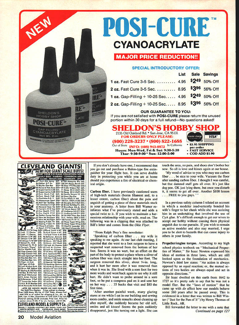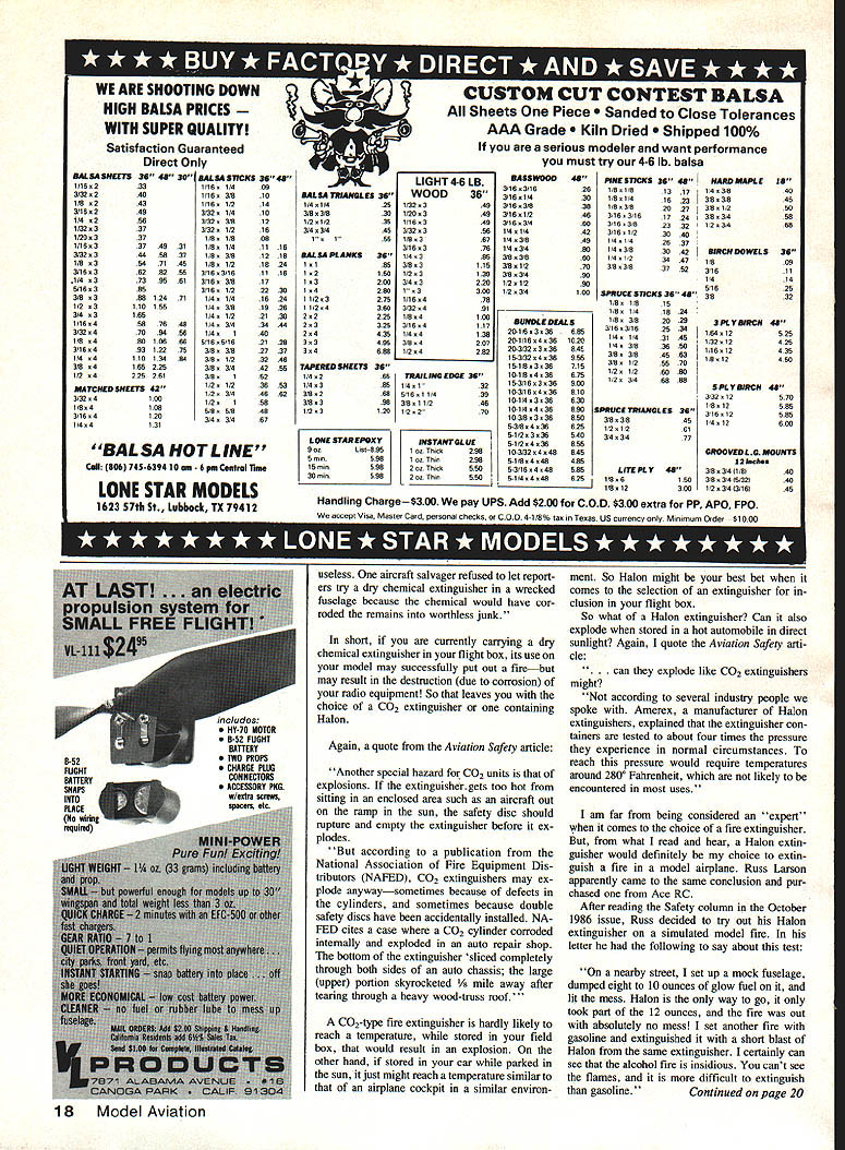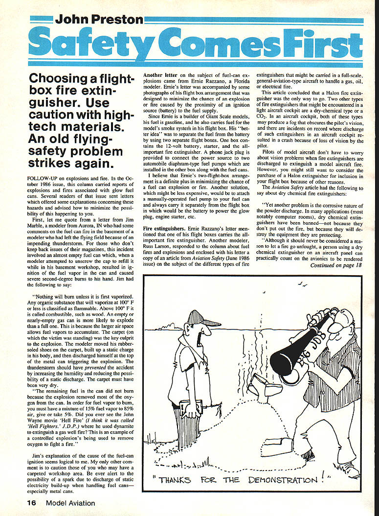inJohn Preston__________________ Choosing flightbox fire extin guisher Use caution hightech materials An old flyingsafety problem strikes again FOLLOW-UP explosions fire Oc tober 1986 issue column carried reports explosions fires associated glow fuel cans Several readers issue sent letters offered some explanations concerning hazards advised minimize possi bility happening First let quote letter Jim Marble modeler Aurora IN some comments fuel can fire basement modeler left flying field because impending thunderstorm dont keep back issues magazines incident involved almost empty fuel can modeler attempted unscrew cap refill basement workshop resulted ig nition fuel vapor can caused severe second-degree burns hand Jim following say Nothing will burn unless first vaporized Any organic substance will vaporize 1000 F less classified flammable Above 1000 F called combustible such wood An empty nearly-empty gas can likely explode full because larger air space allows fuel vapors accumulate carpet victim standing key culprit explosion modeler moved rubbersoled shoes carpet built up static charge body discharged himself top metal can triggering explosion thunderstorm should have prevented accident increasing humidity reducing possi bility static discharge carpet must have very dry remaining fuel can did burn because explosion removed oxy gen can order fuel vapor bum must have mixture 15% fuel vapor 85% air give take 5% Did ever see John Wayne movie Hell Fire think called Hell Fighters JDP used dynamite extinguish gas well fire example controlled explosions being used remove oxygen fight fire Jims explanation cause fuel-can ignition seems logical other com ment caution may have carpeted workshop area ever alert possibility spark due discharge static electricity build-up handling fuel cans especially metal cans Another letter subject fuel-can ex plosions came Ernie Razzano Florida modeler Ernies letter accompanied some photographs flight box arrangement designed minimize chance explosion fire caused proximity ignition source battery fuel supply Since Ernie builder Giant Scale models fuel gasoline also carries fuel models smoke systeris flight box bet ter idea separate fuel battery using two separate flight boxes box con tains 12-volt battery starter allimportant fire extinguisher phone jack plug provided connect power source two automobile diaphram-type fuel pumps installed other box along fuel cans believe Ernies two-flight-box arrange ment definite plus minimizing chance fuel can explosion fire Another solution might less expensive would attach manually-operated fuel pump fuel can always carry separately flight box would battery power glow plug engine starter etc Fire extinguishers Ernie Razzanos letter men tioned flight boxes carries allimportant fire extinguisher Another modeler Russ Larson responded column about fuel fires explosions enclosed letter copy article Aviation Safety June 1986 issue subject different types fire J U- extinguishers might carried full-scale general-aviation-type aircraft handle gas oil electrical fire article concluded Halon fire extin guisher way go Two other types fire extinguishers might encountered light aircraft cockpit dry-chemical type CO2 aircraft cockpit both types may produce fog obscures pilots vision incidents record discharge such extinguishers aircraft cockpit re sulted crash because loss vision pilot Pilots model aircraft dont have worry about vision problems fire extinguishers discharged extinguish model aircraft fire However might still want consider purchase Halon extinguisher inclusion flight box because other reasons Aviation Safety article following say about dry chemical fire extinguishers Yet another problem corrosive nature powder discharge applications notably computer rooms dry chemical extin guishers have bannednot because dont put out fire because will de stroy equipment protecting Although should never considered rea son let fire go unfought person using dry chemical extinguisher aircraft panel can practically count avionics rendered Continued page 18 THA14$15 Foi 114 EhONTPATio 16 Model Aviation Satisfaction Guaranteed Direct Only BALSA SHUTS 36 48 3O 1/18233 3/32240 1/8243 3/16249 114 256 1/32337 1/20337 1/163374931 3/323445837 l/8 3547145 3/183828255 1/4 561 5/16395 3/9 38912471 3/43165 1/164567649 3/324709456 1/849010666 3/1649312275 1/4411013494 3/84165225 1/24225261 MATCHED SHEETS 42 3/324100 1/84109 3/164120 1/44121 5A3A 3AT * WE ARE SHOOTING DOWN HIGH BALSA PRICES OM CUT CONTEST BALSA Sheets Piece ed Close Tolerances WITH SUPER QUALITYAAA Grade Dried ped 100% serious modeler want performance must try 4-6 lb balsa LIGHT4-6 LB BASSWOOD 48 PVHESTICKS 36 48 HARD MAPLE 18 3/163/18261/81/813 171/43/840 BALSATRIANGLES35 WOOD363/181/4301/81/41623 I3/83/849 1/41/4251/323493/163/8381/83/820 273/81/260 3/83/8301/203493/16 1/2463183/1617 243/83/456 1/21/2351/16349 3/163/4603/163823 321/23/468 3/43/4453/323561/41/4423/16 1/230 40 1156 1/83671/43/8491/41/426 APLAHKS 3/163761/43/4801/43/830 42BIRCH DO WELS36 1/43853/83/8801/4 1/234 471/809 11853/831153/91/2703/83/627 523/1611 121561/231393/83/490 13200 3/43220 1/21/2901/414 5/1625 14290133001/23/4100SPRJCESTICKS3645 3/832 11/232751/16478 1/8 1/8 15 11/243603/32491 1/8 1/4 18 24 222251/84100 233253/164117BUHDLEDEALS1/8 3/920 293PLYBIRCH 48 24435I/44139201/6336 6903/l83/1625 34 33495 3/84207201/16430 10201/4 1431 1451/6412525 1/3212425 34688 I/2428220-3/323348401/4 3/834 1/1012435 15-3/32434oss 3/845 631/912460 TAPEREDSHEETS 36151/83387153/8 1/25670 1/42 65TRAILING [DOE 36101/84361/2 1/26090 1/4385 1/4132153/163361/2 3/460 89 5fty59f 48 3/8268 5/1611/4103/16434810 3/8396 3/811/246101/4336630 12570 1/812585 1/23120 1/2270101/4436890 SPRVCETRIAHGLES 36 31612595 103/83308563/83/8451/412600 53/84346251/21/261 51/2334540343/477 LONE STAR EPOXYINSTANT CL UE51/2434855 'BALSA HOT L Ll 8851 ,Thek289103/32440845GROOVEDLGMOIJHTS 5,,59810 Thi29851/8440485121chs CaN 806743-639410, 6pntCentrolrme15,,5902 Thik55653