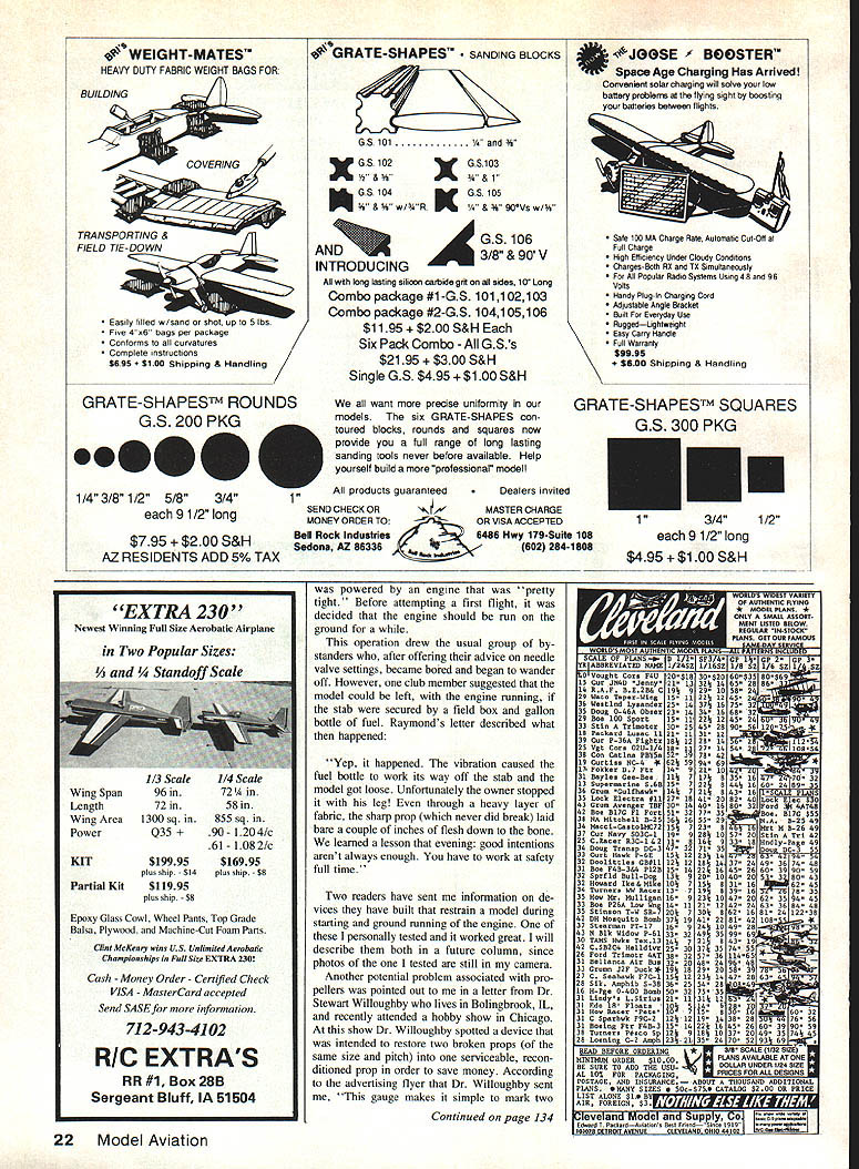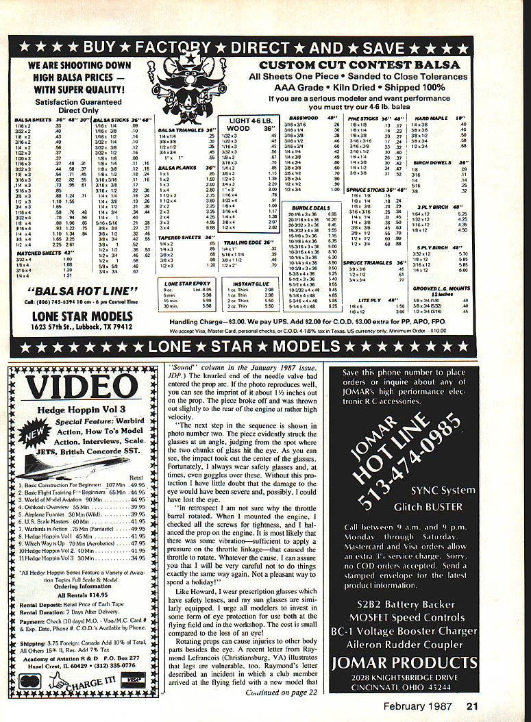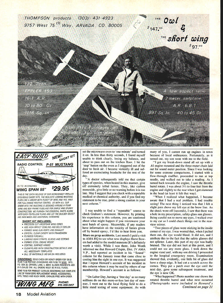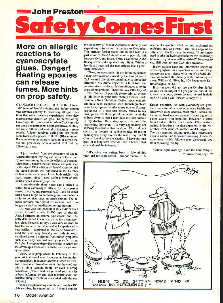 ___John Preston___________________________ Safety Comes First allergic reactions cya noacryl ate glues Danger Heating epoxies can release fumes hints prop safety CYANOACRYLATE ALLERGY October 1985 issue Model Aviation Safety column devoted entirely discussing allergic reac tions some modelers experienced used cyanoacrylate CyA glue best knowledge fumes emitted CyA cures cause permanent health problems can cause asthma acute skin irritation some people letter received during last month came such person Bill Fike Bloomington IL experienced allergic reaction type has previously reported Bill following say just received Academy Model Aeronautics upon request two articles written concerning allergic effects cyanoac rylate glue believe first article published April 1985 edition Model Aviation second article published October edition same year read both articles much interest since now suffer form der matitis called dermatographism Approximately three years ago started suffer asthma-type attacks no apparent reason visited personal MD stated allergic something prescribed tablet taken once attack started tacks subsided after about six months no longer carried medication person well good until July 1985 started build new 15/500 type aircraft Alas suffered asthma-type attack fi nally determined allergic cyanoacry late glue Needless say very relieved find cause attacks experienced year earlier continued use CyA however used glue very frugally wellventilated areas suffered minor symptoms such runny nose watery eyes after using CyA accepted discomforts return advantages associated use cyanoac rylate glues Now lets jump ahead February year time diagnosed having der matographism laymans terms itched over developed hive-like welts hatched out minor scratch bump strong handshake Note yet read articles informed club member about possible allergic reactions associated use CyA explained condition another RC club member suggested should contact Academy Model Aeronautics directly request information pertaining CyA glue member further stated read past issue Model Aviation possible link between CyA hives Thus called AMA Headquarters explained plight Within few days received two articles previ ously mentioned Now question dermatographism long-term reaction caused limited use CyA am allergic something else altogether different prime objective answer question since doctor dumbfounded cause problem Therefore letter Mr Preston possible please print part letter next Safety Comes First column Model Aviation other model enthusi asts have diagnosed dermatographism suffer symptoms similar own some knows case closely relates own please ask people write address given may pass information doctor Dermatographism lifethreatening however very aggravating knowing cause condition Plus cherish thought having take 10 mg hydroxyzine day rest life CyA found catalyst have got heck long-term reaction believe others should informed Bills letter written back July year some reason did receive few weeks ago called explained problems result sent copy July letter copy wrote no longer need take hydroxyzine relieve itching however skin still sensitive Needless say Bill does use CyA glue anymore readers have information regarding dermatographism symptom use cy anoacrylate glue please write Model Avi ation contact Bill directly following ad dress William C Fike Jr 804 Broadmoor Dr Bloomington IL 61701 readers did see October Safety column subject CyA glue would like receive copy please contact include SASE will forward copy Epoxy reaction As cyanoacrylate glue some us experience health prob lems using epoxies Most often seems amine hardener component epoxy glues paints causes skin irritation However letter Graham Hicks La Grande OR cautions against following tip appeared No vember 1986 issue another model magazine tip suggested putting epoxy microwave oven warm up easier spreading Grahams experience follows may discourage following tip About eight years ago did same thing Continued page 18 16 Model Aviation J -I i V ADlO 4EA SEEM SE GE1TIw& SOME KU4t 0F INTEFEENCE 25 TO 45 ENGINES WING SPAN 55 2995 THIS IS THE SIXTH RELEASE OF OUR INCREASINGLY POPULAR EASY-BUILD SHORT KITS THE REALISTIC LOOKING MUSTANG FLIES LIKE DREAM WITH PLENTY OF WING AND TAIL AREA FOR FULL RANGE POSITIVE CONTROL AS WITH ALL OUR SHORT-KITS THE MUSTANG IS DESIGNED AROUND FOAM WING AND BOX FRAME FUSELAGE FOR SIMPLE AND STURDY CONSTRUCTION WE FURNISH THE ESSENTIAL PARTS ALONG WITH EASY- TO-FOLLOW PLANS AND LET THE BUILDER SELECT HIS OWN WOOD AND ADDITIONAL HARDWARE SHORT KIT INCLUDES PRECISION CUT ARCOFOAM WING CORES ABS HIGH-IMPACT COWLING AND BELLY COOLER FORMED WING GUN PORTS AND EXHAUST CRYSTAL CLEAR CANOPY WITH FRAMEWORK PLYWOOD FIREWALL LANDING GEAR STRAPS BLOCKS AND SCREWS FORMED STEEL ENGINE MOUNT CONTROL SURFACE HINGES CLEAR PLANS WITH CONSTRUCTION DETAILS AND ALL NECESSARY TEMPLATES BILL OF MATERIALS NO BALSA INCLUDED ORDERING SEND CHECK OR MONEY ORDER FOR 2905 PLUS S45D POSTAGE CANADIANS ADD 650 TO WING MPG PO BOX 33 CRYSTAL LAKE IL 60014 ILLINOIS RESIDENTS ADD B%% SALES TAX ALL ORDERS MUST BE IN US FUNDS SEND 350 FOR PRODUCT CATALOG DESCRIBING OUR COMPLETE LINE OF FOAM CORE REPLACEMENT WINGS ACCESSORIES KITS TOOLS AND MUCH MORE CATALOG FREE WITH ORDER MFG PHONE 815-459-0417 set microwave oven minute tumed less thirty seconds found myself unable think clearly losing balance about pass out kitchen floor hit stop button oven staggered out door fresh air became violently ill suf fered excruciating headache rest day doctor subsequently told certain types epoxies heated manner give off extremely lethal fumes like carbon monoxide give little no waming before too late May suggest check reputable medical chemical authority find statement true print strong caution next column unable find reputable source check Grahams statement However printing experience column cautioned about what might happen microwave next batch epoxy Meanwhile readers have information toxicity fumes give