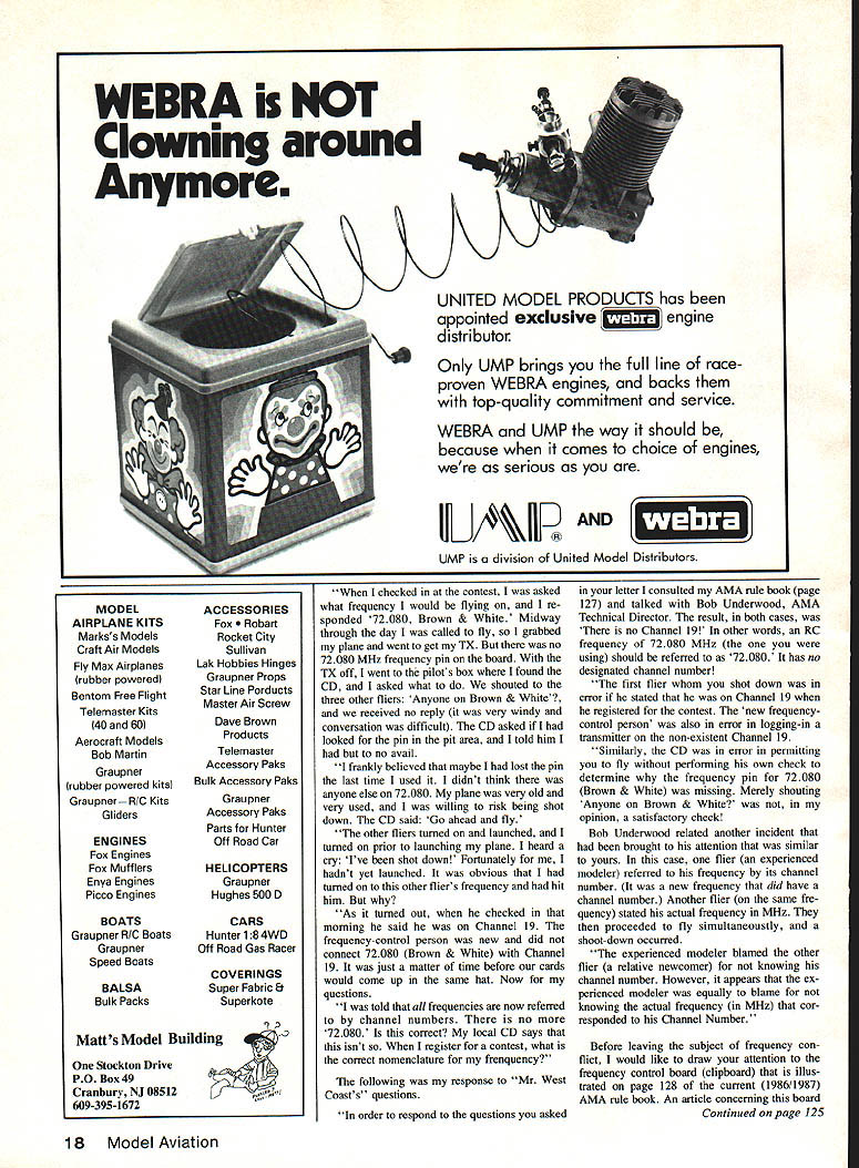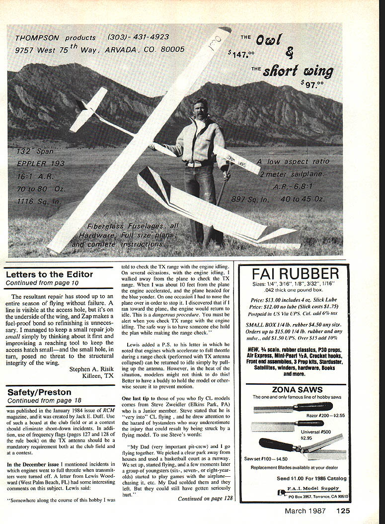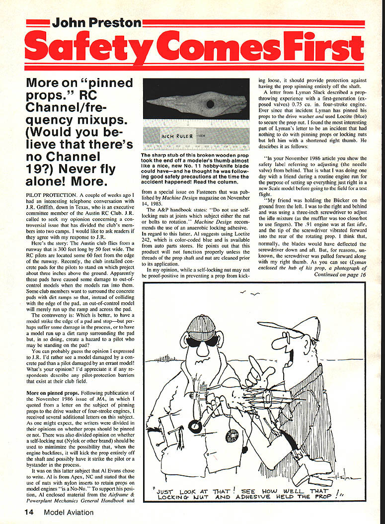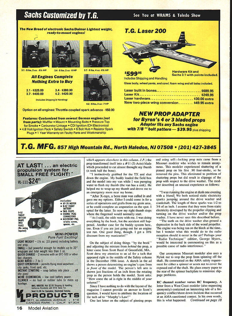 John Preston___________________________ Safety Comes First pinned props RC Channel/fre quency mixups Would lieve theres no Channel 19 Never fly alone PILOT PROTECTION couple weeks ago interesting telephone conversation JR Griffith down Texas executive committee member Austin RC Club JR called seek opionion concerning con troversial issue has divided clubs mem bers two camps would like ask readers agree response JR Heres story Austin club flies runway 300 feet long 50 feet wide RC pilots located some 60 feet edge runway Recently club installed con crete pads pilots stand project about three inches above ground Apparently pads have caused some damage out-ofcontrol models models ran Some club members want surround concrete pads dirt ramps instead colliding edge pad out-of-control model will merely run up ramp across pad controversy Which better have model strike edge pad stopbut per haps suffer some damage process have model run up dirt ramp surrounding pad doing create hazard pilot may standing pad can probably guess opinion expressed JR Id rather see model damaged con crete pad pilot damaged errant model Whats opinion Id appreciate re spondents describe pilot-protection barriers exist club field pinned props Following publication November 1986 issue MA quoted letter subject pinning props drive washer four-stroke engines received several additional letters subject As might expect writers divided opinions whether props should pinned also divided opinion whether self-locking nut Nylok other brand should used mimimize possibility engine backfires will kick prop entirely off shaft possibly have strike pilot bystander process latter subject Al Evans chose write Al Apex NC stated use nuts nylon inserts retain props model engines No-No support posi tion Al enclosed material Airframe & Powerpant Mechanics General Handbook RULE K sharp stub broken wooden prop took end off modelers thumb almost like nice new No 11 hobby-knife blade could haveand thought follow ing good safety precautions time accident happened Read column special issue Fasteners pub lished Machine Design magazine November 14 1985 A&P handbook states use selflocking nuts joints subject either nut bolts rotation Machine Design recom mends use anaerobic locking adhesive regard latter Al suggests using Loctite 242 color-coded blue available auto parts stores points out product will function properly unless threads prop shaft nut cleaned prior its application opinion self-locking nut may proof-positive preventing prop kicking loose should provide protection against having prop spinning entirely off shaft letter Lyman Slack described propthrowing experience first-generation ex posed valves 075 cu four-stroke engine Ever since incident Lyman has pinned props drive washer used Loctite blue secure prop nut found interesting part Lymans letter incident nothing pinning props locking nuts left him shortened right thumb descirbes follows November 1986 article show safety label referring adjusting needle valve behind what doing day friend during routine engine run purpose setting up everything just right new Scale model before going field test flight friend holding Bucker ground left right behind using three-inch screwdriver adjust idle mixture muffler too close/hot use fingers 91 engine fast idle tip screwdriver vibrated forward rear rotating prop think normally blades would have deflected screwdriver down aft reasons un known screwdriver pulled forward along right thumb As can see Lyman enclosed hub prop photograph Continued page 16 LOOI AT ThAT SEE OW WELL THAT / LoKIN- iJLrr AND AIHESVE HELD TH 7ROP odel Aviation IIII&. . New Breed 1 electronic Sachs/Dolmar Lightest weight ready-to-mount engines C 31 $32500 37- *40000 34- *38000 42- *42000 Includes Shipping & Handling Hardware Kit Sachs 31 points included Includes Shipping Handling Glass body wheel pants cowl foam wIng balsa included Laser built bones$68996 Laser Kit$24996 Laser hardware$3000 extra New two-piece wing conversion$4996 extra Option engines Throttle-coupled spark advance *5000 Features Customized newest German engines parts Muffler t ting Bolts sure Tap Smoke uretor Linkage Ignition Cl-I Electronics 48 Volt Ignition Pack ty Switch lt Hub stor Spark Plugs ar Warranty Faulty Parts Workmanship NEW PROP ADAPTER Byrons 4 3 bladed props Adapter fits Sachs engine 7/8 bolt pattern $3995 plus shipping TG MFGE 857 HIgh Mountain Rd North Haledon NJ 075080201 427-3845 appears elsewhere column JP prop transformed itself #11 X-Acto blade proceeded cut almost throught thumb took half bone instinctively grabbed TX shut down engine buddy loaded field box model van pumping water flush thumb van has sink helped wrap up thumb drove emergency room near home After X-rays bone man called gave options Either could come series operations grafts groin area could complete amputation spot opted latter So now right thumb stops fingernail would normally start As said odds doing everything book accident still hap pened Another case buddy system too just going out engine test run good thing though get 10% discount manicurist subject doing things book adjusting mixture behind prop letter came Scott Reed Greenfield MA Scott drew attention ad tach appeared right middle Safety column December 1986 issue sketch ad shows person determining engines rpm front model persons left arm shown just fractions inch rotating prop person holds model Scott asks come ad right middle column Since have nothing layout magazine cannot provide answer Scotts question would have attribute location tach ad Murphys Law last letter subject pinning props using selflocking prop nuts came Missouri modeler wishes remain anony mous modeler experienced shattering pinned prop first 90 four-stroke removed pins eliminated problem shattering props did result slippage prop respect drive washer mod eler describe unusual experience follows running engine dusk evening friendi both noticed static electricity sparks jumpihg around drive washer crankshaft l
