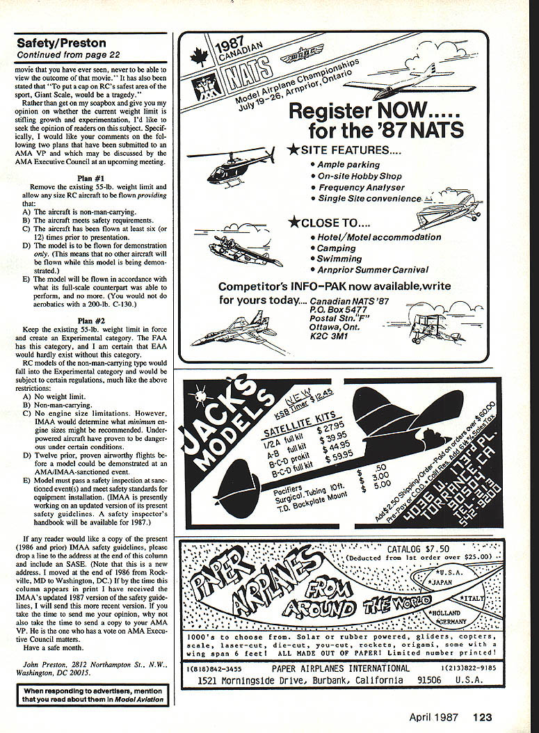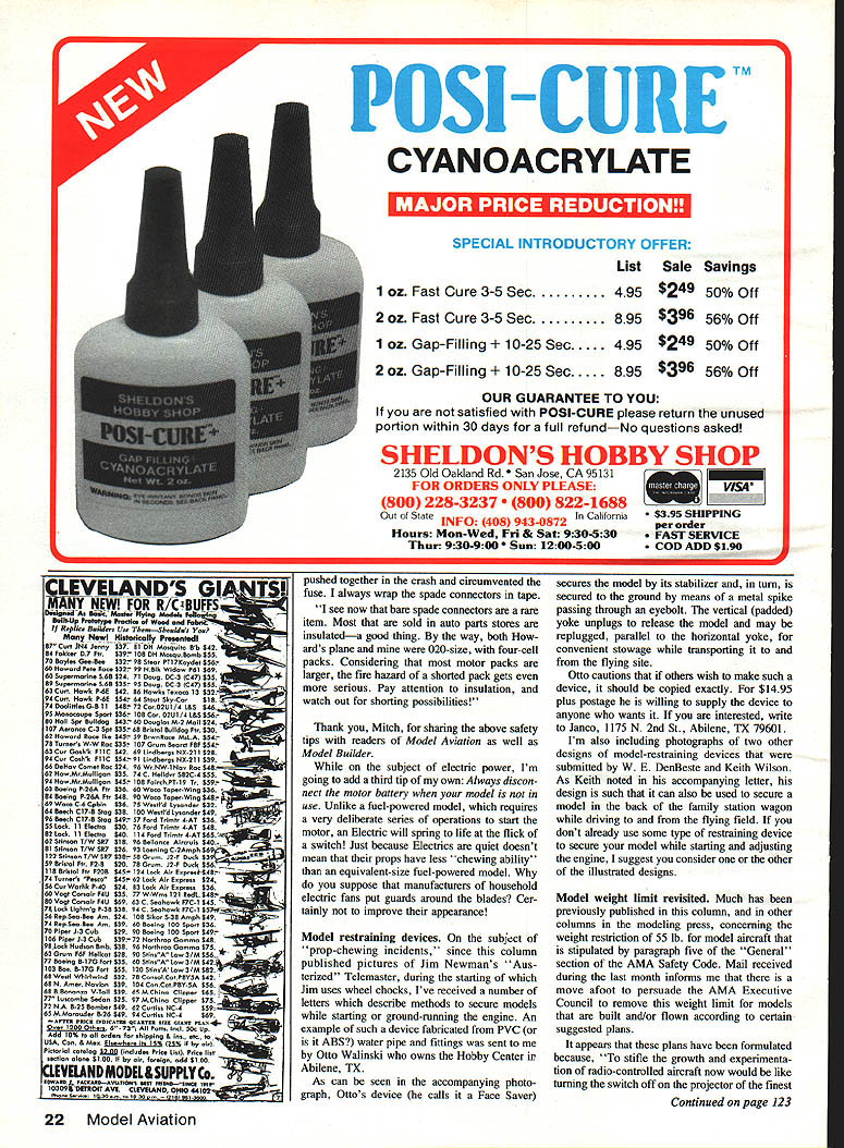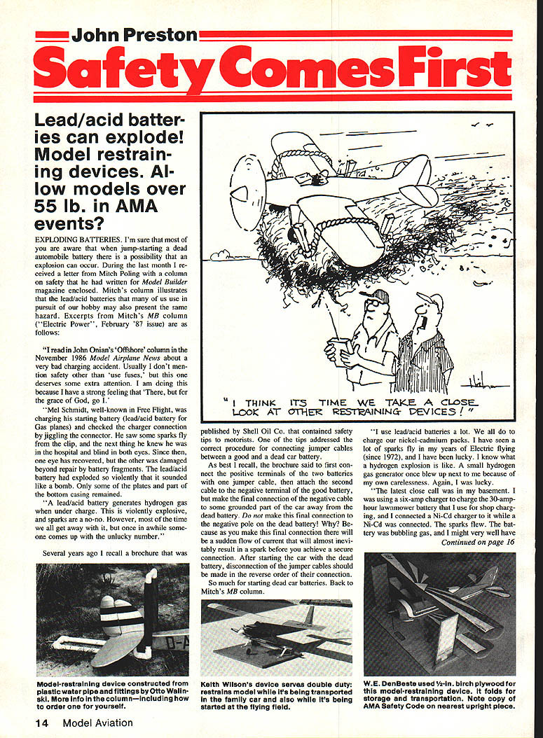 ___John Preston___________________________ Safety Comes First Lead/acid batter ies can explode Model restrain ing devices Al low models over 55 lb AMA events EXPLODING BAITERIES Im sure aware jump-starting dead automobile battery possibility explosion can occur During last month re ceived letter Mitch Poling column safety written Model Builder magazine enclosed Mitchs column illustrates lead/acid batteries us use pursuit hobby may also present same hazard Excerpts Mitchs MB column Electric Power February 87 issue follows read JoIm Onians Offshore column November 1986 Model Airplane News about very bad charging accident Usually dont men tion safety other use fuses deserves some extra attention am doing because have strong feeling grace God go Mel Schmidt well-known Free Flight charging starting battery lead/acid battery Gas planes checked charger connection jiggling connector saw some sparks fly clip next thing knew hospital blind both eyes Since eye has recovered other damaged beyond repair battery fragments lead/acid battery exploded violently sounded like bomb Only some plates part bottom casing remained lead/acid battery generates hydrogen gas under charge violently explosive sparks no-no However time get away once awhile some comes up unlucky number Several years ago recall brochure 4 hi lii K IT TIME WE TAKE CLOSE LCOk AT OTI-IE RES-IVAINU4cV tEV ICES ished Shell Oil Co contained safety tips motorists tips addressed correct procedure connecting jumper cables between good dead car battery As best recall brochure said first con nect positive terminals two batteries jumper cable attach second cable negative terminal good battery make final connection negative cable some grounded part car away dead battery make final connection negative pole dead battery cause make final connection will sudden flow current will almost inevi tably result spark before achieve secure connection After starting car dead battery disconnection jumper cables should made reverse order connection So much starting dead car batteries Back Mitchs MB column use lead/acid batteries lot charge nickel-cadmium packs have seen lot sparks fly years Electric flying since 1972 have lucky know what hydrogen explosion like small hydrogen gas generator once blew up next because own carelessness Again lucky latest close call basement using six-amp charger charge 30-amphour lawnmower battery use shop charg ing connected Ni-Cd charger Ni-Cd connected sparks flew bat tery bubbling gas might very well have Continued page 16 14 Model Aviation Model-restraining device constructed plastIc water pipe fittings Otto Walin ski info columnIncluding order yourself Keith Wilsons device serves double duty restrains model its being transported family car also its being started flying field WE DenBeste used 1/2-in birch piywood model-restraining device folds storage transportation Note copy AMA Safety Code nearest upright piece IRON. WITh ROLL-BARSI 1% Blackatone coating slides like buffer almost no adhesive buildup /- HI-Tech 50 vthermostat solves bubble m9lster5f new Black Baron Iron designed specif icafly model airplanes photographers shoe manufacturers exdusive roll bars fit fillets & undercambers flat sole sheeted & open structures its bevelled edges provide constant heat marks toe rounded & flat turned up toes cute counter productive coating 100% Black stone big improvement over less expensive coatings slides like butter over tacky surfaces almost no adhesive buildup An advanced Hi-Tech thermostat reduces temperature drift 50 Ordinary irons vary up 400 No wonder get bubbles cant explain See dealer ask new Black Baron Iron ____ hes out stock patient iron hand made individually checked accuracy comes qual ity Coverite always striving something JL CGVERflE 420 Babylon Rd Horsham PA1 19044 DAVE RORELENS Parke eti Outstanding small field performance novice & expert alike om airfoils top performance quality balsa plywood gned 3 channels Precision machine-cut balsa plywood 5995 Playmate 3 ch 50 sportfun fly 1 5-25 2 4 cycle fast assembly hand-cut kit$4995 Pronto 50 span 15-252 4 cycle 3 ch. hand-cut kit easily converted dec excellent beginner also challenges expert $3995 Windbreaker 50 span 20-25 2 4 cycle 4 ch aerobatic docile 6-5 hr rapid-fire assembly preci sion pre-cut balsa & ply wood complete hardware package mci capable complete AMA pattern $4995 Available dealer order dIrect 4L Add $2 shipping additional $2 COD Save COD send check money order WATER HOBBY ENTERPRISES 26 Sapphire Run Ocala FL 32672 5 687-2160 904-245-4653 next statistic Nothing happenedI lucky again Ive decided quit pushing luck some rules Im starting use right now recommend 1 Connect lead/acid battery charger battery want charge before plug charger AC supply other waythat charger already plugged AC supply connect charger output batterysparks will fly make con nection done charging unplug charger AC supply first should unclip charged lead acid battery charger charging oper ation generates lot hydrogen charged battery will probably bubbling think step disconnect battery charger dangerous Dont unclip charger until AC plug pulled 2 Never use lead/acid battery charge Ni-Cdt AC charger itself may producing gas inevitably sparks will occur charging Ni-Cds use lead/acid battery under charge advice doesnt apply does because have habit using charging battery leveling devicein effect using AC charger run Ni-Cd charger gives nice high-power charge Someday might really high-power charge have discontinued practice Ive lucky 3 Never connect Ni-Cd charger charge battery Ni-Cd pack plugged will cause heavy spark charger turned off Connect Ni-Cd charger charge battery first plug Ni-Cd pack Ni-Cd pack charged make sure charger turned off unplug Ni-Cd pack After can disconnect Ni-Cd charger charger battery before '4 using charger inverterthat boosts voltage seven cells can chargedbe very careful An inverter draws very high initial current no Ni-Cd pack connected may cause spark will much safe