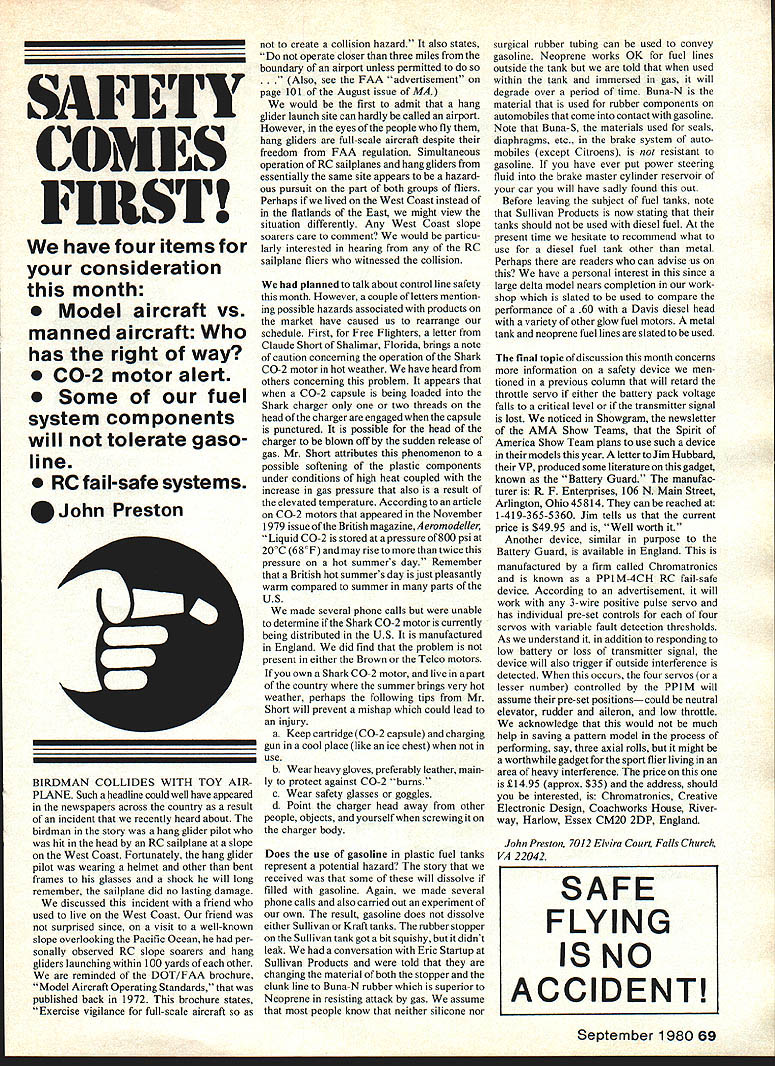 I SAFElY COMES FIRST have four items consideration month Model aircraft vs manned aircraft has right way CO-2 motor alert Some fuel system components will tolerate gaso line RC fail-safe systems John Preston BIRDMAN COLLIDES WITH TOY AIR PLANE Such headline could well have appeared newspapers across country result incident recently heard about birdman story hang glider pilot hit head RC sailplane slope West Coast Fortunately hang glider pilot wearing helmet other bent frames glasses shock will long remember sailplane did no lasting damage discussed incident friend used live West Coast friend surprised since visit well-known slope overlooking Pacific Ocean per sonally observed RC slope soarers hang gliders launching within 100 yards other reminded DOT/FAA brochure Model Aircraft Operating Standards published back 1972 brochure states Exercise vigilance full-scale aircraft create collision hazard also states operate closer three miles boundary airport unless permitted Also see FAA advertisement page 101 August issue MA would first admit hang glider launch site can hardly called airport However eyes people fly hang gliders full-scale aircraft despite freedom FAA regulation Simultaneous operation RC sailplanes hang gliders essentially same site appears hazard ous pursuit part both groups fliers Perhaps lived West Coast instead flatlands East might view situation differently Any West Coast slope soarers care comment would particu larly interested hearing RC sailplane fliers witnessed collision planned talk about control line safety month However couple letters mention ing possible hazards associated products market have caused us rearrange schedule First Free Flighters letter Claude Short Shalimar Florida brings note caution concerning operation Shark CO-2 motor hot weather have heard others concerning problem appears CO-2 capsule being loaded Shark charger two threads head charger engaged capsule punctured possible head charger blown off sudden release gas Mr Short attributes phenomenon possible softening plastic components under conditions high heat coupled increase gas pressure also result elevated temperature According article CO-2 motors appeared November 1979 issue British magazine Aeromodeller Liquid CO-2 stored pressure 800 psi 200C 680F may rise twice pressure hot summers day Remember British hot summers day just pleasantly warm compared summer parts US made several phone calls unable determine Shark CO-2 motor currently being distributed US manufactured England did find problem present either Brown Telco motors own Shark CO-2 motor live part country summer brings very hot weather perhaps following tips Mr Short will prevent mishap could lead injury a Keep cartridge C 0-2 capsule charging gun cool place like ice chest use b Wear heavy gloves preferably leather main ly protect against CO-2 burns c Wear safety glasses goggles d Point charger head away other people objects yourself screwing charger body Does use gasoline plastic fuel tanks represent potential hazard story received some will dissolve filled gasoline Again made several phone calls also carried out experiment own result gasoline does dissolve either Sullivan Kraft tanks rubber stopper Sullivan tank got bit squishy didnt leak conversation Eric Startup Sullivan Products told changing material both stopper clunk line Buna-N rubber superior Neoprene resisting attack gas assume people know neither silicone nor surgical rubber tubing can used convey gasoline Neoprene works OK fuel lines outside tank told used within tank immersed gas will degrade over period time Buna-N material used rubber components automobiles come contact gasoline Note Buna-S materials used seals diaphragms etc brake system auto mobiles except Citroens resistant gasoline have ever put power steering fluid brake master cylinder reservoir car will have sadly found out Before leaving subject fuel tanks note Sullivan Products now stating tanks should used diesel fuel present time hesitate recommend what use diesel fuel tank other metal Perhaps readers can advise us have personal interest since large delta model nears completion work shop slated used compare performance 60 Davis diesel head variety other glow fuel motors metal tank neoprene fuel lines slated used final topic discussion month concerns information safety device men tioned previous column will retard throttle servo either battery pack voltage falls critical level transmitter signal lost noticed Showgram newsletter AMA Show Teams Spirit America Show Team plans use such device models year letter Jim Hubbard VP produced some literature gadget known Battery Guard manufac turer R F Enterprises 106 N Main Street Arlington Ohio 45814 can reached 1-419-365-5360 Jim tells us current price $4995 Well worth Another device similar purpose Battery Guard available England manufactured firm called Chromatronics known PPl M-4CH RC fail-safe device According advertisement will work 3-wire positive pulse servo has individual pre-set controls four servos variable fault detection thresholds As understand addition responding low battery loss transmitter signal device will also trigger outside interference detected occurs four servos lesser number controlled PPl M will assume pre-set positionscould neutral elevator rudder aileron low throttle acknowledge would much help saving pattern model process performing say three axial rolls might worthwhile gadget sport flier living area heavy interference price 1495 approx $35 address should interested Chromatronics Creative Electronic Design Coachworks House Riverway Harlow Essex CM2O 2DP England John Preston 7012 Elvira Court Falls Church VA 22042 September 1980 69 SAFE FLYING ISNO ACCIDENT