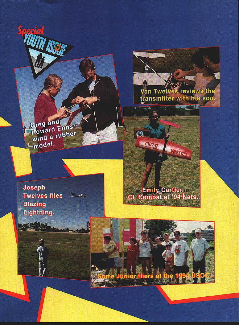 NO OCR TEXT NO OCR TEXT NO OCR TEXT shut-offs throttles Speed simple just have take off get pylon fly level need good engine stable airplane dont look over speed trainer 21 Sport Speed Its easy build easy fly several good engines available power some quite inexpensive present AMA rules Sport Speed allow profile models flown competition have build fancy Speed model magnesium pan streamlining monoline tuned pipes other trick stuff would excellent model Juniors Seniors fly next years Nats usually few entries successful flight has good chance win trophy can start inexpensive engine like event can get faster powerful put same airplane model will go 100 mph good engine dont think its pansy single wheel doesnt add much drag makes takeoffs simple saves props experienced builder wont have trouble building model Ill try explain everything Construction Solid balsa built-up wing Covering/finish Epoxy and/or iron-on film January1995 83 Homemade brass tank holds about ounce fuel Aluminum plate under engine absorbs vibration increases rpm landing gear can simple sheet aluminum titanium shown round music wire can used K&B 21 starts easily crankcase pressure runs steadily does well over 100 mph APC 7 x 6 prop profile-fuselage Ten Penny fancy model very effective Spinner looks neat helps starting Flying weight 20 ounces ATier flying Ten Penny Stunt/sport racing flier Skip Spoula sons Ryan Mall ready Speed competition 1 02 WING WEIGHT OR TEN PENNYS 118 BALSA RUDDER K & B 21 SHOWN SPINNER - N EE WINO TIP CROSS SECTION 3132 PLYWOOD DOUBLERS BOTH SIDES 3/8 X 112 HARDWOOO MOTOR MOUNTS IllS TITANIUM OR ALUMINUM GEAR 1 TO 11/2 CUT OUT TOWHEEL CLEAR ENGINE ALTERNATE 1/a WIRE GEAR I' Lv C ROO / 3/6 BALSA FUSELAGE 3/32 OD BRASS LEADOUT GUIDES 7W ALTERNATE SOLID BALSA WING 41 1164 PLYWOOD BOTH SIDES 1/16 PLYWOOD BELLCRANK MOUNT V7F 1/8 BALSA STAB & ELEVATOR NOTE THREE TYPES OF HINGES SHOWN SEE TEXT FISHLINE HINGE EASY HINGE CLOTH HINGE TEN PENNY TRAINER DESIGNED BY GLENN LEE 1/16 SHEET TOP AND BOTTOM WING CENTER CROSS SECTION 0 0 CD 0 CD CA CD CD CD Ca CD -L 0 beginner can understand CONSTRUCTION Look plans over carefully before starting build decide what part want build first usually start fuselage glue drying can work other parts Pick out piece good firm rock-hard 3/ x 3 balsa buy saw out hardwood engine mounts can square I8 x /2just sure same thickness fuselage balsa Saw slots mounts jig saw band saw distance between fits engine try get reasonably close fit dont have power saw just use X-Acto knife trim fit Notice plans show fulllength plywood sheet both sides fuselage extending under nose doublers plywood can either IM /32 greatly increases strength crash resistance fuselage well worth extra effort Cut plywood least 1/2 inch oversize around can trim shape after gluing Glue two sheets engine mounts fuselage epoxy aliphatic resin woodworkers glue clamp weigh assembly down thick piece plywood other flat surface Put waxed paper down first dont glue fuselage board After glue has set dry trim excess thin plywood sheets shape fuselage Now can add I32 plywood doublers front Cut two pieces shape taper back edges streamline little make blend fuselage Before glue doublers fuselage locate position accurately time pounding small nall brad through plywood little way fuselage nails will hold pieces place glue clamp Remove nails after glue dry round corners test-mount engine streamline nose area Wing If cannot build hesitant build hollow wing shown can use solid balsa mount external control system solid wing can thinner built-up wing since bellcrank doesnt have inside hollow wing probably faster air though thicker external controls add lot drag built-up wing looks lot neater Whichever wing decide build must strong model weighs 20 ounces K&B 21 engine pull test will 60 pounds wing-to-fuselage joint must also able take pull have take extra pains make joint capable taking load decide go solid-balsa wing cut shape medium heavy 1/4-inch wood carve airfoil shape block plane carving knife sanding block alrfoil can flat-bottom symmetrical either will fly okay can change profile shape anything preferjust keep about same size After wing has sanded glue center /8 plywood reinforcement leadout guides place Carve hollow wingtip weight wingtip weight necessary keep airplane rolling takeoff must use 020 diameter solid music wire lines 60 feet long meet rnles heavy About ounce weight enough can chunk lead hobby shops sell can combination washers lead shot coins about right weight Use postal scale measure have go post office grocery store use scale ounce equivalent about ten pennies gives idea name airplane comes Epoxy weight near outer wingtip smear glue over weightyou dont want coming loose Glue piece fiberglass cloth over make sure stays place build hollow wing start sheet /16 hard balsa cut shape shown either buy piece wide enough splice narrow sheets together instant better known cyanoacrylate CyA glue NEED RIC ACCESSORIES FLY TO HITEC RCD FOR ALL YOUR ACCESSORY NEEDS 6 Y harness 7351# -IIz 6 Buffered Y harness 7354# JIz 12 Aileron Extension 7345# 24 Aileron Extension 7346# 6 Buffered Servo Conn 7356# LIiIi 9 Male Servo Conn 7342# 9 Female shown 7343# Switch Harness w/Battery & Clip 72 15# Please specify connector type orderi ng Part #followed Airt J Put S HitecIRCD& JR ALSO AVAILABLE 50 ft Bulk Servo Wire 3001 Rubber Ducky Antenna 1125 Flight Preserver wNelcro 8480 hit RCD 10729 Wheatlands Ave #C Santee CA 92071-2883 619 258-4940 January1995 85 B&P Associates Gives Total Flight Line FREEDOM new electric starter battery pack cuts cord has always tied starter power panel Discover freedom being able start plane wherever added safety less wire get caught prop charge hefty 4 Amp/hour pack will take through weekend flying power enough spare dont stop have Ni-Cads virtually size imaginable cut experimenter free design whatever takes make yours best setup field battery needs call write B&P Associates PO Box 22054 Waco TX 76702-2054 817662-5587 PR
