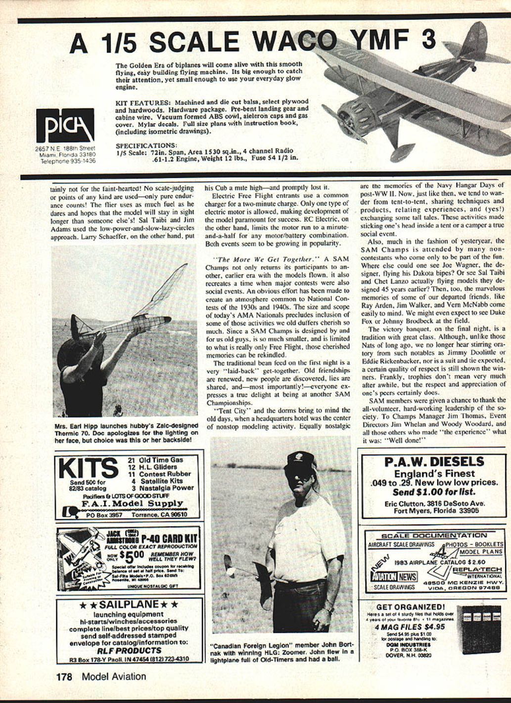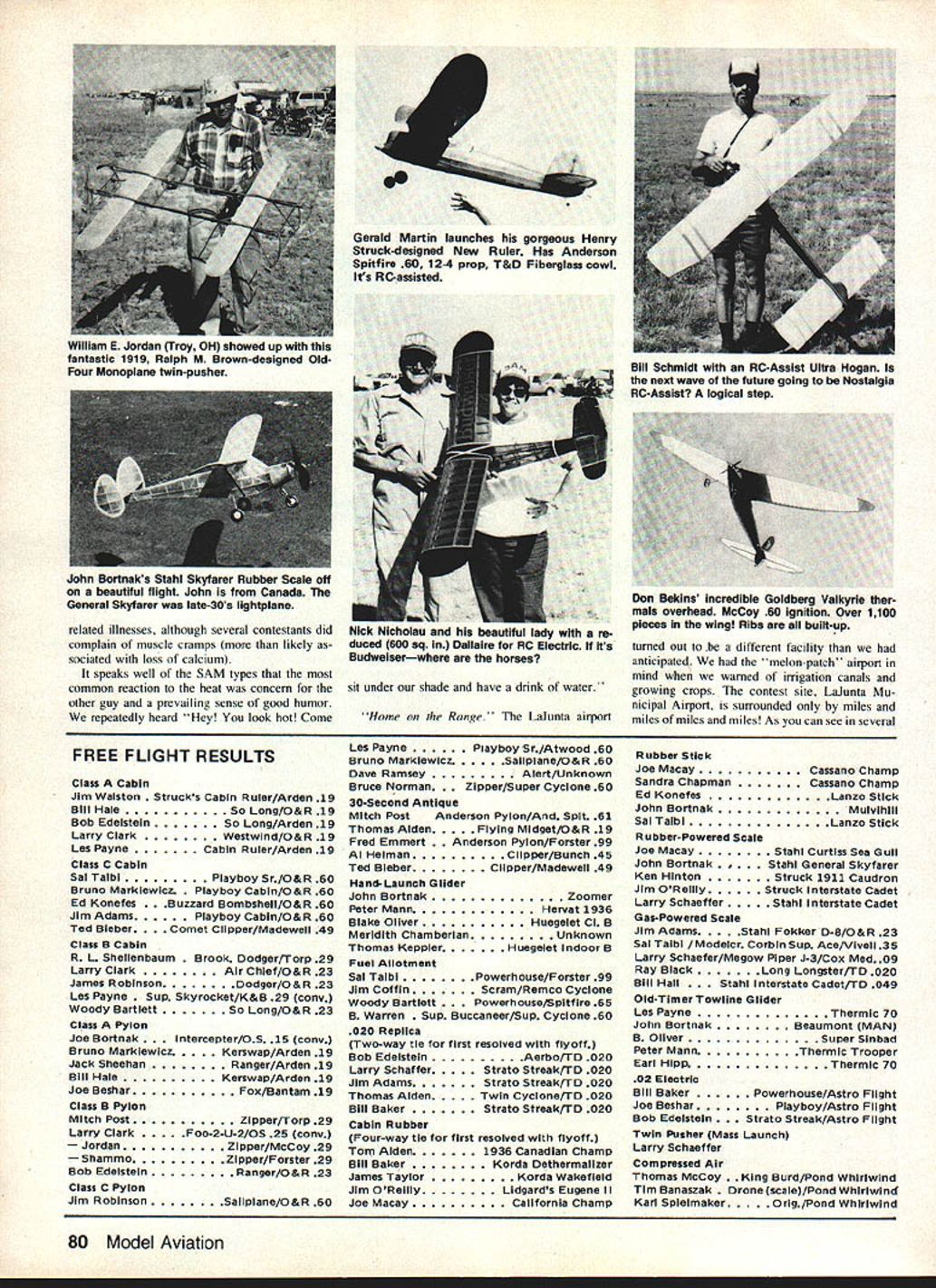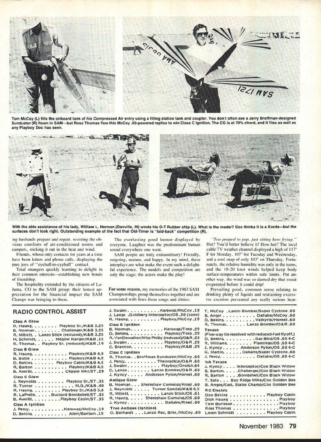 Oft hot Colorado sky climbs Garami-designed Molecule Builder R L Schellenbaum Albuquerque NM used Arden 09 power Two clues FFnot RC-Assist no transmitter sight dethermalizer fuse sticking tail Tent City background CN/ SM SAM CHAMPS much just national contest models pre-WW II era boggles mind report / c*1AAPS tlyngporton f lalundexpe en e would o leave m re mp run Ia t ng aspetts unchronicled Competition may well life blood SAM mosement its heart soul its people -7 As 1983 SAM champs unfolded struck repeatedly extraordinary interplay between among participants wives helpWhen SAMs around can MECA far away Model Engine Collectors Association Collecto the first day heres half Tim Daniels incredible McCoy engine display L contains example McCoy engine ever produced computer set up recall data engine Either John Pond has shrunk Ror enlarged Comet Clipper Its actually 10ft Clipper Mk 78 Model Aviation Tom McCoy L fills onboard tank Compressed Air entry using filling station tank Coupler dont often see Jerry Broftman-designed Sunduster R flown SAMbut Ross Thomas flew Mccoy 60-powered replica win Class C Ignition CG 70% chord flies well Playboy Doc has seen able assistance lady William L Herman Danville IN winds O-T Rubber ship L What model Doc thinks Kordabut surfaces dont look right Outstanding example fact Old-Timer laid-back competition R ing husbands prepare repair resisting ob vious comforts air-conditioned rooms campers sticking out heat wind Friends contacts years time have heen letters phone calls displaying pure joys eyeball-to-eyeball contact Total strangers quickly learning delight common interestsestablishing new bonds friendship hospitality extended citizens La Junta CO SAM group honest ap preciation financial impact SAM Champs bringing RADIO CONTROL ASSIST Class Glow R HaungPlayboy Sr/K&B 325 B NormanChallenger/K&B 325 R Miltett o Stick reduced/K&B 325 H SchmidtMegow Ranger/K&B 15 R Thomas Playboy Sr reduced/K&B 19 Class B Glow R HaungPlayboy/K&B 49 B ButcePlayboy/K&B 49 D BekinsPlayboy Cabtn/K&B 45 R BartonPlayboy/K&B 45 B AverillClipper Mkl/ST 29 Class C Glow J ReynoldsPlayboy Sr/ST 35 R TurnerMG/K&B 40 R HaungPlayboy Sr/K&B 58 R LaPrelleBuzzard Bombshell/ST 35 B AveritiPlayboy Cabin/ST 35 Class Ignition J PercyKerswap/McCoy 19 0 BekinsAlert/Bantam 19 everlasting good humor displayed everyone Laughter predominant human sound everywhere went SAM people truly extraordinary Friendly outgoing mature happy mind interplays what make event such delight ful experience models competition stage actors make play some reason memories 1983 SAM Championships group themselves together associated lines songs ditties J SwaimKerswap/McCoy 19 J Lange Gotdberg Interceptor/OS 20 cony R HaungPlayboy/McCoy 19 Class B Ignition B Norman Kerswap/Torp 29 D Bekins Playboy/Torp 29 RVanDewalker/Miss Philly reduced/O&R 23 J SwaimPlayboy/O&R 29 C BrannonPlayboy/K&B 29 Class C Ignition R Thomas fman Sunduster/McCoy 60 J PercyTheoradical/O&R 60 J SwaimPtayboy/Orwlck64 C LanzoLanzo Bomber/O&R 60 1 KyncyAnderson Pylon/Hornet 60 Antique Glow B Norman reshaw Cumutijs/R0551 60 J ReynoldsTurner Speclal/K&B 65 R MillettLanzo Stick/OS 61 R HaungShereshaw Cumulus/OS 60 J KyncyDallatre/Rossi 60 True Antique Ignition 0 Berhardt nzo Rec Brkr/McCoy 60 Too pooped ro pop just slung frsing' Hot Youd better believe hot local cable TV weather channel displayed high 1170 F Monday 1070 Tuesday Wednesday cool snap 1030 Thursday Fortu nately relative humidity teens 10-20 knot winds helped keep body surface-temperatures within safe limits Put other way wind damed dry sweat evaporated before could drip Prevailing good common sense relating drinking plenty liquids restraining excess ive exertion prevented really serious heatT McCoy Lanzo Bomber/Super Cyclone 60 B AngelDallalre/McCoy 60 D BekinsValkyrle/Hornet 60 R ThomasLanzo Bomber/O&R 60 Texaco Five-way tie resolved reduced-fuel flyoff 0 BeklnsGas Bird/OS 60 4-C R WilliamsFlamIngo/OS 60 4-C J KyncyAnderson Pylon/OS 60 4-C G MartinDallaire/Super Cyclone 60 J PercyDallaIre/OS 60 4-C 112A Texaco J Kyncy erceptor/Cox Black Widow B BartonChallenger/Cox Black Widow R Barton mbshell/Cox Black WIdow T Sato Ridge Mike/Cox Golden Bee B Angos/East States Champ/Cox Golden Bee RC Electric Don BekinaPlayboy Cabin Dick HaungPlayboy Tom BurlesonPlayboy Ross ThomasPlayboy Loren SchmidtPlayboy CabIn November 1983 79 related illnesses although several contestants did complain muscle cramps likely sociated loss calcium speaks well SAM types common reaction heat concern other guy prevailing sense good humor repeatedly heard Hey look hot Come Gerald Martin launches gorgeous Henry Struck-designed New Ruler Has Anderson Spitfire 60 1 2-4 prop T&D Fiberglass cowl its RC-assisted sit under shade have drink water Home Range Lalunta airport turned out different facility anticipated melon-patch airport mind warned irrigation canals growing crops contest site Laiunta Mu nicipal Airport surrounded miles miles miles miles As can see several FREE FLIGHT RESULTS Class Cabin Jim Waiston cks CabIn Ruier/Arden 19 Bill HaleSo Long/O&R 19 Bob EdeisteinSo Long/Arden 19 Larry ClarkWestwind/O&R 19 Las PayneCabin Ruier/Arden 19 Class C Cabin Sal TalbiPlayboy Sr/O&R 60 Bruno Marklewicz boy Cabin/O&R 60 Ed Konefes zard Bombsheil/O&R 60 Jim Adams Playboy Cabin/O&R 60 Ted Bleber met Clipper/Madeweli 49 Class B Cabin R L Shellenbaum k Dodger/Torp 29 Larry Clark Air Chlef/O&R 23 James Robinson Dodger/O&R 23 Lea Payne Skyrocket/K&B 29 cony Woody Bartlett So Long/O&R 23 Class Pylon Joe BOrtnak tercepter/OS 15 cOny Bruno Markiewicz erawap/Arden 19 Jack SheehanRanger/Arden 19 Bill HaleKerawap/Arden 19 Joe BesharFox/Bantam 19 Class B Pylon Mitch PostZlpper/Torp 29 Larry ClarkFoo-2-U-2/OS 25 cony JordanZipper/McCoy 29 ShammoZipper/Forster 29 Bob EdeisteinRanger/O&R 23 Class C Pylon Jim RobinsonSaiipiene/O&R 60 Las PaynePlayboySr/Atwood 60 Bruno MarkiewiczSallpiane/O&R 60 Dave RamseyAiert/Unknown Bruce Norman per/Super Cyclone 60 30-Second 