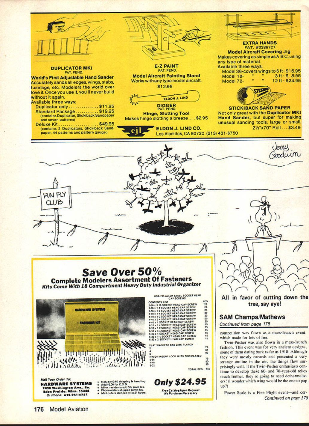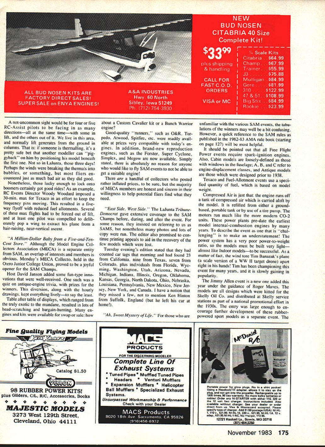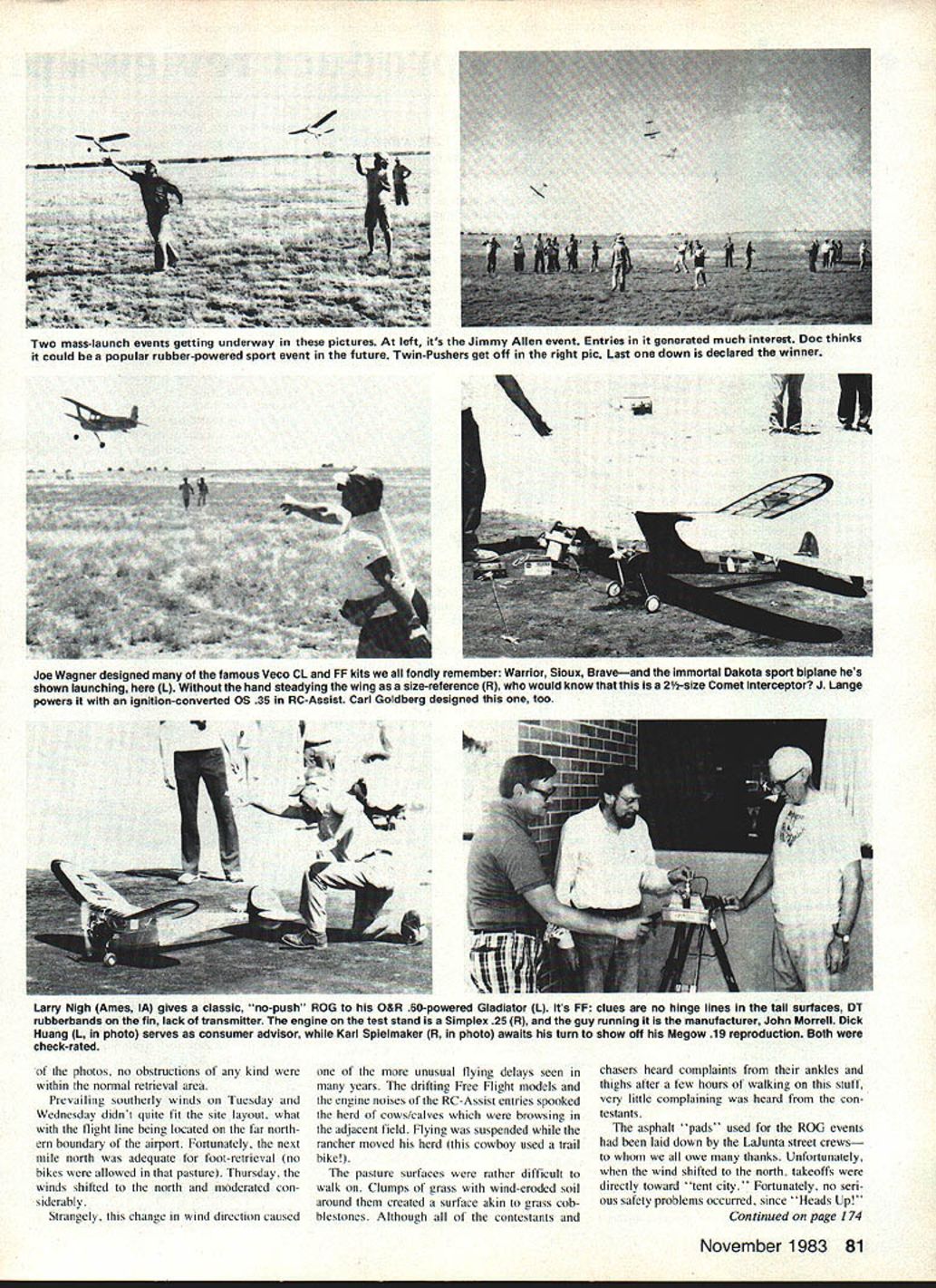 Oft hot Colorado sky climbs Garami-designed Molecule Builder R L Schellenbaum Albuquerque NM used Arden 09 power Two clues FFnot RC-Assist no transmitter sight dethermalizer fuse sticking tail Tent City background CN/ SM SAM CHAMPS much just national contest models pre-WW II era boggles mind report / c*1AAPS tlyngporton f lalundexpe en e would o leave m re mp run Ia t ng aspetts unchronicled Competition may well life blood SAM mosement its heart soul its people -7 As 1983 SAM champs unfolded struck repeatedly extraordinary interplay between among participants wives helpWhen SAMs around can MECA far away Model Engine Collectors Association Collecto the first day heres half Tim Daniels incredible McCoy engine display L contains example McCoy engine ever produced computer set up recall data engine Either John Pond has shrunk Ror enlarged Comet Clipper Its actually 10ft Clipper Mk 78 Model Aviation Tom McCoy L fills onboard tank Compressed Air entry using filling station tank Coupler dont often see Jerry Broftman-designed Sunduster R flown SAMbut Ross Thomas flew Mccoy 60-powered replica win Class C Ignition CG 70% chord flies well Playboy Doc has seen able assistance lady William L Herman Danville IN winds O-T Rubber ship L What model Doc thinks Kordabut surfaces dont look right Outstanding example fact Old-Timer laid-back competition R ing husbands prepare repair resisting ob vious comforts air-conditioned rooms campers sticking out heat wind Friends contacts years time have heen letters phone calls displaying pure joys eyeball-to-eyeball contact Total strangers quickly learning delight common interestsestablishing new bonds friendship hospitality extended citizens La Junta CO SAM group honest ap preciation financial impact SAM Champs bringing RADIO CONTROL ASSIST Class Glow R HaungPlayboy Sr/K&B 325 B NormanChallenger/K&B 325 R Miltett o Stick reduced/K&B 325 H SchmidtMegow Ranger/K&B 15 R Thomas Playboy Sr reduced/K&B 19 Class B Glow R HaungPlayboy/K&B 49 B ButcePlayboy/K&B 49 D BekinsPlayboy Cabtn/K&B 45 R BartonPlayboy/K&B 45 B AverillClipper Mkl/ST 29 Class C Glow J ReynoldsPlayboy Sr/ST 35 R TurnerMG/K&B 40 R HaungPlayboy Sr/K&B 58 R LaPrelleBuzzard Bombshell/ST 35 B AveritiPlayboy Cabin/ST 35 Class Ignition J PercyKerswap/McCoy 19 0 BekinsAlert/Bantam 19 everlasting good humor displayed everyone Laughter predominant human sound everywhere went SAM people truly extraordinary Friendly outgoing mature happy mind interplays what make event such delight ful experience models competition stage actors make play some reason memories 1983 SAM Championships group themselves together associated lines songs ditties J SwaimKerswap/McCoy 19 J Lange Gotdberg Interceptor/OS 20 cony R HaungPlayboy/McCoy 19 Class B Ignition B Norman Kerswap/Torp 29 D Bekins Playboy/Torp 29 RVanDewalker/Miss Philly reduced/O&R 23 J SwaimPlayboy/O&R 29 C BrannonPlayboy/K&B 29 Class C Ignition R Thomas fman Sunduster/McCoy 60 J PercyTheoradical/O&R 60 J SwaimPtayboy/Orwlck64 C LanzoLanzo Bomber/O&R 60 1 KyncyAnderson Pylon/Hornet 60 Antique Glow B Norman reshaw Cumutijs/R0551 60 J ReynoldsTurner Speclal/K&B 65 R MillettLanzo Stick/OS 61 R HaungShereshaw Cumulus/OS 60 J KyncyDallatre/Rossi 60 True Antique Ignition 0 Berhardt nzo Rec Brkr/McCoy 60 Too pooped ro pop just slung frsing' Hot Youd better believe hot local cable TV weather channel displayed high 1170 F Monday 1070 Tuesday Wednesday cool snap 1030 Thursday Fortu nately relative humidity teens 10-20 knot winds helped keep body surface-temperatures within safe limits Put other way wind damed dry sweat evaporated before could drip Prevailing good common sense relating drinking plenty liquids restraining excess ive exertion prevented really serious heatT McCoy Lanzo Bomber/Super Cyclone 60 B AngelDallalre/McCoy 60 D BekinsValkyrle/Hornet 60 R ThomasLanzo Bomber/O&R 60 Texaco Five-way tie resolved reduced-fuel flyoff 0 BeklnsGas Bird/OS 60 4-C R WilliamsFlamIngo/OS 60 4-C J KyncyAnderson Pylon/OS 60 4-C G MartinDallaire/Super Cyclone 60 J PercyDallaIre/OS 60 4-C 112A Texaco J Kyncy erceptor/Cox Black Widow B BartonChallenger/Cox Black Widow R Barton mbshell/Cox Black WIdow T Sato Ridge Mike/Cox Golden Bee B Angos/East States Champ/Cox Golden Bee RC Electric Don BekinaPlayboy Cabin Dick HaungPlayboy Tom BurlesonPlayboy Ross ThomasPlayboy Loren SchmidtPlayboy CabIn November 1983 79 related illnesses although several contestants did complain muscle cramps likely sociated loss calcium speaks well SAM types common reaction heat concern other guy prevailing sense good humor repeatedly heard Hey look hot Come Gerald Martin launches gorgeous Henry Struck-designed New Ruler Has Anderson Spitfire 60 1 2-4 prop T&D Fiberglass cowl its RC-assisted sit under shade have drink water Home Range Lalunta airport turned out different facility anticipated melon-patch airport mind warned irrigation canals growing crops contest site Laiunta Mu nicipal Airport surrounded miles miles miles miles As can see several FREE FLIGHT RESULTS Class Cabin Jim Waiston cks CabIn Ruier/Arden 19 Bill HaleSo Long/O&R 19 Bob EdeisteinSo Long/Arden 19 Larry ClarkWestwind/O&R 19 Las PayneCabin Ruier/Arden 19 Class C Cabin Sal TalbiPlayboy Sr/O&R 60 Bruno Marklewicz boy Cabin/O&R 60 Ed Konefes zard Bombsheil/O&R 60 Jim Adams Playboy Cabin/O&R 60 Ted Bleber met Clipper/Madeweli 49 Class B Cabin R L Shellenbaum k Dodger/Torp 29 Larry Clark Air Chlef/O&R 23 James Robinson Dodger/O&R 23 Lea Payne Skyrocket/K&B 29 cony Woody Bartlett So Long/O&R 23 Class Pylon Joe BOrtnak tercepter/OS 15 cOny Bruno Markiewicz erawap/Arden 19 Jack SheehanRanger/Arden 19 Bill HaleKerawap/Arden 19 Joe BesharFox/Bantam 19 Class B Pylon Mitch PostZlpper/Torp 29 Larry ClarkFoo-2-U-2/OS 25 cony JordanZipper/McCoy 29 ShammoZipper/Forster 29 Bob EdeisteinRanger/O&R 23 Class C Pylon Jim RobinsonSaiipiene/O&R 60 Las PaynePlayboySr/Atwood 60 Bruno MarkiewiczSallpiane/O&R 60 Dave RamseyAiert/Unknown Bruce Norman per/Super Cyclone 60 30-Second 