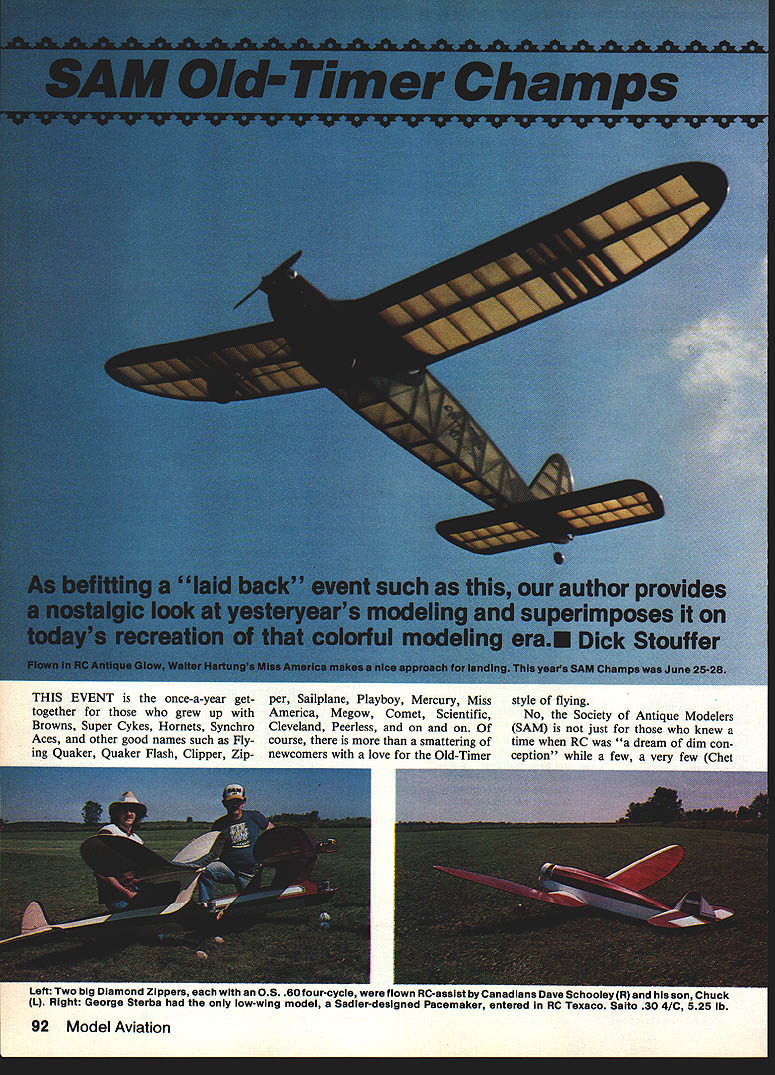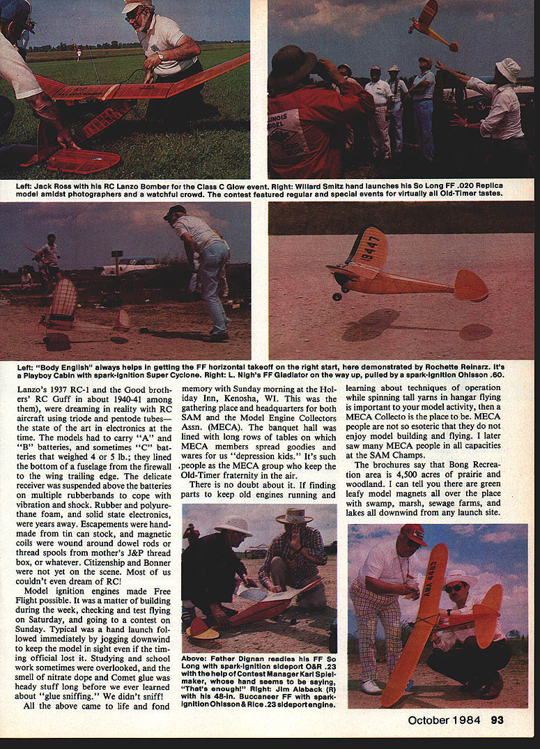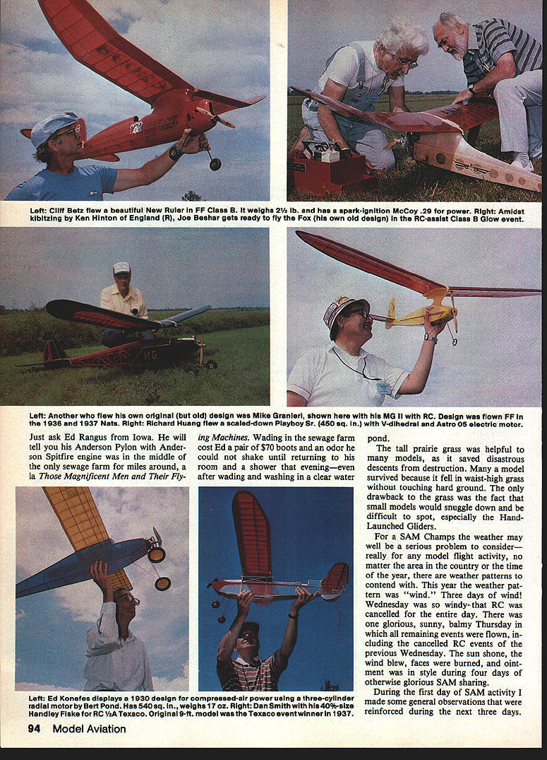 THIS EVENT once-a-year gettogether grew up Browns Super Cykes Hornets Synchro Aces other good names such Fly ing Quaker Quaker Flash Clipper Zipper Sailplane Playboy Mercury Miss America Megow Comet Scientific Cleveland Peerless on course smattering newcomers love Old-Timer style flying No Society Antique Modelers SAM just knew time RC dream dim con ception few very few Chet Lull IWO og uiamona tippers eacfl OS 50 four-cycle flown RC-assist Canadians Dave Schooley R son .I1UCK L Right George Sterba low-wing model Sadler-designed Pacemaker entered RC Texaco Salto 30 4/C 525 lb 92 Model Aviation Left Jack Ross RC Lanzo Bomber Ciass C Giow event Right Wiiiard Smitz hand iauncnes nis o kong i-i- uzu Repilca modei amidst photographers watchfui crowd contest featured regular speclai events virtuaiiy cii Oid-Timer tnstaa Lanzos 1937 RC-l Good broth ers RC Guff about 1940-41 among dreaming reality RC aircraft using triode pentode tubes state art electronics time models carry B batteries sometimes C bat teries weighed 4 5 lb lined bottom fuselage firewall wing trailing edge delicate receiver suspended above batteries multiple rubberbands cope vibration shock Rubber polyure thane foam solid state electronics years away Escapements hand made tin can stock magnetic coils wound around dowel rods thread spools mothers J&P thread box whatever Citizenship Bonner yet scene Most us couldnt dream Rd Model ignition engines made Free Flight possible matter building during week checking test flying Saturday going contest Sunday Typical hand launch fol lowed immediately jogging downwind keep model sight tim ing official lost Studying school work sometimes overlooked smell nitrate dope Comet glue heady stuff long before ever learned about glue sniffing didnt sniff above came life fond memory Sunday morning Hol iday Inn Kenosha WI gathering place headquarters both SAM Model Engine Collectors Assn MECA banquet hall lined long rows tables MECA members spread goodies wares us depression kids Its such people MECA group keep Old-Timer fraternity air no doubt about finding parts keep old engines running learning about techniques operation spinning tall yarns hangar flying important model activity MECA Collecto place MECA people esoteric enjoy model building flying later saw MECA people capacities SAM Champs brochures say Bong Recrea tion area 4500 acres prairie woodland can tell green leafy model magnets over place swamp marsh sewage farms lakes downwind launch site October 1984 93 Left Body Engilsh always heips getting FF horizontai takeoff right start demonstrated Rochette Reinarz its Piayboy Cabin spark-Ignition Super Cycione Right L Nighs PP Giadiator way up puiied byc spark-ignition Ohisson 60 ruinurreaaes nia rn-u- o LUfl9 spark-rngnnon sideport O&R 23 help Contest Manager Kari Spielmaker hand seems saying Thats enoughi Right Jim Alaback R 48-in Buccaneer PP sparkignition Ohisson & Rice 23 sideportengine Left Cliff Betz flew beautIful New Ruler FF Class B weighs 2/a lb has spark-IgnItIon McCoy 29 power Right Amidst kibitzing Ken Hlnton England R Joe Beshar gets ready fly Fox own old desIgn RC-asslst Class B Glow event Left Another flew own origInal old design Mike Granleri shown MG II RC Design flown FF 1936 1937 Nats Right Richard Huang flew scaled-dawn Playboy Sr 450 sq V-dIhedral Astro 05 electrIc motor Just ask Ed Rangus Iowa will tell Anderson Pylon Ander son Spitfire engine middle sewage farm miles around la Magnificent Men Flying Machines Wading sewage farm cost Ed pair $70 boots odor could shake until returning room shower eveningeven after wading washing clear water pond tall prairie grass helpful models saved disastrous descents destruction model survived because fell waist-high grass touching hard ground drawback grass fact small models would snuggle down difficult spot especially HandLaunched Gliders SAM Champs weather may well serious problem consider really model flight activity no matter area country time year weather patterns contend year weather pat tern wind Three days wind Wednesday windy- RC cancelled entire day glorious sunny balmy Thursday remaining events flown cluding cancelled RC events previous Wednesday sun shone wind blew faces burned oint ment style during four days otherwise glorious SAM sharing During first day SAM activity made some general observations reinforced during next three days 94 Model Aviation Left Ed KoneTes aispiays i uso assign compresses-air power using tnree-cyiinaer radial motor Bert Pond Has 540 sq weighs 17 oz Right Dan Smith hls4O%-size Handley Fiske RC hA Texaco Original 9-ft model Texaco eventwInner 1937 Left Also flying own design iong ago Joe Konefes firing up spark Super Cycione RC-assiat Buzzard Bomb sheii Right Another nice Buzzard Bombsheii Ed Smithfiown RC Ciass C ignition Anderson Splifire engine Left Bob Edeistein fiew Good-designed FF Guff SuperCycione power Antique ignition Right RC 1/aA Texaco entered Ai Geir fiew beautiful accied-down Miss America model appeais take iook Doc Mathews version July MA Throughout SAM Champs existed air inclusiveness left no person out wished young people participating gives hope SAM last mans club Wives active hus bands hobby helpers timers clerks waiters models processing lines especially think Chuck Schooley son Dave Canada Cliff Betz another young man Dan Dougherty Sr present son helper numerous events Tim Banaszak has around Old-Timers least 15 years appears 30s Theres Arthur Peterse young man good skill Roger LaPrelle entered Jimmy Allen competition encourag ing some young people interested past contributed model avia tion today competitive spirit missing elder filers drive very best presentand desire help others very best helping hand shared brotherhood evident around Proof com Len IL-mi inen rnrnon OT anglana jonn ona 5AM secretary Bert Pond two Ponds arent related Center Simpiex Hornet ig plain-bearIng ignition engine displayed John Morrili Youve no doubt seen ads MA RIght Herb Wahi some engines has manufactu