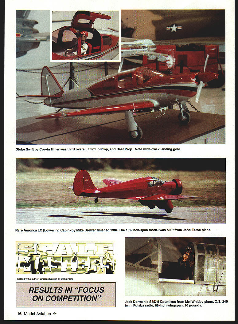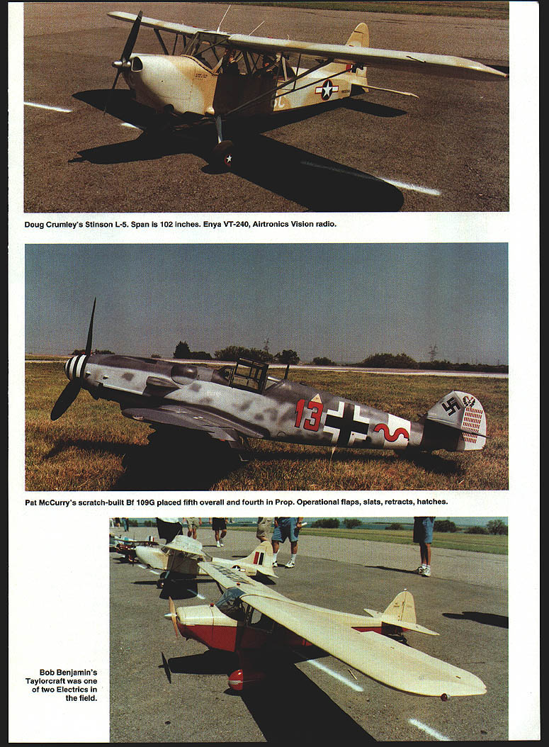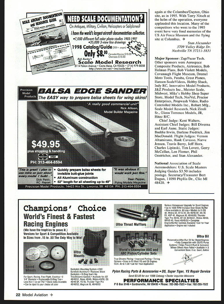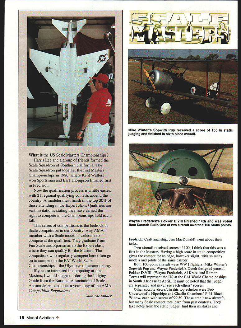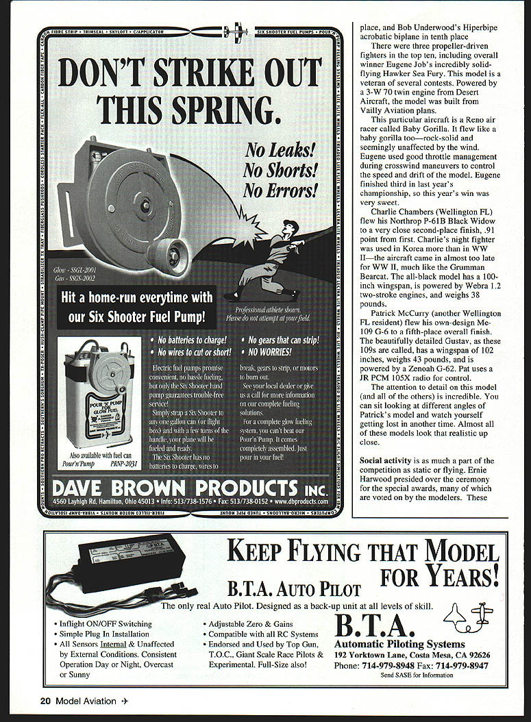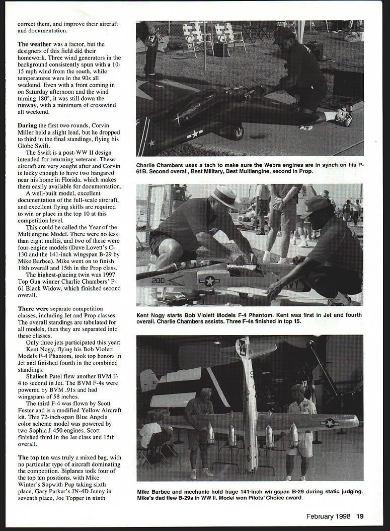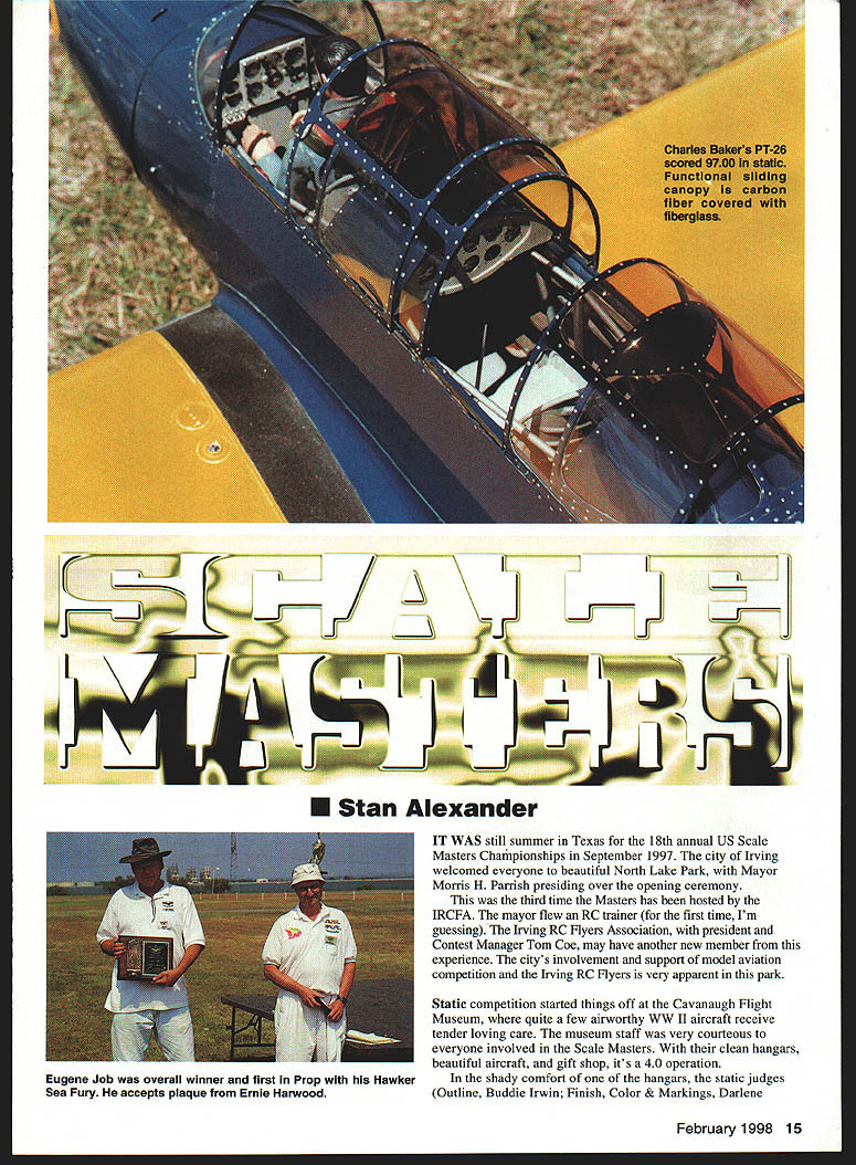F IT WAS still summer Texas 18th annual US Scale Masters Chahpionships September 1997 city Irving welcomed everyone beautiful North Lake Park Mayor Morris H Parrish presiding over opening ceremony third time Masters has hosted IRCFA mayor flew RC trainer first time Im guessing Irving RC flyers Association president Contest Manager Tom Coe may have another new member experience citys involvement support model aviation competition Irving RC flyers very apparent park Static competition started things off Cavanaugh Flight Museum quite few airworthy WW II aircraft receive tender loving care museum staff very courteous everyone involved Scale Masters clean hangars beautiful aircraft gift shop its 40 operation shady comfort hangars static judges Outline Buddie Irwin Finish Color & Markings Darlene February 1998 15 h jJ E U Stan Alexander Eugene Job overall winner first Prop Hawker Sea Fury accepts plaque Ernie Harwood 4fl~ Photos sutho G aph c Des gn Csrts Kunz Jack Dormans SBD-5 Dauntless Mel Whitley plans OS 240 twin Futaba radio 88-inch wingspan 26 pounds 16 Model Aviation e Swift Corvin Miller third overall third Prop Best Prop Note wide-track landing gear Rare Aeronca LC Low-wing Cabin Mike Brewer finished 13th 109-inch-span model built John Eaton plans RESULTS IN FOCUS ON COMPETITION Pat McCurrys scratch-built Bf 109G placed fifth overall fourth Prop Operational flaps slats retracts hatches Doug Crumleys Stinson L-5 Span 102 inches Enya VT-240 Airtronics Vision radio 5Li Fredrick Craftsmanship Jim MacDonald went about tasks Two aircraft received scores 100 think first Masters Having high score static competition gives competitor edge however slight models pilots same caliber Both 100-point aircraft WW fighters Mike Winters Sopwith Pup Wayne Fredericks Dutch-designed parasol Fokker DVIII Wayne Frederick Al Kretz Ramon Tones will represent US FAI World Championships South Africa next April must noted judges separated never see others scores Other notable aircraft top echelon Bob Underwoods Hiperbipe Charlie Chambers P-61 Black Widow scores 9950 arent new aircraft Scale competitors learn past contests take notes static judges find mistakes 18 Model Aviation Winters Sopwith Pup received score 100 static judging finished sixth place overall Wayne Fredericks Fokker DVIII finished 14th voted Best Scratch-Built two aircraft awarded 100 static points Stan Alexander correct improve aircraft documentation weather factor designers field did homework Three wind generators background consistently spun 1015 mph wind south temperatures 90s weekend front coming Saturday afternoon wind turning 1800 still down runway minimum crosswind weekend During first two rounds Corvin Miller held slight lead dropped third final standings flying Globe Swift Swift post-WW II design intended returning veterans aircraft very sought after Corvin lucky enough have two hangared near home Florida makes easily available documentation well-built model excellent documentation full-scale aircraft excellent flying skills required win place top 10 competition level could called Year Multiengine Model no less eight multis two four-engine models Dave Lovett s C130 141-inch wingspan B-29 Mike Barbee Mike went finish 18th overall 15th Prop class highest-placing twin 1997 Top Gun winner Charlie Chambers P 61 Black Widow finished second overall separate competition classes including Jet Prop classes overall standings tabulated models separated classes Only three jets participated year Kent Nogy flying Bob Violett Models F-4 Phantom took top honors Jet finished fourth combined standings Shaliesh Patel flew another BVM F4 second Jet BVM F-4s powered BVM 91s wingspans 58 inches third F-4 flown Scott Foster modified Yellow Aircraft kit 72-inch-span Blue Angels color scheme model powered two Sophia J-450 engines Scott finished third Jet class 15th overall top ten truly mixed bag no particular type aircraft dominating competition Biplanes todk four top ten positions Mike Winters Sopwith Pup taking sixth place Gary Parkers JN-4D Jenny seventh place Joe Topper ninth February 1998 19 Charlie Chambers uses tach make sure Webra engines synch P 61 B Second overall Best Military Best Multiengine second Prop Kent Nogy starts Bob Violett Models F-4 Phantom Kent first Jet fourth overall Charlie Chambers assists Three F-4s finished top 15 Mike Barbee mechanic hold huge 141-inch wingspan B-29 during static judging Mikes dad flew B-29s WW II Model won Pilots Choice award place Bob Underwoods Hiperbipe acrobatic biplane tenth place three propeller-driven fighters top ten including overall winner Eugene Jobs incredibly solidflying Hawker Sea Fury model veteran several contests Powered 3-W 70 twin engine Desert Aircraft model built Vailly Aviation plans particular aircraft Reno air racer called Baby Gorilla flew like baby gorilla toorock-solid seemingly unaffected wind Eugene used good throttle management during crosswind maneuvers control speed drift model Eugene finished third last years championship years win very sweet Charlie Chambers Wellington FL flew Northrop P-61B Black Widow very close second-place finish 91 point first Charlies night fighter used Korea WW Ilthe aircraft came almost too late WW II much like Grumman Bearcat all-black model has 100inch wingspan powered Webra 12 two-stroke engines weighs 38 pounds Patrick McCurry another Wellington FL resident flew own-design Me109 G-6 fifth-place overall finish beautifully detailed Gustav 109s called has wingspan 102 inches weighs 43 pounds powered Zenoah G-62 Pat uses JR PCM 105X radio control attention detail model others incredible can sit looking different angles Patricks model watch yourself getting lost another time Almost models look realistic up close Social activity much part competition static flying Ernie Harwood presided over ceremony special awards voted modelers KEEP FLYING THAT MODEL BTA AUTO PILOT FOR YEARS real Auto Pilot Designed back-up unit levels skill _msB TA Adjustable Zero & Gai