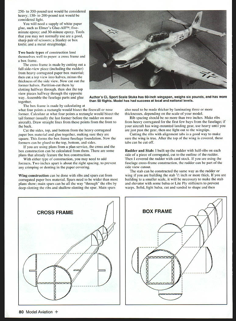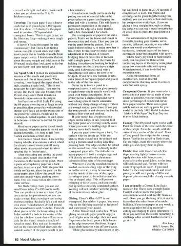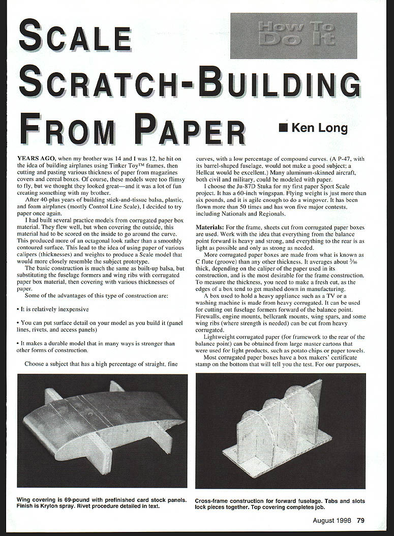 SCALE SCRATCH-BUILDING FROM PAPER U Ken Long YEARS AGO brother 14 12 hit idea building airplanes using Tinker ToyTM frames cutting pasting various thickness paper magazines covers cereal boxes course models too flimsy fly thought looked greatand lot fun creating something brother After 40-plus years building stick-and-tissue balsa plastic foam airplanes mostly Control Line Scale decided try paper once again built several practice models corrugated paper box material flew well covering outside material scored inside go around curve produced octagonal look rather smoothly contoured surface lead idea using paper various calipers thicknesses weights produce Scale model would closely resemble subject prototype basic construction much same built-up balsa substituting fuselage formers wing ribs corrugated paper box material covering various thicknesses paper Some advantages type construction relatively inexpensive can put surface detail model build panel lines rivets access panels makes durable model ways stronger other forms construction Choose subject has high percentage straight fine curves low percentage compound curves P-47 its barrel-shaped fuselage would make good subject Hellcat would excellent aluminum-skinned aircraft both civil military could modeled paper choose Ju-87D Stuka first paper Sport Scale project has 60-inch wingspan Flying weight just six pounds agile enough wingover has flown 50 times has won five major contests including Nationals Regionals Materials frame sheets cut corrugated paper boxes used Work idea everything balance point forward heavy strong everything rear light possible strong needed corrugated paper boxes arc made what known C flute groove other thickness averages about /I6 thick depending caliper paper used its construction desirable frame construction measure thickness need make fresh cut edges box tend get mashed down manufacturing box used hold heavy appliance such TV washing machine made heavy corrugated can used cutting out fuselage formers forward balance point Firewalls engine mounts bellcrank mounts wing spars some wing ribs strength needed can cut heavy corrugated Lightweight corrugated paper framework rear balance point can obtained large master cartons used light products such potato chips paper towels Most corrugated paper boxes have box makers certificate stamp bottom will tell test purposes August 1998 79 Wing covering 69-pound prefinished card stock panels Cross-frame construction forward fuselage Tabs slots Finish Krylon spray Rivet procedure detailed text lock pieces together Top covering completes job 250- to 350-pound test would considered heavy 150- 200-pound test would considered light will need supply white paper glue such Elmers GlueAllTM fiveminute epoxy 30-minute epoxy Tools may normally use good sharp pair scissors Stanley box knife metal straightedge Two basic types construction lend themselves well paper cross frame box frame cross frame made cutting out full side-view piece including rudder heavy corrugated paper box material cut top view halves minus thickness side view Now cut out former halves Partition-cut slotting halfway through slot top view pieces halfway through opposite way Assemble fuselage parts glue together box frame made calculating what four points rectangle would bisect firewall nose former Calculate what four points rectangle would bisect tail former usually last former before rudder aircraft Draw straight lines points front back Cut sides top bottom heavy corrugated paper box material glue together making sure square forms box frame fuselage foundation Now formers can glued top bottom sides using plans plan service cross box construction can calculated some plans already feature box construction either type construction may need add formers Two inches apart about right spacing prevent crimping denting paper covering Wing construction can done ribs spars cut corrugated paper box material Spars need wider plans show main spars can way through ribs deep-slotting ribs shallow-slotting spar Main spars also need made thicker laminating three thicknesses depending scale model Rib spacing should no two inches Make ribs heavy corrugated first few bays fuselage aircraft has wing-mounted landing gear use heavy until just past gear use light out wingtips Cutting ribs alignment tabs good way make sure wing true After top wing covered tabs can cut off Rudder Stab built up rudder half-ribs side piece corrugated cut outline rudder covered rudder card stock using fuselage cross-frame construction rudder can part side view cutout stab can constructed same way rudder wing building stab /2 inch thick building smaller scale will necessary make stab elevator some balsa Lite Ply stiffeners prevent warps Solid light balsa cut sanded shape 80 Model Aviation ors CL Sport Scale Stuka has 60-inch wingspan weighs six pounds has 50 flights Model has success local national levels CROSS FRAME BOX FRAME covered light card stock works well get down /s thickness range Covering main paper use heavy stock 69 pounds per 1000 square feet about 016 thick its paper used construct 275-pound-test corrugated boxes virgin paper fibers longmaking very tough strong havent found paper sale commercially have testing various weights card stock light poster paper readily available paper supply stores found some about same weight thickness 69-pound stock look good far flight- time-tested yet Sport Scale plotted approximate location panels placed formers ribs points covering overlapped paper about 3/ inch creating scale look necessary Sport Scale may saying lines can seen 15 feet away think makes favorable impression judges Precision FAI Scale Im using 69-pound covering large area possible cover tooled thinner card stock cut exact sizes prototypes panels Panels can overlapped butted together space betweenwhatever correct aircraft Most heavy paper can tooled much like leather paper tooled painted properly hard tell riveted aluminum aircraft skin rounded raised riv