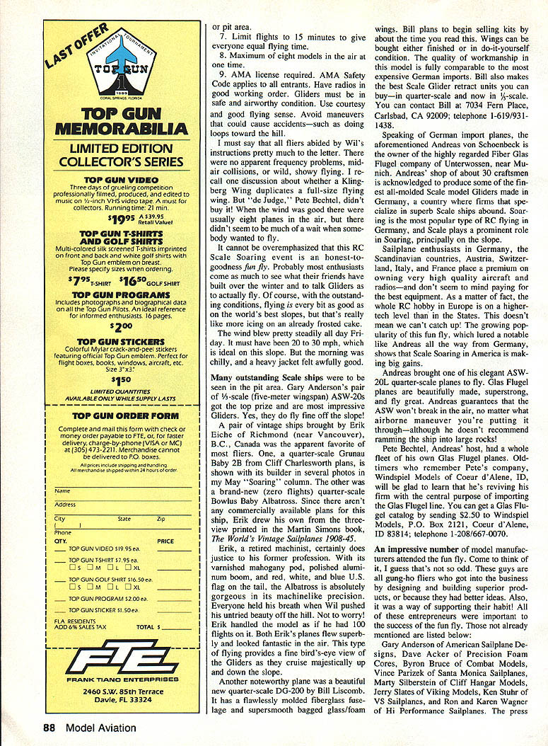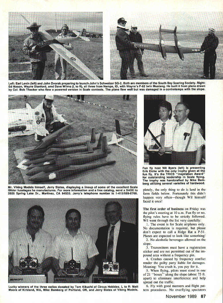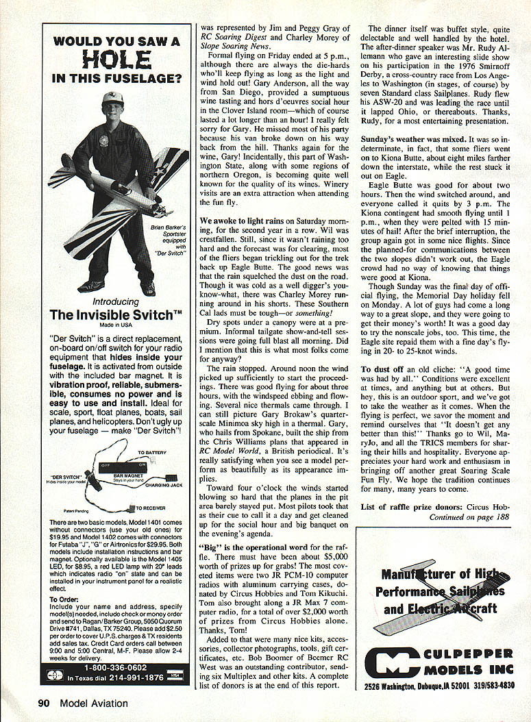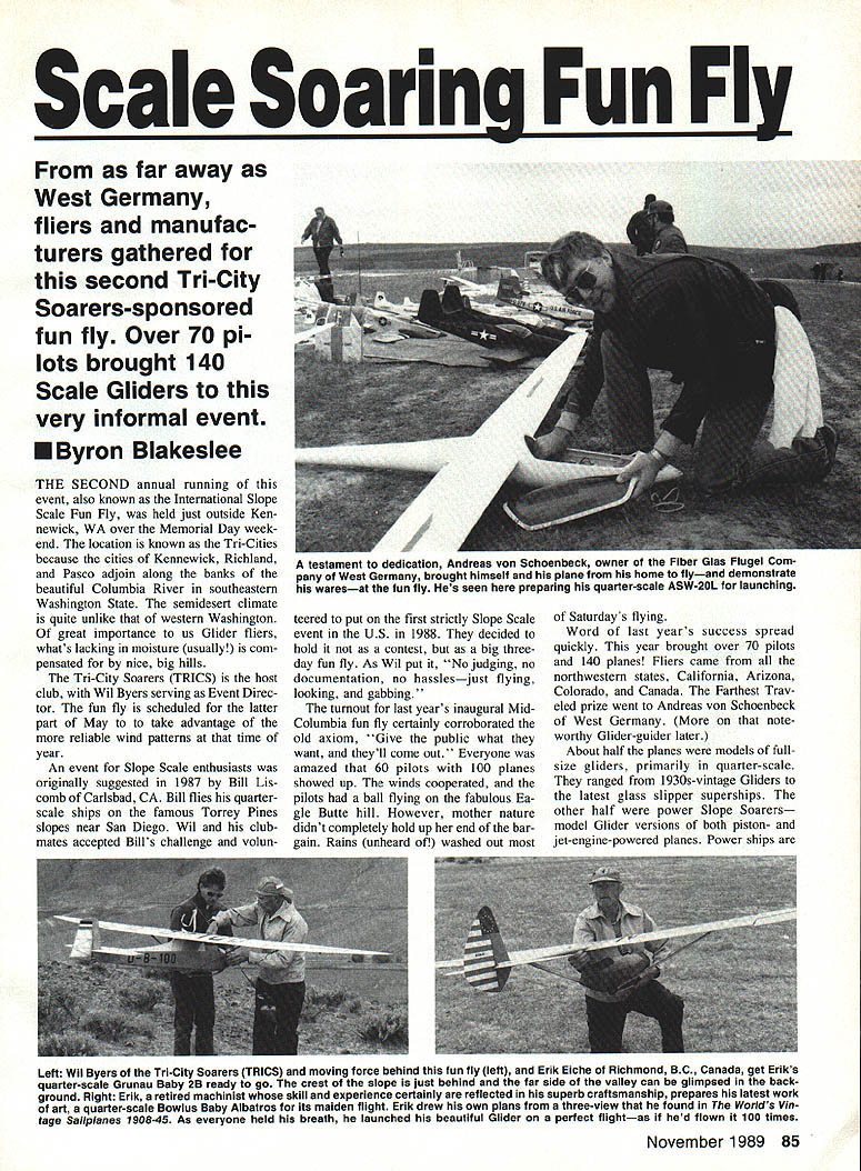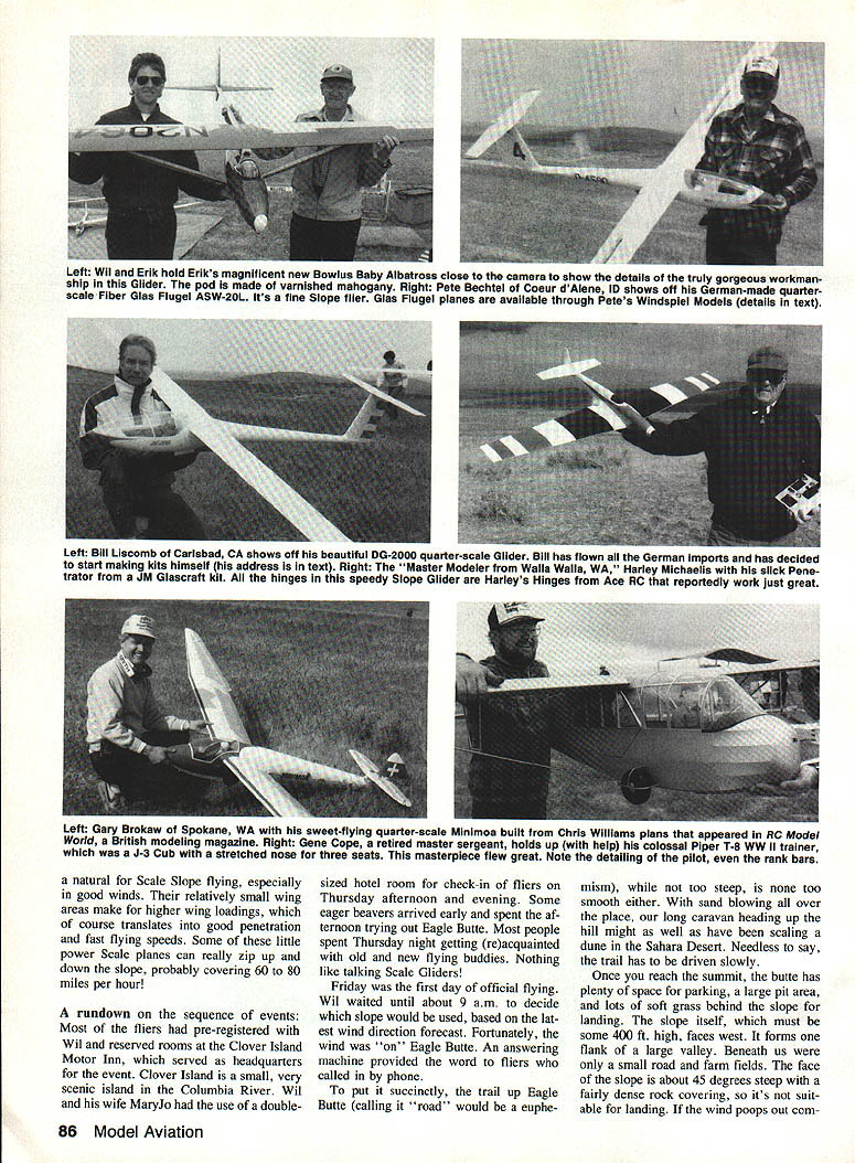 Scale Soaring Fun Fly far away West Germany fliers manufac turers gathered second Tn-City Soarers-sponsored fun fly Over 70 p1 lots brought 140 Scale Gliders very informal event U Byron Blakeslee THE SECOND annual running event also known International Slope Scale Fun Fly held just outside Ken newick WA over Memorial Day week end location known Tn-Cities because cities Kennewick Richland Pasco adjoin along banks beautiful Columbia River southeastern Washington State semidesert climate quite unlike western Washington great importance us Glider fliers whats lacking moisture usually com pensated nice big hills Tn-City Soarers TRICS host club Wil Byers serving Event Direc tor fun fly scheduled latter part May to take advantage reliable wind patterns time year An event Slope Scale enthusiasts originally suggested 1987 Bill Lis comb Carlsbad CA Bill flies quarterscale ships famous Torrey Pines slopes near San Diego Wil clubmates accepted Bills challenge volun teered put first strictly Slope Scale event US 1988 decided hold contest big threeday fun fly As Wil put No judging no documentation no hasslesjust flying looking gabbing turnout last years inaugural MidColumbia fun fly certainly corroborated old axiom Give public what want theyll come out Everyone amazed 60 pilots 100 planes showed up winds cooperated pilots ball flying fabulous Ea gle Butte hill However mother nature didnt completely hold up end bar gain Rains unheard washed out Saturdays flying Word last years success spread quickly year brought over 70 pilots 140 planes Fliers came northwestern states California Arizona Colorado Canada Farthest Trav eled prize went Andreas von Schoenbeck West Germany note worthy Glider-guider later About half planes models fullsize gliders primarily quarter-scale ranged 1930s-vintage Gliders latest glass slipper superships other half power Slope Soarers model Glider versions both piston- jet-engine-powered planes Power ships November 1989 85 testament dedication Andreas von Schoenbeck owner Fiber Glas Flugel Com pany West Germany brought himself plane home flyand demonstrate waresat fun fly Hes seen preparing quarter-scale ASW-20L launching Left WiI Byers Tn-City Soarers TRICS moving force behind fun fly left Erik Eiche Richmond BC Canada get Eriks quarter-scale Grunau Baby 2B ready go crest slope just behind far side valley can glimpsed back ground Right Erik retired machinist skill experience certainly reflected superb craftsmanship prepares latest work art quarter-scale Bowlus Baby Albatros its maiden flight Erik drew own plans three-view found Worlds Vin tage Sailplanes 1908-45 As everyone held breath launched beautiful Glider perfect flightas hed flown 100 times natural Scale Slope flying especially good winds relatively small wing areas make higher wing loadings course translates good penetration fast flying speeds Some little power Scale planes can really zip up down slope probably covering 60 80 miles per hour rundown sequence events Most fliers pre-registered Wil reserved rooms Clover Island Motor Inn served headquarters event Clover Island small very scenic island Columbia River Wil wife MaryJo use doublesized hotel room check-in fliers Thursday afternoon evening Some eager beavers arrived early spent af ternoon trying out Eagle Butte Most people spent Thursday night getting reacquainted old new flying buddies Nothing like talking Scale Gliders Friday first day official flying Wil waited until about 9 am decide slope would used based lat est wind direction forecast Fortunately wind Eagle Butte An answering machine provided word fliers called phone put succinctly trail up Eagle Butte calling road would euphe mism too steep too smooth either sand blowing over place long caravan heading up hill might well have scaling dune Sahara Desert Needless say trail has driven slowly Once reach summit butte has plenty space parking large pit area lots soft grass behind slope landing slope itself must some 400 ft high faces west forms flank large valley Beneath us small road farm fields face slope about 45 degrees steep fairly dense rock covering its suit able landing wind poops out com 86 Model Aviation Left Wil Erik hold Eriks magnificent new Bowlus Baby Albatross close camera show details truly gorgeous workman ship Glider pod made varnished mahogany Right Pete Bechtel Coeur dAlene ID shows off German-made quarterscale Fiber Glas Flugel ASW-20L Its fine Slope flier Glas Flugel planes available through Petes Windspiel Models details text Left Bill Liscomb Carlsbad CA shows off beautiful DG-2000 quarter-scale Glider Bill has flown German imports has decided start making kits himself address text Right Master Modeler Walla Walls WA Harley Michaelis slick Pene trator JM Glascraft kit hinges speedy Slope Glider Harleys Hinges Ace RC reportedly work just great Left Gary Brokaw Spokane WA sweet-flying quarter-scale Mlnimoa built Chris Williams plans appeared RC Model World British modeling magazine Right Gene Cope retired master sergeant holds up help colossal Piper T-8 WW II trainer J-3 Cub stretched nose three seats masterpiece flew great Note detailing pilot rank bars Left Earl Levin left John Dvorak preparing launch Johns Schweizer SG-2 Both members South Bay Soaring Society Right Ed Mason Wayne Stanford amd Dave Wllms 1 R three Nampa ID Waynes F-82 twin Mustang built plans drawn Cal Bob Thacker flew powered version Scale contests plane flew well damaged contretemps slope pletely thing land farm fields below Fortunately didnt happen very oftenthough Wil himself faced once first order business Friday pilots meeting 10 am Fun fly no flying rules have strictly followed Wil went through list very carefully 1 The event Scale airplanes No documentation required please dont expect call Ridge Rat P-SI Planes expected look like something 2 No alcoholic beverages allowed slope 3 Transmitters must have registration sticker permitted out im pound area frequency pin 4 Crashes caused frequency conflict render guilty par