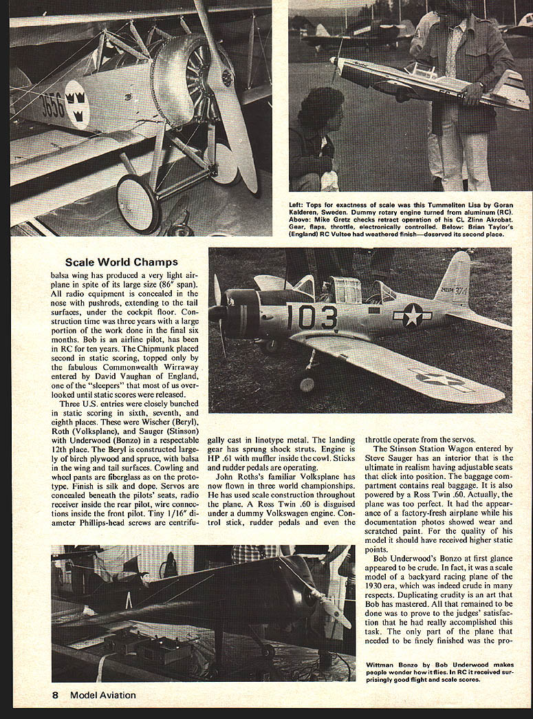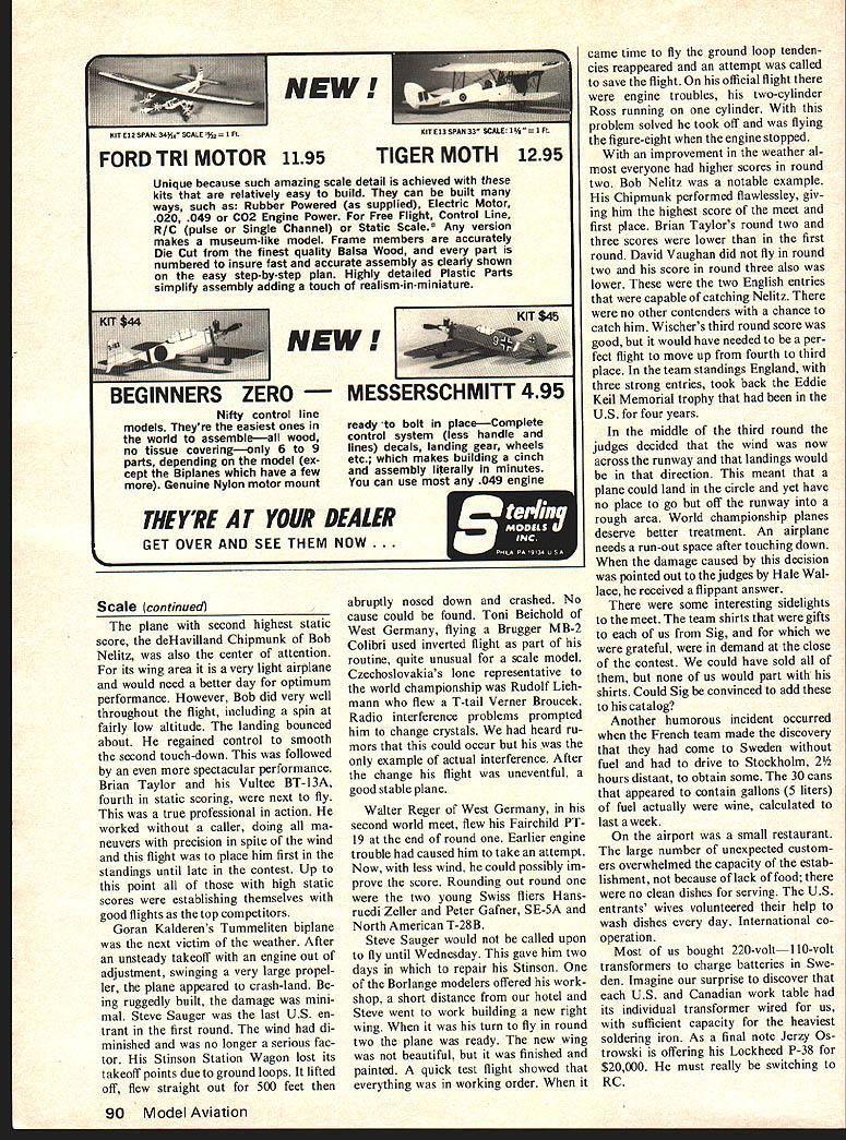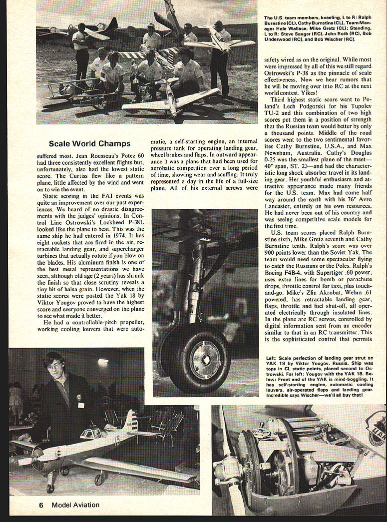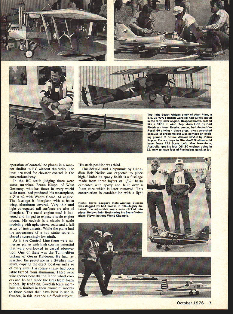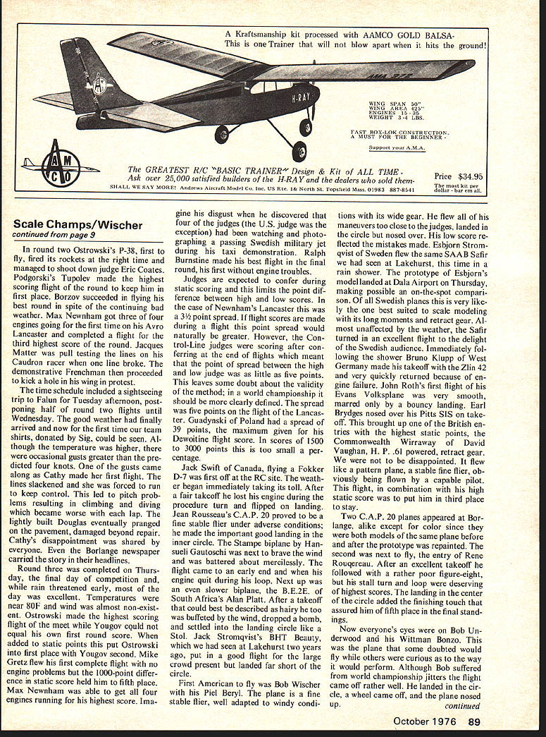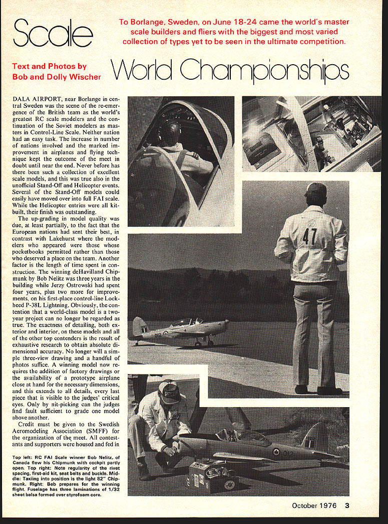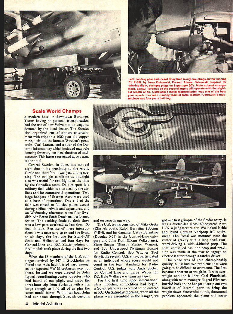 To Borlange Sweden June 18-24 came worlds master scale builders fliers biggest varied Scoe collection types yet seen ultimate competition Text Photos Wor d Chomponshps Bob Dolly Wischer DALA AIRPORT near Borlange cen tral Sweden scene re-emer gence British team worlds greatest RC scale modelers con tinuation Soviet modelers mas ters Control-Line Scale Neither nation easy task increase number nations involved marked im provement airplanes flying tech nique kept outcome meet doubt until near end Never before has such collection excellent scale models true also unofficial Stand-Off Helicopter events Several Stand-Off models could easily have moved over full FAI scale Helicopter entries kitbuilt finish outstanding up-grading model quality due least partially fact European nations sent best contrast Lakehurst mod elers appeared pocketbooks permitted rather deserved place team Another factor length time spent con struction winning deHavilland Chip munk Bob Nelitz three years building Jerzy Ostrowski spent four years plus two improve ments first-place control-line Lock heed P-38L Lightning Obviously con tention world-class model twoyear project can no longer regarded true exactness detailing both ex terior interior models other top contenders result exhaustive research obtain absolute di mensional accuracy No longer will sim ple three-view drawing handful photos suffice winning model now re quires addition factory drawings availability prototype airplane close hand necessary dimensions extends details last piece visible judges critical eyes Only nit-picking can judges find fault sufficient grade model above another Credit must given Swedish Aeromodeling Association SMFF organization meet contest ants supporters housed fed Top left RC FAI Scale winner Bob Nalitz Canada flew Chipmunk cockpit partly open Top right Note regularity rivet spacing firstaid kit seat belts buckle Mid dle Taxiing position light 82 Chip munk Right Bob prepares winning flight Fuselage has three laminations 1/32 sheet balsa formed over styrofoam core October1976 3 Scale World Champs modern hotel downtown Borlange Teams having no personal transportation use new Volvo station wagons donated local dealer Swedes also organized afterhours entertain ment trips 1000-year-old copper visit home Swedens great artist Carl Larsen tour Da larna lake country included maypole dancing everyone celebration mid summer latter tour ended two am hotel Central Sweden June has no real night due its proximity Arctic Circle therefore just long eve ning twilight condition midnight also useful test flights time Canadian team Dala Airport military field also used air lines commercial operations Two large hangars Sterner Aero used base operations end field closed full-size planes except during airline arrivals departures Wednesday afternoon four Swe dish Air Force Saab Drachens performed us exciting finale show low pass overhead less 100 feet altitude Because interrup tions necessary extend flying six days first two Stand-Off Scale Helicopter four days Control-Line RC Static judging FAI models took place during first two days 18 members US con tingent arrived 747 Stockholm found Avis hadnt tried hard enough expected VW Microbusses Instead greeted John Lytsell coordinating contest director heard plight made three-hour trip Borlange bus large enough hold us plus seven model boxes Within hour John boxes through Swedish customs way US teams consisted Mike Gretz Zlin Akrobat Ralph Burnstine Boeing F4B-4 daughter Cathy Burnstine Douglas 0-25 Control-Line cate gory John Roth Evans Volksplane Steve Sauger Stinson Station Wagon Bob Underwood Wittman Bonzo Radio Control Bob Wischer Piel Beryl seventh US entry participated individual score would count team standings Radio Control US judges Andy Sheber Control Line Leroy Weber RC Hale Wallace team manager first time since international class modeling competition begun Soviet plane expected entered RC Saturday morning planes assembled hangar got first glimpse Soviet entry ducted-fan Rossi 60-powered Aero L-39 ajetfighter trainer looked inside found German Variprop RC equip ment Rossi mounted near center gravity long shaft rear ward driving wide 4-bladed prop shaft continued past prop provi sion made rear engage electric starter through ratchet driver plane rue championship quality two problems going difficult overcome first became apparent weigh-in over weight builder Carl Plotzinsch along team manager Eugeni Elizarov hurried back hangar strip out two handfuls internal parts bring weight down Successful second problem appeared plane never 4 Model Aviation Left Landing gear rocket fired aiQ mountings winning CL P-38L Jerzy Ostrowski Poland Above Ostrowski prepares winning flight changes plugs Supertigre GOs Note exhaust arrange ment Below Turbines superchargers will operate slight est breath air Ostrowskis metal representation best reporter has seen years scale Bottom Ostrowskis ms terpiece four years building Curtiss Hawk P-36A built F C Coulson England first-place winner Stand-Off Scale flew exactly like Pattern plane flown earliest opportunity Sun day morning out runway along swarm expectant observers engine started takeoff begun too close runway end Lifted off too soon staggered air semistalled altitude climbed about 25 feet snap-rolled back earth parts gathered hastily carried off Rus sian bus Carl began marathon effort return plane flying condition actually successful final day flying made short hop few hun dred feet after attempts Most ef forts aborted due engine failures over-heating several retract gear col lapses Meanwhile peculiar situation arose Soviet control-line team saw three airplanes twinengined jet fighter also powered ducted fans Before could gather data plane quickly assembled carried off paved area front airport control tower time military po lice made certain observers excluded rumors spread plane never flown watched distance after trying unsuccessfully break through guard lines So viet team m