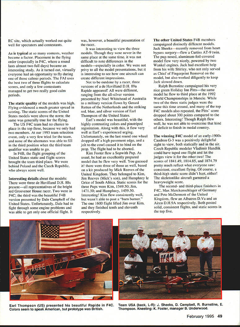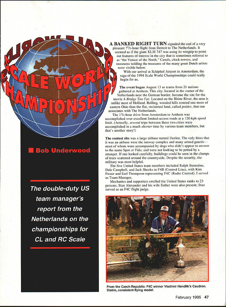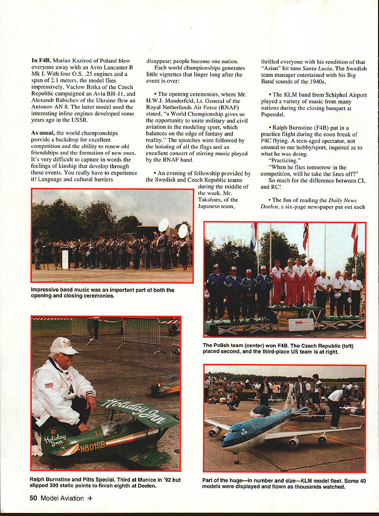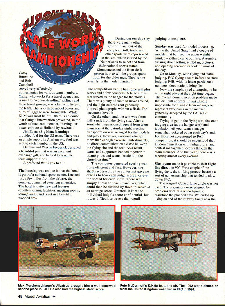 The event began August 13 teams 21 nations gathered Arnhem city located corner Netherlands near German border became site movie Bridge Too Far Located Rhine River area unlike Holland Rolling wooded hills remind eastern Ohio flat reclaimed land called polder associates Netherlands 1 1/4-hour drive Amsterdam Arnhem accomplished over excellent limited-access roads 120-kph speed limit Actually several trips between two cities accomplished much shorter time various team members thats another story contest site large airbase named Deelen hints airbase runway complex armed guards accompanied dogs didnt appear answer name Spot Fido looking petted stranger looked carefully buildings could seen clumps trees scattered around countryside Despite security military helpful five United States team members included Ralph Burnstine Dale Campbell Jack Sheeks F4B Control Line Kim Foster Earl Thompson representing F4C Radio Control served Team Manager Mechanics supporters swelled United States ranks 23 persons Stan Alexander wife Esther also present Stan served F4C flight judge February 1995 47 A BANKED RIGHT TURN signaled end very pleasant 71/2-hour flight Detroit Netherlands seemed giant KLM 747 using its wingtip point out features interest city sometimes referred Venice North Canals clock towers museums holding treasures great Dutch artists visible below arrival Schiphol Airport Amsterdam saga 1994 Scale World Championships could really begin us Czech Republic F4C winner Vladimir Handliks Caudron Stable consistent flying model Cathy Burnstine Bob Campbell served very effectively mechanics various team members Cathy works travel agency used woman-handling airlines large travel groups fantastic help team very large model boxes piles luggage formidable KLM helpful no doubt Cathys intervention prevented words team member having boxes enroute Holland rowboat Jim Evans Sig Manufacturing provided fuel US team ample supply Arnhem fuel sent member US Darlene Wayne Frederick designed beautiful pin excellent exchange gift helped generate team-support funds profound thank housing unique hotel part national sports center Located just few miles airbase complex contained excellent amenities hotel quite new features excellent dining facilities meeting rooms lounge areas set beautiful wooded area During ten-day stay other groups out complex Golf track other sports represented site used Netherlands select train national sports teams Someone asked front-deskperson tell groups apart Look older men Theyre ones flying model planes competition venue some real plus marks few concerns huge circus tent served hangar models plenty room move around light-colored roof generally allowed photographs flash spectators loved other hand tent about half mile flying site After somewhat impassioned request team managers Saturday night meeting transportation arranged models pilots However everyone else got enough exercise Unfortunately no direct communication existed between flying site tent As result teams supporters banded together assure pilots teams made church time computer-generated scoring quite efficient fast However sheets received contestant gave no clue judge scored spread score simply total maneuver could divided three arrive average score Granted kept individual judges score confidential difficult assess overall judging atmosphere Sunday used model processing United States couple models bumped upper weight limit everything came out fine Assembly fussing about getting settled pictures opening ceremonies took up day Monday flying static judging F4C flying occurs before static judging F4B its lower participant numbers does static judging first Now symphony attempting right place right time began overall communication problem made difficult times almost impossible single team manager represent two teams manner generally accepted FAI scale community Trying get flying site static judging area hangar tent tabulation left team manager somewhat tuckered out days end accustomed FAI competition should understood communication judges jury contest management occurs through team manager year meeting almost evening Site layout made possible shift flight line direction 900 couple flying days shifting process became sort gamesmanship tended slow down F4C original Control Line circle used organizers plagued problems rain trying resurface planned area ended up using end runway fairly near Max Merckenschlagers Albatros brought him well-deserved second place F4C also highest static score Pete McDermotts DH9a tests air 1992 world champion United Kingdom third F4C 1994 48 Model Aviation ite actually worked out quite well spectators contestants As typical contests weather became factor Placement flying order especially F4C round lasts almost two full days became interesting study As turned out virtually everyone opportunity fly during calmer periods FAI uses best two three flights calculate scores few contestants managed get two really good calm periods static quality models high Flying evidenced much greater spread scoring static scores United States models above norm same generally true flying US F4C team no chance place top three because two members 1993 team selection event very few tried team alternates able fill third position third team qualifier unable go F4B flight grouping United States static flight scores brought team third place behind Poland Czech Republic always score well Interesting details about models three de Havilland DH 88s presentall representatives bright red Grosvenor House racer Two F4C third beautiful F4B version presented Dale Campbell United States Unfortunately Dale fight through some engine problems able get official flight however beautiful presentation racer interesting view three models Though never same place same time difficult note differences modelsespecially color privy model presentations interesting see aircraft can create different impressions outdone racer three versions de Havilland DH 89a Rapide appeared diff