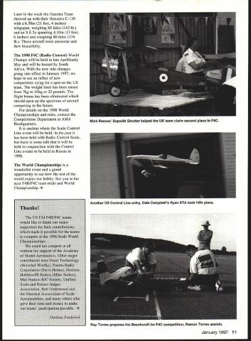 a 1 WvRW PIDNIN PS PERIGUEUX IS LOCATED beautiful wine country south France Radio Control Control Line teams met Paris final flight Bordeaux would bussed Perigueux Unfortunately left behind day grave concern TWA Flight 800 New York crashed shortly after takeoff day left World Championships oblivious whole tragedy until arrived Perigueux following day Fortunately team flight travel arrangements made Air France part Cathy Bernstine Perkins Travel Sandusky Ohio Air France transported airplane boxes team members After few delays together Perigueux competition model boxes arrived unharmed event held Perigucux Bassillac Airport near Perigueux airport totally closed competition flying held up least twice day incoming outgoing traffic minor inconvenience days long Transmitters turned 730 am daily Flying 8 am until 8 pm daily two-hour seven-course lunches served 1230-230 pm Sevencourse dinners served 8301030 pm food delicious prepared local cooking school truly authentic French mealsa gastronomical delight Radio Control flying began Sunday afternoon after opening ceremonies Static judging started after first group flying well underway Static time typically ran 20-30 minutes per airplane Control Line static also started Sunday flying starting until Wednesday provisional event Large Scale held World Championship staticjudged starting Monday flight beginning Wednesday 8 Model Aviation rlene Frederick Karel Vodesil took tenth-place F4C Knauer Cll features fully detailed Austro-Daimler engine 18 countries competing Radio Control eight Control Line seven Large Scale static three judges flight five judges used event part weather OK few downpours delayed flying wind did become problem Thursday during last round flying last few fliers given option refly Friday however after first flier declined rest followed suit except flier scoresheets destroyed As typical World Championships aircraft magnificent First place Radio Control Max Merckenschlager Germany flying Albatros DVa Max outscored static few points flying abilities won him top flight scores three rounds flown second-place aircraft Caudron GIII built flown Vladimir Handlig Czech Republic Vladimir first-place winner two years ago Arnhem Netherlands banquet Vladimir passed around horizontal stabilizer airplane everyone autograph Im sure will see him next world championships new aircraft Third place won Andres Luthi Switzerland Nieuport 28 US team did very well Ray Torres placed eighth Beechcraft Kim Foster Sopwith Pup placed ninth first-time competitor Wayne Frederick Fokker DVIII placed 25th giving team fourth-place honors Control Line event won Marian Kazirod Poland Avro Lancaster repeat first-place winner January 1997 9 Switzerlands Andreas Luthi third overall F4B Nieuport 28 Germanys Max Merckenschlager first-place Albatros DVa Photos author Graphic Design Carla Kunz Ukrainian modeler Valery Kramarenko flew Russian Antonov An-26 third place Control Line event SQAhI W9R~ NAMPENSNIPS 1994 Second place went Vasiliy Kromin Australia transplant Russia super-nice guy flying Antonov An-14 third place Valery Kramarenko Ukraine Antonov An-26a very familiar face aircraft Control Line circle Steve Ashby US placed fourth Dornier 17 Jack Sheeks placed tenth Spitfire Mk d9a Dale Campbell placed 14th Ryan STA giving Control Line team third place spot podium Control Line team members helped engine problems Manager Marketing Sales 0S engines Yasufumi Sugawara Japan Exhibition flying put group giant aircraft An Air France Airbus 340 model aircraft flew San Francisco Paris four turbine engines built flown Henri & Mireille Wild made several flybys certainly looked sounded realistic 10 Model Aviation e Fredericks Fokker DVIII helped US team claim fourth place F4C Flying Pencil Indianapolis Indianas Steve Ashby flew good-looking Dornier 17 fourth place F4B Czech Republics Vladimir Handlik second F4C French Caudron GlII two-seat sesquiplane Later week Guerdat Team showed up Hercules C-130 650m 21 feet 4 inches wingspan weighing 65 kilos 143 lb SE5a spanning 4lOm 13 feet 6 inches weighing 80 kilos 176 lb aircraft awesome flew beautifully 1998 F4C Radio Control World Champs will held late April/early May will hosted South Africa new rule changes going effect January 1997 hope see influx new competitors vying spot US team weight limit has raised 7kg 10kg 22 pounds flight bonus has eliminated should open up spectrum aircraft competing future details 1998 World Championships rules contact Competitions Department AMA Headquarters unclear Scale Control Line event will held past has held Radio Control Scale some talk will held conjunction Control Line events held Russia 1998 World Championships wonderful event grand opportunity see rest world enjoys hobby See next F4B/F4C team trials World Championship ary1997 11 Mick Reeves Sopwith Strutter helped UK team claim second place F4C Another US Control Line entry Dale Campbells Ryan STA took 14th place Ray Torres prepares Beechoraft F4C competition Ramon Torres assists