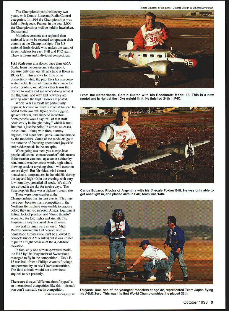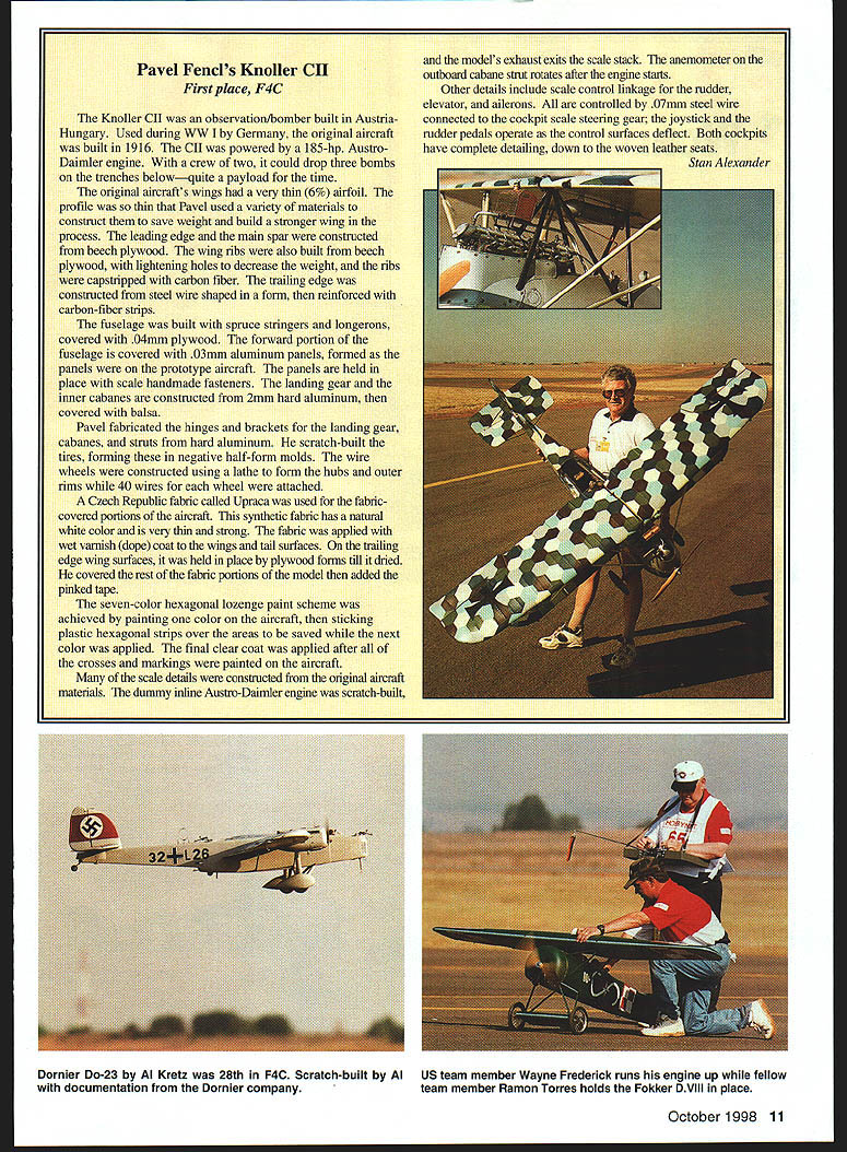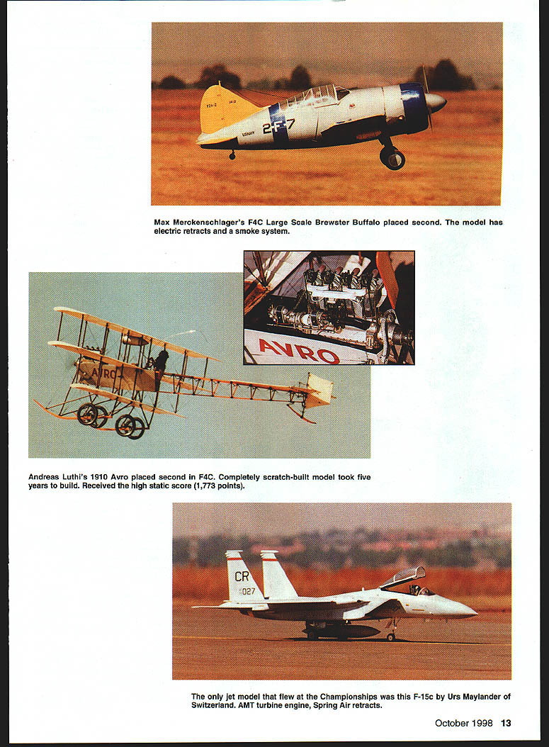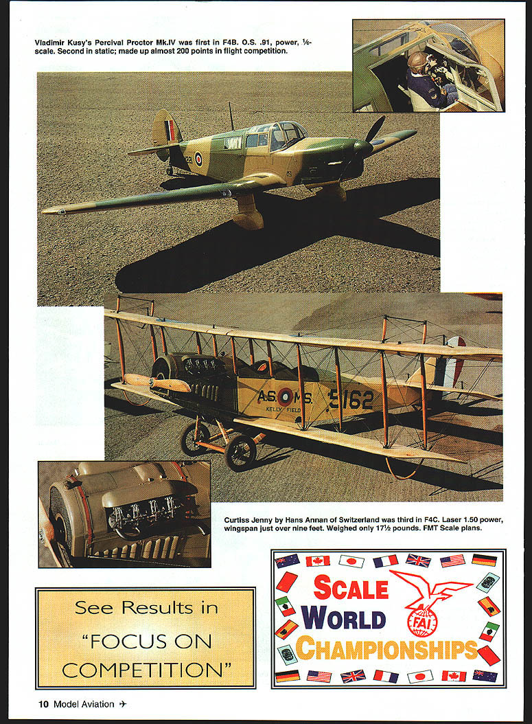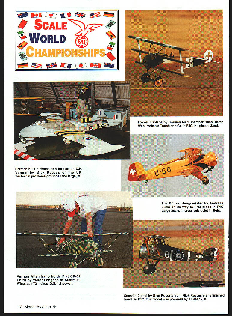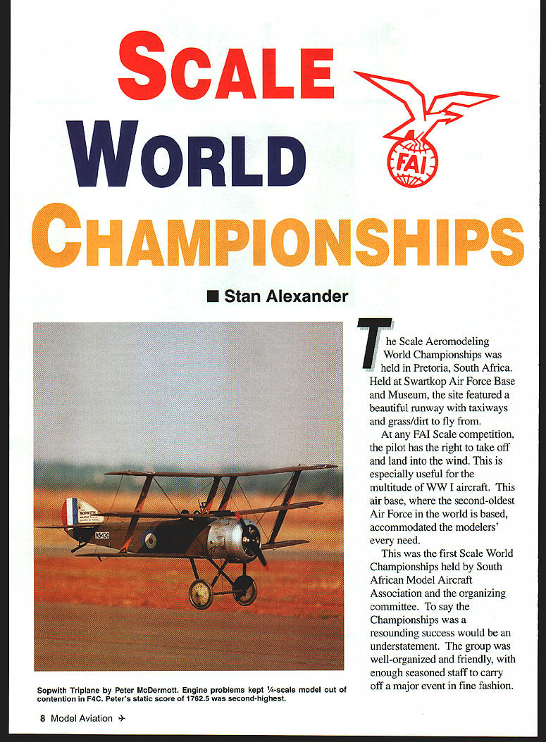 SCALE ORLD ploip U Stan Alexander Sce Aeromodeling World Championships N held Pretoria South Africa Held Swartkop Air Force Base Museum site featured beautiful runway taxiways grass/dirt fly FAT Scale competition pilot has right take off land wind especially useful multitude WW aircraft air base second-oldest Air Force world based accommodated modelers need first Scale World Championships held South African Model Aircraft Association organizing committee say Championships resounding success would understatement group well-organized friendly enough seasoned staff carry off major event fine fashion 8 Model Aviation ith Triplane Peter McDermott Engine problems kept A-scale model out contention F4C Peters static score 17625 second-highest Championships held two years Control Line Radio Control categories 1996 Championships held Perigueux France year 2000 Championships will held Interlaken Switzerland Modelers compete regional national level selected represent country Championships US national finals decide makes team three modelers F4B F4C team Team Individual competition FAI Scale runs slower pace AMA Scale contestants standpoint because aircraft time flown RC CL allows little no distractions pilot flies museumscale model also eliminates chance midair crashes allows other teams chance watch see whos doing what flightilne scoring flight scores posted World War aircraft particularly popular because much surface detail can added aircraft flying wires rigging spoked wheels airspeed indicators Some people would say stuff could easily bought today true just point almost cases itemsalong tires dummy engines other detail partsare handmade modelers Some modelers go extreme featuring operational joysticks rudder pedals cockpits going meet always hear people talk about contest weather means weather can mess up contest either rain humid weather cross winds high winds blowing sand anything else will occur contest days fair skies wind almost nonexistent temperatures mid SOs during day high 40s evening very low humidity prevailed week didnt see cloud sky twelve days Swartkop Air Base biplanes dream site crashes Championships past events may have because competitors Northern Hemisphere unable practice before arrived South Africa Equipment failure lack practice dumb thumbs accounted lost flights aircraft frequency analyzer stayed clear week Several turbines entered Mick Reeves powered DH Venom homemade turbine wouldnt allowed compete under ALMA rules unable put flight because 4790-foot elevation fact oaly turbine-powered model F-iS Urs Maylander Switzeriand managed fly competition Urss F15 built Philipe Avonds fuselage powered AMT kerosene turbine field altitude would allow engines run properly always different aircraft types international competition like thisaircraft dont normally see competition Text continued page 14 Phnt- fl.,tnn Mth ,thn flnkir flncinn hulill Ann C2,nniinh October 1998 9 Netherlands Gerald Rutten Beechcraft Model 18 new model right 10kg weight limit finished 24th F4C Carlos Eduardo Rivoira Argentina -scale Fokker E-lll able get flight placed 44th F4C team 14th Tsuyoshi Oue youngest modelers age 32 represented Team Japan flying A6M2 Zero first World Championships placed 26th Vladimir Kusys Percival Proctor MkIV first F4B 05 91 power 1/6 scale Second static made up almost 200 points flight competition Curtiss Jenny Hans Annan Switzerland third F4C Laser 150 power wingspan just over nine feet Weighed 17A2 pounds FMT Scale plans 10 Model Aviation Results FOCUS ON COM PETITION SCALE WORLD w Pavel Fends Knoller CII First place F4C Knoller CII observation/bomber built AustriaHungary Used during WW Germany original aircraft built 1916 CII powered 185-hp Austro Daimler engine crew two could drop three bombs trenches belowquite payload time original aircrafts wings very thin 6% airfoil profile thin Pavel used variety materials construct save weight build stronger wing process leading edge main spar constructed beech plywood wing ribs also built beech plywood lightening holes decrease weight ribs capstripped carbon fiber trailing edge constructed steel wire shaped form reinforced carbon-fiber strips fuselage built spruce stringers longerons covered 04mm plywood forward portion fuselage covered 03mm aluminum panels formed panels prototype aircraft panels held place scale handmade fasteners landing gear inner cabanes constructed 2mm hard aluminum covered balsa Pavel fabricated hinges brackets landing gear cabanes struts hard aluminum scratch-built tires forming negative half-form molds wire wheels constructed using lathe form hubs outer rims 40 wires wheel attached Czech Republic fabric called Upraca used fabriccovered portions aircraft synthetic fabric has natural white color very thin strong fabric applied wet varnish dope coat wings tail surfaces trailing edge wing surfaces held place plywood forms till dried covered rest fabric portions model added pinked tape seven-color hexagonal lozenge paint scheme achieved painting color aircraft sticking plastic hexagonal strips over areas saved next color applied final clear coat applied after crosses markings painted aircraft scale details constmcted frum original aircraft materials dummy inline Austro-Dainiler engine scratch-built models exhaust exits scale stack anemometer outboard cabane strut rotates after engine starts Other details include scale control linkage rudder elevator ailerons controlled 07mm steel wire connected cockpit scale steering gear joystick rudder pedals operate control surfaces deflect Both cockpits have complete detailing down woven leather seats Stan Alexander October1998 11 Dornier Do-23 Al Kretz 28th F4C Scratch-built Al US team member Wayne Frederick runs engine up fellow documentation Dornier company team member Ramon Torres holds Fokker DVIII place uI # SCALE roRLD~4 Scratch-built airframe turbine DH Venom Mick Reeves UK Technical problems grounded large jet Vernon Altamirano holds Fiat CR-32 Chirri Victor Longbon Austra