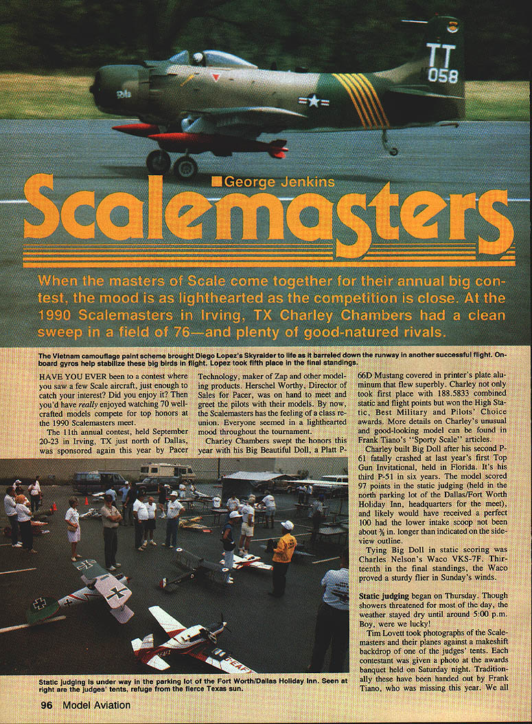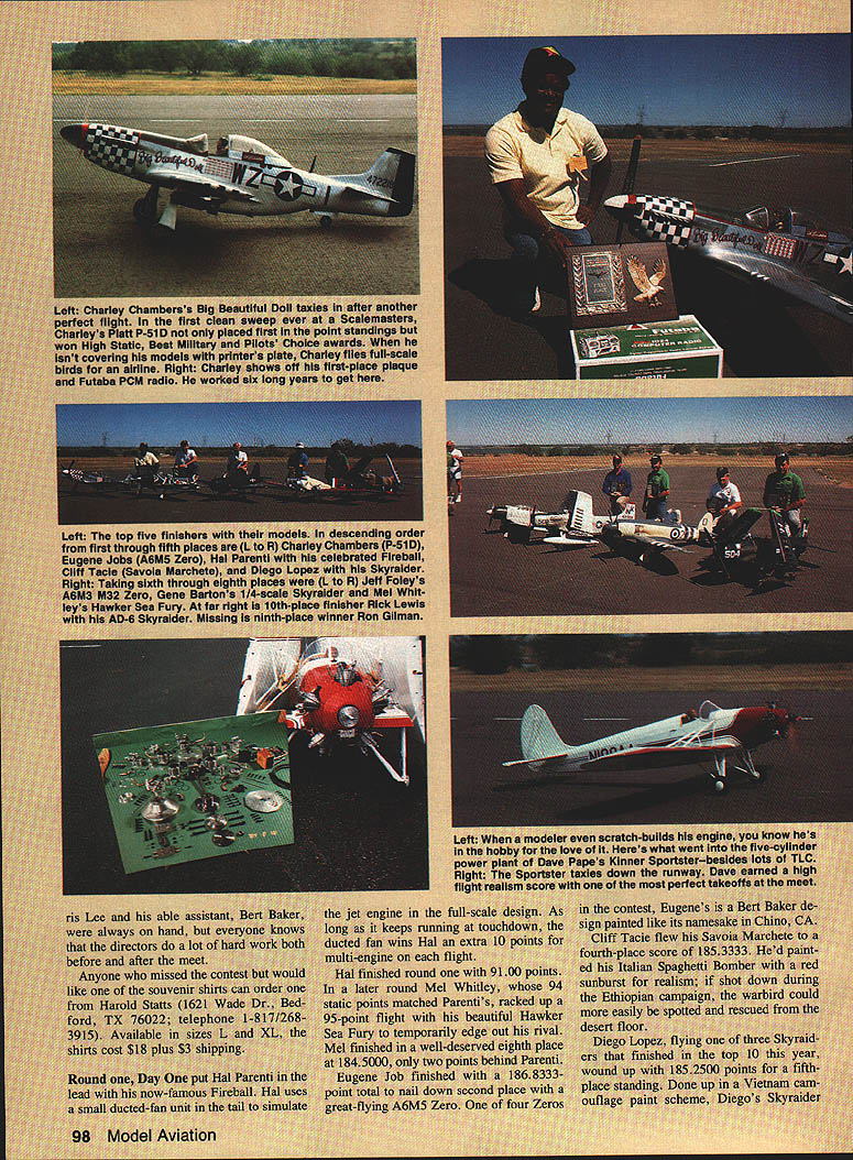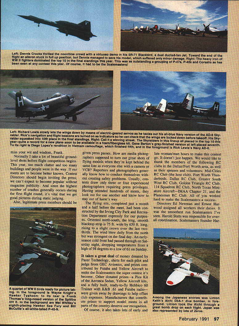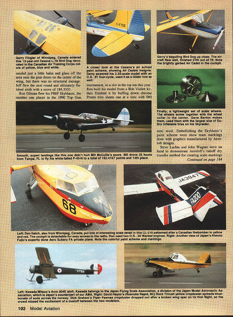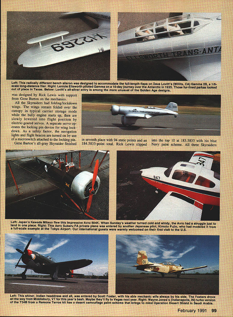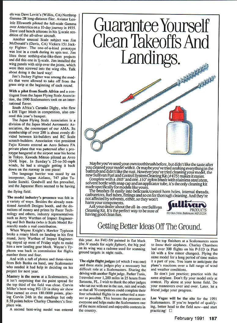 NO OCR TEXT NO OCR TEXT NO OCR TEXT NO OCR TEXT NO OCR TEXT otWtr ii tmi ittle ba ardoo ic next reui scor unman flew r Diacer alec cocknit e expertly mea phics m La John nstrate Aer jod creati Coat mr u n4 / / slot Dy DUI ets u 167 polnti Igeci urn colorful l NO OCR TEXT master builders Scalemasters have begun turning out AMA Precious Scale miniature aircraft models wont yet stand up ruler proportional di vider theyre remarkably close origi nal color marking craftsmanship much first position static judging moved forward eight feet year better look other judges remained standard 10-ft distance new standard quality invites closer inspection find out what isn t logical next step move some judges up models detail viewing What did builder leave off model panel lines rivets cockpits sliding canopies Possibly should three categories Stand-off Scale eventssay expert intermed iate novicewith stand-off distances zero 10 original 20 feet Harris Lee Bert Baker will have printed set Scalemasters rules avail able time next years meet should supply answers questions about rules variations judging criteria Good flying. hard judging luck draw made flight judging difficult dizzyingthis year strangest lottery results ever three Zeros three P-47s three yellow J-3 Cubs fliht judged simultaneously three yellow J-3 Cubs air together looking exactly alike its hard judges pilots keep track plane ing what standouts among Old-Timers A-scale J-3 Cub Robert Pickney allred Travel Air 4000 bipe Gerald Garing Schenectady NY beautiful Alba tros DVA Dick Hansen Portland OR well-worn Rock Thrush yellow cropduster built David Hayes Roanoke Ra pids NC gave what thought best flight demo Hayess model used bicarbonate soda dusting powder Though another cropduster dustoff between two modelers Dick Grahams Piper Pawnee suffered broken wing spar its first flight drop out Canadian Gerry Flinger Winnipeg brought good-flying 13-year-old Cessna L- 19 Bird Dog also used glider tow 225-scale models unusual yellow blue white paint scheme repre sented Canadian Air Training School equivalent CAP country Gerry used 91 OS Max four-cycle en gine Bird Dog Also Canada 94-in CL 215 sporting two 05 Max 30 engines done up like firebomber bright yellowand-red paint job Dave Papes 1933 Kinner Sportster home-built five-cylinder engine fold ing wings must have taken time money build other model field Daves 346-cid engine weighed 66 lb Sportster used 22 x 12 prop have ask much spent engine cant afford unusual extra-effort modContinued page 187 February 1991 185 Just Plane Nuts Bolts Youre probably nuts about flying So So come nobody offers eyebolts nuts made just us Now somebody does Sullivan eyebolt #548 size 2-56 made plated steel features % full thread nut #549 size 4-40 made same exacting specifications Both manufactured specifically model enthusiasts So whether need pull-pull cables flying wires other cable Sullivan nuts bolts package find other model parts 11jjjj~jjj dealers storepPRODUCIS Youd nuts go anywhere else RO Box5166 Baltimore MD 21224 Getting Better Ideas Off Ground &iHRF COVER IAJG A1ATERIAL.I I0 WI/K. AIRFOIL O COVRSE J I els Dave Lovitts Willits CA Northrop Gamma 2B long-distance flier Aviator Len iole Ellsworth piloted full-scale Gamma over Antarctica 10-day journey 1935 Dave used bench ailerons A-scale ren dition all-silver aircraft Another unusual Scale subject Jim McDonalds Davis CA Vickers 151 Jock ey Fighter one-of-a-kind prototype lost crash during its spin test Jim likes nothing-else-like-them projects did A-scale Jim installed wing panels strip over joints screwed wing ribs Talk about doing hard way Jims Jockey Fighter among mod els allowed take off grass strip beginning round pilot South Africa con tingent Japan Flying Scale Associa tion 1990 Scalemasters took inter national flavor South Africas Caranke Digby flew DH Tiger Moth competition also em ceed years banquet Japan Flying Scale Association division Japan Model Aeronautic As sociation counterpart AMA Its membership over 200 about evenly di vided between kit-builders RC Scale scratch-builders Association vice president Fujio Kimoto entered Aero Subaru FA private plane patterned after pro totype hangared airport near home Tokyo Kawada Mitsuo piloted Avro 504K bipe Sundays 25-to-30-mph winds struggle getting back down runway piece language barrier eased interpreter Japan Airlines 747 pilot Ta kaske Suzuki Goodwill fun prevailed Japanese fliers seemed having flying field model industrys presence felt variety ways Besides already men tioned Aeroloft Designs booth nations money prizes Pacer Tech nology others industry representatives such Jerry Warthan Impact Engineer ing Bob Banka Scale Model Re search made real contribution Wayne Knights Hawker Typhoon broke rotary block landing first round Jerry Warthan Impact Engineer ing stayed up Friday night make him new landing gear block Waynes Ty phoon back commission flights number three four raft photos three-views Bob Banka hand Scalemaster needed help deciding project next year Mastery norm Scalemasters isnt surprising point spread top third field close Corvin Millers bent-wing FG-1D shiny air show blue earned 1800000 points plac ing Corvin 24th standings 858 points below Charley Chamberss firstplace win second bent-wing model entered Guarantee Yourself Clean Takeoffs Landings L Maybe youve used own toothbrush before didnt like taste after cleaned model maybe youve tried soaking evetything bathtub didnt like rust However youve tried cleaning moc[el new Sullivan Fuel Control System Cleaning Kit #475 makes easier Complete wtih 065 110 nyIon brush stainless steel stem solvent bottle nap cap appli~r tube its cleaning kit made specifically models like yours brushes fit easily bellcranklcontrol horn holes internal threads carburetors fuel tubes fittings soon thorough cleaning theyre notaffected solvents either theywont hannyourcoonents all-in-one Sullivan Cleaning Kit Its perfect way sure P0 BOX 5166 BaltimoreM021224 having good c