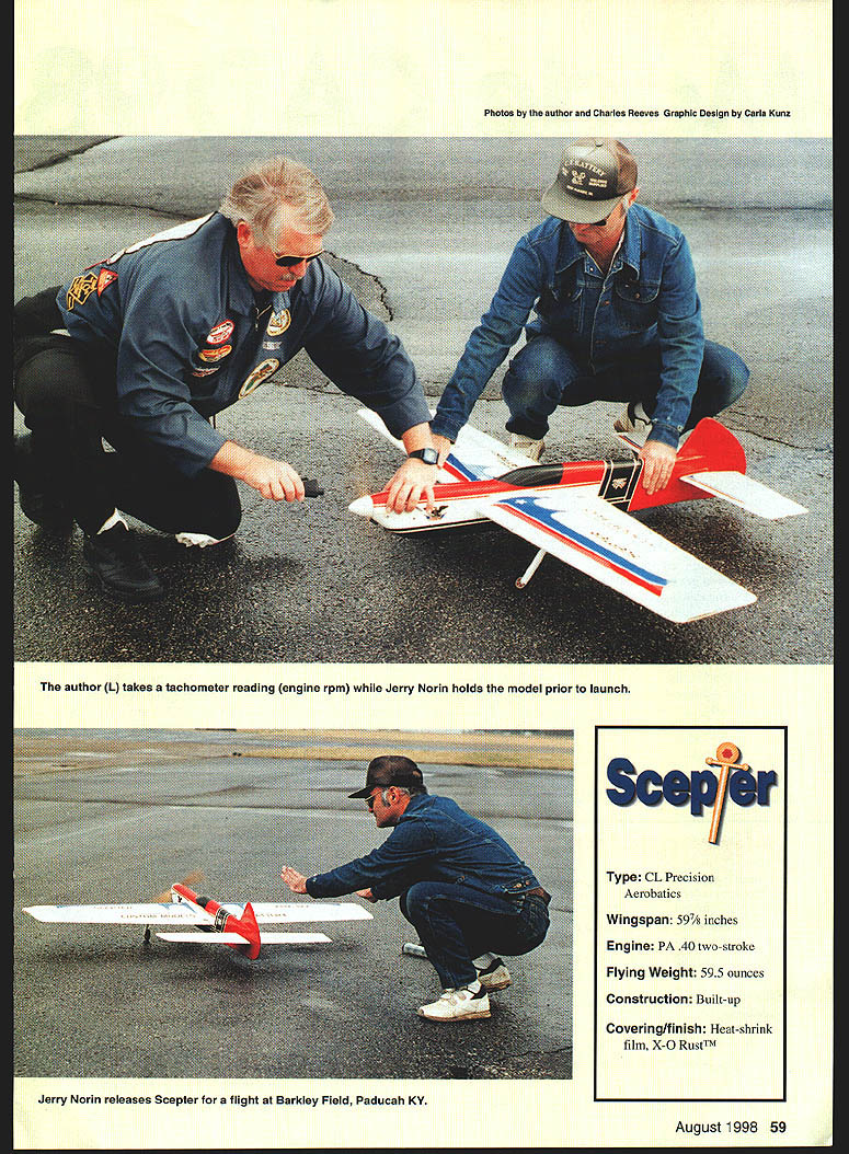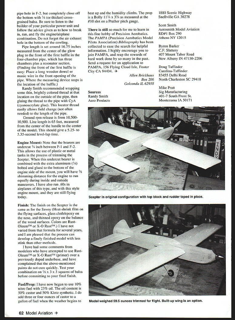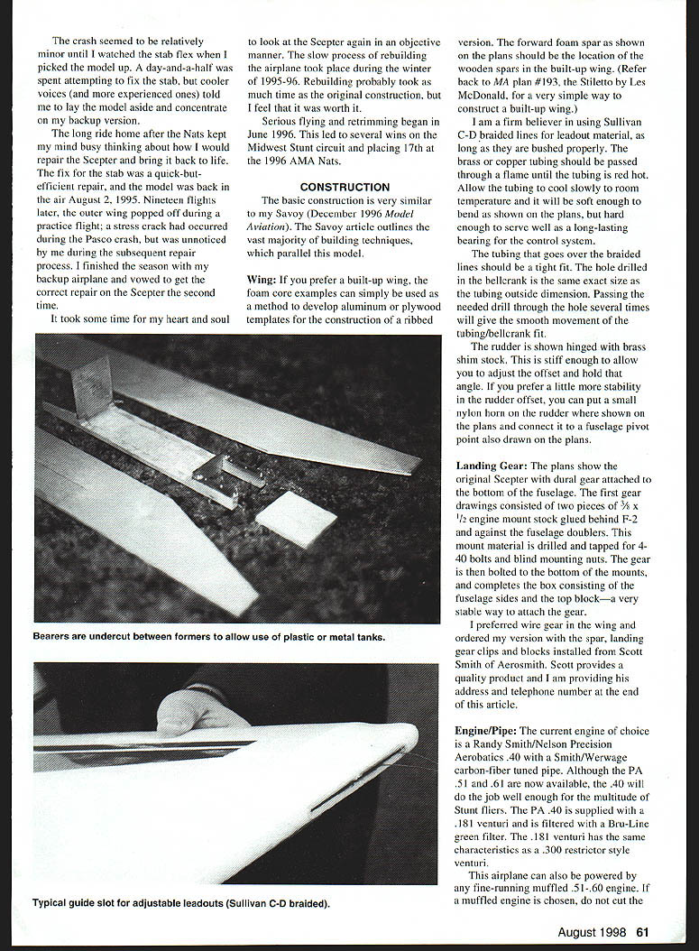 The Scepter derived Bob Hunts Genesis 46 Mark III Eagle/Matrix versions Lou Dudka Glen Meador Nose-to-tail-moment ratio chosen 1165 10 inches leading edge wing back prop 165 inches flap hingeline elevator hingeline Total wing area approximately 675 square inches including flap surface area stab elevator 235% total wing/flap area 160 square inches original Scepter came off building board 57 ounces trimmed fly 595 ounces first flights began June 1995 progressed very well until first practice flight Pasco Washington AMA Nats up line broke handle during third corner reverse wingover Ever-tightening outside loops culminated rather soft inverted crash six-inch-high grass 58 Model Aviation U Allen Brickhaus / / / Photos author Charles Reeves Graphic Design Carla Kunz author L takes tachometer reading engine rpm Jerry Norm holds model prior launch Jerry Norm releases Scepter flight Barkley Field Paducah KY August1998 59 Type CL Precision Aerobatics Wingspan 597/s inches Engine PA 40 two-stroke Flying Weight 595 ounces Construction Built-up Covering/finish Heat-shrink film X-O RustTM crash seemed relatively minor until watched stab flex picked model up day-and-a-half spent attempting fix stab cooler voices experienced ones told lay model aside concentrate backup version long ride home after Nats kept mind busy thinking about would repair Scepter bring back life fix stab quick-butefficient repair model back air August 2 1995 Nineteen flights later outer wing popped off during practice flight stress crack occurred during Pasco crash unnoticed during subsequent repair process finished season backup airplane vowed get correct repair Scepter second time took some time heart soul look Scepter again objective manner slow process rebuilding airplane took place during winter 1995-96 Rebuilding probably took much time original construction feel worth Serious flying rerrimming began June 1996 led several wins Midwest Stunt circuit placing 17th 1996 AMA Nats CONSTRUCTION basic construction very similar Savoy December 1996 Model Aviation Savoy article outlines vast majority building techniques parallel model Wing If prefer built-up wing foam core examples can simply used method develop aluminum plywood templates construction ribbed version forward foam spar shown plans should location wooden spars built-up wing Refer back MA plan #193 Stiletto Les McDonald very simple way construct built-up wing am firm believer using Sullivan C-D braided lines leadout material long bushed properly brass copper tubing should passed through flame until tubing red hot Allow tubing cool slowly room temperature will soft enough bend shown plans hard enough serve well long-lasting bearing control system tubing goes over braided lines should tight fit hole drilled bellcrank same exact size tubing outside dimension Passing needed drill through hole several times will give smooth movement tubing/belicrank fit rudder shown hinged brass shim stock stiff enough allow adjust offset hold angle prefer little stability rudder offset can put small nylon horn rudder shown plans connect fuselage pivot point also drawn plans Landing Gear plans show original Scepter dural gear attached bottom fuselage first gear drawings consisted two pieces 3/ x /2 engine mount stock glued behind F-2 against fuselage doublers mount material drilled tapped 440 bolts blind mounting nuts gear bolted bottom mounts completes box consisting fuselage sides top blocka very stable way attach gear preferred wire gear wing ordered version spar landing gear clips blocks installed Scott Smith Aerosmith Scott provides quality product am providing address telephone number end article Engine/Pipe current engine choice Randy Smith/Nelson Precision Aerobatics 40 Smith/Werwage carbon-fiber tuned pipe Although PA 51 61 now available 40 will job well enough multitude Stunt fliers PA 40 supplied 181 venturi filtered Bru-Line green filter 181 venturi has same characteristics 300 restrictor style venturi airplane can also powered fine-running muffled 51-60 engine muffled engine chosen cut August1998 61 Bearers undercut between farmers allow use plastic metal tanks Typical guide slot adjustable leadouts Sullivan C-D braided pipe hole F-2 completely close off bottom /8 thicker cross grained balsa sure listen builder particular power unit follow advice given to break run fly engine/airplane combination forget air exhaust hole bottom cowling Pipe length set around 1675 inches measured center glow plug front first baffle four-chamber pipe has three chambers plus resonator section Finding front first baffle easy Place long wooden dowel music wire front opening pipe measuring device stops location baffle Randy Smith recommended wrapping some thin brightly colored thread location outside pipe gluing thread pipe CyA cyanoacrylate glue locator thread easily allows field change often needed length pipe Ground rpm release 10500 10900 Line length 65 feet measured center handle center model should give 525- 535-second level-lap time Engine Mount Note bearers undercut between F-i F-2 allows use plastic metal tanks process trimming Scepter undercut bearer combined extra aluminum 1A bolted glued bottom engine side mount will have 3/ shimming distance engine run equally during inside outside maneuvers have also run 60s airplanes type style engine mount still flying today heat up humidity climbs prop Bolly 11 x 33/4 measured #10 slot Prather pitch gauge still much learn fine hobby Precision Aerobatics PAMPA Precision Aerobatics Model Pilots Association Bibliography has collected ease search helpful information highly encourage join PAMPA reap rewards hard work done past Send request application PAMPA 156 Flying Cloud Isle Foster City CA 94404 n Brickhaus Box 206 Golconda IL 62938 Sources Randy Smith Aero Products 1880 Scenic Highway Snellville GA 30278 Scott Smith Aerosmith Model Aviation RD#l Box 290 Athens NY 12015 Byron Barker CF Slattery 407 Mount Tabor Road New Albany IN 47150-2206 Doug Taffinder C