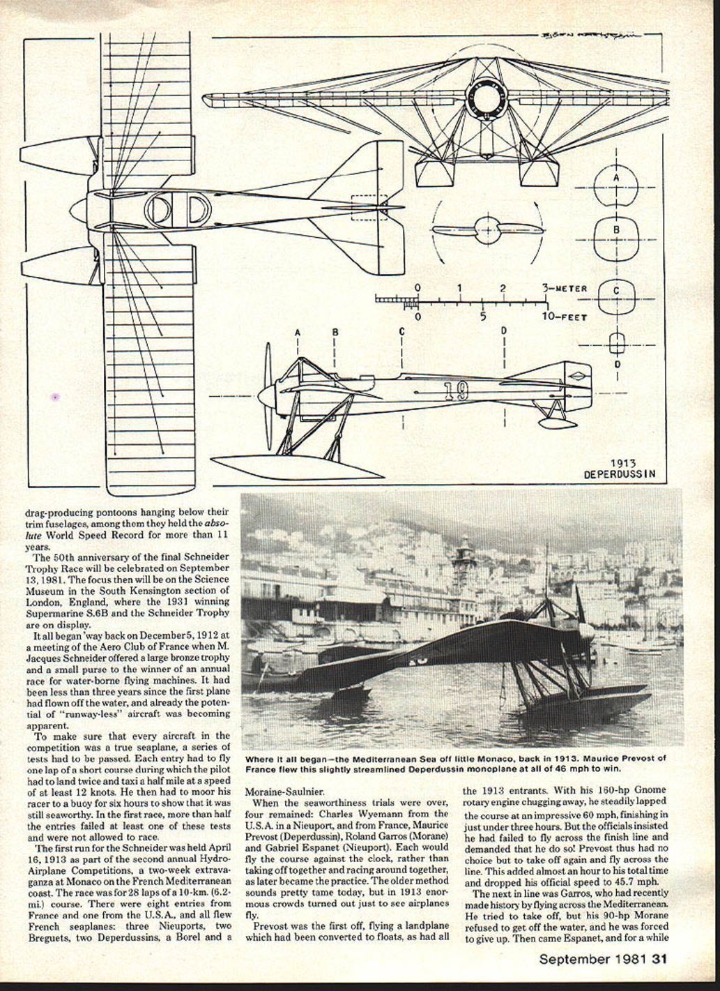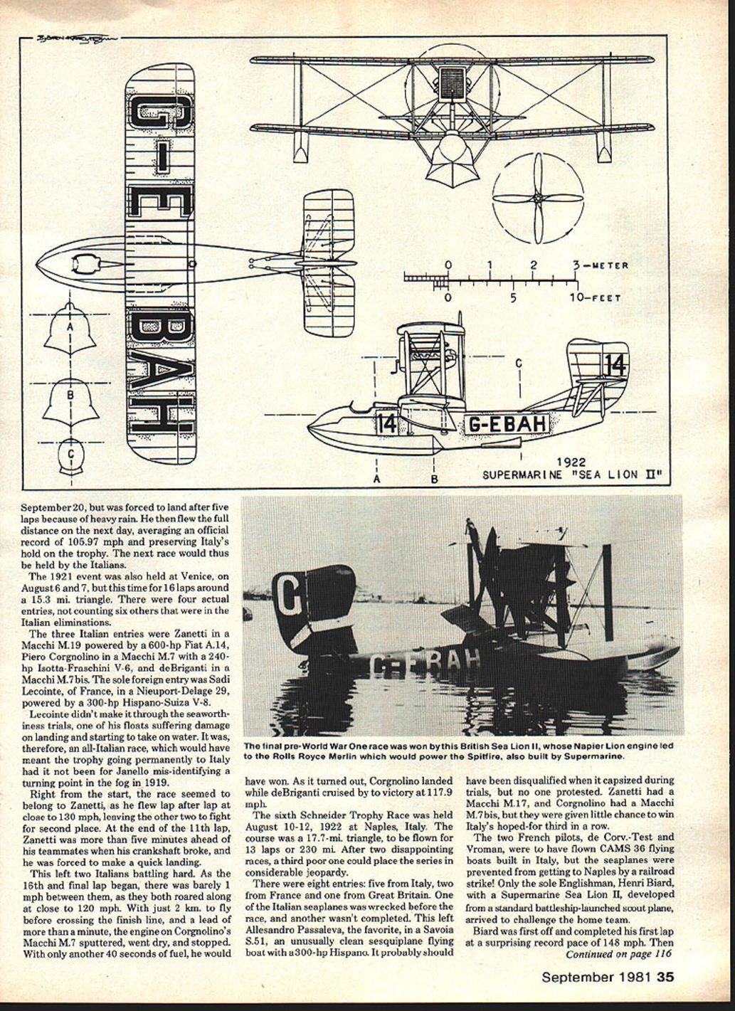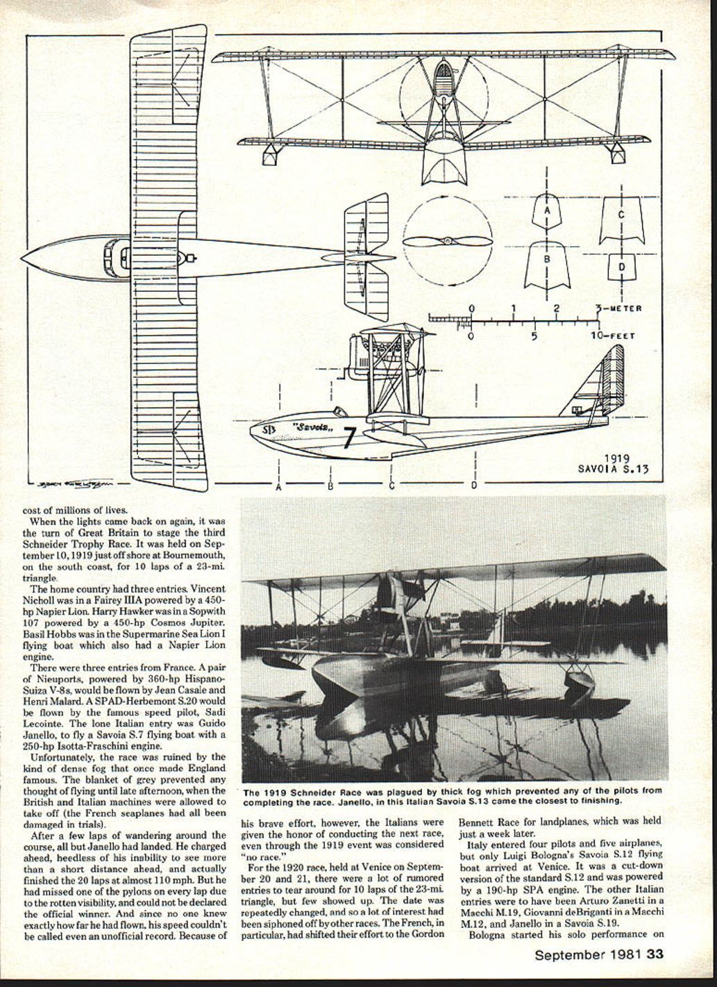 Q 56p 3 THE SCHNEIDER TROPHY originally AE offered winner international speed NIlE competition seaplanes Before long -ii iiCser es ended t created entirely new U7 jfclass rcraft stimulated devel opment airframes engines greater extent other competition aviation h story Strangely t never led important advances seaplanes QThe first race 1913 won stagger ing speed 43 mph final race 1931 won 340 mphmore seven times fast US Britain Italy poured enormous amounts money creation some glamorous aircraft ever ____________________________________________________________________ seen though almost true racing seaplanes built Schneider huge Back Twenties Thirties seaplanes flew faster anything else After look size runways used Schneider Races focus design innovations govern ments factories individuals before after WW first two-part series men machines tried Schneider Trophy covering 1913 1 922E Don Berliner 30 Model Aviation Photos Smithsonian Institution Daperdussin Savois S13 British Aerospace Aircraft Group Sopwith SchneiderTabloid E B Morgan Supermarine Sea Lion II Fiat Aviasione Macchi Castoldi MC 72 Drawings Biorn Karisirom czzzzz drag-producing pontoons hanging below trim fuselages among held abso lute World Speed Record 11 years 50th anniversary final Schneider Trophy Race will celebrated September 13 1981 focus will Science Museum South Kensington section London England 1931 winning Supermarme S6B Schneider Trophy display began way back December5 1912 meeting Aero Club France M Jacques Schneider offered large bronze trophy small purse winner annual race water-borne flying machines less three years since first plane flown off water already poten tial runway-less aircraft becoming apparent make sure aircraft competition true seaplane series tests passed entry fly lap short course during pilot land twice taxi half mile speed least 12 knots moor racer buoy six hours show still seaworthy first race half entries failed least tests allowed race first run Schneider held April 16 1913 part second annual Hydro Airplane Competitions two-week extrava ganza Monaco French Mediterranean coast race 28 laps 10-km 62mi course eight entries France USA flew French seaplanes three Nieuports two Breguets two Deperdussins Borel 0 L1L41I1I0 B I c- 529 Moraine- Saulnier seaworthiness trials over four remained Charles Wyemann USA Nieuport France Maurice Prevost Deperdussin Roland Garros Morane Gabriel Espanet Nieuport would fly course against clock rather taking off together racing around together later became practice older method sounds pretty tame today 1913 enor mous crowds turned out just see airplanes fly Prevost first off flying landplane converted floats 23METERC 5lOFEET D D 1913 DEPERDUSS IN 1913 entrants 160-hp Gnome rotary engine chugging away steadily lapped course impressive 60 mph finishing just under three hours officials insisted failed fly across finish line demanded Prevost thus no choice take off again fly across line added almost hour total time dropped official speed 457 mph next line Garros recently made history flying across Mediterranean tried take off 90-hp Morane refused get off water forced give up came Espanet September 1981 31 began-the Mediterranean Sea off little Monaco back 1913 Maurice Prevost France flew slightly streamlined Deperdussin monoplane 46 mph win Liii 0 1 ABC II zczfZjiN lOrEET 23METE --4--- 1914 SOPWITH SCHNEIDER TABLOID looked like way first place having covered first 20 laps just over 60 mph lap 26 oil line broke over third French pilot man left chance winning American Weymann hut race ended fifth lap handed trophy first prize France According rules next race would organized French scene second Schneider April 20 1914 Monaco again Aero Club France laid Out 10-km course would have caused apoplexy modern race pilot rectangle side just 800 feet long turn hairpin 1650 would chop speeds would add then-unknown danger high-speed stalls Amazingly no accidents injuries race er Schneider Race Britain came two entries Sopwith test pilot Howard Pixton special Sopwith Schneider two-seat Tabloid monoplane con verted single-seater floats Lord Carberry have flown Morane Saulnier hut wrecked switched Deperdussin France three Espanet 1913 nearwinner Pierre Levasseur another Nieuport Garros Morane Swiss entry Schneider Ernest Burn FBA flying boat 100-hp Gnome rotary Ernest Stoffler Germany Aviatik Arrow time two Americans Charles Weymann back Nieuport William Thaw Deperdussin Neither Ameri cans nor German able start race two Frenchmen started together followed closely Pixton Burn giving massed spectators truly exciting spectacle end five laps Pixton averaging close 81 mph Espanetwsa clocked at67 mph Levasseur 58 mph 15 laps Pixton up 89 mph leading Espanet full 20 mph others Espanet pulled out 16th lap Levas seur followed lap later 10th lap Pixton still doing close 89 mph remaining competitor Burn struggling along 60 mph Swiss pilot ran out fuel 23rd lap landed refueled took off again though Pixton already completed race record 868 mph Burn limped home hour later 51 mph Meanwhile Pixton flown two extra laps set 300-km speed record seaplanes 92 mph Despite penalty two bulky floats speed 35 mph slower absolute speed record held tiny landplane Pixtons speed left gathering pilots state shock wasnt another airplane could have approached performance under ideal conditions just two races interesting idea already produced major step forward Just enthusiasm beginning blos som next race being viewed great eagerness someone bump off Austrian archduke start world war fighting dragged four years during time great advances made young science aeronautics 32 Model Aviation /1 -w 1~~ { 1117 1I 1 4This fragile looking Sopwith biplane wastypical oftheearlySchneider being landplane modified race addition pair crude pontoons -4----I-4j cost millions lives lights came back again turn Great Britain stage third Schneider Trophy Race held Sep tember 101919 just off shore atBournemouth south coast 10 laps 23-mi tr