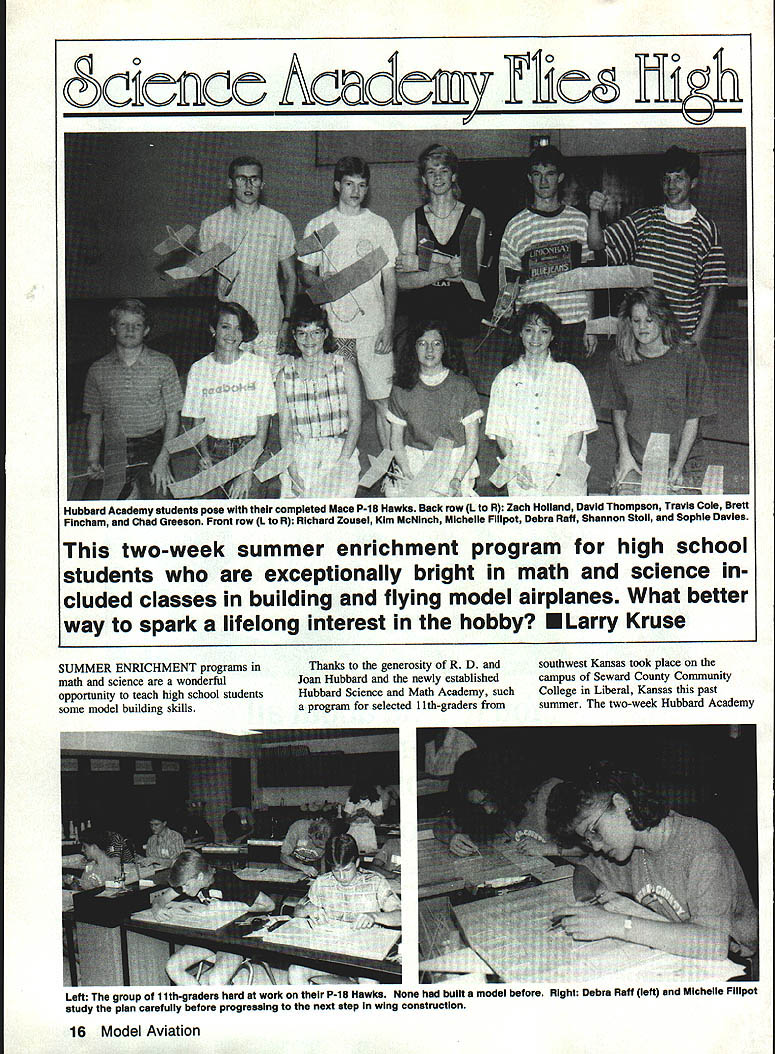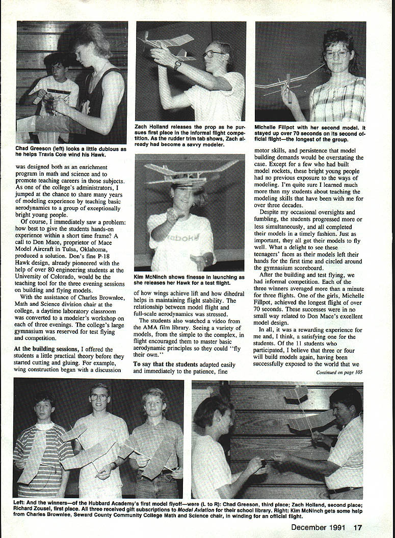 science Acdc r1e m Hubbard Academy students pose completed Mace P-iS Hawks Back row L R Zach Holland David Thompson Travis Cole Brett Fincham Chad Greeson Front row L R Richard Zousei Kim McNlnch Michelle Filipot Debra Raft Shannon Stoil Sophie Davies two-week summer enrichment program high school students exceptionally bright math science cluded classes building flying model airplanes What better way spark lifelong interest hobby U Larry Kruse SUMMER ENRICHMENT programs math science wonderful opportunity teach high school students some model building skills Thanks generosity R D Joan Hubbard newly established Hubbard Science Math Academy such program selected 11th-graders southwest Kansas took place campus Seward County Community College Liberal Kansas past summer two-week Hubbard Academy Left group 11th-graders hard work P-la Hawks None built model before Right Debra Raft left Michelle Filipot study plan carefully before progressing next step wing construction 16 Model Aviation designed both enrichment program math science promote teaching careers subjects As colleges administrators jumped chance share years modeling experience teaching basic aerodynamics group exceptionally bright young people course immediately saw problem best give students hands-on experience within short time frame call Don Mace proprietor Mace Model Aircraft Tulsa Oklahoma produced solution Dons fine P-l8 Hawk design already pioneered help over 80 engineering students University Colorado would teaching tool three evening sessions building flying models assistance Charles Brownlee Math Science division chair college daytime laboratory classroom converted modelers workshop three evenings colleges large gymnasium reserved test flying competition building sessions offered students little practical theory before started cutting gluing example wing construction began discussion wings achieve lift dihedral helps maintaining flight stability relationship between model flight full-scale aerodynamics stressed students also watched video AMA film library Seeing variety models simple complex flight encouraged master basic aerodynamic principles could fly own say students adapted easily immediately patience fine motor skills persistence model building demands would overstating case Except few built model rockets bright young people no previous exposure ways modeling Im quite sure learned much students about teaching modeling skills have over three decades Despite occasional oversights fumbling students progressed less simultaneously completed models timely fashion Just important got models fly well What delight see teenagers faces models left hands first time circled around gymnasium scoreboard After building test flying informal competition three winners averaged minute three flights girls Michelle Fillpot achieved longest flight over 70 seconds successes no small way related Don Maces excellent model design rewarding experience think satisfing students 11 students participated believe three four will build models again having successfully exposed world Continued page los December 1991 17 Chaa ureeson lOft looks little dubious helps Travis Cole wind Hawk 1 Zach Holland reisases prop pur Michelle Flilpot second model sues first place informal flight compe stayed up over 70 seconds its second tition As rudder trim tab shows Zach al ficial flightthe longest group ready become savvy modeler Kim McNinch shows finesse launching releases Hawk test flight r IL Left And winnersof Hubbard Academy-s sirsi model flyoftwere L R Chad Greeson third place Zach Holland second place Richard Zousel first place three received gift subscriptions Model Aviation school library Right Kim McNinch gets some help Charles Browniee Seward County Community College Math Science chair winding official flight show roads inside public park farm roads trails through woods wanted know names county AMA District H New York New Jersey minutes AUTOMAPTM printed out couple pages maps showed county names boundaries wanted spot reported flying sites map District II get idea distributed AUTOMAPTh showed locations fast able type place names given AMA files Yes could have used Rand-McNally road atlas would have difficult would have taken longer AUTOMAPTM very useful tool would useful printed lat/lon six-digit format 365821/772345 government database AUTOMAPTM derived WHERE TO BUY LORAN EJ c FOR R/C PLANES HELICOPTERS & ENGINES 7- w 7040 W PALMElTO PARK RD -NORTH AMERICA TOLL-FREE- SUITE 2304 HA 1-800-332-3256 US 1-800-553-3256 CANADA BOCA RATON FL 33433 Several readers have asked bought LORAN does report lat/lon six-digit format bought EBM can call ERM 1-800533-5007 order Ray Jefferson L-100 LORAN-C $23995 unless price changes business hours Monday through Friday 800 am-800 pm Saturday 900 am-200 pm Eastern time sure get antenna too use five-foot stainless steel whip $1295 standing vertically rear bumper doesnt seem affected fact parallel four five inches away metal body van Tell George sent Science Academy/Kruse Continued page 17 hobby find fascinating gratifying Special thanks bringing project successful conclusion go Charles Brownlee Seward County Community College Jim Stoddard Hubbard Foundation RD Joan Dale Hubbard continue show support young people providing funds expand students educational horizonsE Paris Air Show/Berliner Continued page 25 Food Surprisingly ordinary sandwiches soft drinks sold concession stands ramp aside delectable goodies offered chalets several restaurants served meals well above air show standardand much higher prices fact prices seriously out line restraint orderat least until could get back city its uncountable thousands mostly terrific restaurants Dogs babies Like air shows draws people cant bring themselves leave Junior Fido homenever mind billions dollars worth hardware display cannot expected appeal infants poodles Fortunately both groups kept short leashes caused no discernible problems Traffic Paris famous drivers obviously trained 