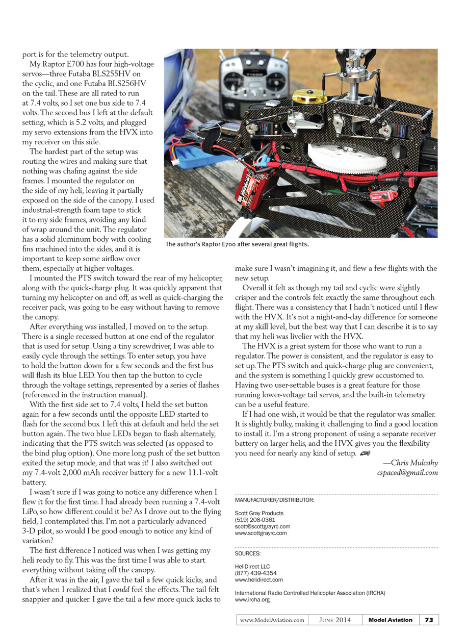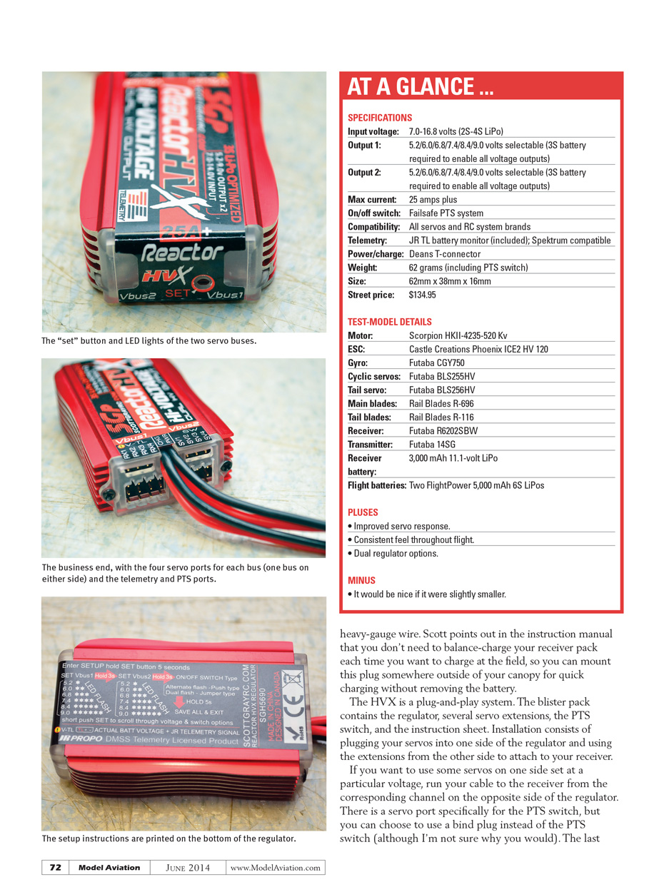 The HVX is a great system for those who want to run a regulator. The power is consistent, and the regulator is easy to set up. The PTS switch and quick-charge plug are convenient, and the system is something I quickly grew accustomed to. Having two user-settable buses is a great feature for those running lower-voltage tail servos, and the built-in telemetry can be a useful feature.