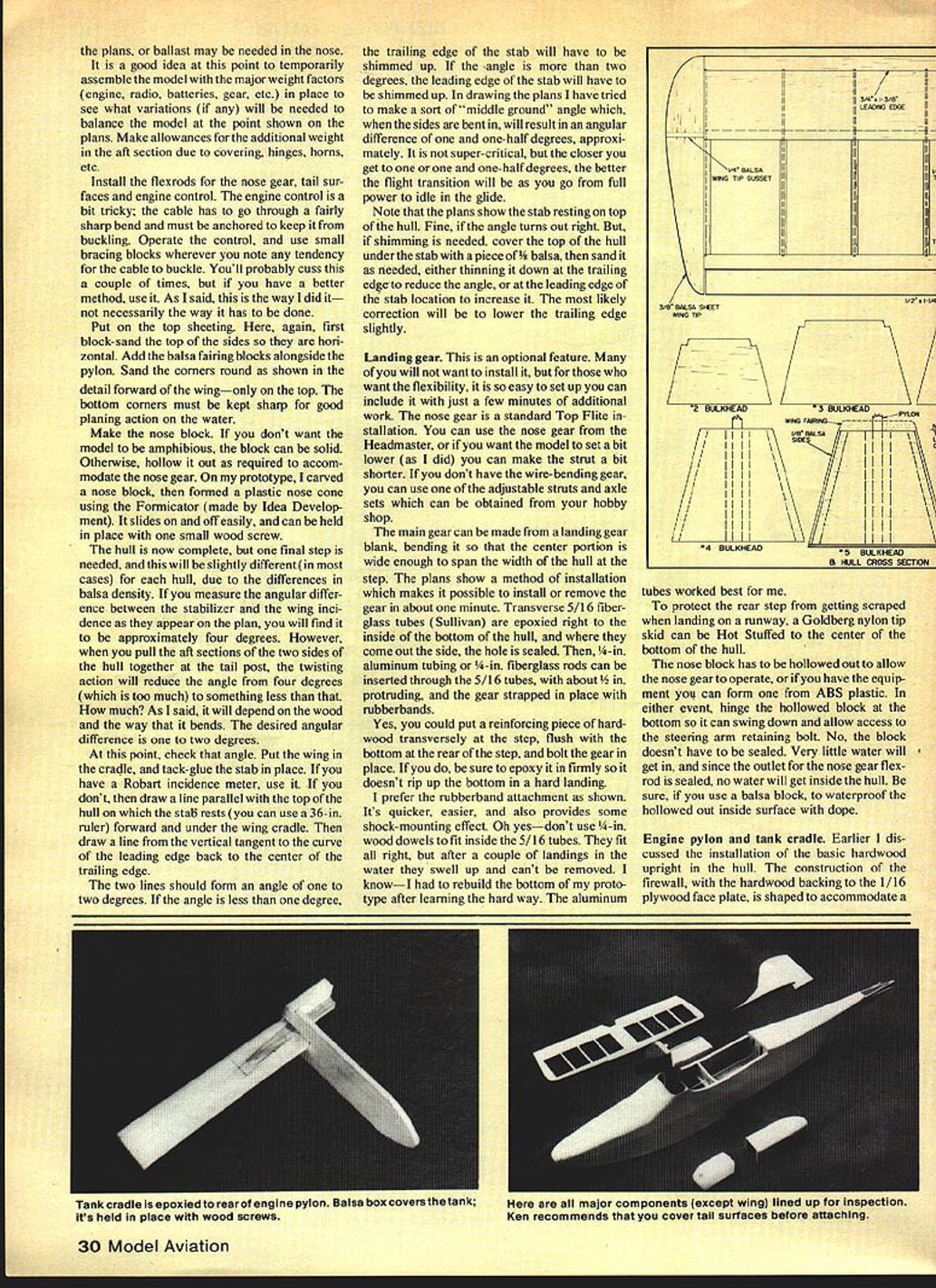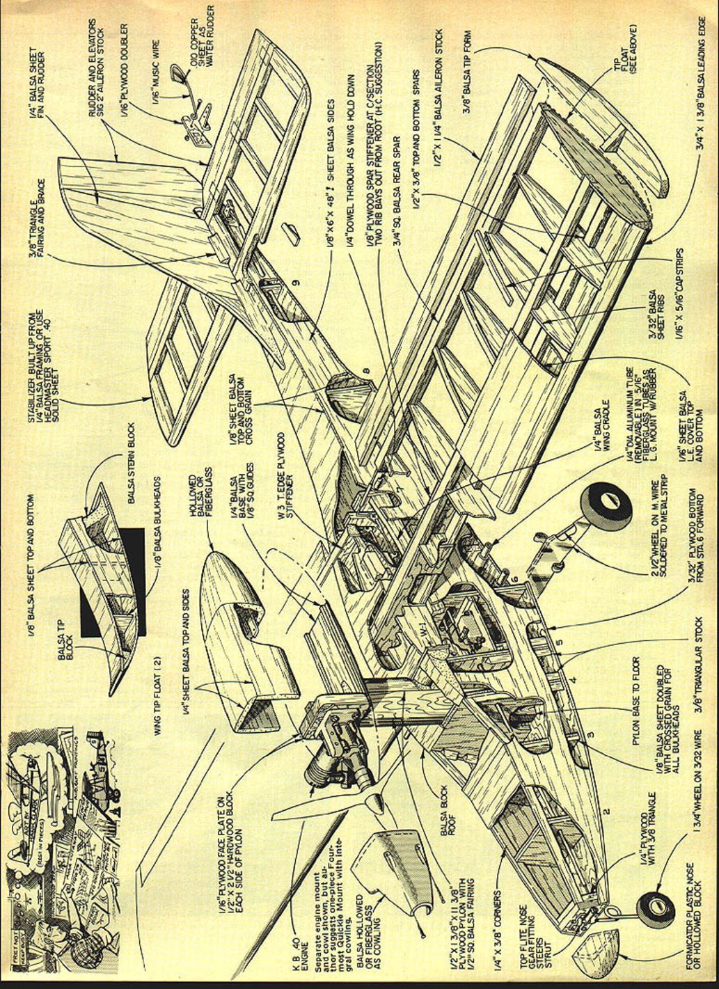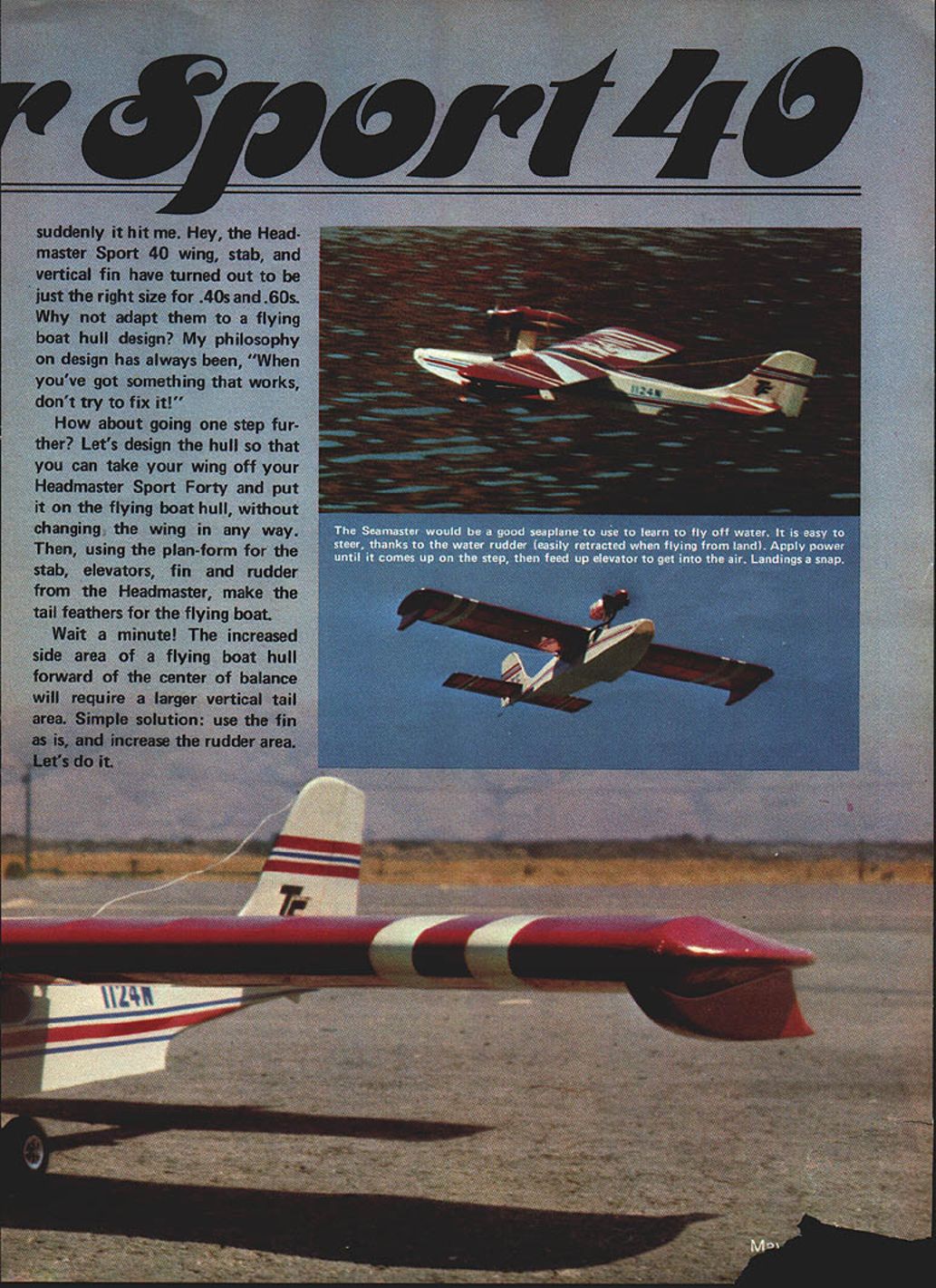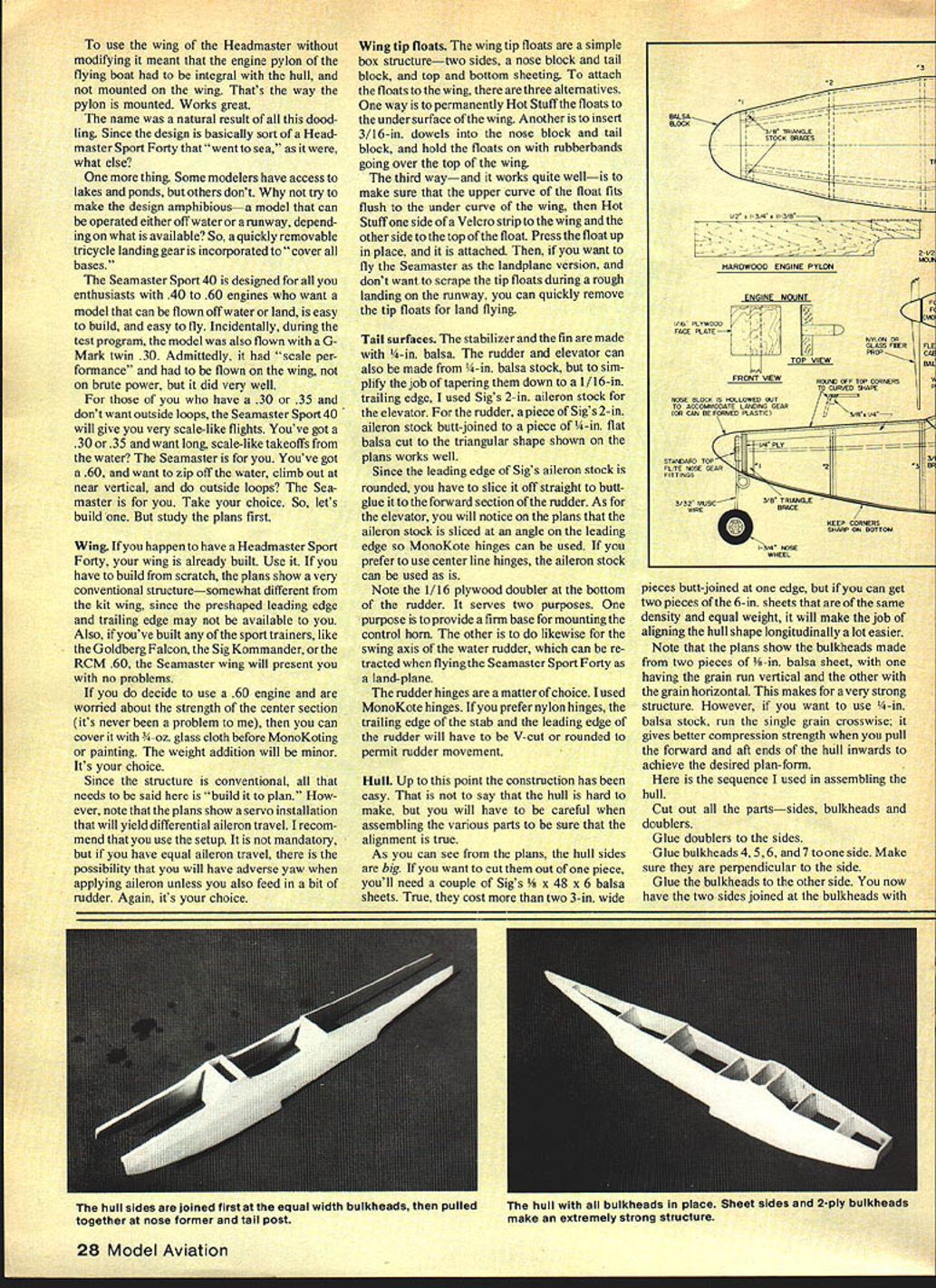 NO OCR TEXT NO OCR TEXT Main landing gear attaches just behind step rubberbands Water rudder extends downward steering pond hinges up Bands fit around aiumlnum rods extending through tubes fuseiage horizontai position out way shore duty Engine pylon tank cradle theirgiory Pourmost engine mount Wing tip floats can beattached permanently made removable strip minimizes drag makes slick-looking installation Velcro top float allows easy interchanaina Tank rests cradle firmly attacnE place held wood screws Seamaster fiaw weli G-Mark 30 Twin instalisa power poa U Ucuery a,u ac aan. p1a vizam asfety precaution FRBT Nor Tm RES ii PIECES NttqfrAer4S - I/I6PLYW0OO FACE PLATE ON /2 X 21/2 HARDWOOD BLOCK EACH SIDE OF PYLON KB40 ENGINE Separate engine mount cowl shown au thor suggestS one-piece Fourmost Quickie Mount inte gral cowiing BALSA HOLLOWED IBERGLASS I/2X 3/8X ii 3/8ROOF PLY WODO PYLON WITH /2 SQ BALSA FAIRING I/B BALSA SHEET TOP AND BOTTOM BALSA STERN BLOCK WING TIP FLOAT 2 1/4 SHEET BALSA TOP AND SIDES W N BALSA BULKHEADS HOLLOJIED BALSA OR FIBERGLASS BASE WiTH 1/8 SQ GLEES STA8ILIZER BUILT UP FROM3/8 TRIANGLE1/4 BALSA SHEET 1/4 BALSA FRAMING OR USEFAIRING AND BRACEFIN AND RUDDER HEADMASTER SPORT 40 SOLID SHEET RUDDER AND ELEVATORS ISIG2AILERON STOCK /1/16 PLY\tD DOUBLER WATER RUDDER 7 7 1/B X6X 48 SHEET BALSA SIDES 7 i/4DOWEL THROUGH AS WiNG HOLD DOWN I/B PLYWOOD SPAR STIFFENER AT C/SECTiON TWO RIB BAYS OUT FROM ROOT HC SUGGESTION 3/4 SQ BALSA REAR SPAR I/2X 3/8 TOPAMO BOTTOM SPARS 1/2 X 11/4 BALSA AILERON STOCK 3/8 BALSA TIP FORM 1/4 X 3/8 CORIiERS. K FORMICATOR PLASTIC NOSE OR HOLLOWED BLOCK /4 PLYWOOD WITH 3/8 TRIANGLE N BASE ID FLD 1/8 BALSA SHEET DOUBLED WITH CROSSED GRAIN FOR ALL BULKHEADS 3/4WIEaON 3f32 WIRE 3/81TRLANGJLAR STOCK /4 BALSA WING CRADLE i/4DIAALUMINUM TUBE REMWABLE IN 5/16 FIBERGLASS TUELA$ / LG MOUNT W/RUUEN / 1/16 SHEET BALSA // 3/32 PLYVOD BO1TOMLE COVER TOP FROM S16 FORWARDAND BOTTOM 2 UWHEEL ON MWIRE SOLDEFD TO MELSTRiP 3/ 32 BALSA SI-IEET RIBS P FLOAT SEE ABcNE I/16X 5/16 CAP STRIPS 3/4 X 3/BBALSA LEADING EDGE use wing Headmaster modifying meant engine pylon flying boat integral hull mounted wing Thats way pylon mounted Works great name natural result dood ling Since design basically sort Head master Sport Forty went sea what else thing Some modelers have access lakes ponds others dont try make design amphibiousa model can operated either off water runway depend ing what available So quickly removable tricycle landing gear incorporated cover bases Seamaster Sport 40 designed enthusiasts 40 60 engines want model can flown off water land easy build easy fly Incidentally during test program model also flown Mark twin 30 Admittedly scale per formance flown wing brute power did very well have 30 35 dont want outside loops Seamaster Sport 40 will give very scale-like flights Youve got 30 35 want long scale-like takeoffs water Seamaster Youve got 60 want zip off water climb out near vertical outside loops Seamaster Take choice So lets build study plans first Wing happen have Headmaster Sport Forty wing already built Use have build scratch plans show very conventional structuresomewhat different kit wing since preshaped leading edge trailing edge may available Also youve built sport trainers like Goldberg Falcon Sig Kommander RCM 60 Seamaster wing will present no problems decide use 60 engine worried about strength center section its never problem can cover 3A-oz glass cloth before MonoKoting painting weight addition will minor Its choice Since structure conventional needs said build plan ever note plans show servo installation will yield differential aileron travel recom mend use setup mandatory have equal aileron travel possibility will have adverse yaw applying aileron unless also feed bit rudder Again its choice Wing tip floats wing tip floats simple box structuretwo sides nose block tail block top bottom sheeting attach floats wing three alternatives way permanently Hot Stuff floats under surface wing Another insert 3/16-in dowels nose block tail block hold floats rubberbands going over top wing third wayand works quite wellis make sure upper curve float fits flush under curve wing Hot Stuff side Velcro strip wing other side top float Press float up place attached want fly Seamaster landplane version dont want scrape tip floats during rough landing runway can quickly remove tip floats land flying Tail surfaces stabilizer fin made -in balsa rudder elevator can also made -in balsa stock sim plifi job tapering down 1/16-in trailing edge used Sigs 2-in aileron stock elevator rudder piece Sigs 2-in aileron stock butt-joined piece -in flat balsa cut triangular shape shown plans works well Since leading edge Sigs aileron stock rounded have slice off straight buttglue forward section rudder As elevator will notice plans aileron stock sliced angle leading edge MonoKote hinges can used prefer use center line hinges aileron stock can used Note 1/16 plywood doubler bottom rudder serves two purposes purpose provide firm base mounting control horn other likewise swing axis water rudder can re tracted flying Seamaster Sport Forty land-plane rudder hinges matter choice used MonoKote hinges prefer nylon hinges trailing edge stab leading edge rudder will have V-cut rounded permit rudder movement HulL Up point construction has easy say hull hard make will have careful assembling various parts sure alignment true As can see plans hull sides big want cut out piece youll need couple Sigs x 6 balsa sheets True cost two 3-in wide ENGINE MT Top VIEW ONT VIEW RALSA MOCK TRIANGLE STOCR CRACES TI 1-34 DC HARDWOOD ENGINE PYLON EC PC NYLON OR GLASS PHORFLE PROPCAR RAL GOONS OFF TOP CORNERSIA TO CURVES ORAPEP NOSE SLOEK IS HOLLOWED CRY TO ACCOMMOOATE LANONS SEAR IOU CAN RE FORMED PLASTIC SR IAv VRPLY DARD TOP34 ELITE NOSE SEAR1S3 FIT TI SOS 330 MUSIC3R TRIANGLE APREBRACE KEEP CORNERS I7SHAM OR ROTTOM EDYR ROSE WHEEL pieces butt-joined edge can get two pieces 6-in sheets same density equal weight w