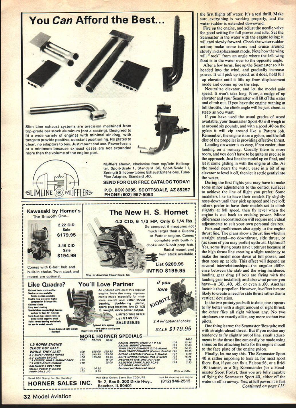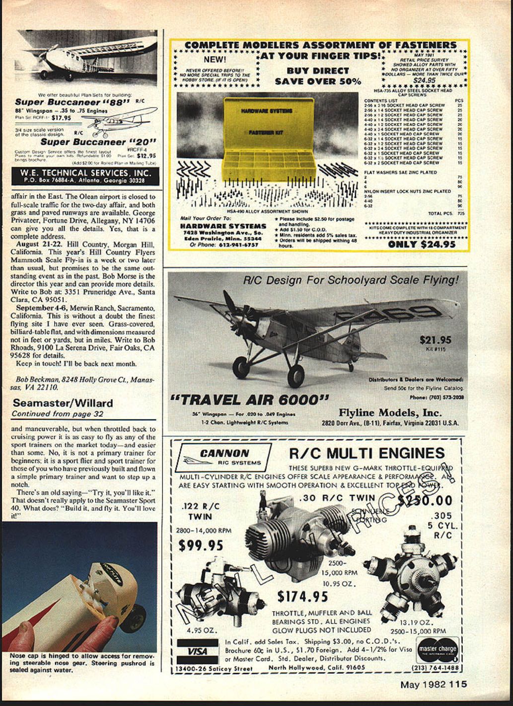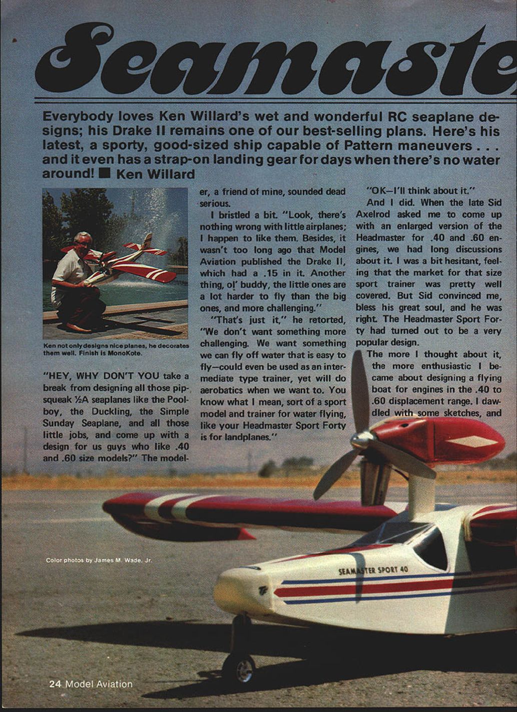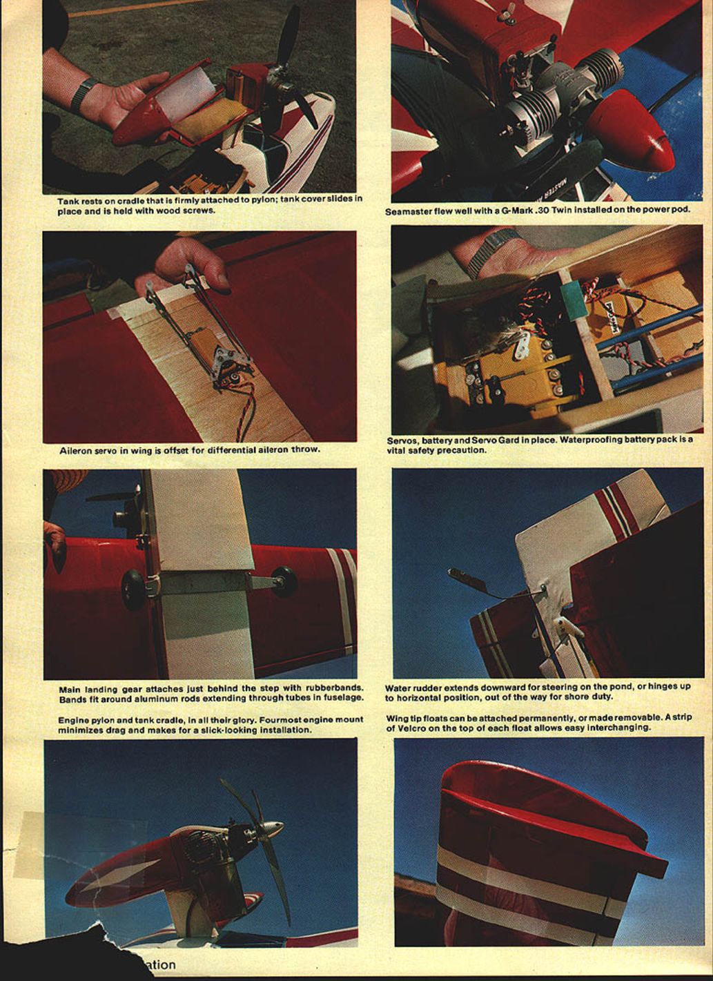 NO OCR TEXT NO OCR TEXT Main landing gear attaches just behind step rubberbands Water rudder extends downward steering pond hinges up Bands fit around aiumlnum rods extending through tubes fuseiage horizontai position out way shore duty Engine pylon tank cradle theirgiory Pourmost engine mount Wing tip floats can beattached permanently made removable strip minimizes drag makes slick-looking installation Velcro top float allows easy interchanaina Tank rests cradle firmly attacnE place held wood screws Seamaster fiaw weli G-Mark 30 Twin instalisa power poa U Ucuery a,u ac aan. p1a vizam asfety precaution FRBT Nor Tm RES ii PIECES NttqfrAer4S - I/I6PLYW0OO FACE PLATE ON /2 X 21/2 HARDWOOD BLOCK EACH SIDE OF PYLON KB40 ENGINE Separate engine mount cowl shown au thor suggestS one-piece Fourmost Quickie Mount inte gral cowiing BALSA HOLLOWED IBERGLASS I/2X 3/8X ii 3/8ROOF PLY WODO PYLON WITH /2 SQ BALSA FAIRING I/B BALSA SHEET TOP AND BOTTOM BALSA STERN BLOCK WING TIP FLOAT 2 1/4 SHEET BALSA TOP AND SIDES W N BALSA BULKHEADS HOLLOJIED BALSA OR FIBERGLASS BASE WiTH 1/8 SQ GLEES STA8ILIZER BUILT UP FROM3/8 TRIANGLE1/4 BALSA SHEET 1/4 BALSA FRAMING OR USEFAIRING AND BRACEFIN AND RUDDER HEADMASTER SPORT 40 SOLID SHEET RUDDER AND ELEVATORS ISIG2AILERON STOCK /1/16 PLY\tD DOUBLER WATER RUDDER 7 7 1/B X6X 48 SHEET BALSA SIDES 7 i/4DOWEL THROUGH AS WiNG HOLD DOWN I/B PLYWOOD SPAR STIFFENER AT C/SECTiON TWO RIB BAYS OUT FROM ROOT HC SUGGESTION 3/4 SQ BALSA REAR SPAR I/2X 3/8 TOPAMO BOTTOM SPARS 1/2 X 11/4 BALSA AILERON STOCK 3/8 BALSA TIP FORM 1/4 X 3/8 CORIiERS. K FORMICATOR PLASTIC NOSE OR HOLLOWED BLOCK /4 PLYWOOD WITH 3/8 TRIANGLE N BASE ID FLD 1/8 BALSA SHEET DOUBLED WITH CROSSED GRAIN FOR ALL BULKHEADS 3/4WIEaON 3f32 WIRE 3/81TRLANGJLAR STOCK /4 BALSA WING CRADLE i/4DIAALUMINUM TUBE REMWABLE IN 5/16 FIBERGLASS TUELA$ / LG MOUNT W/RUUEN / 1/16 SHEET BALSA // 3/32 PLYVOD BO1TOMLE COVER TOP FROM S16 FORWARDAND BOTTOM 2 UWHEEL ON MWIRE SOLDEFD TO MELSTRiP 3/ 32 BALSA SI-IEET RIBS P FLOAT SEE ABcNE I/16X 5/16 CAP STRIPS 3/4 X 3/BBALSA LEADING EDGE use wing Headmaster modifying meant engine pylon flying boat integral hull mounted wing Thats way pylon mounted Works great name natural result dood ling Since design basically sort Head master Sport Forty went sea what else thing Some modelers have access lakes ponds others dont try make design amphibiousa model can operated either off water runway depend ing what available So quickly removable tricycle landing gear incorporated cover bases Seamaster Sport 40 designed enthusiasts 40 60 engines want model can flown off water land easy build easy fly Incidentally during test program model also flown Mark twin 30 Admittedly scale per formance flown wing brute power did very well have 30 35 dont want outside loops Seamaster Sport 40 will give very scale-like flights Youve got 30 35 want long scale-like takeoffs water Seamaster Youve got 60 want zip off water climb out near vertical outside loops Seamaster Take choice So lets build study plans first Wing happen have Headmaster Sport Forty wing already built Use have build scratch plans show very conventional structuresomewhat different kit wing since preshaped leading edge trailing edge may available Also youve built sport trainers like Goldberg Falcon Sig Kommander RCM 60 Seamaster wing will present no problems decide use 60 engine worried about strength center section its never problem can cover 3A-oz glass cloth before MonoKoting painting weight addition will minor Its choice Since structure conventional needs said build plan ever note plans show servo installation will yield differential aileron travel recom mend use setup mandatory have equal aileron travel possibility will have adverse yaw applying aileron unless also feed bit rudder Again its choice Wing tip floats wing tip floats simple box structuretwo sides nose block tail block top bottom sheeting attach floats wing three alternatives way permanently Hot Stuff floats under surface wing Another insert 3/16-in dowels nose block tail block hold floats rubberbands going over top wing third wayand works quite wellis make sure upper curve float fits flush under curve wing Hot Stuff side Velcro strip wing other side top float Press float up place attached want fly Seamaster landplane version dont want scrape tip floats during rough landing runway can quickly remove tip floats land flying Tail surfaces stabilizer fin made -in balsa rudder elevator can also made -in balsa stock sim plifi job tapering down 1/16-in trailing edge used Sigs 2-in aileron stock elevator rudder piece Sigs 2-in aileron stock butt-joined piece -in flat balsa cut triangular shape shown plans works well Since leading edge Sigs aileron stock rounded have slice off straight buttglue forward section rudder As elevator will notice plans aileron stock sliced angle leading edge MonoKote hinges can used prefer use center line hinges aileron stock can used Note 1/16 plywood doubler bottom rudder serves two purposes purpose provide firm base mounting control horn other likewise swing axis water rudder can re tracted flying Seamaster Sport Forty land-plane rudder hinges matter choice used MonoKote hinges prefer nylon hinges trailing edge stab leading edge rudder will have V-cut rounded permit rudder movement HulL Up point construction has easy say hull hard make will have careful assembling various parts sure alignment true As can see plans hull sides big want cut out piece youll need couple Sigs x 6 balsa sheets True cost two 3-in wide ENGINE MT Top VIEW ONT VIEW RALSA MOCK TRIANGLE STOCR CRACES TI 1-34 DC HARDWOOD ENGINE PYLON EC PC NYLON OR GLASS PHORFLE PROPCAR RAL GOONS OFF TOP CORNERSIA TO CURVES ORAPEP NOSE SLOEK IS HOLLOWED CRY TO ACCOMMOOATE LANONS SEAR IOU CAN RE FORMED PLASTIC SR IAv VRPLY DARD TOP34 ELITE NOSE SEAR1S3 FIT TI SOS 330 MUSIC3R TRIANGLE APREBRACE KEEP CORNERS I7SHAM OR ROTTOM EDYR ROSE WHEEL pieces butt-joined edge can get two pieces 6-in sheets same density equal weight w