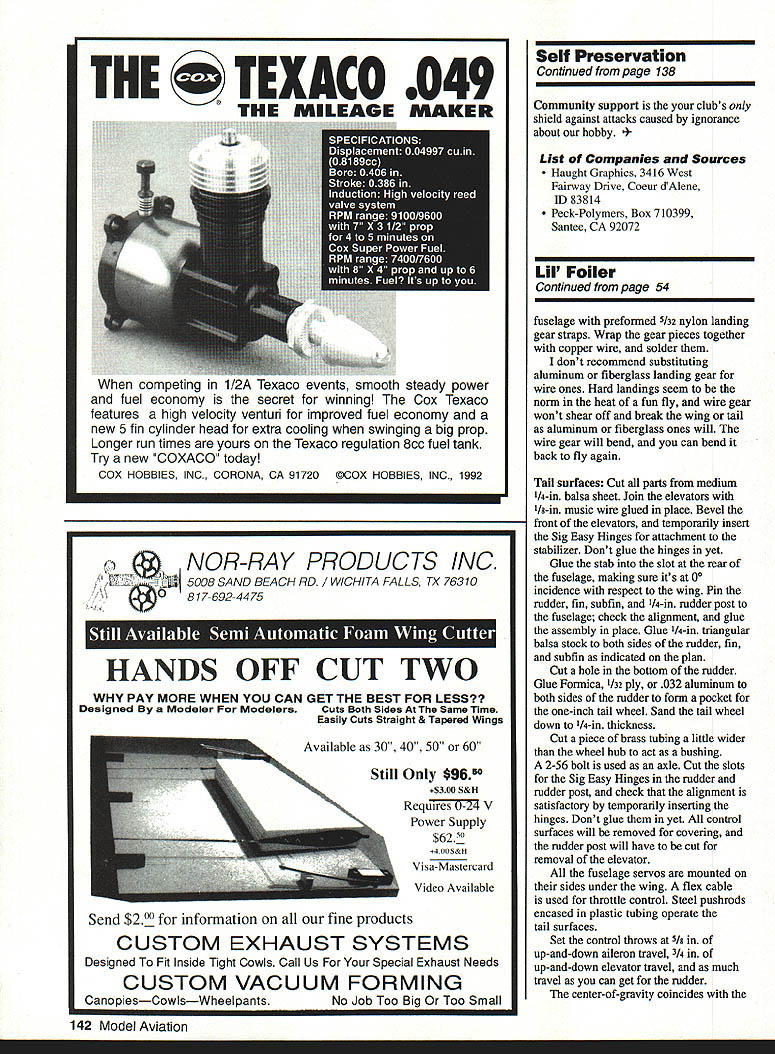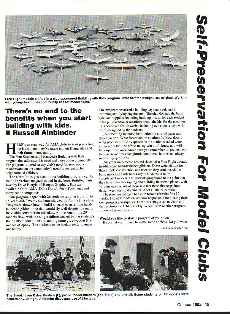 Theres no end benefits start building kids U Russell Ainbinder EREs easy way AMA clubs start protecting H investment theyve made flying sites future membership Four Strokers founded Building Kids program addresses need community program based clubs need good public relations communitys need recreation neighborhood children aircraft designs used building program can found various magazines book Building Kids Dave Haught Haught Graphics Kits available AMA Delta Darts Peck-Polymers other companies program began 26 students ranging 11 15 years old Twenty students showed up first class shown build easy-to-assemble handlaunched gliderone would fly well despite inevitable construction mistakes 20 models flew single failure caused students taking model home adding glueabout five ounces epoxy students came back weekly enjoy hobby program involved building day week trimming flying day next club donated balsa glue supplies including building boards student keep Four Stroker members precut kits program continued 12 weeks including two contest days events designed students meeting included instruction aircraft parts function What forces act aircraft does wing produce lift Any questions students asked answered Dont afraid say dont know will look up answer Make sure remember get answers sometimes insightful sometimes humorous always interesting questions program centered around sheet balsa Free Flight aircraft profile scale hand-launched gliders chosen simple construction because could teach basic modeling skills necessary advance complicated models students progressed point have started designing building own planes varying success said first steps design very instructional successful program changed club format after first 12 weeks new modelers now responsible picking own projects supplies am still acting advisor meetings held biweekiy start another program Ill way again Would like start program own first youll have make some choices want October 1992 15 Free Flight models crafted club-sponsored Building Kids program Over half designs original Working youngsters builds community ties model clubs 0 mu tmmt 0 0 mm P1 C ml C mm C 0 0 0 Continued poge 138 Brookhaven Balsa Busters L proud model builders fliers Some students FF models camera-shy right Ainbinder discusses use trim tabs SAVE YOUR FIELD SNUF-LER muffler isa low cost easy install lightweight Sound reducing muffler no prformsnce penalty answer AMA muffler ruie suggestions saving flying fields Meets AMA muffler rule suggestIons 3 10 decIbels quieter stock muffler No power loss possIble 300-500 RPM Increase Improves engine Idle s better fuel economy EasIly attached 25-108 stock mufflers Hut corrosion resistant Black E coat finish No special edeptera required WeIghs 35 oza Fits ASP BRAT ENYA FOX HP IRVINE K & B 05 MAX ROYAL YS SUPER TIGRE mufflers Ii 001 available hobby strop ORDER DIRECT immadiate shipment Check MO Visa MC COD SEND 2SF STAMP accepted Add $250 UPS $2OOiorCOD and6%salesiso FOR ADDITIONAL INFO Cahf residentAND JTEC CATALOG MAStER AIRSCREW Efficient wide tips thinner airfoil sections combine greater thrust noise suppression true tip path G/F K Classic Series made 33% glass-filled nylon strength durability will out-perform wood other plastics water sand & gravel runways Wood Series made lightweight kiln-dried beechwood sizes 9-16 inches & heavier maple 18-24 inch range New 18 inch Classic Series 1 6 24 engines has semi-scale look excellent performance Available local hobby dealer G/F________ SERIES black glass-filled nylon8x4 8x6$1 35 55x4 55x45$ 999x4 9x5 9x6 9x8 95x6 . 155 6x3 6x35 6x49910x6 10x7 10x8175 7x4 7x61251 1x6 1 1x7 1 1x75 1x9. 195 K SERI ES black glass-filled nylon 12x6 12x8$285 13x6 13x8385 JV54$EmES ILU~black glass-filled nylon 16x6 16x8 16x10.$795 WOOD SERIES beechwood maple 9x4 9x5 9x6 9x8$195 10x5 10x6 10x7 10x8225 11x6 llxl 11x8llxlO.255 12x6 12x8 12x9325 13x6 13x8 13x10395 14x6 14x8$495 15x8 lSxlO595 16x6 16x8665 18x6 18x8 18x10$1295 20x6 20x8 20x101495 14x6 14x8 14x10$ 525 16x6 16x8 16x10895 18x6 18x8 18x101395 20x6 20x8 20x101595 22x8 22x10 22x121795 24x8 24x10 24x121995 138 Model Aviation newsletter contains speCific information racing plus small column TR expert Walt Perkins Team Race plans vendort producing hard-to-find racing parts accessories included TR Inquirer published once month subscription information write Kenn Smith 521 Jansen Ave San Dimas CA 91773 Foxberg raCers Kenn also editor Southern Ca1fornia Foxberg Championship Series SCFCS Report newsletter documents various contest result sources equipment includes contest calendar Both newsletters available modest price president CBBB Columbia Basin Balsa Bashers Richland Washington sent photo rising star Northwest racing circles Joe Rice 1991 NW Regional Control Line High Point Champion addition Joe established National Senior speed record Sport Speec /2A Profile Proto hope see Joe Chicopee Nationals As always comments appreciated -Preservation Continued page 15 one-time parent-child night program fixed number meetings ongoing format decide ongoing format suggest starting few meetings see students interest holds club program Write up outline program intend run After must get clubs full support Find facility room large enough test-gliding modelsschools libraries local government recreation centers ideal Choose five six places seem best suited program Next prepare program proposal make appointments present officials facilities youve selected After youve secured site have schedule meetings start collecting kits other supplies youll need run program Give yourself enough time get supplies ready before first class wish luck starting own program found both rewarding enjoyable clubs Building Kids program helped build strong relations community local government officials Everyone involved benefited children got feeling accomplishment building model watching fly gave stronger sense themselves made feel like good citizens club has group people draw upon time need 