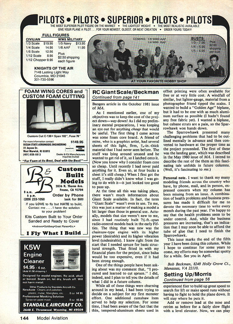 There few very important things should right before attempting high-start winch launch new RC Sail plane author discusses new activity reminder old hands Pancho N Morris New ~iIpIane THIS ARTICLE intended help newcomer trim out first RC Sailplane can also refresher us things dont remember have stolen borrowed material too good writers remem ber should acknowledged will assume ship built covered surfaces should square fuselage rudder should exactly vertical respect stabilizer stab right angles fuselage top front wing stab should aligned perfectly fix Yes airplane will fly somewhat off wont fly well efficiently Besides everyone field will snicker behind back 54Model Aviation author Pancho Morris looks confident begins aunch Saiipiane because has attended preiiminaries recommended herein Photograph Allan Beutier // RUN STRAIGHT INTO THE WIND WITH THE PLANE LEVEL Next importantly wing must have warps best way check look wing trailing edge Looking very center wing look bottom wing slowly rotate leading edge upward glancing side side leading edge should disappear same time both wings large poly hedral wing easiest distance behind sailplane requiring helper plug-on wings plane check both wings have same incidence angle relationship fuselage warps get out old iron heat gun twist warps out reshrink covering Check recheck until get wing perfect little warp makes big turn again nothings worse hearing guys snicker Now have perfectly flat might want warp Im talking about washout mysterious term always hear having trailing edge wing tip slightly higher leading edge Without getting too technical im possible makes wing tips stall stop flying before center wing stalls slow down ship too much makes plane drop straight forward tip stalls first plane does something bad real fast Alright have plane square straight washed-out Now lets balance place indicated plans good spot Add lead nose until balances have never seen Sailplane come out nose-heavy weight always added nose can balance slightly ahead cen \ ter gravity CG point shown plans no means get behind first flight coming AlP dont have CG spot marked plans want know mark came usually about 33% mean aerodynamic chord MAC RC Sailplanes especially beginner types Mean aerodynamic chord theres good term What Mean stands average ornery Chord width wing Aerodynamic means part doing lifting mean aero dynamic chord purposes average average chord root chord average chord wing area divided wing span Both measurements should plans kit box top measure span consult childs math geometry book figure out area rectangles triangles make up wing root chord width wing fuselage So MAC root chord chord 2 MAC will figure 5 12 THROW STRAIGHT OUT NOT UP depending wing Now put MAC plane plane has straight trailing edge leading edge tapers back will trailing edge root forward Oppositely leading edge straight trailing edge tapers forward will leading edge root back both taper evenly will cen tered root chord taper unevenly will off either fore aft Guestimate Calculate 33% MAC mark front MAC will balance first flights Check make sure controls move proper direction Left rudder stick makes rudder go left side plane Back elevator stick makes trail ing edge elevator stab go up Spoilers have going ignored now Rudder throw should about 25 30 degrees side Elevator stab move ment should very little Make adjust ments servo arms control horns get amount Moving out servo arm gives throw Moving out control horn gives less throw Adjust devises rudder centered elevator level transmitter trims center positions Lets go field will first hand launch Sailplane before will just run Turn trans mitter receiver holding plane just over head dead level run wind plane wants pull up Dive Test GOOD FOR TRAINERS GOOD FOR HIGH PERFORMANCE February 198555 dive make trim adjustment transmitter same wants turn severe cant trimmed out transmitter trims make clevis adjustments until feels like just wants lift straight out hand essential run directly wind point nose horizon Now run give good push straight horizon spot well out front throw plane up ward should glide straight level nose comes up wants stall put some down trim dives put some up turns put rudder trim glides straight level ready high-start launch First make sure tow hook secure mounted plans said should slightly ahead balance point first flights never behind Another test like make new plane rest ground pick up wing tip other resting ground Now gently bounce plane should no pops creaks uneven bending along wing wing breaks consider yourself lucky surely would have broken tow much disastrous results Now get high-start Pull back about maximum stretch using have light Two-Meter plane might pull back way have large heavy plane stretch way dont want launch too little pull Turn transmitter receiver Hook up plane wiggle sticks hear see surfaces move Just before launch wiggle sticks again make sure recheck radio times Ask of us have launched receiver off Throw plane Out slightly up should start climb very steeply heading out too flat very gently add lit tle back stick up trim going up too steeply havent popped off stalled yet feed little down might have use little rudder keep straight also very gently launch speeds controls very lively will climb up level off quite ways front may need dip nose pull up sharply get line come off breeze flying Keep nose wind big wide S-turns wind Adjust rudder trim plane flies straight elevator trim flat fairly slow glide later Land out front youway out front Sure looks neat guys come behind bring right feet its lot better walk long way pick up piece walk short way pick up lots pieces get real comfortable rights lefts can land closer transmitter trims set way straight-and-level flight look elevator rudder Through clevis adjustments set positions transmitter trims neutral positions Fly again see flies well trims set neutral adjust some Once flying well trims set neutral look rudder elevator again have lot rudder trimmed check warp wing u