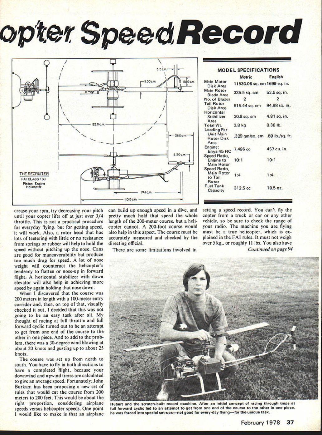 SettinganRC *4hiC U Hubert E Bitner Jr COURSE LAYOUT UPWIND FINISHUPWIND 200 METERS—I START --/K _ _ / ENTRY N/ /I ENTRY CORRIDOR~CORRIDOR \50 METER//5OMETER // 7yWDPILOT DOWNWINDHIGH 6OMETERDOWNWIND START \ LOW2O METERALTITUDEFINISH ALTITUDE / POLE APPROX 10HIGH 4 / TIMERS 0 REFERENCE INT APPROX 200 /iALLTIMESWERE EXITAND ENTRYRELAYED TO MASTER LINES FORISCREEN ALTITUDE JUDGE ROPES WERE USED FOR L-i REFERENCE LINES yPOLE Il / I/BY USING TWO POLES AND U10SOME ROPE THE ALT JUDGE UCOULD VISUALLY CHECK THE ALTITUDE JUDGE STATEDLBOUNDARIES OFTHE COURSE WHETHER OR NOT FLIGHT WAS OFFICIALHIS HEAD RESTED ON FIXED PLATFORM speed 343 mph may sound like much flying through traps ends 200-meter course fulfilling requirements proved considerable challenge BACK IN October 1976 attended meeting Manned Spacecraft Center Radio Control Club am mem ber meeting Lars Giertz announced would radio-controlled air craft speed trials held Ellington Air Force Base 17th month said no official speed record set helicopter date attention Without further encouragement made very effort trials After setting record lot easier breaking least thats what thought until got early Sun day morning am going good sport tell break lightning record 343 mph dont mean just show up fly probably will take some important facts brought attention will cover ar ticle such modifications ma chine course lay-out limitations equipment flying techniques tim ing procedure last least prepare dossier Having very little time get ready speed trials prevented build ing new machine proceeded some minor modifications scratchbuilt helicopter few major areas changes can create increased speed First rotor rpm very im portant Revolution Helibaby have very high rpm rotor blade reasons fast in36 Model Aviation oper Speed Record 9 0 THE RECRUITER FAI CLASS F3C Piston Engine Helicopter / / ItLW 80 cm / / 220cm / ~280cm 2 50cm Metric Man Motor Disk Area Main Rotor Blade Area No Blades Tail Rotor Disk Area Horizontal Stabilizer Area Total Wt 38 kg Loading Per Unit Main Rotor Disk Area Engine Enya45RC 7496cc Speed Ratio Engine 101 Main Rotor Speed Ratio Main Rotor 14 Tail Rotor Fuel Tank Capacity English 1153008 sq cm 1699 sq 3355 sq cm525 sq 2 61544 sqcm 9498 sq 308 sq cm 481 sq 838 lb 329 gm/sq cm 69 lbIsq ft 3125cc 457 cu 101 14 105 oz crease rpm try decreasing pitch until copter lifts off just over 3/4 throttle practical procedure everyday flying getting speed will work Also rotor head has lots teetering little no resistance springs rubber will help hold speed pitching up nose Cans good maneuverability produce too much drag speed lot nose weight will counteract helicopters tendency flatten nose-up forward flight horizontal stabilizer down elevator will also help achieving speed again holding nose down discovered course 200 meters length 100-meter entry corridor top visually checked out decided going easy task after thought racing full throttle full forward cyclic turned out attempt get end course other piece add prob lem 30-degree wind blowing about 20 knots gusting up about 25 knots course set up north south have fly both directions have completed flight because downwind upwind times calculated give average speed Fortunately John Burkam has proposing new set rules would cut course 200 meters 200 feet would about right proportion considering airplane speeds versus helicopter speeds point would like make airplane can build up enough speed dive pretty much hold speed whole length 200-meter course heli copter cannot 200-foot course would also help aspect course must accurately measured checked directing official some limitations involved setting speed record cant fly copter truck car other vehicle sure check range radio machine flying must true helicopter ex plained FAI rules must weigh over 5 kg roughly 11 lbs also have Continued page 94 February 1978 37 MODEL SPECIFICATIONS nc, s . d machine After initial concept racing through traps full forward cyclic led attempt get end course other piece forced special set-upsnot good everyday flyingfor unique task see local hobby dealer WI~E almost Stahl design40 years ago t~p tTA OGA 4 lOBts famous 24 1/2 WWdGSPAN 0% FOR PACKING AND POSTAGE VA NESIDENTS ADD 4% TAX RUBBER & CO2 WINNER AT THE 50th NATS Blot 221/2 WINGSPMI $695 Kioud King Ambivalent Dennyplane Miss Arpiem Brigadeer articles skeleton photo 85% Power house photo accompanying months column Depending model size four spruce spars ranging located approximately 30% 70% chord perpendicular other Fulldepth plywood dihedral joiners placed slotting ribs hacksaw stacks appropriate thickness epoxied flush spars Shear webs 1/16 balsa added grain running vertical alternating front rear spars picture illustrates front spars should always webbed rear set may also webbed model stunted weight factor Additional strength can gained D tube sheeting leading edge ever seems add spanwise strength torsional rigidity has stated times bears repeating wing will no stronger rigid after covered heat-shrink material uncovered wing seems flexible uncovered absolutely should covered shiny stuff full set shear webs still doesnt cure flexibility get out silk pre pared pick up pieces Consider four-spar shear-web tech nique next old-timer Dr D B Mathews 506 South Walnut Greens burg KS 67054 Foam/Evans/Lester continued page 35 will take care problem mean time core isnt too bad ways salvage will discussed next issue Sectioning hot-wire method cut ting has limitation cuts must straight line Wings taper angle either LE TE must cut sections glued together Follow same procedure *108 Spo&te 28 WING8PAN S6 INE MODELS 2820 DORR AVE FAIRFAX VA 22030 Send free brochure section described cutting wing panel tip template inboard section also root template outboard section additional section requires additional template tip section also necessary cut very long wings sections due limitations tension necessary keep wire straight power uniform heating wire Dihedral Angle Cutting sim plest ways cutting dihedral