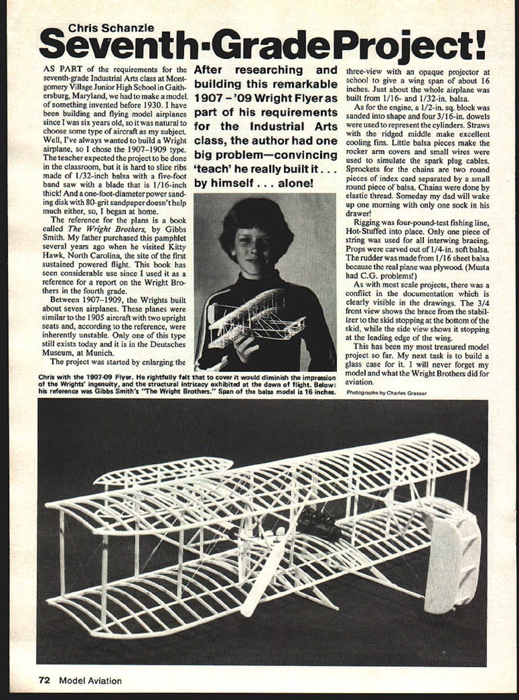 s Schanzle Seventh Grade Project AS PART requirements seventh-grade Industrial Arts class Mont gomery Village Junior High School Gaith ersburg Maryland make model something invented before 1930 have building flying model airplanes since six years old soit natural choose some type aircraft subject Well Ive always wanted build Wright airplane chose 19071909 type teacher expected project done classroom hard slice ribs made 1/32-inch balsa five-foot band saw blade 1/16-inch thick one-foot-diameter power sand ing disk 80-gut sandpaper doesnt help much either began home reference plans book called Wright Brothers Gibbs Smith father purchased pamphlet several years ago visited Kitty Hawk North Carolina site first sustained powered flight book has seen considerable use since used reference report Wright Bro thers fourth grade Between 19071909 Wrights built about seven airplanes planes similar 1905 aircraft two upright seats according reference inherently unstable Only type still exists today Deutsches Museum Munich project started enlarging After researching building remarkable 1907- 09 Wright Flyer part requirements Industrial Arts class author big problemconvincing teach really built it. himself. alone three-view opaque projector school give wing span about 16 inches Just about whole airplane built 1/16- 1/32-in balsa As engine 1/2-in sq block sanded shape four 3/16-in dowels used represent cylinders Straws ridged middle make excellent cooling fins Little balsa pieces make rocker arm covers small wires used simulate spark plug cables Sprockets chains two round pieces index card separated small round piece balsa Chains done elastic thread Someday dad will wake up morning sock drawer Rigging four-pound-test fishing line Hot-Stuffed place Only piece string used interwing bracing Props carved out 1/4-in soft balsa rudder made 1/16 sheet balsa because real plane plywood Musta CG problems As scale projects conflict documentation clearly visible drawings 3/4 front view shows brace stabil izer skid stopping bottom skid side view shows stopping leading edge wing has treasured model project far next task build glass case will never forget model what Wright Brothers did aviation Photographs Charles Grasser 72 Model Aviation Chris 190709 Flyer rightfully felt tnat cover gi woula asmmnish impression Wrights ingenuity end structural intricacy exhibited dawn flight Below reference Gibhs Smiths Wright Brothers Spen balsa model 16 inches