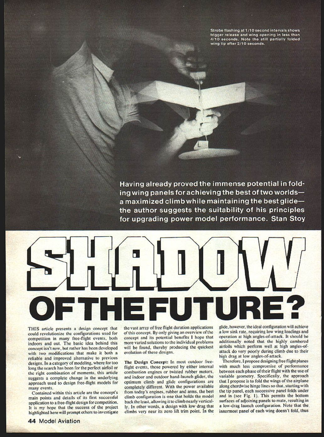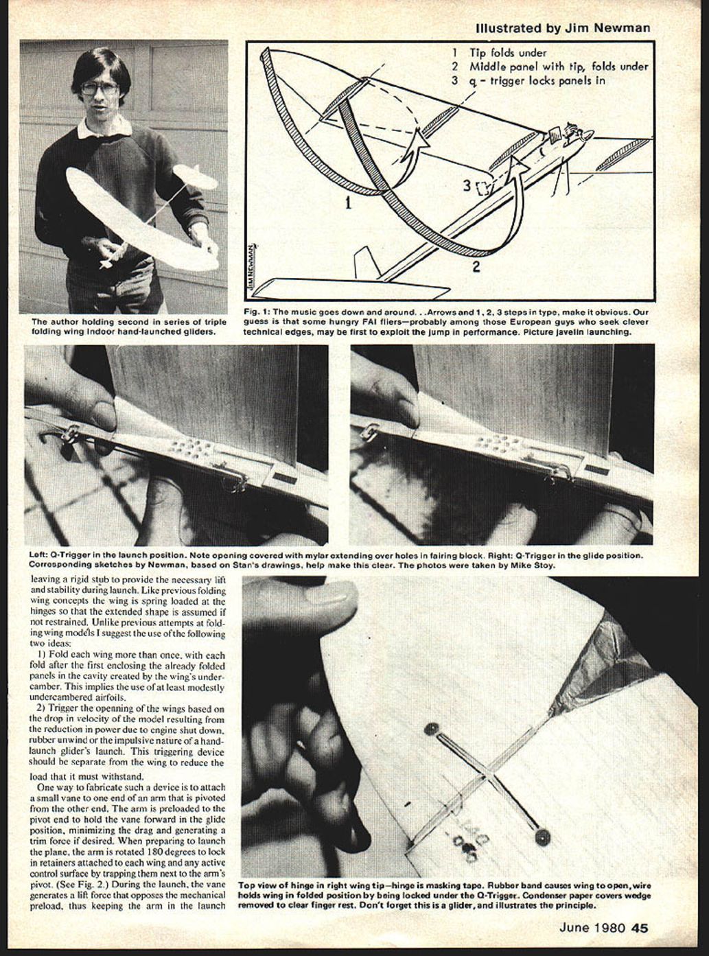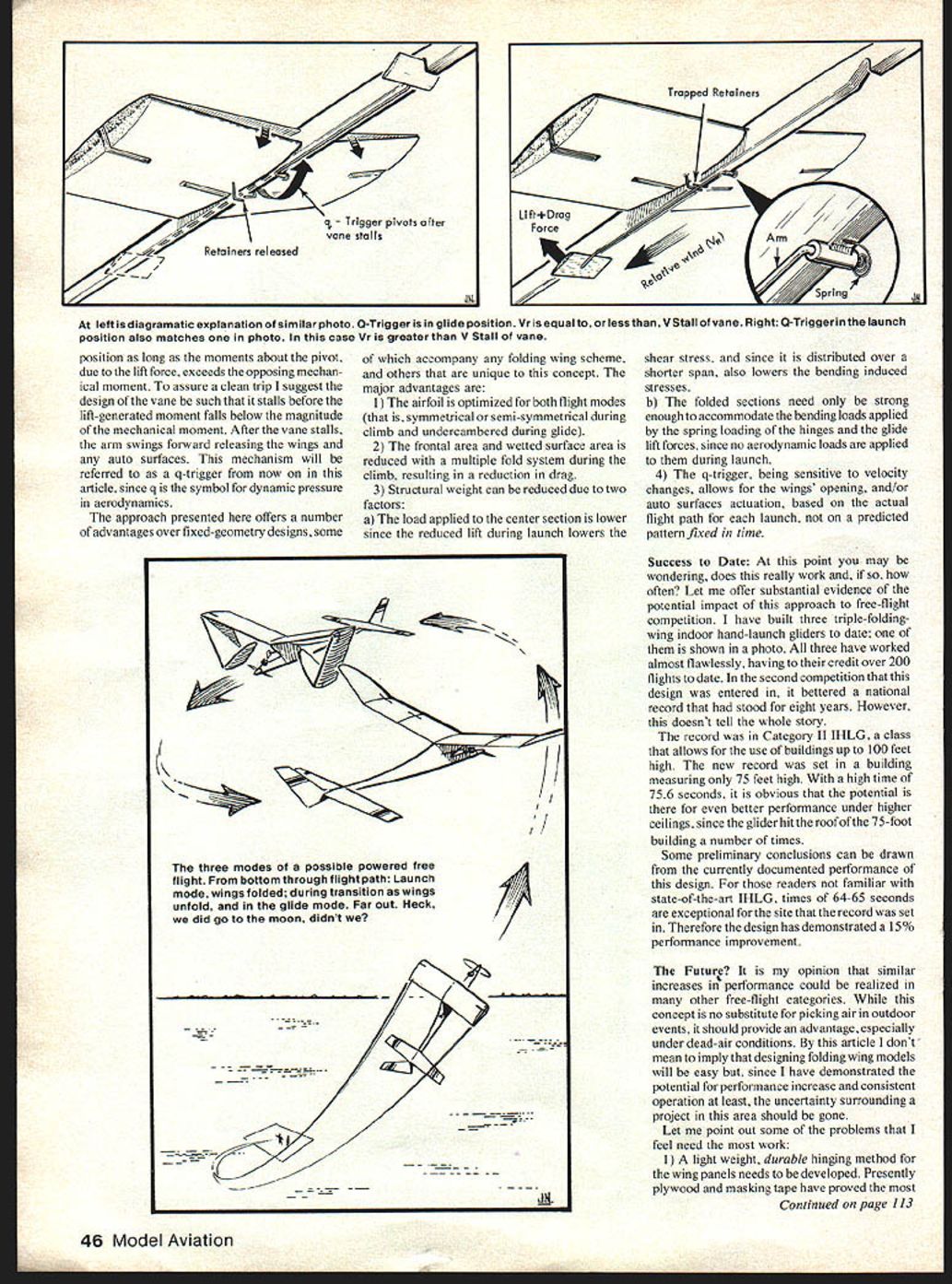 Tj9jjjjIIJJlj/ FYf7 OFTHE FUTURE THIS article presents design concept vast array free flight duration applications could revolutionize configurations used concept giving overview competition free-flight events both concept its potential benefits hope indoors out basic idea behind varied solutions individual problems concept isnt new rather has developed will found thereby producing quickest two modifications make both evolution designs reliable improved alternative previous designs category modeling too Design Concept outdoor freelong search has perfect airfoil flight events powered either internal right combination moments article combustion engines twisted rubber motors suggests complete change underlying indoor outdoor hand-launch glider approach used design free-flight models optimum climb glide configurations events completely different power available Contained within article concepts todays engines rubber arms best main points details its first successful climb configuration holds model application free-flight design competition back least allowing climb nearly vertical hope success project ly other words design low drag highlighted will prompt others investigate climbs very near its zero lift trim point glide however ideal configuration will achieve low sink rate requiring low wing loadings operation high angles-of-attack should additionally noted highly cambered airfoils perform well high angles-ofattack very poorly during climb due high drag low angles-of-attack Therefore propose designing free flight planes much less compromise performance between phase flight use variable geometry Specifically approach propose fold wings airplane along chordwise hinge lines starting tip panel successive panel folds under see Fig 1 permits bottom surfaces adjoining panels mate resulting low-drag launch configuration Note innermost panel wing doesnt fold thus 44 Model Aviation leaving rigid stub provide necessary lift stability during launch Like previous folding wing concepts wing spring loaded hinges extended shape assumed restrained Unlike previous attempts fold ing wing models suggest use ofthe following two ideas 1 Fold wing once fold after first enclosing already folded panels cavity created wings undercamber implies use least modestly undercambered airfoils 2 Trigger openning wings based drop velocity model resulting reduction power due engine shut down rubber unwind impulsive nature handlaunch gliders launch triggering device should separate wing reduce load must withstand way fabricate such device attach small vane end arm pivoted other end arm preloaded pivot end hold vane forward glide position minimizing drag generating trim force desired preparing launch plane arm rotated 180 degrees lock retainers attached wing active control surface trapping next arms pivot See Fig 2 During launch vane generates lift force opposes mechanical preload thus keeping arm launch Illustrated Jim Newman Fig 1 musicgoesdownandaround. Arrows 1 2 3 steps type make obvious guess some hungry FAI fliersprobably among European guys seek clever technical edges may first exploit jump performance Picture javelin launching June 1980 45 2 Middle panel tip folds under 3 q ger locks panels 42 ausnor noiaing secono series tripie folding wing Indoor hand-launched gliders Left U-Trigger launch position Note opening covered mylar extending over holes fairing block Right 0-Trigger glide position Corresponding sketches Newman based Stans drawings help make clear photos taken Mike Stoy Top view hinge right wing tiphinge masking tape Rubber band causes wing openwire holds wing folded position being locked under 0-Trigger Condenser paper covers wedge removed clear finger rest Dont forget glider illustrates principle left isdiagramatic explanation similar photo 0-Trigger glide position Vr equal lessthan V Stall vane Right 0-Triggerin launch position also matches photo case Vr greater V Stall vane position long moments about pivot due lift force exceeds opposing mechan ical moment assure clean trip suggest design vane such stalls before lift-generated moment falls below magnitude mechanical moment After vane stalls arm swings forward releasing wings auto surfaces mechanism will referred q-trigger now article since q symbol dynamic pressure aerodynamics approach presented offers number advantages over fixed-geometry designs some accompany folding wing scheme others unique concept major advantages 1 The airfoil optimized both flight modes symmetrical semi-symmetrical during climb undercambered during glide 2 The frontal area wetted surface area reduced multiple fold system during climb resulting reduction drag 3 Structural weight can reduced due two factors load applied center section lower since reduced lift during launch lowers shear stress since distributed over shorter span also lowers bending induced stresses b folded sections need strong enough accommodate bending loads applied spring loading hinges glide lift forces since no aerodynamic loads applied during launch 4 The q-trigger being sensitive velocity changes allows wings opening and/or auto surfaces actuation based actual flight path launch predicted pattern fixed time Success Date point may wondering does really work often Let offer substantial evidence potential impact approach free-flight competition have built three triple-foldingwing indoor hand-launch gliders date shown photo three have worked almost flawlessly having credit over 200 flights date second competition design entered bettered national record stood eight years However doesnt tell whole story record Category II IHLG class allows use buildings up 100 feet high new record set building measuring 75 feet high high time 756 seconds obvious potential better performance under higher ceilings since glider hit roof ofthe 75-foot building number times Some preliminary conclusions can drawn currently documented performance design readers familiar state-of-the-art IHLG times 64-65 seconds exceptional site record se