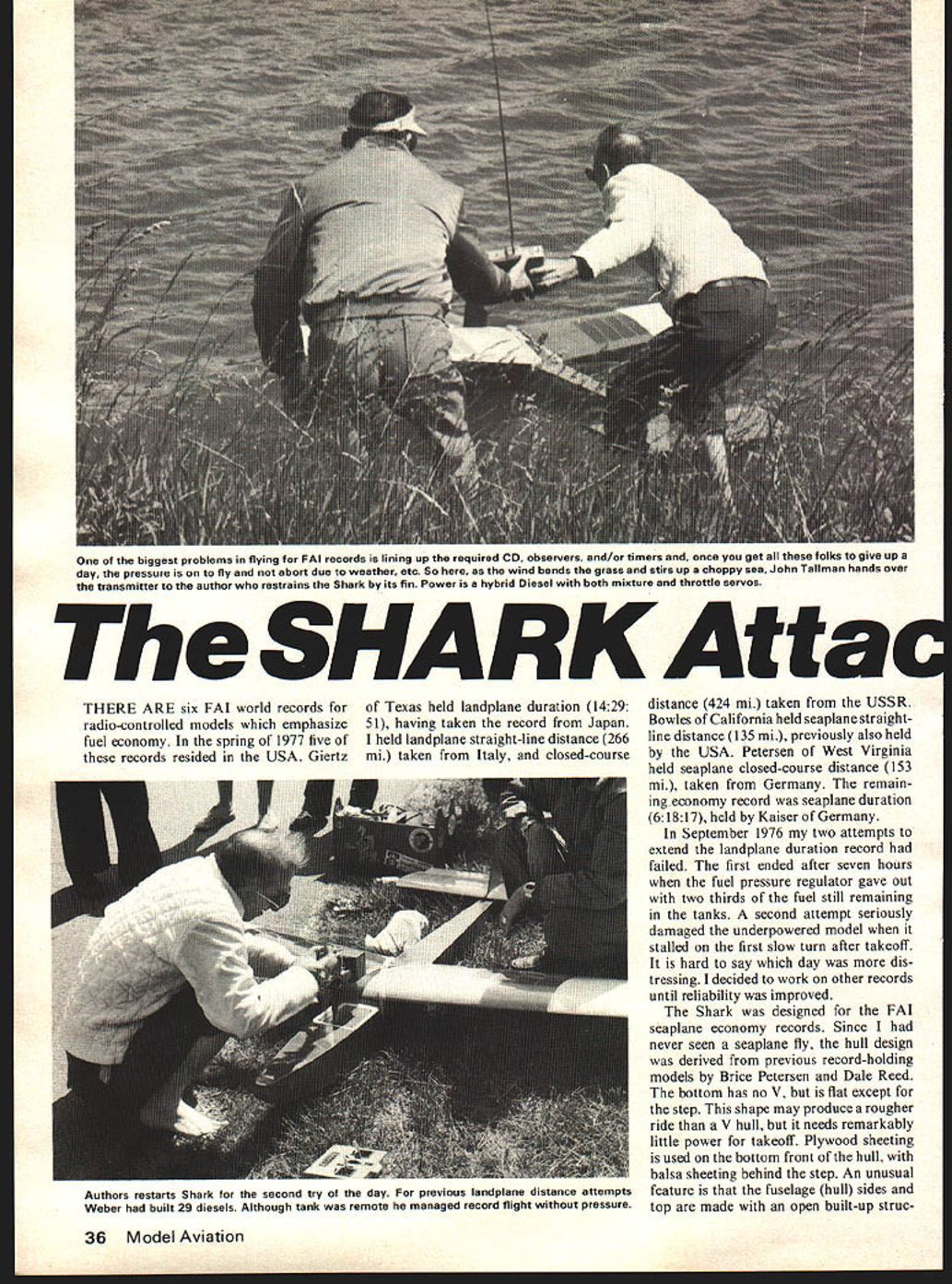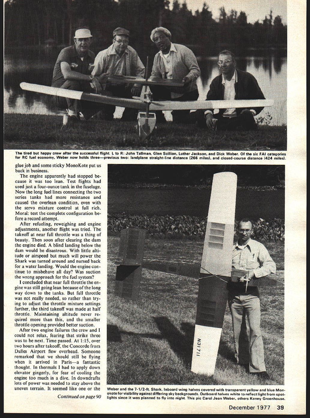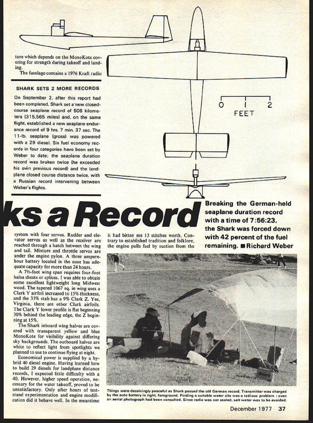THERE ARE six FAI world records radio-controlled models emphasize fuel economy spring 1977 five records resided USA Giertz Texas held landplane duration 1429 51 having taken record Japan held landplane straight-line distance 266 mi taken Italy closed-course Atta distance 424 mi n USSR Bowles California held seaplane straightline distance 135 mi iously also held USA Petersen West Virginia held seaplane closed-course distance 153 mi taken Germany remain ing economy record seaplane duration 61817 held Kaiser Germany September 1976 two attempts extend landplane duration record failed first ended after seven hours fuel pressure regulator gave out two thirds fuel still remaining tanks second attempt seriously damaged underpowered model stalled first slow turn after takeoff hard say day dis tressing decided work other records until reliability improved Shark designed FAI seaplane economy records Since never seen seaplane fly hull design derived previous record-holding models Brice Petersen Dale Reed bottom has no V flat except step shape may produce rougher ride V hull needs remarkably little power takeoff Plywood sheeting used bottom front hull balsa sheeting behind step An unusual feature fuselage hull sides top made open built-up struc biggest problems flying FAI records lining up required CD observers and/or timers once get folks give up day pressure fly abort due weather etc So wind bends grass stirs up choppy sea John Taliman hands over transmitter author restrains Shark its fin Power hybrid Diesel both mixture throttle servos SHARK Authors restarts Shark second try day previous landplane distance attempts Weber built 29 diesels Although tank remote managed record flight pressure 36 Model Aviation ture depends MonoKote cov ering strength during takeoff land ing fuselage contains 1976 Kraft radio SHARK SETS 2 MORE RECORDS September 2 after report completed Shark set anew closedcourse seaplane record 508 kilome ters 315565 miles same flight established new seaplane endur ance record 9 hrs 7 mm 37 sec 11-lb seaplane gross powered 29 diesel Six fuel economy rec ords four categories have set Weber date seaplane duration record broken twice exceeded ovn previous record landplane closed course distance twice Russian record intervening between Webers flights II 0 I FEET L/ 1 Breaking German-held seaplane duration record Record Shark forced down time 75623 system four servos Rudder ele vator servos well receiver reached through hatch between wing tail Mixture throttle servos under engine pylon three amperehour battery located nose has ade quate capacity 24 hours 7-foot wing span requires four-foot balsa sheets splices able obtain some excellent lightweight long Midwest wood tapered 1067 sq wing uses Clark Y airfoil increased 15% thickness 33% stab has 9% Clark Z Yes Virginia other Clark airfoils Clark Y lower profile flat beginning 30% behind leading edge Z begin ningat 15% Shark inboard wing halves cov ered transparent yellow blue MonoKote visibility against differing sky backgrounds outboard halves white reflect light spotlights planned use continue flying night Economical power supplied hy brid 40 diesel engine Having learned build 29 diesels landplane distance records expected little difficulty 40 However higher speed operation ne cessary water takeoff proved unsatisfactory Only after hours teststand experimentation engine modifi cation did behave well meantime bitten 13 stiwhes worth Con trary established tradition folklore engine pulls fuel suction 42 percent fuel December1977 37 2 remaining U Richard Weber Things deceivingly peaceful Shark passed old German record Transmitter charged auto battery right foreground Finding suitable water site tedious problem aerial photograph consulted Since radio sealed salt water avoided Although flat-bottomed hull gives rough ride takeoffs full load remarkably easy requiring surprisingly little power lift off wing airfoil Clark V increased 15% thickness stabilizer airfoil 9% Clark Z Two hours flight Concorde passed overhead Shark would still flying after jet reached Paris tanks located under Shark wing After Shark completed early year necessary choose seaplane record attempt first Two facts decisive Surpassing German duration record would produce econ omy record monopoly USA Also further duration experience should help later try landplane duration rec ord conceivable Shark could exceed landplane record Finding flying site proved un expected problem Because radio sealed compartment wanted avoid salt water Large freshwater lakes hard find Maryland Inquiries several RC fields hobby shops did uncover place seaplane models flown regularly beautiful four-acre farm pond found aerial photo graph farmer said no county policeman visiting flying field sug gested lake Bowie Md city fathers probably never seen radio-controlled model decided refuse permission Nearby rivers inaccessible banks low-flying aircraft too people Finally heard new lake Columbia Md ideal dura tion attempt June 3 dawned sunny cool windy official witnesses record tempt met about 830 am Lake Elkhorn Assisting CD Luther Jackson John Tallman Kenny Greenhouse PGRC Glenn Scillian DCRC Pre vious Shark test flights demonstrated Power Prop 11/6 could take ofT easily both empty carrying fourpound bottle water aboard engine completely reliable ticipated troublefree day After fueling up 84 fi oz weigh-in just under 11 pounds some photos digital watch es recorded start what expected long flight Thermal activity evident before 10 am times low throttle plus full down trim plus down pressure control stick necessary keep Shark sight again downdraft would demand full up trim much power stay above ground model high throttle cut back difficult hear engine During periods 50 minutes flight realized silence really meant engine stopped decision made land Shark ground would have wait wind blow ashore lake landing broke forward fuselage joint quick 38 Model Aviation Flying hours end much test pilots endurance aircraft Shi