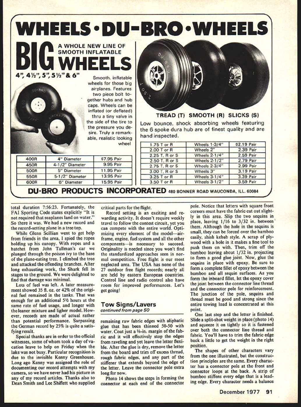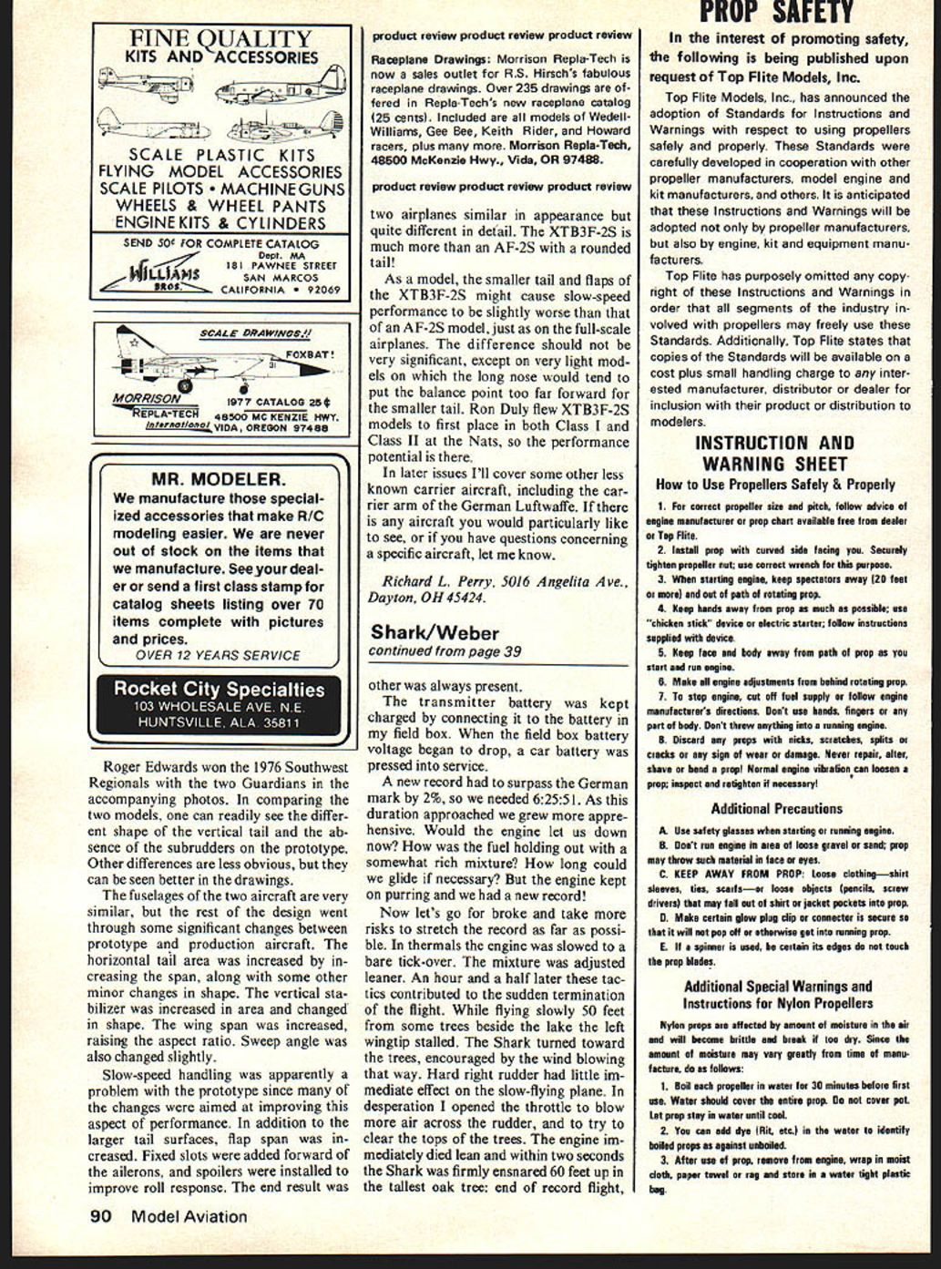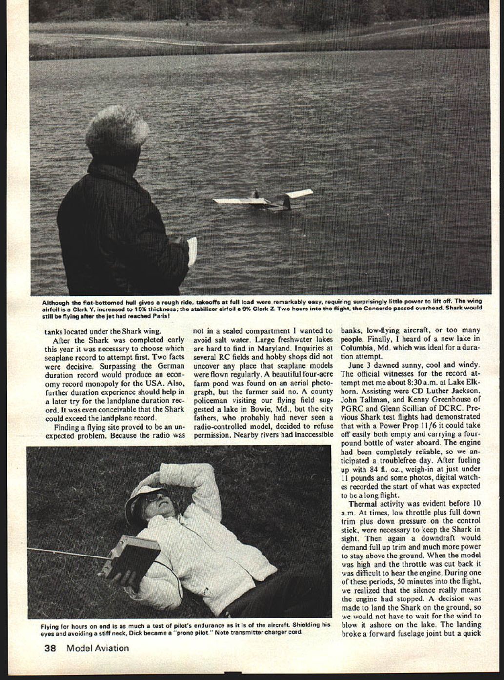 THERE ARE six FAI world records radio-controlled models emphasize fuel economy spring 1977 five records resided USA Giertz Texas held landplane duration 1429 51 having taken record Japan held landplane straight-line distance 266 mi taken Italy closed-course Atta distance 424 mi n USSR Bowles California held seaplane straightline distance 135 mi iously also held USA Petersen West Virginia held seaplane closed-course distance 153 mi taken Germany remain ing economy record seaplane duration 61817 held Kaiser Germany September 1976 two attempts extend landplane duration record failed first ended after seven hours fuel pressure regulator gave out two thirds fuel still remaining tanks second attempt seriously damaged underpowered model stalled first slow turn after takeoff hard say day dis tressing decided work other records until reliability improved Shark designed FAI seaplane economy records Since never seen seaplane fly hull design derived previous record-holding models Brice Petersen Dale Reed bottom has no V flat except step shape may produce rougher ride V hull needs remarkably little power takeoff Plywood sheeting used bottom front hull balsa sheeting behind step An unusual feature fuselage hull sides top made open built-up struc biggest problems flying FAI records lining up required CD observers and/or timers once get folks give up day pressure fly abort due weather etc So wind bends grass stirs up choppy sea John Taliman hands over transmitter author restrains Shark its fin Power hybrid Diesel both mixture throttle servos SHARK Authors restarts Shark second try day previous landplane distance attempts Weber built 29 diesels Although tank remote managed record flight pressure 36 Model Aviation ture depends MonoKote cov ering strength during takeoff land ing fuselage contains 1976 Kraft radio SHARK SETS 2 MORE RECORDS September 2 after report completed Shark set anew closedcourse seaplane record 508 kilome ters 315565 miles same flight established new seaplane endur ance record 9 hrs 7 mm 37 sec 11-lb seaplane gross powered 29 diesel Six fuel economy rec ords four categories have set Weber date seaplane duration record broken twice exceeded ovn previous record landplane closed course distance twice Russian record intervening between Webers flights II 0 I FEET L/ 1 Breaking German-held seaplane duration record Record Shark forced down time 75623 system four servos Rudder ele vator servos well receiver reached through hatch between wing tail Mixture throttle servos under engine pylon three amperehour battery located nose has ade quate capacity 24 hours 7-foot wing span requires four-foot balsa sheets splices able obtain some excellent lightweight long Midwest wood tapered 1067 sq wing uses Clark Y airfoil increased 15% thickness 33% stab has 9% Clark Z Yes Virginia other Clark airfoils Clark Y lower profile flat beginning 30% behind leading edge Z begin ningat 15% Shark inboard wing halves cov ered transparent yellow blue MonoKote visibility against differing sky backgrounds outboard halves white reflect light spotlights planned use continue flying night Economical power supplied hy brid 40 diesel engine Having learned build 29 diesels landplane distance records expected little difficulty 40 However higher speed operation ne cessary water takeoff proved unsatisfactory Only after hours teststand experimentation engine modifi cation did behave well meantime bitten 13 stiwhes worth Con trary established tradition folklore engine pulls fuel suction 42 percent fuel December1977 37 2 remaining U Richard Weber Things deceivingly peaceful Shark passed old German record Transmitter charged auto battery right foreground Finding suitable water site tedious problem aerial photograph consulted Since radio sealed salt water avoided Although flat-bottomed hull gives rough ride takeoffs full load remarkably easy requiring surprisingly little power lift off wing airfoil Clark V increased 15% thickness stabilizer airfoil 9% Clark Z Two hours flight Concorde passed overhead Shark would still flying after jet reached Paris tanks located under Shark wing After Shark completed early year necessary choose seaplane record attempt first Two facts decisive Surpassing German duration record would produce econ omy record monopoly USA Also further duration experience should help later try landplane duration rec ord conceivable Shark could exceed landplane record Finding flying site proved un expected problem Because radio sealed compartment wanted avoid salt water Large freshwater lakes hard find Maryland Inquiries several RC fields hobby shops did uncover place seaplane models flown regularly beautiful four-acre farm pond found aerial photo graph farmer said no county policeman visiting flying field sug gested lake Bowie Md city fathers probably never seen radio-controlled model decided refuse permission Nearby rivers inaccessible banks low-flying aircraft too people Finally heard new lake Columbia Md ideal dura tion attempt June 3 dawned sunny cool windy official witnesses record tempt met about 830 am Lake Elkhorn Assisting CD Luther Jackson John Tallman Kenny Greenhouse PGRC Glenn Scillian DCRC Pre vious Shark test flights demonstrated Power Prop 11/6 could take ofT easily both empty carrying fourpound bottle water aboard engine completely reliable ticipated troublefree day After fueling up 84 fi oz weigh-in just under 11 pounds some photos digital watch es recorded start what expected long flight Thermal activity evident before 10 am times low throttle plus full down trim plus down pressure control stick necessary keep Shark sight again downdraft would demand full up trim much power stay above ground model high throttle cut back difficult hear engine During periods 50 minutes flight realized silence really meant engine stopped decision made land Shark ground would have wait wind blow ashore lake landing broke forward fuselage joint quick 38 Model Aviation Flying hours end much test pilots endurance aircraft Shi