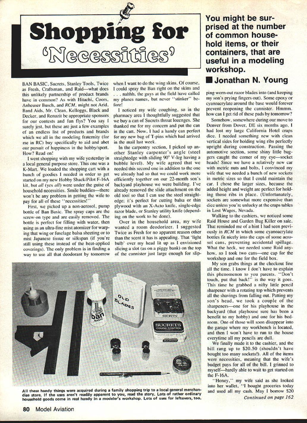 6~9 Shopping U might sur prised number common house hold items containers useful modeling workshop BAN BASIC Sucrets Stanley Tools Twice Fresh Craftsman Raidwhat does unlikely partnership product brands have common As Hitachi Coors Anheuser Busch RCM might Arid Band Aids Mr Clean Kelloggs Black Decker Renuzit appropriate sponsors contests fun flys say surely jest just few examples endless list products brands modeling fraternity RC buy specifically aid abet pursuit happiness hobby/sport Read went shopping wife yesterday local general purpose store K-Mart loaded shopping cart bunch goodies needed order get started new Hobby Shack/Pilot F-16A kit yes under guise household necessities Smile buddiesthere wont problem getting wife pay necessities First picked up non-aerosol pump bottle Ban Basic spray caps screw-on type easily removed bottle perfect filling water using ultra-fine mist atomizer warp ing wing fuselage balsa sheeting mist Japanese tissue silkspan youre still using instead heat-applied coverings problem finding way use deodorant tomorrow want wing skins course could spray Ban right skins nahhh guys field have called planes names never stinker fore noticed wife coughing pharmacy area thoughtfully suggested buy can Sucrets throat lozenges thanked concern put can cart Now handy can perfect new bag T-pins arrived mail last week carpentry section 1 picked up other Stanley carpenters angle steel straightedge sliding 900 V-leg having bubble level wife agreed needed second addition already could work efficiently together 22-month sons backyard playhouse building Ive already removed slide attachment old tool can use steel straight edge its perfect cutting balsa thin plywood X-Acto knife single-edge razor blade Stanley utility knife depend ing work done Over household area wife wanted room deodorizer suggested Twice Fresh no apparent reason other scent has appealing light bulb over head lit up envisioned slicing slot piggy bank top cannister just large enough slipU Jonathan N Young ping worn-out razor blades keeping sons prying fingers out Some epoxy cyanoacrylate around base would forever prevent reopening cannister Hmmm can get rid pads tomorrow Somehow somewhere during move Denver Dover DE six months ago lost large California Hotel craps dice needed something new clean vertical sides holding wing ribs perfectly upright during construction Passing automotive section some shiny little bug gers caught corner eyesocket heads Since have relatively new car metric nuts bolts convinced wife needed bunch new sockets metric sizes could maintain car chose larger sizes because added height weight perfect hold ing ribs place Unfortunately sockets somewhat expensive dice unless youre unlucky craps tables Lost Wages Nevada Walking cashiers noticed some Raid House Garden Bug Killer sale reminded hint seen previ ously RCM some cyanoacrylate bottles fit nicely caps some aero sol cans preventing accidental spillage What heck needed some Raid took two cansone cap workshop field box son grabs things checkout line time know dont have explain phenomenon parents Dont touch put back way goes time grabbed nifty little pencil sharpener rotating top prevents shavings falling out Patting sons head took couple sharpenersone playhouse backyard playhouse sure has benefit hobby bed room will soon disappear garage workbench located wont have run house everytime pencils dull finally made cashier bill rang up $2050 shouldnt have bought too sockets items necessities meaning wifes budget pays bill grinned myselfhardly able wait get started F-16A Honey wife said looked wallet bought groceries today used cash May borrow $20 Continued page 162 80 Model Aviation handy things acquired during family shopping trip local general merchan dise store uses arent readily apparent read story Lots rather ordinary household goods come real handy modelers workshop Lots uses leftovers too fiwnddO PROPELLERS Made 0 yeste bo color Go GRiSH No 1 propeller True helical pitch airfoil win-power 2 Blade Tractor 53each 54535~4Soc 6364SOc 747678SOc 848688Nc 9-4969-7 9810410-6SOc 11411-611881 12412512-61U 2 Blade Pusher 5 3 5-4 6364Oc 86SOc 98106*1 3 BladeTractor 53 6364 3 BladePusher 63SOc Sizes pitches styles needs AT YOUR DEALER / Blade Metallic Aluminum color Tractor76i 8668iZ 96 106104iSO Pusher106 1U substituting sheet built-up structures Beef-up built-ups' policy universal use dethermalizers has led necessity strengthening wing structures models seems land ing shock negative load anyone planned pre-DT days popular solutions problem adding spars upper surface wing usually three evenly-spaced strips /x-in deep needed equally-spaced first 30% chord Hmm things look awful lot like torbulaiors devices disturb airflow ever slightly effect increase lift multi-spars called de signers also help maintain airfoil shape reducing covering sag between ribs question comes up fairly often skull sessions does modi fication violate modification rule no question turbulators improve lift Some time ago Ive lost issue National Free Flight Society pub lished paper Symposium report effective placement turbulator cords upper surface Nordic glider wings author advocated trimming glider perfectly straight hand-glide dead-calm conditions preferably gymnasium Once achieved turhulator cord taped place wing other remaining unturbulated model hand glided observed turning ten dency turbulated wing would rise its additional lift causing model turn toward unturbulated wing cord position relocated test re peated final proper location turbulator determined position generating turn As further evidence affects multispars once Starduster 900 mediocre glide No amount trimming seemed increase glide performance GRISH LARGE WOOD PROPELLERS HARDWOOD too hard minimizes Thance costly plane engine damage True pitch airfoil fully finished balanced ready coating 3/B BOREALL SIZES IN18 57 6810 12 PITCH 20B 22 10 24 13 IN 8&1OPITCH 26 $16 inUBROS 0 ST JOHN INDIANA 46373 Out desperation removed co