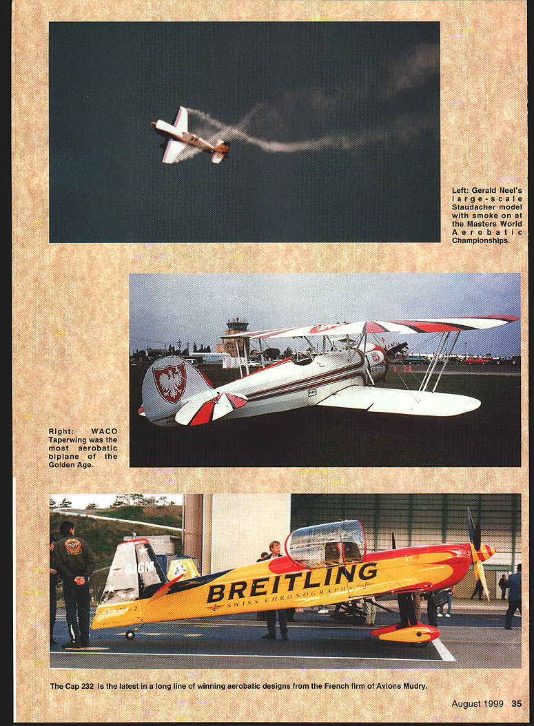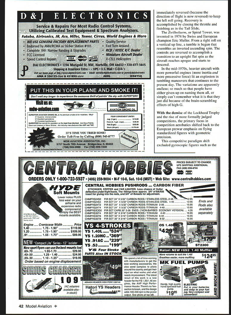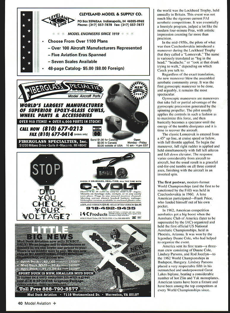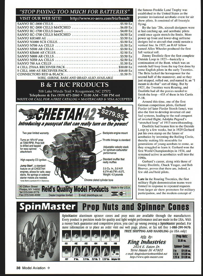 NO OCR TEXT ________ L Right WACO Taperwing aerobatic biplane Golden Age NO OCR TEXT flying lessons Home airborne hobos generally bindle spread under wing night living wherever could hustle up enough marks raise food gas money Aerobatics came along ride sort shill arrival over selected town standard gimmick flying gypsies would series loops rolls spins draw crowd worked well sometimes point onlookers shooed whatever passed runway Unfortunately crowds attracted stunts didnt always buy airplane rides Barnstorming daring romantic showy lot safer flying mail routes hardly economic success under dew-covered wing ground gets hard after gypsy pilots simply decided settle down set up shop spot providing air service single communitywhich term FBO came Fixed-Base Operator An independent few persevered still looking easy way make hard living flying airplanes Flying circuses answer beginning barnstorming mostly team occupation simply because nearly impossible person flying work crowd collect money simultaneously flying gypsies simply began banding together larger groups gypsies traditionally have done first traveling air shows appeared complete front men tickets other dodges borrowed another uniquely American institution roadshow carnival new shows rides lessons no longer main attraction public proved willing pay scary thrilling experience flight spectators participants call spectacular deering-do nearly impossible deadly stunt appeared better new era display aerobatics hand Wing-walking air-to-air transfers parachutists window dressing aerobatics stock-in-trade early air shows New maneuvers began appearing almost weekly pilots competed reputations bigger share public wallet Point Hesitation Rolls first big fat fuselages gave underpowered biplanes day good knife-edge performance Compound maneuvers such Avalanche followed rapidly quest reputations bigger paydays can top atmosphere led quickly establishment actual acrobatic competitions private cups trophies aerobatics established middle 1920s mid-1920s debris war given way measure prosperity Europe along air racing aerobatics again becoming popular aeronautical diversion American-style airshows wellattended European talent structure bureaucratic order soon asserted itself elaborate competition framework established including formal maneuver schedules methods scoring judging standardsleading first effort aerobatic World Championships held Paris 1934 America still land creatively free rigorous European approach slow catch 1932 Does Club Have Flying Site Success Story Model Aviation wants hear about Finding keeping flying sites paramount issue facing Academy its members today Just stories clubs losing flying sites being unable find flying fields success stories abound well vital success stories shared others may lea apply sound methods findiAg keeping flying sites club can assist others similar situations submitting article Model Aviation meets guidelines listed below Text should exceed 1500 words Electronic text should submitted WordPerfect 61 format ASCII file hard copy text should always accompany disk Photos should number no dozen photos should complement illustrate text Please include captions separate page writing back photo may cause bleeding see through problems specific Explain steps club took acquire flying site prevent loss existing field Note government agencies contacted process involved Send article Model Aviation 5151 E Memorial Dr Muncie IN 47302 ATTN Director Publications submissions subject review prior acceptance Payment made upon acceptance Article submissions will returned stamped self-addressed envelope included information contact Model Aviations Director Publications Executive Editor 765 287-1256 extensions 220 225 E-mail rkurek@modelaircraftorg jhaught@ modelaircraftorg st 1999 37 X1NIJ1L Cd SANYO RC-2000 CELLS MATCHED$600 Ea SANYO RC-1700 CELLS new$400 Ea SANYO RC-1700 CELLS MATCHED$450 Ea SANYO KR1400 AE$350 Ea SANYO N1000 SCR CELLS$350 Ea SANYO N700 AA CELLS$150 Ea SANYO N500 AR CELLS$350 Ea SANYO KR600 AE CELLS$250 Ea SANYO N800 AR CELLS$350 Ea SANYO N350 AA CELLS$250 Ea SANYO 700 AA CELLS$150 Ea 4 CELL 270AA RECEiVER PACK$1000 Ea 5 CELL 1000 AE RECEIVER PACK$1800 Ea CONNECTORS RED & BLACK$150 Pr WIRE SHRINK BARS AND BRAID ALSO AVAILABLE famous Freddie Lund Trophy established United States premier invitational aerobatic event air show pilots consisted freestyle flying late 20s aircraft designers last catching up aerobatic pilots could once again stretch limits power up front lower-drag airframe designs led aircraft could sustain vertical line 1927 RAF fellow named Allen Wheeler produced first full vertical roll Jimmy Doolittle flew first complete Outside Loop 1927basically continuation Bunt outside half-loop top first done some English pilots early Twenties Brits lacked horsepower second half maneuver just stopped rolled out named meant sort thing 1927 Twenties Roaring Doolittle ponies needed finish loop435 Curtis P-lB Around time first German competition pilots Gerhard Fiesler later Fiesler Storch fame also first develop inverted oil fuel systems leading real conquest inverted flight Adolphe Pegouds stretched loop 1913 notwithstanding Doolittle beaten him Outside Loop few weeks 1929 Gerhard put own stamp future aerobatics inventing Rolling Circle thereby making life miserable generations young aerobats come struggled learn Gerhard won first World Championships 1934 remained active aerobatics well 1990s Gerhards career along Jimmy Doolittle Chuck Yeager Bob Hoover proves indeed few old bold pilots Late Roaring Twenties first military flight demonstration teams formed response repeated requests larger air show promoters military participation modern concept 38 Model Aviation 4ETAH42 Inifodif cngapssycaf I, ciIin powed SpinMaster aluminum spinner cones prop nuts available through manufacturer product precision made quality light weight performance made USA money back guarantee competitive prices cant go wrong owning SpinMaster