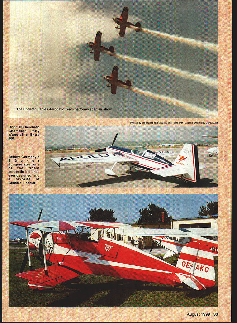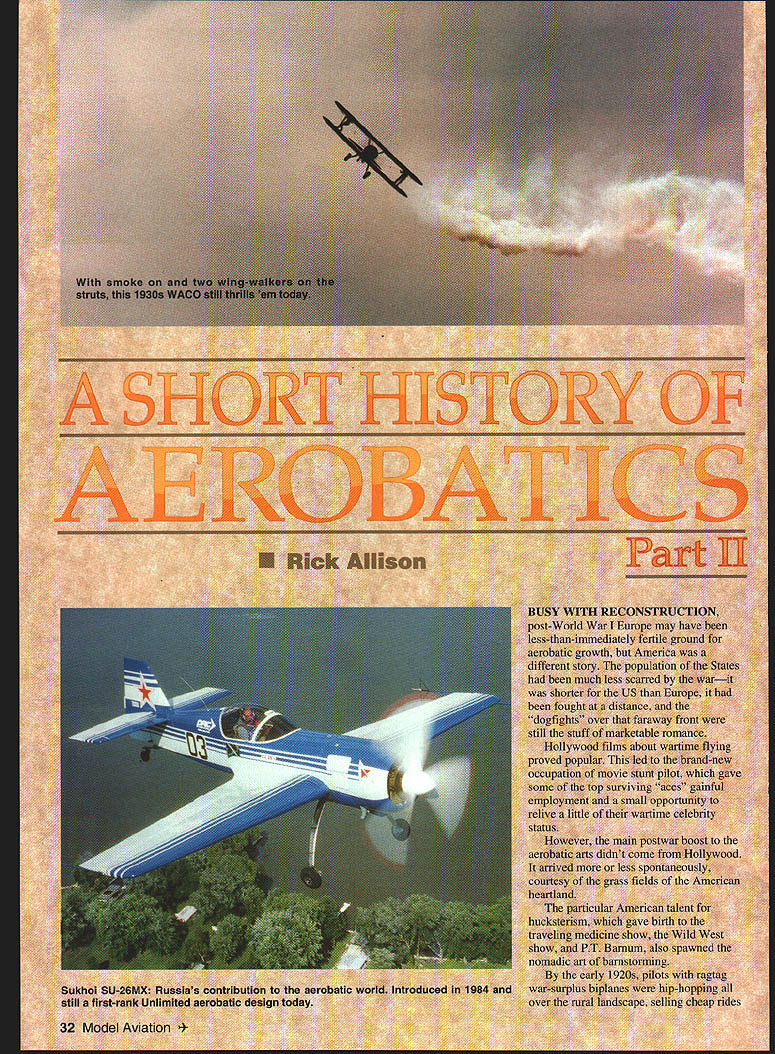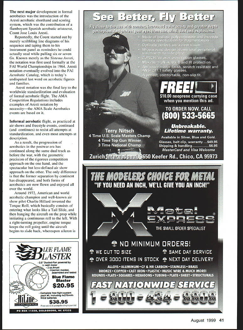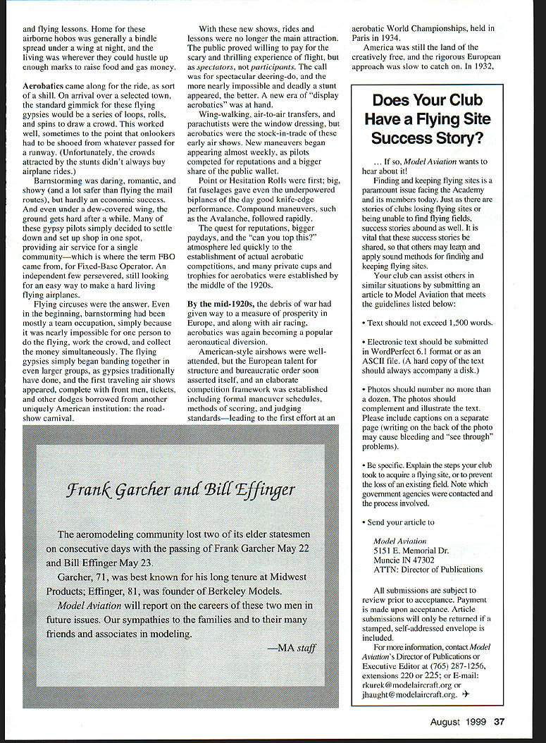 NO OCR TEXT ________ L Right WACO Taperwing aerobatic biplane Golden Age NO OCR TEXT flying lessons Home airborne hobos generally bindle spread under wing night living wherever could hustle up enough marks raise food gas money Aerobatics came along ride sort shill arrival over selected town standard gimmick flying gypsies would series loops rolls spins draw crowd worked well sometimes point onlookers shooed whatever passed runway Unfortunately crowds attracted stunts didnt always buy airplane rides Barnstorming daring romantic showy lot safer flying mail routes hardly economic success under dew-covered wing ground gets hard after gypsy pilots simply decided settle down set up shop spot providing air service single communitywhich term FBO came Fixed-Base Operator An independent few persevered still looking easy way make hard living flying airplanes Flying circuses answer beginning barnstorming mostly team occupation simply because nearly impossible person flying work crowd collect money simultaneously flying gypsies simply began banding together larger groups gypsies traditionally have done first traveling air shows appeared complete front men tickets other dodges borrowed another uniquely American institution roadshow carnival new shows rides lessons no longer main attraction public proved willing pay scary thrilling experience flight spectators participants call spectacular deering-do nearly impossible deadly stunt appeared better new era display aerobatics hand Wing-walking air-to-air transfers parachutists window dressing aerobatics stock-in-trade early air shows New maneuvers began appearing almost weekly pilots competed reputations bigger share public wallet Point Hesitation Rolls first big fat fuselages gave underpowered biplanes day good knife-edge performance Compound maneuvers such Avalanche followed rapidly quest reputations bigger paydays can top atmosphere led quickly establishment actual acrobatic competitions private cups trophies aerobatics established middle 1920s mid-1920s debris war given way measure prosperity Europe along air racing aerobatics again becoming popular aeronautical diversion American-style airshows wellattended European talent structure bureaucratic order soon asserted itself elaborate competition framework established including formal maneuver schedules methods scoring judging standardsleading first effort aerobatic World Championships held Paris 1934 America still land creatively free rigorous European approach slow catch 1932 Does Club Have Flying Site Success Story Model Aviation wants hear about Finding keeping flying sites paramount issue facing Academy its members today Just stories clubs losing flying sites being unable find flying fields success stories abound well vital success stories shared others may lea apply sound methods findiAg keeping flying sites club can assist others similar situations submitting article Model Aviation meets guidelines listed below Text should exceed 1500 words Electronic text should submitted WordPerfect 61 format ASCII file hard copy text should always accompany disk Photos should number no dozen photos should complement illustrate text Please include captions separate page writing back photo may cause bleeding see through problems specific Explain steps club took acquire flying site prevent loss existing field Note government agencies contacted process involved Send article Model Aviation 5151 E Memorial Dr Muncie IN 47302 ATTN Director Publications submissions subject review prior acceptance Payment made upon acceptance Article submissions will returned stamped self-addressed envelope included information contact Model Aviations Director Publications Executive Editor 765 287-1256 extensions 220 225 E-mail rkurek@modelaircraftorg jhaught@ modelaircraftorg st 1999 37 X1NIJ1L Cd SANYO RC-2000 CELLS MATCHED$600 Ea SANYO RC-1700 CELLS new$400 Ea SANYO RC-1700 CELLS MATCHED$450 Ea SANYO KR1400 AE$350 Ea SANYO N1000 SCR CELLS$350 Ea SANYO N700 AA CELLS$150 Ea SANYO N500 AR CELLS$350 Ea SANYO KR600 AE CELLS$250 Ea SANYO N800 AR CELLS$350 Ea SANYO N350 AA CELLS$250 Ea SANYO 700 AA CELLS$150 Ea 4 CELL 270AA RECEiVER PACK$1000 Ea 5 CELL 1000 AE RECEIVER PACK$1800 Ea CONNECTORS RED & BLACK$150 Pr WIRE SHRINK BARS AND BRAID ALSO AVAILABLE famous Freddie Lund Trophy established United States premier invitational aerobatic event air show pilots consisted freestyle flying late 20s aircraft designers last catching up aerobatic pilots could once again stretch limits power up front lower-drag airframe designs led aircraft could sustain vertical line 1927 RAF fellow named Allen Wheeler produced first full vertical roll Jimmy Doolittle flew first complete Outside Loop 1927basically continuation Bunt outside half-loop top first done some English pilots early Twenties Brits lacked horsepower second half maneuver just stopped rolled out named meant sort thing 1927 Twenties Roaring Doolittle ponies needed finish loop435 Curtis P-lB Around time first German competition pilots Gerhard Fiesler later Fiesler Storch fame also first develop inverted oil fuel systems leading real conquest inverted flight Adolphe Pegouds stretched loop 1913 notwithstanding Doolittle beaten him Outside Loop few weeks 1929 Gerhard put own stamp future aerobatics inventing Rolling Circle thereby making life miserable generations young aerobats come struggled learn Gerhard won first World Championships 1934 remained active aerobatics well 1990s Gerhards career along Jimmy Doolittle Chuck Yeager Bob Hoover proves indeed few old bold pilots Late Roaring Twenties first military flight demonstration teams formed response repeated requests larger air show promoters military participation modern concept 38 Model Aviation 4ETAH42 Inifodif cngapssycaf I, ciIin powed SpinMaster aluminum spinner cones prop nuts available through manufacturer product precision made quality light weight performance made USA money back guarantee competitive prices cant go wrong owning SpinMaster