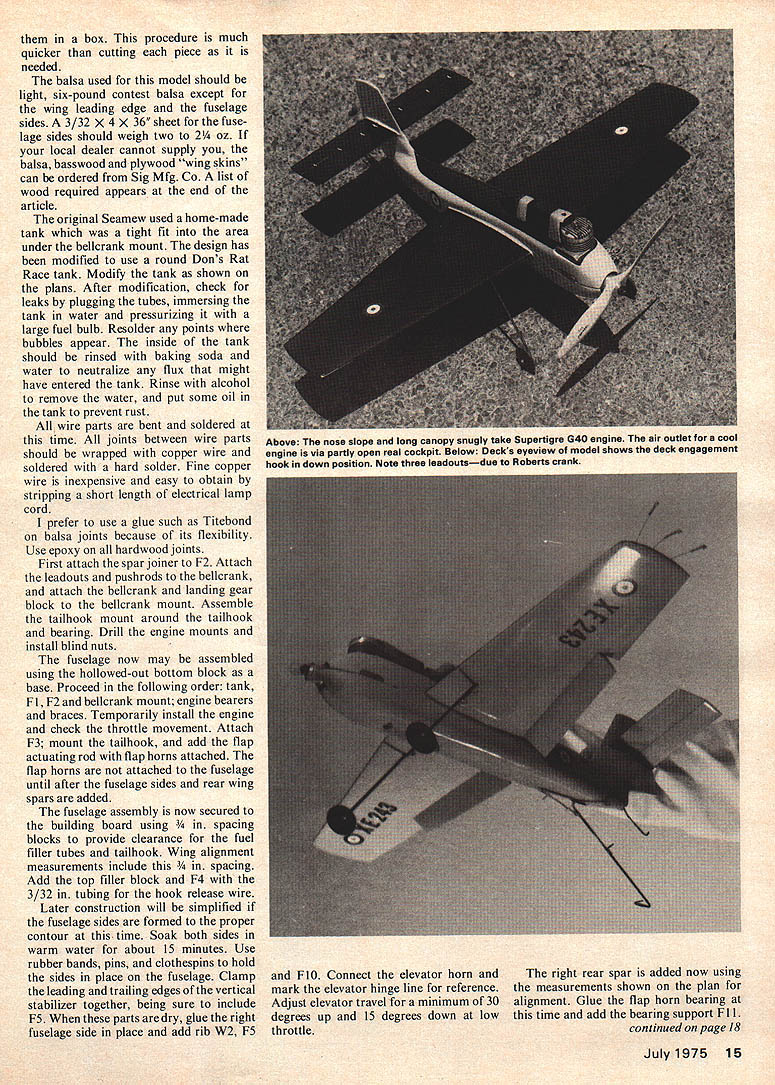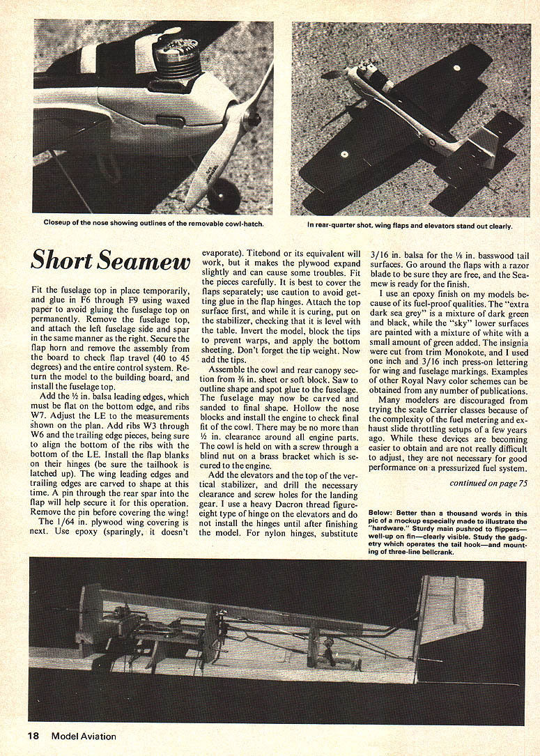 Scaled one-half inch foot generous wing affords 140 sq area about ideal Class Carrier jobs have wing flaps Short Seamew Much overlooked British Naval aircraft offers unique features distinctive performance Class Navy Carrier event powered Supertigre G40 engine Richard L Perry ONE OF THE MOST enjoyable aspects scale Navy Carrier events looking suitable subjects model few years ago search carrier-based aircraft turned up Short Seamew appeared good prospect Carrier event feature appealed Seamew unusual shape forward fuselage allows semicowled rat racer type engine stallation minimum frontal area Seamew manufactured Short Brothers Harland Ltd British Royal Navy first prototype flew August 1953 followed produc tion versions modified slightly original configuration pro duction Seamews slightly di hedral leading edge slots improve aileron control vented fillet horizontal stabilizer improve elevator rudder effectiveness Seamew presented first prototype flew radome wing elevator slots model scaled approximately half inch foot scale selected give gross wing area 140 square inches consider optimum size Class models flaps fuselage width increased five percent fit around Supertigre G40 engine plan use smaller engine wider fuselage recommended provide room Roberts bellcrank Other deviations exact scale clude dihedral production aircraft 2Y2 degrees dihedral outboard wing folding hinge washout three degrees greatly reduces effect Pictures three-views first proto type show less dihedral wing can built upper surface essentially flat easily comply rule require ments Exact procedures described later navigators canopy partially open provide outlet engine cool ing air area around engine shaft cut away within one-quarter inch allowed provide engine cooling take air scale Carrier classes handi capped somewhat because very few suitable kits marketparticu larly Class I think adds variety event does mean building scratch plans almost man datory really problem anyone good background build ing kit airplanes can seem like formidable obstacle someone hasnt tried reason have tried write article much like set structions might find kit have tried cover potential problem areas detail make Seamew painless first effort Seamew good competition air plane handles well wind quite stable flaps up down High speed performance will vary engine used therefore no point making claims area Low speed times over 75 seconds less 24mph easy Seamew capable competing quite successfully local contests good RC 40 first step construction job become thoroughly familiar plans construction sequence After getting good mental picture parts needed relation another sit down make kit Cut out parts mark felt-tip pen put 14 Model Aviation box procedure much quicker cutting piece needed balsa used model should light six-pound contest balsa except wing leading edge fuselage sides 3/32 x 4 x 36 sheet fuse lage sides should weigh two 2 oz local dealer cannot supply balsa basswood plywood wing skins can ordered Sig Mfg Co list wood required appears end article original Seamew used home-made tank tight fit area under bellcrank mount design has modified use round Dons Rat Race tank Modify tank shown plans After modification check leaks plugging tubes immersing tank water pressurizing large fuel bulb Resolder points bubbles appear inside tank should rinsed baking soda water neutralize flux might have entered tank Rinse alcohol remove water put some oil tank prevent rust wire parts bent soldered time joints between wire parts should wrapped copper wire soldered hard solder Fine copper wire inexpensive easy obtain stripping short length electrical lamp cord prefer use glue such Titebond balsa joints because its flexibility Use epoxy hardwood joints First attach spar joiner F2 Attach leadouts pushrods bellcrank attach bellcrank landing gear block bellcrank mount Assemble tailhook mount around tailhook bearing Drill engine mounts install blind nuts fuselage now may assembled using hollowed-out bottom block base Proceed following order tank F F2 bellcrank mount engine bearers braces Temporarily install engine check throttle movement Attach F3 mount tailhook add flap actuating rod flap horns attached flap horns attached fuselage until after fuselage sides rear wing spars added fuselage assembly now secured building board using ing blocks provide clearance fuel filler tubes tailhook Wing alignment measurements include ing Add top filler block F4 3/32 tubing hook release wire Later construction will simplified fuselage sides formed proper contour time Soak both sides warm water about 15 minutes Use rubber bands pins clothespins hold sides place fuselage Clamp leading trailing edges vertical stabilizer together being sure include F5 parts dry glue right fuselage side place add rib W2 F5 FIO Connect elevator horn andThe right rear spar added now using mark elevator hinge line referencethe measurements shown plan Adjust elevator travel minimum 30alignment Glue flap horn bearing degrees up 15 degrees down lowthis time add bearing support F 11 throttlecontinued page 18 July1975 15 Above nose slope long canopy snugly take Supertigre G40 engine air outlet cool engine via partly open real cockpit Below Decks eyeview model shows deck engagement hook down position Note three leadoutsdue Roberts crank Fit fuselage top place temporarily glue F6 through F9 using waxed paper avoid gluing fuselage top permanently Remove fuselage top attach left fuselage side spar same manner right Secure flap horn remove assembly board check flap travel 40 45 degrees entire control system Re turn model building board install fuselage top Add /z balsa leading edges must flat bottom edge ribs W7 Adjust LE measurements shown plan Add ribs W3 through W6 trailing edge pieces being sure align bottom ribs bottom LE Install flap blanks hinges sure tailhook latched up wing leading edges trailing edges carved shape time pin through rear spar flap will help secure operation Remove pin before covering wing 1/64 