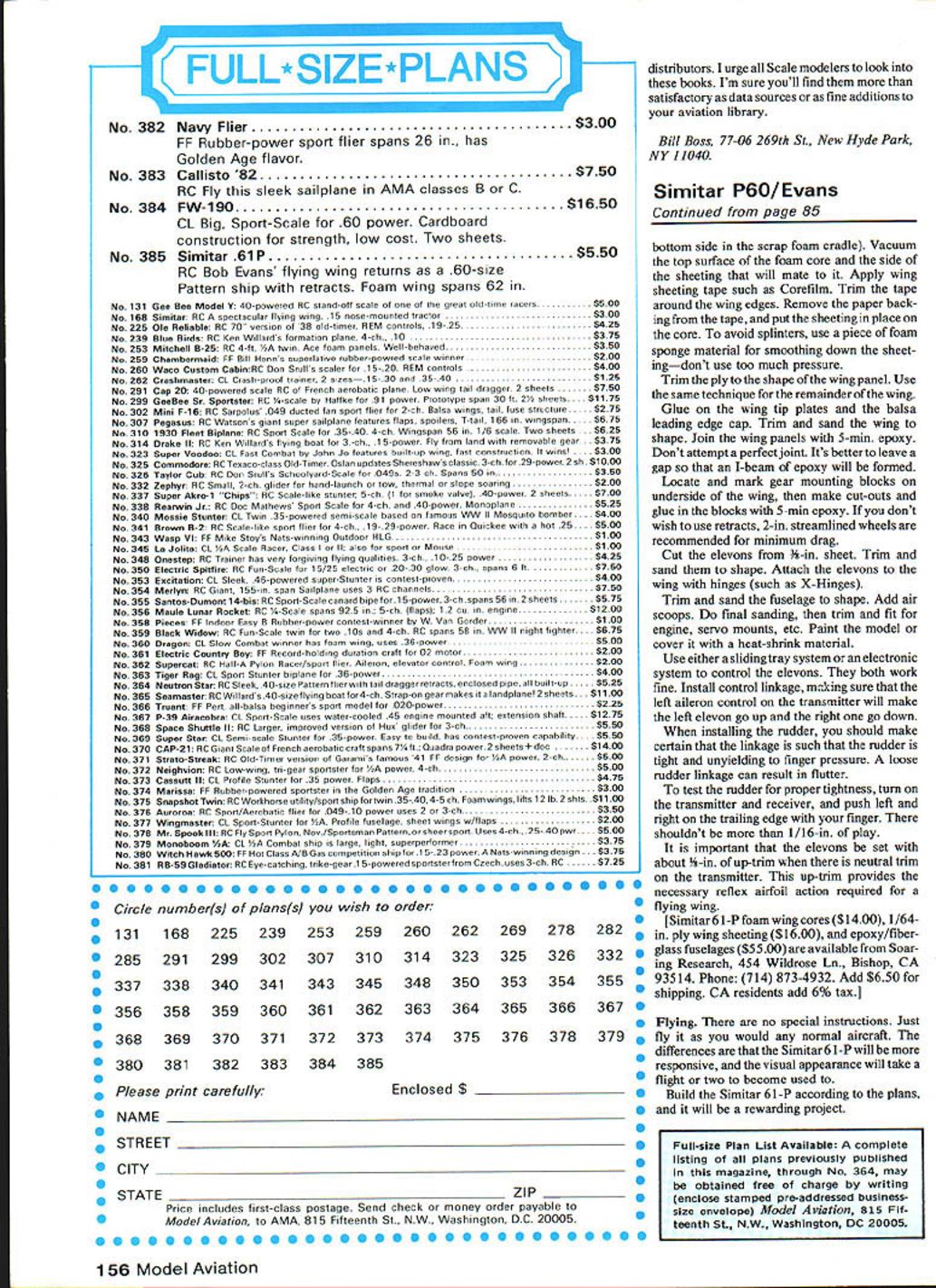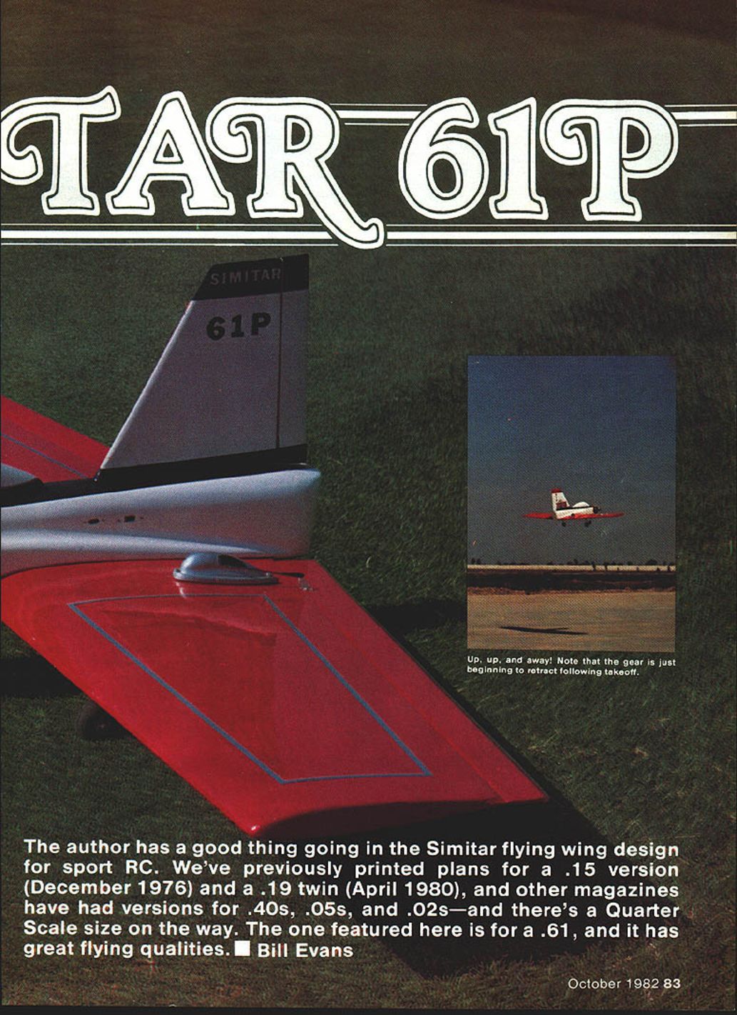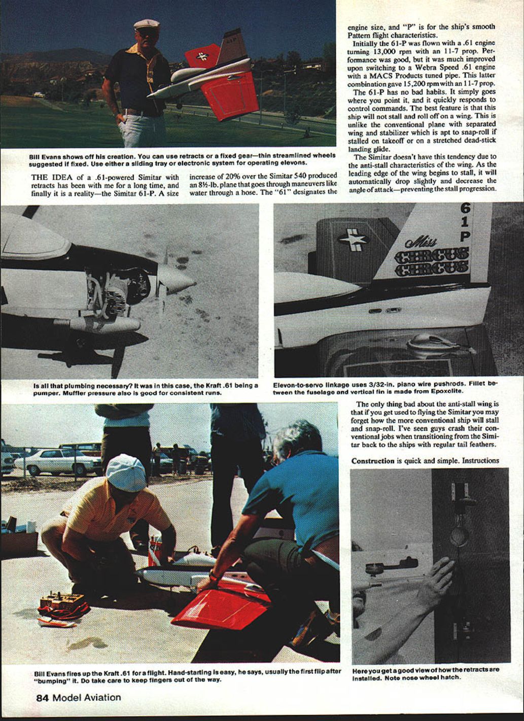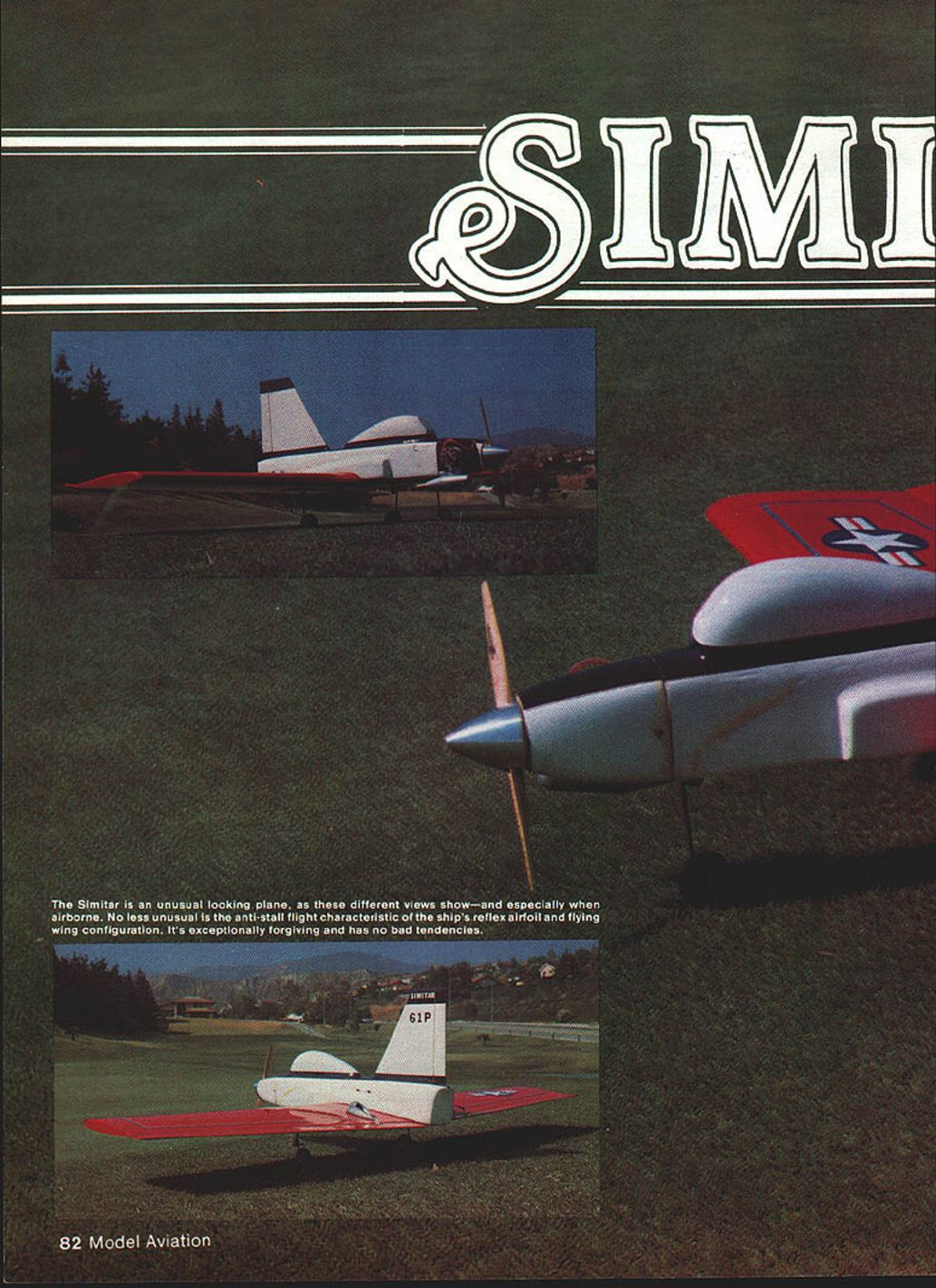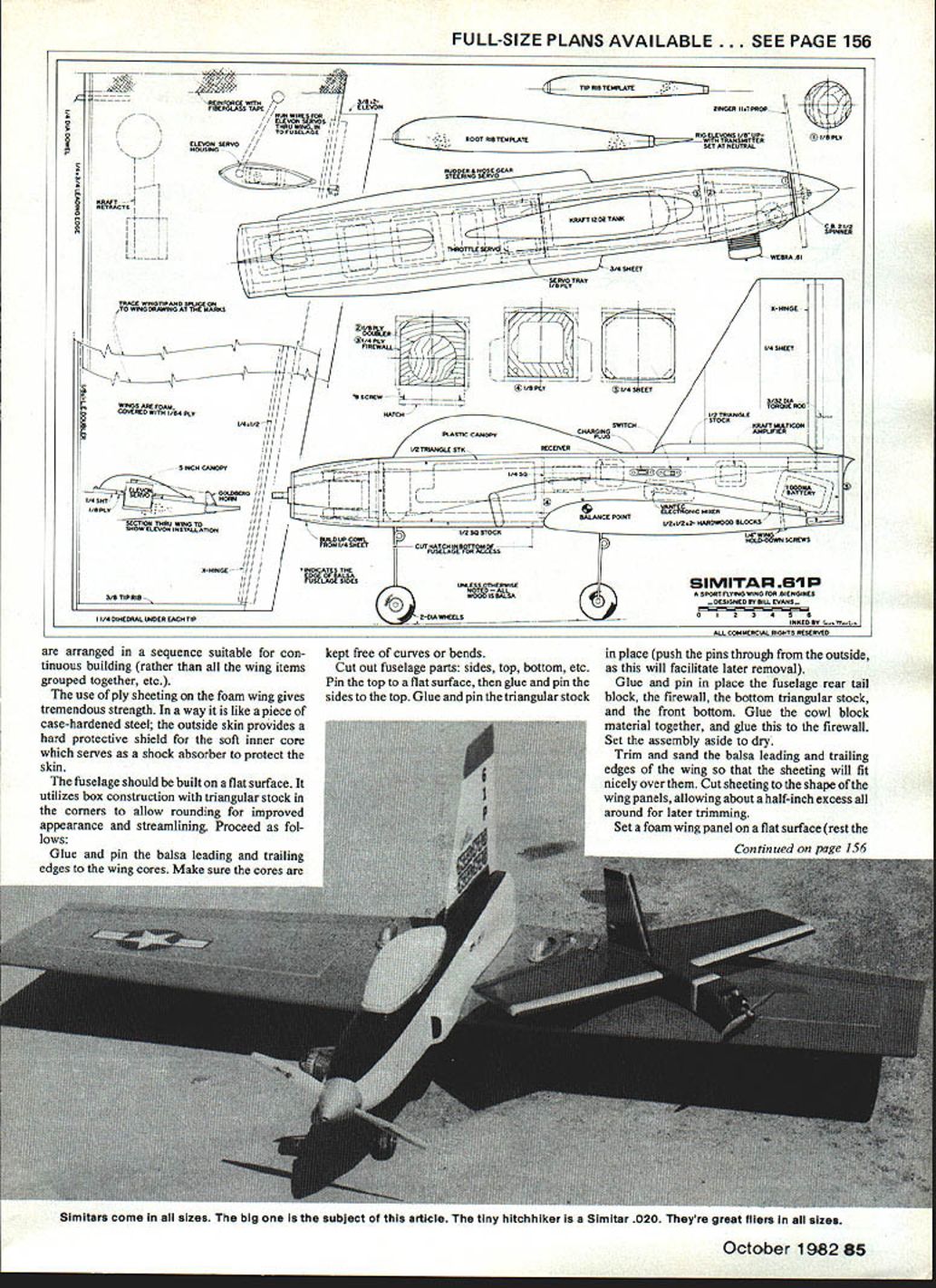 NO OCR TEXT NO OCR TEXT THE IDEA 61-powered Simitar increase 20% over Simitar 540 produced retracts has long time 86-lb plane goes through maneuvers like finally realitythe Simitar 61-P size water through hose 61 designates engine size P ships smooth Pattern flight characteristics Initially 61-P flown 61 engine turning 13000 rpm 11-7 prop Per formance good much improved upon switching Webra Speed 61 engine MACS Products tuned pipe latter combination gave 15200 rpm 11-7 prop 61-P has no bad habits simply goes point it quickly responds control commands best feature ship will stall roll off wing unlike conventional plane separated wing stabilizer apt snap-roll stalled takeoff stretched dead-stick landing giide Simitar doesnt have tendency due anti-stall characteristics wing As leading edge wing begins stall will automatically drop sliitly decrease angie attackpreventing stall progression plumbing necessary case Kraft 61 being pumper Muffler pressure also good consistent runs Elevon-to-servo iinkage uses 3/32-in piano wire pushrods Fillet tween fuselage vertical fin made Epoxolite Bill Evans fires up Kraft 61 flight Hand-starting easy says usuallythe first flip after bumping tske care keep fingers out way thing bad about anti-stall wing get used flying Simitar may forget conventional ship will stall snap-rolL Ive seen guys crash con ventional jobs transitioning Simi tar back ships regular tail feathers Construction quick simple Instructions HereyougetagoodviewOfhOwthe retractssre installed Note nose wheel hatch 84 Model Aviation Bill Evans shows off creation can use retracts fixed gearthin streamlined wheels suggested fixed Use either sliding tray electronic system operating elevons FULL-SIZE PLANS AVAILABLE . SEE PAGE 156 arranged sequence suitable con tinuous building rather wing items grouped together etc use ply sheeting foam wing gives tremendous strength way like piece case-hardened steel outside skin provides hard protective shield soft inner core serves shock absorber protect skin fuselage should built flat surface utilizes box construction triangular stock corners allow rounding improved appearance streamlining Proceed fol lows Glue pin balsa leading trailing edges wing cores Make sure cores kept free curves bends Cut out fuselage parts sides top bottom etc Pin top flat surface glue pin sides top Glue pin triangular stock place push pins through outside will facilitate later removal Glue pin place fuselage rear tail block firewall bottom triangular stock front bottom Glue cowl block material together glue firewall Set assembly aside dry Trim sand balsa leading trailing edges wing sheeting will fit nicely over Cut sheeting shape wing panels allowing about half-inch excess around later trimming Set foam wing panel flat surface rest on156 Simitars come sizes big subject article tiny hitchhiker Simitar 020 Theyre great fliers sizes October 1982 #5 -cREIRFOAa WTTI4 I342FIROIASS TAPEEIEVONOOCA II7OP \\ ThRO woojw[17 0ELETOR AFOVO-RIG (LYONS IR UP- IN PLY /IjROOT RIRTEMPLATESET AT SEOThM RSEgEAP * RETRACTS o1 111*- TI2OITONK ThACE W*OTIPANO SPLIcE WI jTO WINO ORMOINO AT ThE MAR03 OAER PLY FIREWALL 5H4 EET FWINOS ARE FOAM COVENEO WITh IR4 PLY [v32][b-1-10-1-10]]{I4TWASSLE SPCI4 CANOPY I4PLY1//-~ -11ENOPACNIOEN SECTiON TORO WINO 00050 ELEVON INSTALLATIoN/1/ 0-ONGE/ /INOICATES TOE //jLA SIRESwos STOERWISESIMITAR ei P O ALL 34 TIP RIRI ISRALSAA SPO#T FLYING WINO FOR RIEROINES .OESIONEO NT BILL EVANS. 0 I 2 3 4 5 R ItAOIIIEONALONOER EACII TIP INISEO BY CIY.L No 382Navy Flier$300 FF Rubber-power sport flier spans 26 has Golden Age flavor No 383Callisto 82$750 RC Fly sleek sailplane AMA classes B C No 384FW-190$1650 CL Big Sport-Scale 60 power Cardboard construction strength low cost Two sheets No 385Simitar 61 P$550 RC Bob Evans flying wing returns 60-size Pattern ship retracts Foam wing spans 62 No 131Gee Bee Model Y 40-powered RC stand-off scale great old-time racers$500 No 168Simitar RC spectocalar flying wing t 5 nose-rnoanted tractorS300 No225Ole Reliable RC 70 version 38 old-timer REM controls 18-25S425 No 239Blue Birds RC Ken Willards formation plane 4-ch 10$375 No 253Mitchell B-25 RC 4-ft VrA twin Ace foare panels Well-behaved$350 No 259chambermaid FE Bill Henns superlative rubber-powred scale wienerS2 00 No 260Waco custom cabinRC Don Srnlls scaler 1 5-20 REM controls$400 No 262crashmaster CL Crash-proof trainer 2 sizes1 5-30 35-40$125 No 291cep 20 40-powered scale RC French aerobatic plane Low wing tail dragger 2 sheets$750 No 299GeeBee Sr Sportster RC -scale Haffhe 81 power Prototype span 30 ft 2 sheets$11 75 No 302Mini F-16 RC Sarpolas 048 ducted fan sport flier 2-ch Ralsa wings tail fuse structure$275 No 307Pegasus RC Watsons giant sayer sailplane features flaps spoilers T-tail 166 wingspan$675 No 3101930 Fleet Biplane RC Sport Scale 35-40 4-ch Wingspan 56 1/6 scale Two sheets$625 No 314Drake II RC Ken Willards flying boat 3-ch 15-power Fly land removablegear. $375 No 323Super voodoo CL East Combat John J0 features built-up wing fast constructron wins$300 No 325commodore RCTevaco-class Old-Timer Oslan vpdates Shereshaws classic 3-ch 28-power 2sh$1000 No 326Taylor cub RC Sralls schoolyard-Scale 048s 2-3 ch Spans 50 in$350 No 332Zephyr RC Small 2-ch glider hand-launch tow thermal slope soaring$200 No 337 Super Akro-1 chips RC Scale-like stunter 5-ch 1 smoke valve 40-power 2 sheets $700 No 338 Rearwin Jr RC Goc Mathews Sport Scale 4-yb 40-power Monoplane $525 No 340Mossie Stunter CL Twin 35-powered semi-scale based famous WIN II Mosgurto bomber$400 No 341Brown B-2 RC Scale-like sport flier 4-ch. 1 8-28-power Race Ourchee hot 25$500 No 343Wasp VI FE Mike Stoys Nats-winning Outdoor HLG$100 No 345La Jolita CL AA Scale Racer Class II also sport Mouse$100 No 348Onestep RC Trainer has very forgiving flying gualities 3-ch. 10-25 power$425 No 350Electric Spitfire RC Fun-Scale 15/25 electric 20-30 glow 3-ch spans 6 ft$750 No 353Excitation CL Sleek 46-powered super-Stunter contest-proven$400 No 3