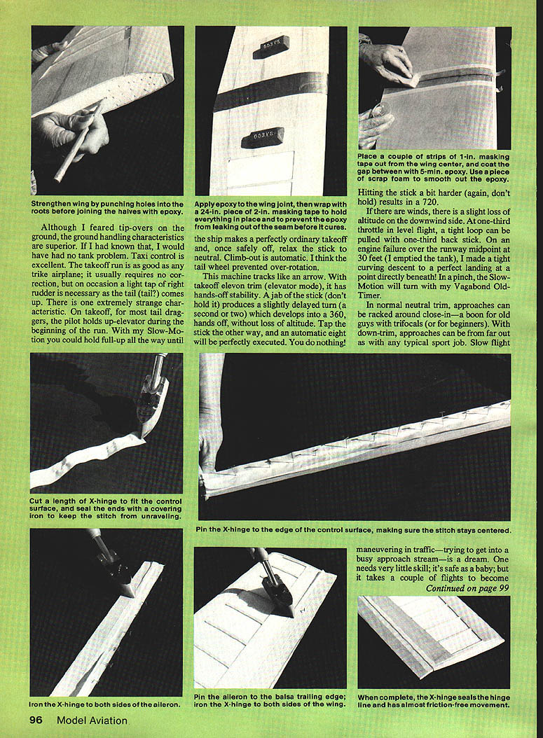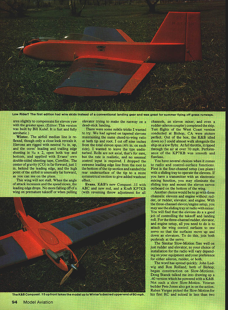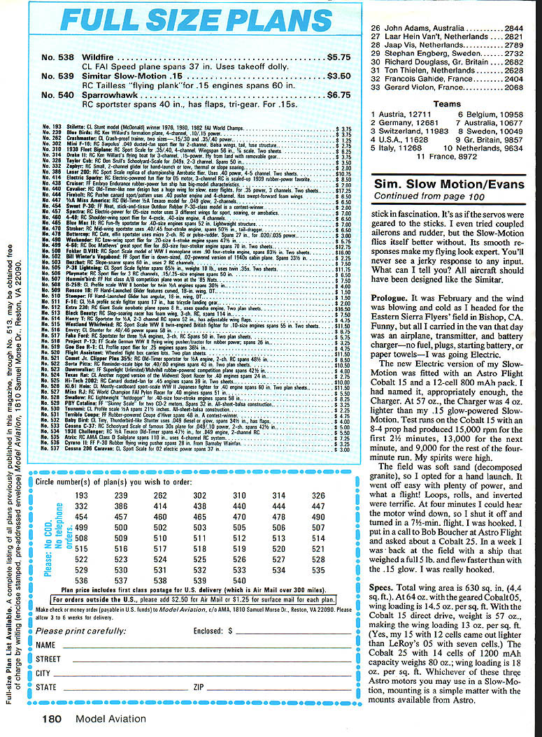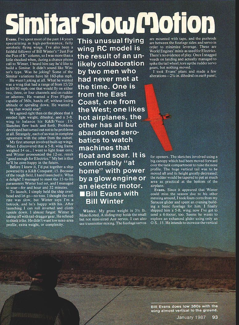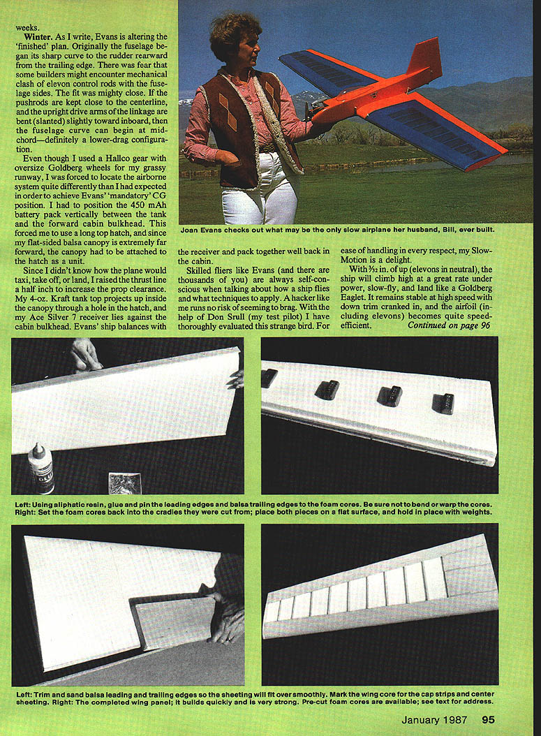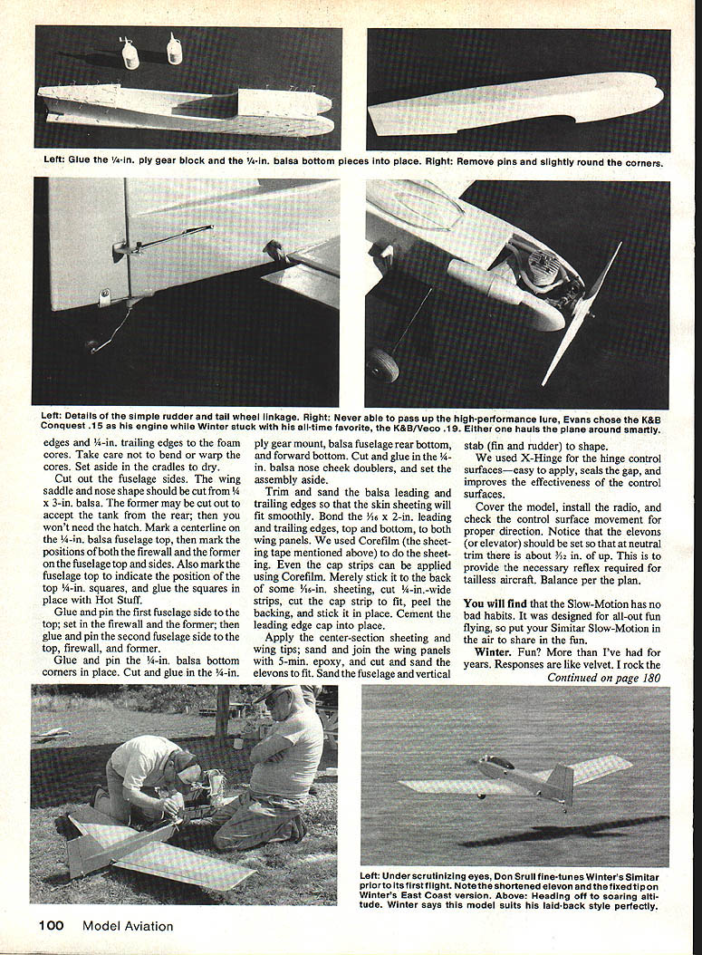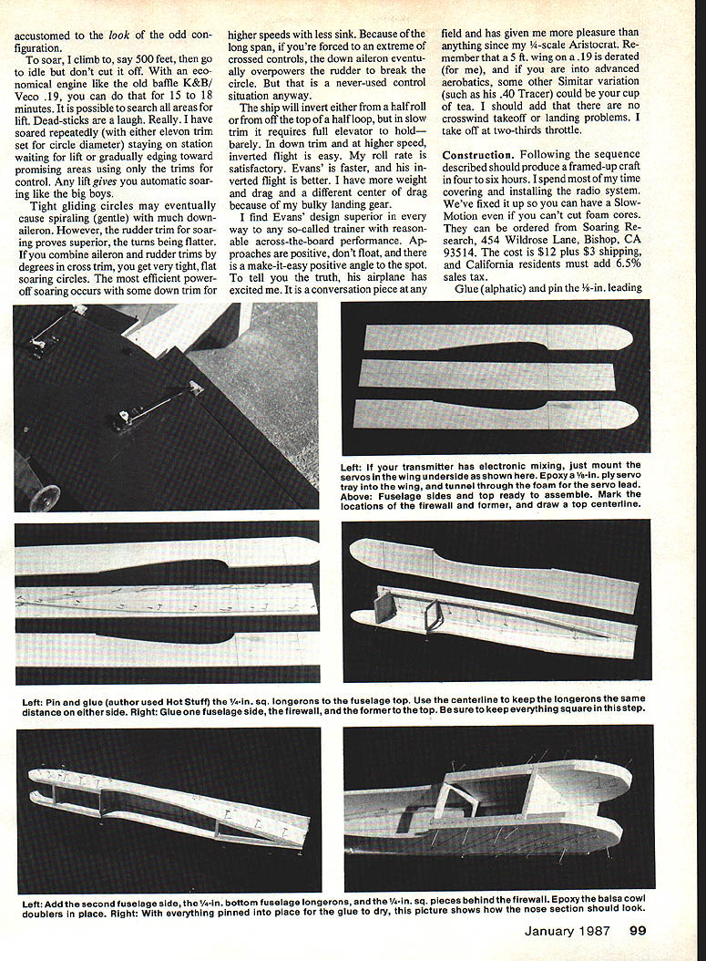 NO OCR TEXT NO OCR TEXT NO OCR TEXT NO OCR TEXT accustomed look odd con figuration soar climb say 500 feet go idle dont cut off eco nomical engine like old baffle K&B/ Veco 19 can 15 18 minutes possible search areas lift Dead-sticks laugh Really have soared repeatedly either elevon trim set circle diameter staying station waiting lift gradually edging toward promising areas using trims control Any lift gives automatic soar ing like big boys Tight gliding circles may eventually cause spiraling gentle much downaileron However rudder trim soar ing proves superior turns being flatter combine aileron rudder trims degrees cross trim get very tight flat soaring circles efficient poweroff soaring occurs some down trim higher speeds less sink Because long span youre forced extreme crossed controls down aileron eventu ally overpowers rudder break circle never-used control situation anyway ship will invert either half roll off top half loop slow trim requires full elevator hold barely down trim higher speed inverted flight easy roll rate satisfactory Evans faster verted flight better have weight drag different center drag because bulky landing gear find Evans design superior way so-called trainer reason able across-the-board performance Ap proaches positive dont float make-it-easy positive angle spot tell truth airplane has excited conversation piece field has given pleasure anything since -scale Aristocrat Re member 5 ft wing 19 derated advanced aerobatics some other Simitar variation such 40 Tracer could cup tea should add no crosswind takeoff landing problems take off two-thirds throttle Construction Following sequence described should produce framed-up craft four six hours spend time covering installing radio system Weve fixed up can have SlowMotion cant cut foam cores can ordered Soaring Re search 454 Wildrose Lane Bishop CA 93514 cost $12 plus $3 shipping California residents must add 65% sales tax Glue alphatic pin -in leading Left Pin glue author used Hot Stuff 1/4-in sq longerons fuselage top Use centerline keep longerons same distance either side Right Glue fuselage side firewall formertothetop sureto keepeverything square step Left Add second fuselage side the-in bottom fuselage longerons tne1/4-in sq pieces behind firewall Epoxythe balsa cowl doublers place Right everything pinned place glue dry picture shows nose section should look January1987 99 Left If transmitter has electronic mixing just mount servos wing underside shown EpoxyaY8-in plyservo tray wing tunnel through foam servo lead Above Fuselage sides top ready assemble Mark locations firewall former draw top centerline Left Glue 1/4-ln ply gear block 1/4-In balsa bottom pieces place Right Remove pins slightly round corners Left Details simple rudder tail wheel linkage Right Never able pass up high-performance lure Evans chose K&B Conquest 15 engine Winter stuck all-time favorite K&B/Veco 19 Either hauls plane around smartly edges -in trailing edges foam cores Take care bend warp cores Set aside cradles dry Cut out fuselage sides wing saddle nose shape should cut x 3-in balsa former may cut out accept tank rear wont need hatch Mark centerline -in balsa fuselage top mark positions both firewall former fuselage top sides Also mark fuselage top indicate position top -in squares glue squares place Hot Stuff Glue pin first fuselage side top set firewall former glue pin second fuselage side top firewall former Glue pin -in balsa bottom corners place Cut glue -in ply gear mount balsa fuselage rear bottom forward bottom Cut glue balsa nose cheek doublers set assembly aside Trim sand balsa leading trailing edges skin sheeting will fit smoothly Bond /16 x 2-in leading trailing edges top bottom both wing panels used Corefilm sheet ing tape mentioned above sheet ing cap strips can applied using Corefilm Merely stick back some V16-in sheeting cut -in-wide strips cut cap strip fit peel backing stick place Cement leading edge cap place Apply center-section sheeting wing tips sand join wing panels 5-min epoxy cut sand elevons fit Sand fuselage andvertical stab fin rudder shape used X-Hinge hinge control surfaceseasy apply seals gap improves effectiveness control surfaces Cover model install radio check control surface movement proper direction Notice elevons elevator should set neutral trim about /32 up provide necessary reflex required tailless aircraft Balance per plan will find Slow-Motion has no bad habits designed all-out fun flying put Simitar Slow-Motion air share fun Winter Fun Ive years Responses like velvet rock Continued180 100 Model Aviation Left Under scrutinizing eyes Don Srull fine-tunes Winters Simitar priorto its first flight Note shortened elevon fixed tip Winters East Coast version Above Heading off soaring alti tude Winter says model suits laid-back style perfectly Full-size Plan List Available complete listing plans previously published magazine through No 513 may obtained free charge writing enclose stamped pre-addressed envelope Model Aviation 1810 Samuel Morse Dr Reston VA 22090 Cr Cr Cr Cr Cr #3 NJ NJ Cr #3 0 o Cr 0 NJ Cr Cr 0 3 Cr Cr Cr Cr Cr Cr J #3 #3 NJ Cr Cr #3 J 0 #3 Cr 0 0 1 Cr 0 o Cr Cr Cr Cr Cr Cr #3 #3 NJ 0Cr Cr 3 Cr NJ 0 en Cr Cr Cr Cr Cr Cr #3NJ---0Cr#30 • 0 NJ Cr Cr - #3 Cr Cr NJ i 5 U C CrCrCrCrCrCr #3 0 #3 Cr 0 NJ Cr000 Cr Cr Cr Cr Cr #3 NJ NJ 0 -J #3 Cr Cr Cr Cr Cr Cr #3 NJ N -00 r Cr -J Cr ZUZUUUUUUUUEEUEflEEUEEflEEEEEUUUUUUUUUUUEUUEUUEEflEEEUEE CUSUSeSeCUeSSUeeUUUPppp CCWWWflminJCmgmu 5515fl0 aaflfl baWWWWWbflJM- C flCCCCcS e-j-jaaaaa aa -Jam mamrJSaCMMLJ C FEIFWrr rrrn u rF -- U S3 rU~ 3 1Km14 rnrrrmi enMnrnIIM r -U o enW _ SLW1~P i&jrljlrent1U ga afl 3 lEe - ffi enU2irjCiL0t22a 3 wrrnmr 3r enj%03 Sacg m&lj CIaUS IXwt g1t01 occ CUU-accc-j[ima7g Thw~ II i jiSfA5 w 0go~OU .Leljt1 j g. 2WtinsEU2 tSrU -% io en52-35 U j3CrNJ3C.U33 rtij 1r [Iw '=-1-~ s a %4 2- s9ibs oSnc 2ar = g3 uiaLN -IU U~33 o5. r353U$U U 32 Ntfl -jj j c 2cc3U c 4 U 5 - n Eel utl=nEars j10 ~2 tUigjanirncro 1 3r- UU5041 CU U . s = c U U
