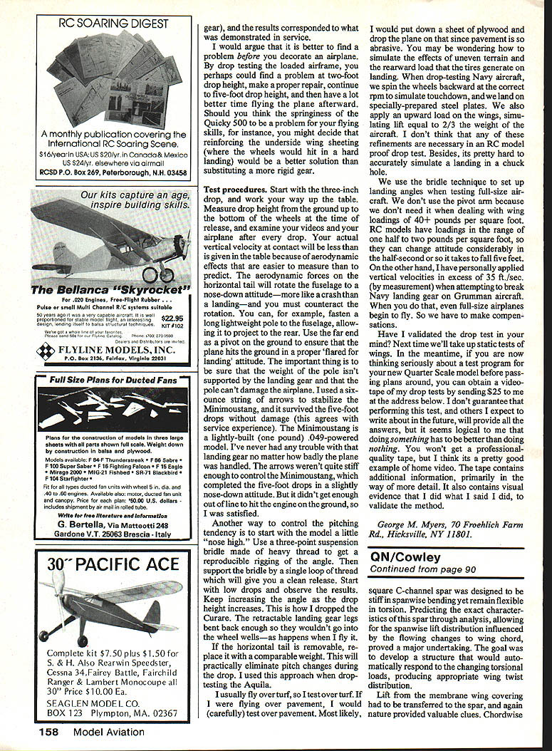 Simple Structural Test Techniques RC Aircraft Everyone wants design build airplanes safe flight conditions Ground testing per article others follow will tell story before plane gets air EGeorge M Myers NOTHING HAVE WRITTEN past 10 years has excited positive responses rapidly did offer April 1986 Radio Technique column describe simple structural test techniques model aircraft quote S3 Sierra Silent Soarers newsletter Oboyo boy George George! interested similar comments nice letters Fred E Bellows Jr Sharon MA Ken Gilpin Petersburg AK Ralph S Anderson Litchfield Park AZ Bobby R Pilldnton Columbia TN Bob Morris AMA 107933 Pete Van Dore Hobby Technics Elkins Park PA John Olden boom Plainfield NJ Duane Nelson Fair Oaks CA Paul R Adams Denver CO letters arrived first week after publication thanks kind words Our editor/publisher Carl Wheeley prefers deal subject separately Radio Technique lets get started Let say outset will demonstrating simplified procedures refinements possible used testing man-carrying aircraft refine ments expensive Im trying show procedures can followed very few special tools minimum expense doing things inexpensively no excuse doing carelessly thing worth doing worth doing right Test test things find hidden flaws build up confidence thing being tested save time money motto test engineer Get right answers purpose What test Four essential elements Vertical Sinking Speed Vacuum Versus Free Drop Distance IJropHt3 in67 in119in 186in 268in 365in4 ft5 ft Ft/Sec4681112141618 80 Model Aviation planes shown subjected drop tests up five feet collect data validate method show range aircraft can tested way Foreground Aquila Sailplane has skid weIghs 3 lb Behind L-R 9-lb Curare tricycle iand ing gearand 61 engIne 1 -lb Minimoustang two-wheel gearand1/aAengine 4-lb Spick lerGuicky 500with two-wheel gear 40 power Drop about5 ft simulates rough landings simple test setup using tape measL aEIU mu uumurruuuruurITurgrounaI IIUflU 15 Curare Pitch attitude stabilizing rod whun connected garbage can has disconnected George tests structures full-size aircraft part full-time job common eve ry test test speci men test loads test setup proce dure expect profit work will want some instrumenta tion can col lect test data have data should analyze Finally wont forget what happened should write self some kind report complete test begins test plan ends test report know want skip planning jump right testing Its dumb test way time just sake ex ample well begin simple test procedure testing drop airplane onto its landing gear test landing gear everything aircraft likely dam aged landing shock loads IL -pIur iIzipair ZI 2#NSe 2t831-P*ur 3pjjjK Proof load drop test Proof landing loads RC aircraft can generated free drop about 5 feet complete airplane landing attitude make statement basis sinking speeds used commercial military Navy aircraft teststaking account lightly-built RC aircraft will obtain support wings during fall therefore will land correspondingly lower vertical velocities height will full-size aircraft also take advantage fact small structures stronger large structures built same materials same manner Further Ive already performed tests sev eral own aircraft will see read Instrumentation have video cam era recorder slow playback and/or single-frame capability can learn some interesting things about airplane reacts same can done movie cameras understand what looking must know TV picture doesnt exist eyes fast enough would see thing call picture actually just spot flies back forth tracing horizontal paths TV screen takes spot 1/60th second trace other line screen lets call oddnumbered lines next 1/60th second spot traces evennumbered lines should now under stand can examine things take longer 1/30th second happen time takes construct complete TV frame display video frame drop test Continued page 157 ____________Hold 6 Release _ ______________Point Tank D Prop Horizontal Detaiis drop-test bridie simpie log decide con duct such tests means keep log examine video picture between drops make adjustments get appropriate ground con tact work up height small increments Goal such test ing determine have adequate structures safe flight August 198681 Photo TV screen taken ati35 1/30 sec Kodacoior400 after using slow motion find frame pause hold Shown Tim Myers Ouicky 500 during impact 2-ft drop about 11 ft/sec point gear totally coliapsed Re inforce landing gear considerations See text ThIs TV-screen photo example double image resulting interlace method building TV picture measuring wing tip blur knowing wing chord 18675 can estimate vertical velocity point fall However re member half blur belongs picture therefore distance traveled 1/60 sec half blur measure picture practice answer should 152 feet per second Georges Curare impact after 5-ft drop shown TVscreen photo retractable landing gear says has al ways taken much tinkering process bending back wont retract wheel wells can toil bythe bluron thetail plane already pitching back nose gear rebound Engine rework Youd better off spending time practicing racing pitting trying polish re-time soup intake restrictions new engine runs well anything else Ive seen Three-up Control Line Racing too much fun let slip away under horse power curve Quickie Rat captures excitement fun Racing does atmosphere promotes success appeals levels competitors would like hear anyone suggestions comments Frank Williams 710 Silverpines Houston TX 77062 phone 713-488-1371 Elec Champs/Naccarato Continued page 79 RC Old-Timer Seven-Cell 1 Paul Hingtgen Playboy Astro Co 05 7x800mAh Sanyo 2020 pts 2 Bob Sliff Playboy Astro Co 05 7x800mAh Sanyo 2008 pta 3 Larry Jolly Interceptor Aatro Co 05 7x800mAh Sanyo 1996 pta 4 Chuck Hollinger Nomad Astro Co 05 7x800mAh Sanyo 1865 pta 5 Jim Hall Playboy Leisure 05 7x800 mAl Sanyo 1860 pta RC Old-Timer Open 1 Mike Charles Super Quaker Aatro Co 60 26x800mAh Sanyo 2020 pta 2 Frank Chasteler Lanzo Keller 351 6x800 nAh Sanyo 2020 pta 3 Ross Thomas Lanzo Astr