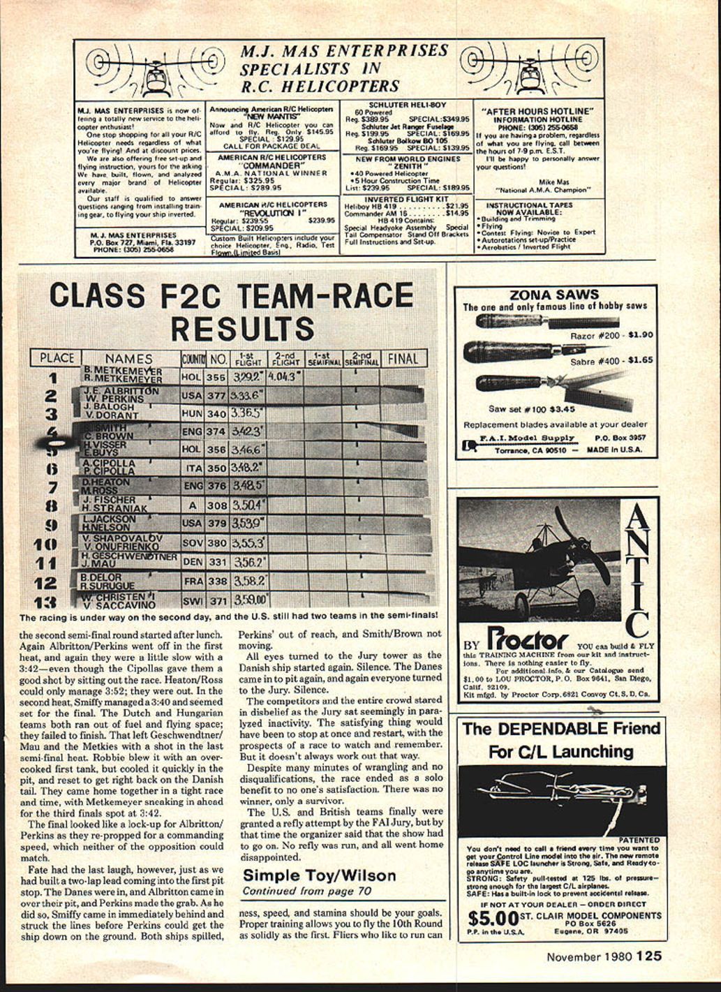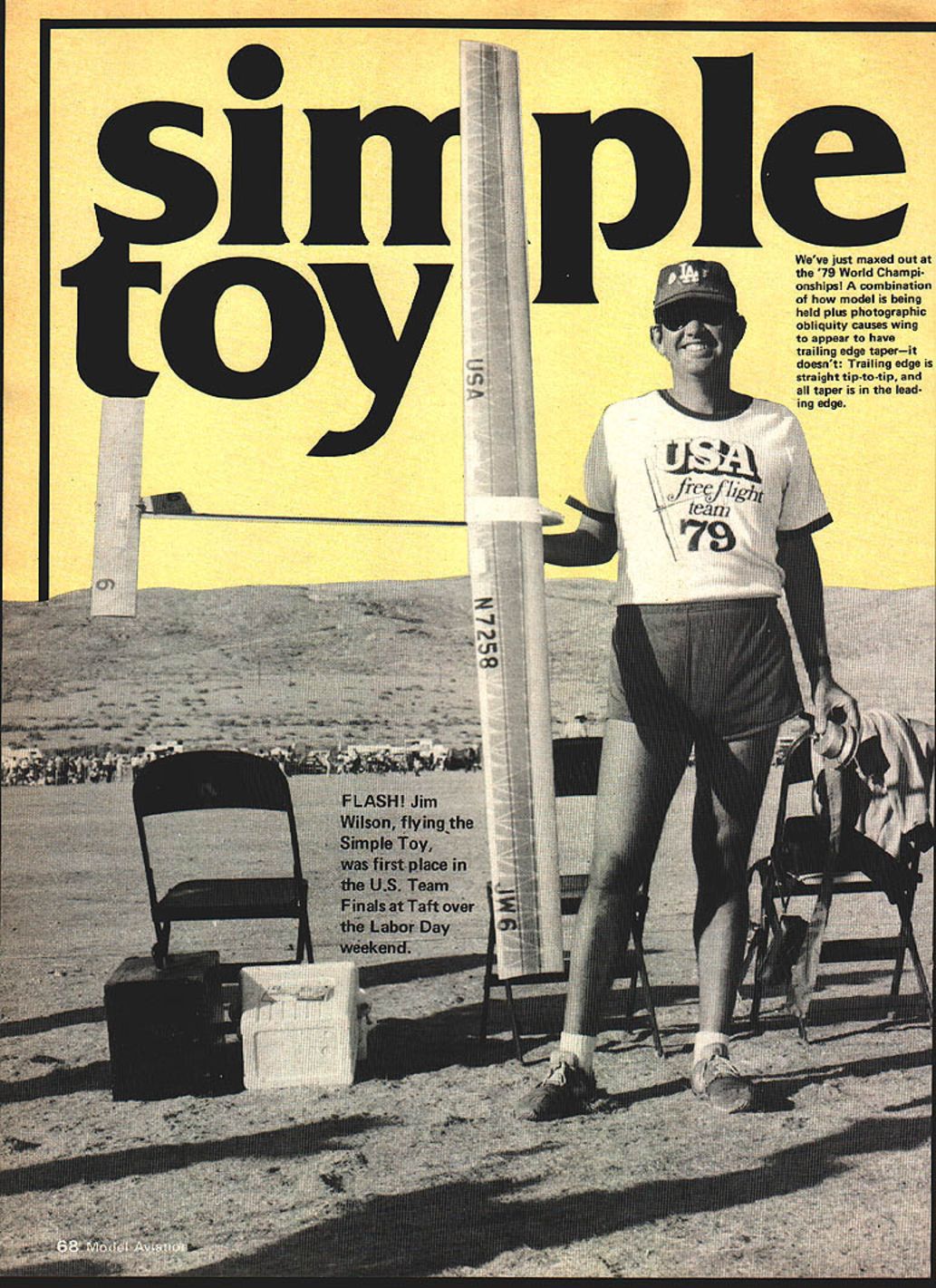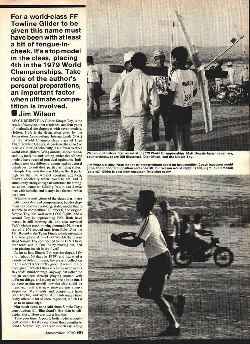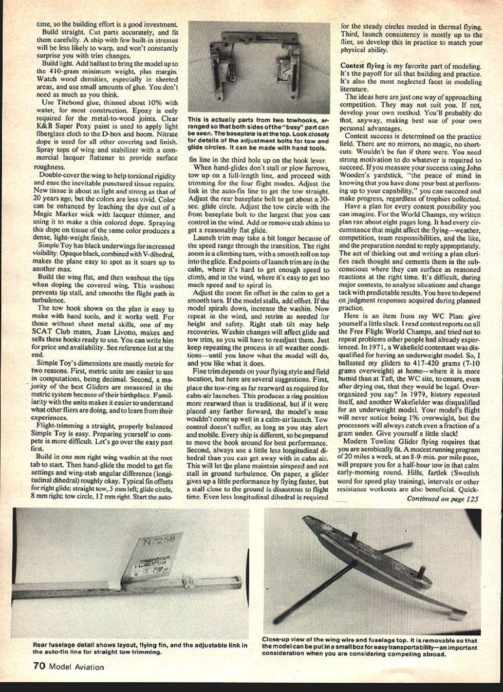 Weve just maxed out 79 World Champi onshipel combination model being held plus photographic obliquity causes wing appear have trailing edge taperit doesnt Trailing edge straight tip-to-tip taper lead edge world-class FF Towline Glider given name must have least bit tong ue-in cheek Its top model class placing 4th 1979 World Championships Take note authors personal preparations important factor ultimate compe tition involved EJim Wilson MY CURRENT Fl Glider Simple Toy result studying other airplanes four years methodical development seven models Editor Fl designation given Federation Aeronautique Internationale FAI World Championships class Free Flight Towline Gliders also referred A-2 Nordic Glider Technically similar other world-class gliders Wing airfoils aspect ratios stability margins turning tendancies models have reached practical optimums Indi viduals now use different layouts structural details just suit particular flying styles Simple Toy suits wayl like fly parks high line constant attention follows obediently towed lift structurally strong enough withstand strong est zoom launches Gliding free can 3-mm max no help stays thermal put Within restrictions class rules flight modes demand compromises develop ment has produced strong stable model reliable competition Number 6 original Simple Toy has well over 1000 flights second Toy approaching 500 Both have maxed still morning air also survived Tafts violent trash-moving thermals Number 6 scored 240-second max Pole 13 13th Round Team Finals help gain US team place 1979 World Champion ships Simple Toy contributed U Ss firstever team win Towline maxing out placing fourth flyoff As far Simple Toy developed fly lot about 60 days 1979 just tried variety different ideas present collection model work pretty good wasnt really ~designed think funny word Reynolds number range anyway rather design evolved through playing around different things trying have little fun keep asking myself ship could improved new answers always surprising friends competitors have helpful SCAT Club mates have really offered lot encouragement Id like acknowledge much needs said about Simple Toys construction Bill Blanchards fine plan selfexplanatory just few tips Take time poorly built model poorly built forever takes about three months build Simple Toy models last long November 198069 War council before first round 79 World Championships Matt Gewain faces camera counterclockwise Bill Blanchard Dick Myers Simple Toy Jim Wilson play Note towing reel best mobility Coach lsaacson would gripe about poor arm position knee lift Wilson would reply Yeah right maxed barely Glider over right shoulder following easily time building effort good investment Build straight Cut parts accurately fit carefully ship few built-in stresses will less likely warp wont constantly surprise trim changes Build light Add ballast bring model up 410-gram minimum weight plus margin Watch wood densities especially sheeted areas use small amounts glue dont need much think Use Titebond glue thinned about 10% water construction Epoxy required metal-to-wood joints Clear K&B Super Poxy paint used apply light fiberglass cloth D-box boom Nitrate dope used other covering finish Spray tops wing stabilizer com mercial lacquer flattener provide surface roughness Double-cover wing help torsional rigidity ease inevitable punctured tissue repairs New tissue about light strong 20 years ago colors less vivid Color can enhanced leaching dye out Magic Marker wick lacquer thinner using make thin colored dope Spraying dope tissue same color produces dense light-weight finish Simple Toy has black underwings increased visibility Opaque black combined V-dihedral makes plane easy spot soars up another max Build wing flat washout tips doping covered wing washout prevents tip stall smooths flight path turbulence tow hook shown plan easy make hand tools works well sheet metal skills SCAT Club mates Juan Livotto makes sells hooks ready use can write him price availability See reference list end Simple Toys dimensions mostly metric two reasons First metric units easier use computations being decimaL Second ma jority best Gliders measured metric system because oftheir birthplace Famil iarity units makes easier understand what other fliers doing learn experiences Flight-trimming straight properly balanced Simple Toy easy Preparing yourself com pete difficult Lets go over easy part first Build mm right wing washin root tab start hand-glide model get fin settings wing-stab angular difference longi tudinal dihedral roughly okay Typical fin offsets right glide straight tow 5 mm left glide circle 8 mm right tow circle 12 mm right Start autofin line third hole up hook lever hand-glides dont stall plow furrows tow up full-length line proceed trimming four flight modes Adjust link auto-fin line get tow straight Adjust rear baseplate bolt get about 30sec glide circle Adjust tow circle front baseplate bolt largest can control wind Add remove stab shims get reasonably flat glide Launch trim may take bit longer because speed range through transition right zoom climbing turn smooth roll top glide End points launch trim calm its hard get enough speed climb wind its easy get too much speed spiral Adjust zoom fin offset calm get smooth turn model stalls add offset model spirals down increase washin Now repeat wind retrim needed height safety Right stab tilt may help recoveries Washin changes will affect glide tow trim will have readjust Just keep repeating process weather condi tionsuntil know what model will like what does Fine trim depends flying style field location several suggestions First place tow-ring far rearward required calm- alr launches produces ring position rearward traditional placed farther forward models nose wouldnt come up well calm-air launch Tow control doesnt suffer long stay alert mobile ship different prepared move hook around best performance Second always use little less longitudinal di hedral can get away calm air w