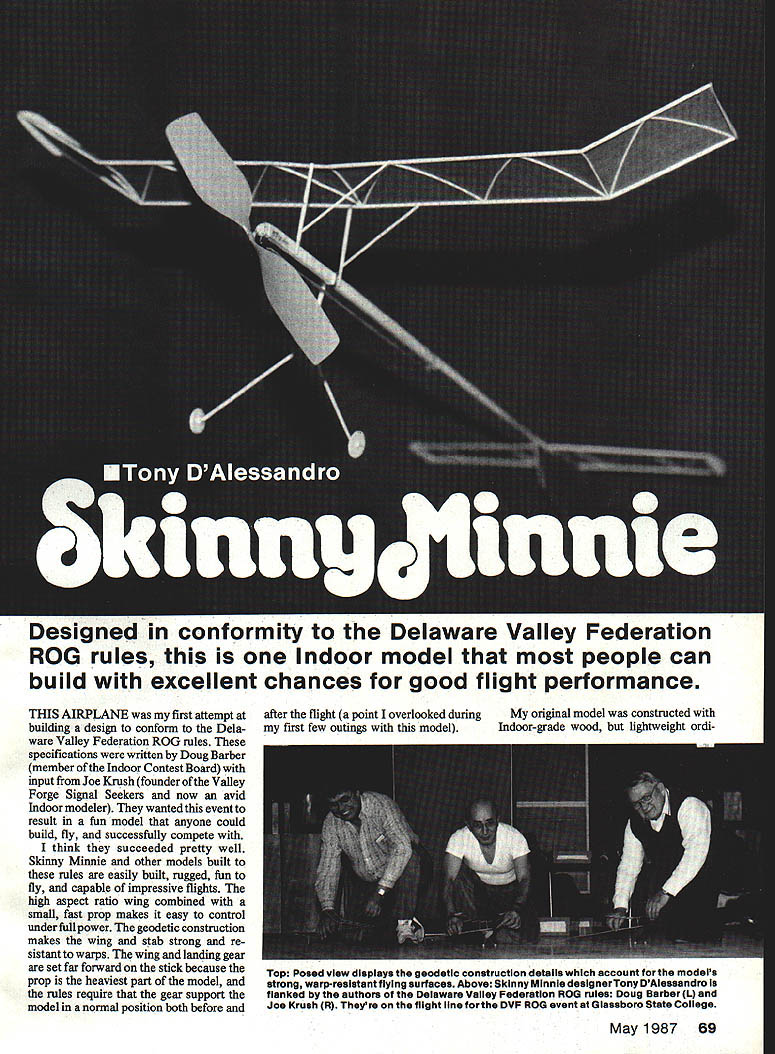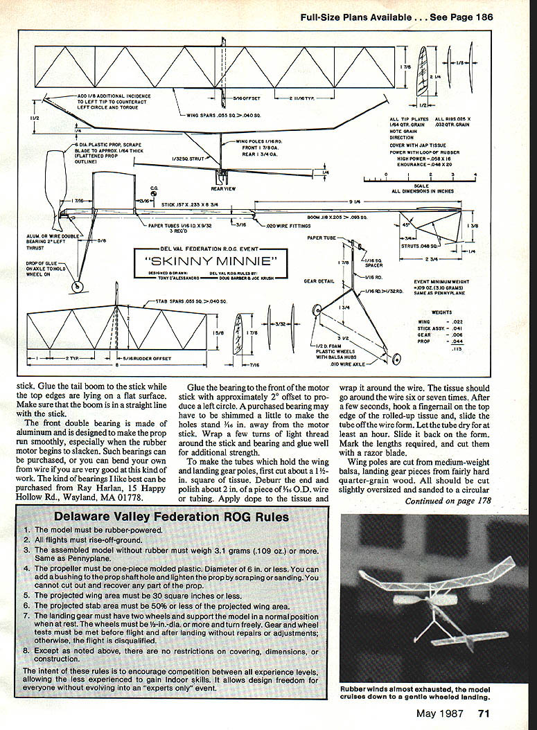 I 1 r L Designed conformity Delaware Valley Federation ROG rules Indoor model people can build excellent chances good flight performance THIS AIRPLANE first attempt building design conform Dela ware Valley Federation ROG rules specifications written Doug Barber member Indoor Contest Board input Joe Krush founder Valley Forge Signal Seekers now avid Indoor modeler wanted event result fun model anyone could build fly successfully compete think succeeded pretty well Skinny Minnie other models built rules easily built rugged fun fly capable impressive flights high aspect ratio wing combined small fast prop makes easy control under full power geodetic construction makes wing stab strong re sistant warps wing landing gear set far forward stick because prop heaviest part model rules require gear support model normal position both before after flight point overlooked during first few outings model original model constructed Indoor-grade wood lightweight ordi Top Posed view displays geodetic construction detalis account models strong warpresistant flying surfaces Above Skinny Minnie designerTony DAiessandro flanked authors Delaware Valley Federation ROG rules Doug 9arber L Joe Krush R Theyre flight line DYF ROG event Glasaboro State College May1987 69 Left Another posed picture shQwathe long linesthat led namethe modeiwas given Notethatthe landing gear shown originai position later moved forward per plans Right Skinny Minnie grabs some aititude Phiiadeiphlas Memorial Hall Gymnasium author snaps prop shaft double bearing preparation flight left right Skinnie Minnie about take air following release Rules require use ready-made plastic prop can thinned difficult part Tony says nary balsa may substituted Note overall minimum weight plane rules should equal 109 oz 31 grams approximately weight new penny same weight Pennyplane model Use weights shown plan general guide about what various parts should weigh Have ever entered mass-launch event recently first encounter type competition quickly learned takes good model well have cool under pressure able go landing back flight line two three minutes avoid broken motors hang ups during flight Luck flying skill both count great fun participant event real crowd pleaser General construction tips follows Use clean straight-grained balsa free warps use Ambroid cement thinned about 50/50 Apply carefully glue stick small glue gun cutting trimming use double-edge razor bladethe old-fashioned kind brittle can broken sharp point protect face hands doing Construction wing tail sur faces straightforward Make rib tem plates thin flexible material 1/n sheet aluminum favorite template material ribs cut quartergrain 1/32 balsa sanded down 025 sliced off / intervals Cut wing stab spars stiff straight-grained 1/16 sheet Sand down thickness noted cut finish size shown Assemble over plans sure shim up leading edge left wing tip model maintain altitude flight circling left Trim ribs rear glue carefully place Let glue joints dry thoroughly Cut dihedral joints Apply glue joints block up wing panels correct dihedral dimensions Flying surfaces covered Jap anese tissue though suitable covering material may used Tissue inner wing panels cut exact length somewhat wider panel cov ering other parts cut tissue somewhat larger piece di rections use 3M brand #77 spray cement art supply store adhere tissue Spread out newspapers lay wing tail frames aim cement spray about 1 ft above parts give two light spritzes usually garage door slightly open gives subdued light except strong light shining side just above floor allows see amount spray being released cement will remain tacky long time Carefully return parts work bench Iron pre-cut tissue pieces warm iron smooth out wrinkles reduce moisture content apply tissue frames smoothly pos sible Trim overhanging tissue new razor blade Spray some cement small container use fine brush apply adhesive missed spots dihedral overlaps Parts can also cov ered standard manner thinned dope some other adhesive Select balsa stick tail lightweight straight stiff tail boom can softer wood motor stick Sand cut parts di mensions shapes shown plan Bend rear hook fit glue placemaking sure centered 70 Model Aviation Full-Size Plans Available. See Page 186 ADD I/B ADDITIONAL INCIDENCE TO LEFT TIP TO COUNTERACT -. LEFT CIRCLE AND TORQUE Il/S 1/4 S DIAPLASTIC PROP SCRAPE BLADE TO APPROX 1/64 THICK FLATTENED PROP OUTLINE II ALUM OR WIRE DOUBLE BEARING 5 LEFT SIB THRUST DROPOF GLUE ON AXLE TO HOLD WHEEL ON 4 4 S/IBOFFSETL5 II/WTYP WING SPARS 055 SO040 SO ~JRUL CG STICK 1ST 5233 SB 3/4 REAR VIEW POLES I/IBRD FRONT 7/BOA REAR 3140A ti/B1 2 1/4 ALL TIP PLATES ALL RIBSOSS X 1/64 QTR GRAIN 0320TRGRAIN ROTE GRAIN DIRECTION COVER WITH JAP TISSUE POWER WITH LOOP OP RUBBER HIGH POWER 056 SIB ENDURANCE046 XZO 0I534 SCALE ALL DIMENSONS IN INCHES ~1 PAPER TUBES I/IS LOSS/IS3I1\. 020 WIRE FITTINGS 3 REQS DEL VAL FEDERATION RaG EVENT SKI NNYM INNIEI DESIGNED B 0RABNSEL VAL RAG RULES BYI TORY SALESSANDRO0GW BARBER B JOE BRIflI STAB SPARS 065 50 04050 S1 -S/IBRUDDER OFFSET 15/B 7/lB BOOM 118 5205 09320 PAPER TUBE IT/B I/IS SO SPACER I/lB RD GEAR DETAIL I/lB I/3SRO 3/4 S I/S I/SD FOAM PLASTIC WHEELS WITH BALSA HUBS 010 WIRE AXLE 3/41J STRUTS 046 SO -41/4 2 3/4 EVENT MINIMUM WEIGHT -JOB 021310 GRAMS SAMEAS PENNTPLANE WEIGHTS WING 022 STICIC AGGY- 041 GEAR- 006 PROP- 044 113 stick Glue tail boom stick top edges lying flat surface Make sure boom straight line stick front double bearing made aluminum designed make prop run smoothly especially rubber motor begins slacken Such bearings can purchased can bend own wire very good kind work kind bearings like best can purchased Ray Harlan 15 Happy Hollow Rd Wayland MA 01778 UbbOrpI off-groun wlthou St one-plec prop shaft h recover na must must t ar riui ~ave two w rhe wheels must mt before IS die Glue bearing front motor stick approximately 20 offset pro duce left circle purchased bearing may have shimmed little make holes stand YS6 away motor stick 