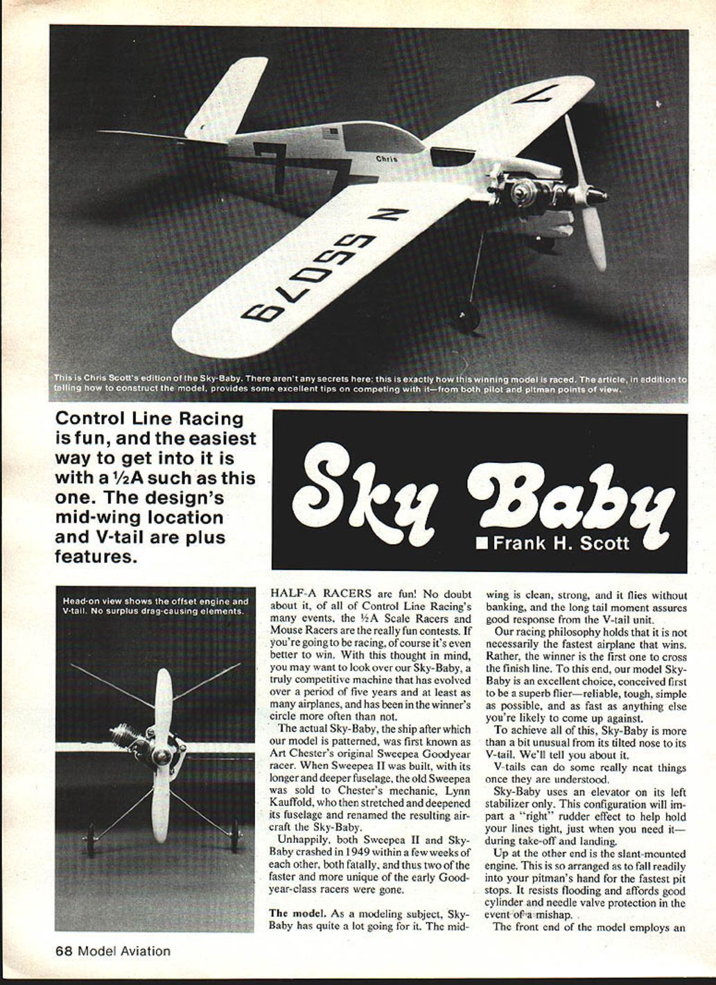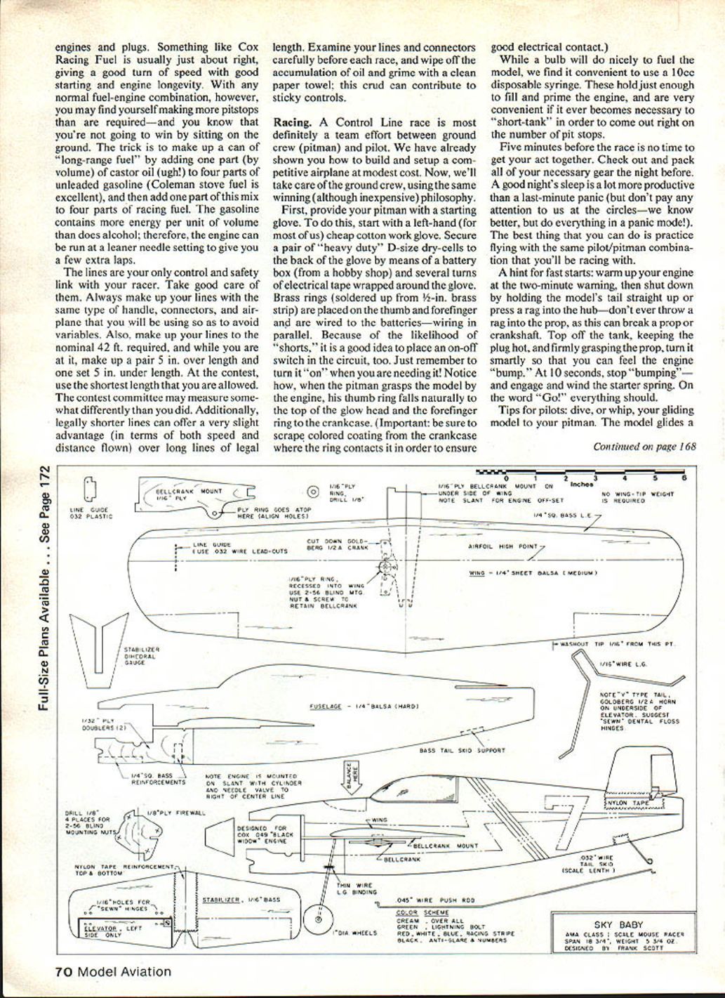 HALF-A RACERS fun No doubt about of Control Line Racings events Scale Racers Mouse Racers really fun contests youre going racing course its better win thought mind may want look over Sky-Baby truly competitive machine has evolved over period five years least airplanes has winners circle often actual Sky-Baby ship after model patterned first known Art Chesters original Sweepea Goodyear racer Sweepea II built its longer deeper fuselage old Sweepea sold Chesters mechanic Lynn Kauffold stretched deepened its fuselage renamed resulting air craft Sky-Baby Unhappily both Sweepea II SkyBaby crashed 1949 within few weeks other both fatally thus two faster unique early Good year-class racers gone model As modeling subject SkyBaby has quite lot going midwing clean strong flies banking long tail moment assures good response V-tail unit racing philosophy holds necessarily fastest airplane wins Rather winner first cross finish line end model SkyBaby excellent choice conceived first superb flierreliable tough simple possible fast anything else youre likely come up against achieve Sky-Baby bit unusual its tilted nose its V-tail Well tell about V-tails can some really neat things once understood Sky-Baby uses elevator its left stabilizer configuration will im part right rudder effect help hold lines tight just need during take-off landing Up other end slant-mounted engine arranged fall readily pitmans hand fastest pit stops resists flooding affords good cylinder needle valve protection event ofamishap front end model employs 68 Model Aviation Control Line Racing fun easiest way get 1/2A such designs mid-wing location V-tail plus features unusual amount piywood adding very little weight firmly ties engine mount landing gear wings bellerank mount really solid properly aligned unit Furthermore wing has basswood leading edge basswood tail nylon-reinforced told tough airplane Construction various components can produced order like obvious have come together sooner later find conven ient proceed following manner Select nice flat sheet light -in stock wing Cut length cut leading edge taper Glue bass wood leading edge tape place allow dry Pick really firm piece of4-in stock fuselage jigsaw shape Glue place tail-skid mount landing gear re inforcements two 1/32 plywood nose doubler Set aside dry Finish cutting wing shape cut small circular recess bellcrank mount Plane sand wing airfoil shape use flat-bottom lifting airfoil section center tips washedout 1/16-in tip avoid tip stall upper surface formed much like HL Glider wing using straight slope behind high point LE right wing sharp left LE remains round done cause right wing stall first thereby maintaining line tension landing speeds Assemble bellerank mount 1/16 plywood wing mount Install 2-56 blind mounting nut wing mount assembly fill nut threads modeling clay keep glue paint out later Glue wing mount wing Set aside Cut slot fuselage stabilizer clean up slot wing carve sand fuselage Bend landing gear wire shape assemble wheels axles dont think using anything other carefully soldered washers Assemble landing gear fuselage sewing soft wire through drilled holes Cut plywood firewall shape drill mounting holes insert 256 blind mounting nuts Plug threads modeling clay secure nuts Hot Stuff Note angle front plywood wing mount will establish proper engine off-set Epoxy wing wing mount assembly slot fuselage epoxy firewall fuselage wing mount Fillet joints Sig Epoxolite equivalent Cut stabilizer shape piece Sand streamline airfoil Cut nearly through center crack proper dihedral angle secure angle Hot Stuff Next apply strip nylon tape top bottom dihedral break using epoxy glue Allow cure sand smooth separate elevator left stabilizer half Epoxy stabilizer assembly fuse lage slot glue nylon tape strips fuselagelower stabilizer joint side Epoxy tail skid place add reinforcing patch lightweight airplane will accelerate faster heavy going hold weight down Carefully sand whole model smooth fill dings nicks Sand some Brush single coat K&B Superpoxy Primer cured sand No 200 paper Protect wheels paint aluminum foil Add line guide Spray two very thin coats yellow Superpoxy cured lightly wet-sand No 400 wet-or-dry paper Add decals desiredlicense number racing number etc Allow dry completely Finish single coat clear Super poxy protect everything Hinge elevator did remember paint didnt stabilizer using dental floss sewn Figure-8 pattern through drilled holes way will never bind paint Assemble entire control system model engine pretty darned hard beat good Cox Black Widow parts fit right can forget new ones funny exhausts though can either matter skill luck best racing engine bought dollar garage sale Anyway Black Widow Tee Dee 049 cylinder highcompression head jacked-up couple extra gaskets may just combina tion looking Nothing radical understand just want reliable both starting running touchy needle setting up engine sure locate fuel pick-up tube will outside flying circle Flying two ways go propellers Tornado 5-4 fast right out box relatively tough what usually use However Cox 5-4 gray can cut down 4/8 area trimmed balanced etc will skosh fasterbut will much likely break during botched takeoff landing several approaches subject fuel well nitro will go faster will take considerable toll January 1983 69 Trim colordecal sheet cutto shape Lettering numbersare press/transfersheets available art sUDDIY stores engines plugs Something like Cox Racing Fuel usually just about right giving good turn speed good starting engine longevity normal fuel-engine combination however may find yourself making pitstops requiredand know youre going win sitting ground trick make up can long-range fuel adding part volume castor oil ugh four parts unleaded gasoline Coleman stove fuel excellent add part mix four parts racing fuel gasoline contains energy per unit volume does alcohol therefore engine can run leaner needle setting give few extra laps lines control safety link racer Take good care Always make 