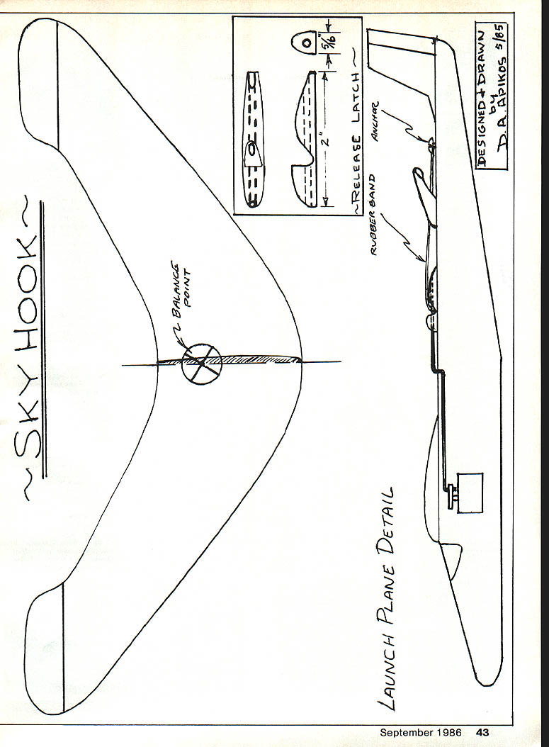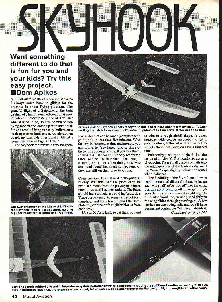 Want something different fun kids Try easy project EDom Apikos AFTER 40 YEARS modeling seems always come back gliders ultimate sheer flying pleasure graceful flight Saiplane tight circling hand-launched creation ajoy behold Unfortunately ol arm isnt what used Ive combined two flying modes come up some real fun result Using easily-built release latch operating servo already board arm gets rest still get launch altitude high want Skyhook represents very inexpen sive glider can made complete paint job less five minutes low investment time money can afford sky hook two three little dudes time lose what last count Ive recovered three out 18 launched rest assume either entertaining kids hand launching somewhere still way China Construction material glider readily available price cant beat Its made polystyrene foam meat trays used supermarkets foam should have thickness e pattern onto some card stock template trace around tem plate get three four glider blanks tray Use X-Acto knife cut out trim rough airfoil shape quick massage coarse sandpaper get gcod contour followed fine grit smooth things out have finished unit Balance pushing straight pin center gravity CG location act pivot point Press small brad-type nails middle/center leading edge until nose dips slightly below horizontal balanced flexibility Styrofoam allows small amount dihedral about half rolled wing Starting center pull wing through thumb forefinger right angle center chord line twisting up slightly wing slides through fingers few strokes wing half youll have permanent continuous elliptical dihedral Continued page 142 Left simple rubberband full-up release system performs flawlessly doesnt requirethe addition anotherservo Right Shown herein neutral position release system readyto loaded anothergroup lightwelghtStyrofoam gliders orother cargo 42 Model Aviation Heres pair Skyhook gliders ready ride release aboard Midwest Lii T Con necting latch release Styrofoam gliders full up servo throw does trick author launches Midwest Lii T Skyhook latch reiease securely holding gilder ready its airlift free flight NO OCR TEXT ESTeem frequencies interstitial RC frequencies. continues .this device approved FCC July 1985 though normal channels no intent no intent now will ever intent infringe frequencies used RC modeler Mr Vargo goes list long history AMA including posts Contest Director Past President Tn-City RC Modelers also included copy correspondence Carl Maroney Special Services Director AMA states ESTeem understand importance RC modeling individual community stand behind AMA its endeavors modeling society EST will cooperate way can mutual benefit safely sharing 1 Basic Construction Begirruers 107 Mm 4995 2 Basic Flight Training Beginners 65 Mm . 4495 3World Model Aviatton 90 Mm 5 4Oshkosh Onerniese 55 Mm 995 SAirplane Funnies 30 Mm 5 SUS Scale Masters 60 Mm 7Warhirds Action 75 Mn 95 SHedge Hoppin Vol 145 Mm 9Which WavisUp 70Mns % lOHedge Hoppin Vol 1140 Mn 5 Rental DeposIt Retail Price TapeK Rental Duration 7 Days After DeliveryK KPayment Chech 110 dansl M 0 Visa MC Card # & K K Eup Date Phone C C 0 D s Availahle hy PhoneK ShippIng 3 75 Foreign Canada Add 10of Total K K Others 15 IL Res Add 7% Tan -K- emyofAviationR&D PO Box 277 K Hazel Crest IL 60429 335-0776 George M Myers 70 Froehlich Farm Rd Hicksville NY 11801 Skyhook/Api kos Continued page 42 wing trimmed flying creas ing hinge line wing tip ball-point pen crease can easily bend up trim tabs crack ing hinge About 1/16 positive trim tab should Youre ready go flying after quick spritz spray paint test sure brand doesnt attack foam along leading edge Release latch wanted latch super-simple quick easy build foolproof think setup comes pretty close see drawing inset plan Basically latch works releasing rubberband held place puslirod using extreme throw already-installed control servos used full up elevator servo allows gliders release relatively slow speed assuming youve dropped low throttle pulled up gentle stall use imagination release latch can used release drop launch host cargotruly sky hook RC Scale/Wischers Continued page 47 FAI Giant Scale subject Giant Scale World Championship brought before ClAM meeting Paris First inclinations downplay another RC event because proliferation added contests recent past Helicopter Pylon Soaring Scale Aero batics Electric RC events World Championship status another new event wasnt greeted great enthusiasm pointed out Dennis Thumpston Scale Committee chairman position losing Scale event now diminished interest Control Line Scale Giant Scale would replace Control Line would become International Contest rather World Championship Five na tions must compete two years maintaln Championship status has possible CL recently Finding five nations Giant Scale would easy matter Transporting Giant Scale alrplanes between continents across oceans may simple Modelers will need build alrplanes disassembled transpor tation small boxes insurmountable task done design stage Basic FAT rules state specifically must some limits placed dimensions weight power Australia offered set provisional rules Paris would need some modification fit within FAT established limits expect rules resubmitted 1987 Australian proposal followed present FAI Scale rules ex cept size weight absence com plexity bonus factor Now national aero clubs convinced Giant Scale just another passing fad would appear can become recognized championship event Strong struts Strength limited flexibility requirements landing gear new Douglas Mallplane Music wire struts look naked some sort covering Bass wood strips routed table saw pro vide snug fit A2-in music wire carved sanded streamlined shape bass strips glued music wire legs using either Wilhold RC-56 Weldbond ce ment Both adhesives have proper ties seeking type application remain slightly flexible after setting up impact rough landings will cause basswood shrouds peel away glues also bond well dissimilar materials Wood will shatter before slips wire fina