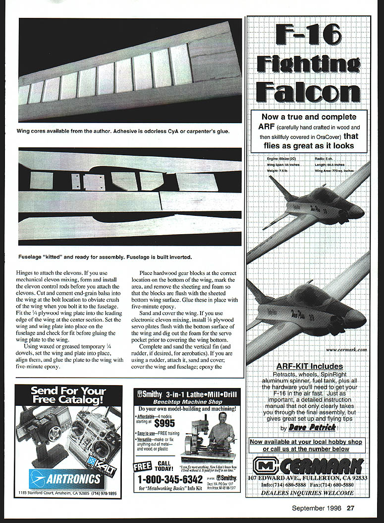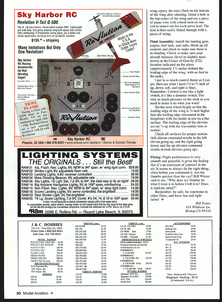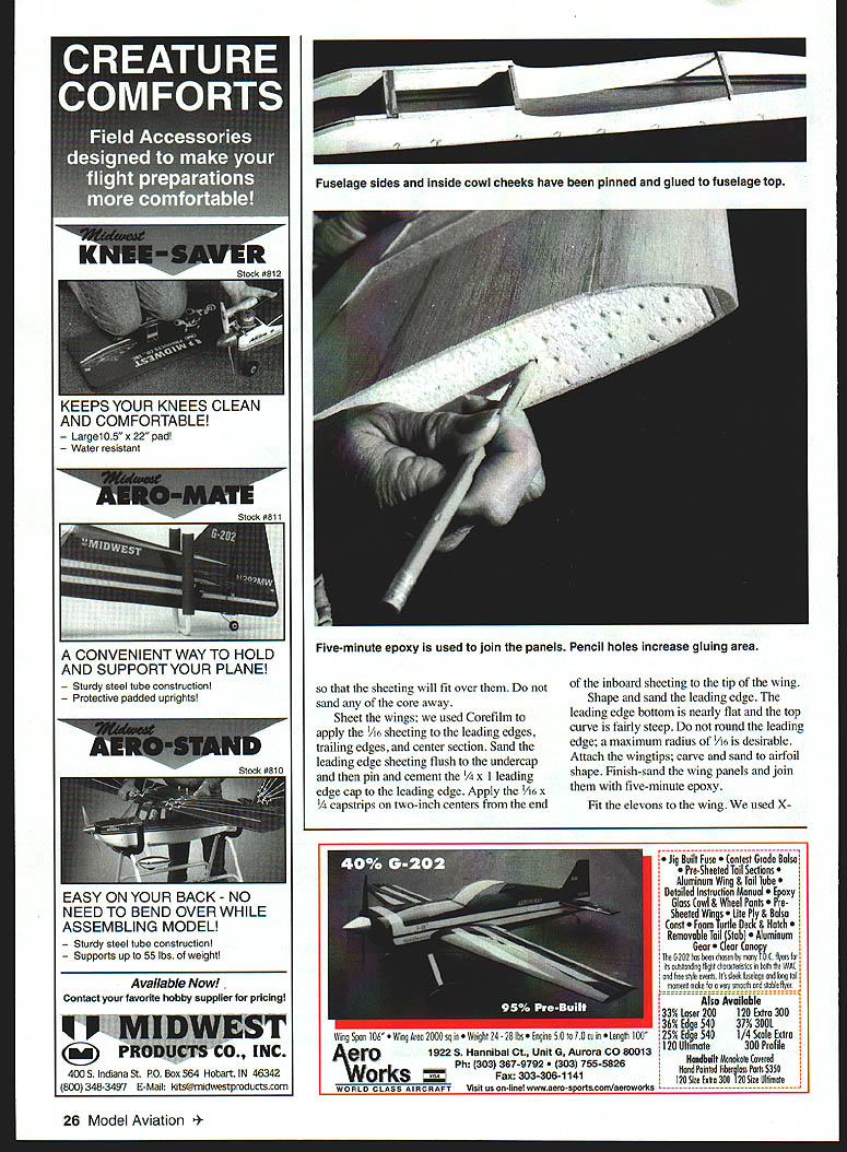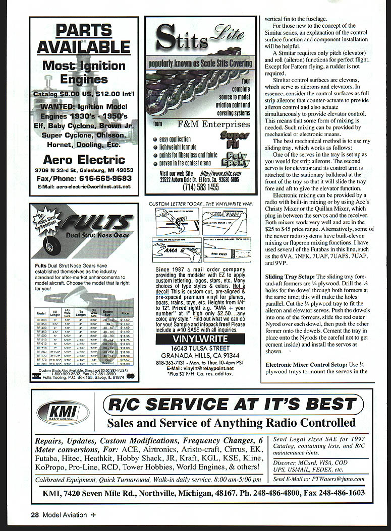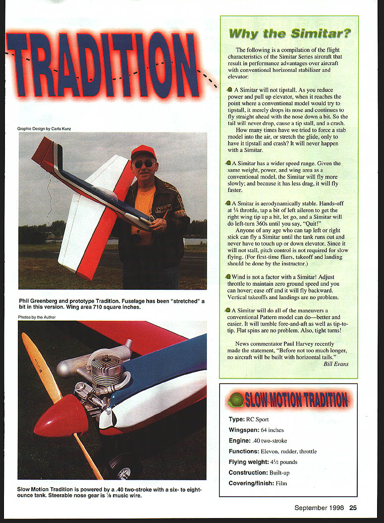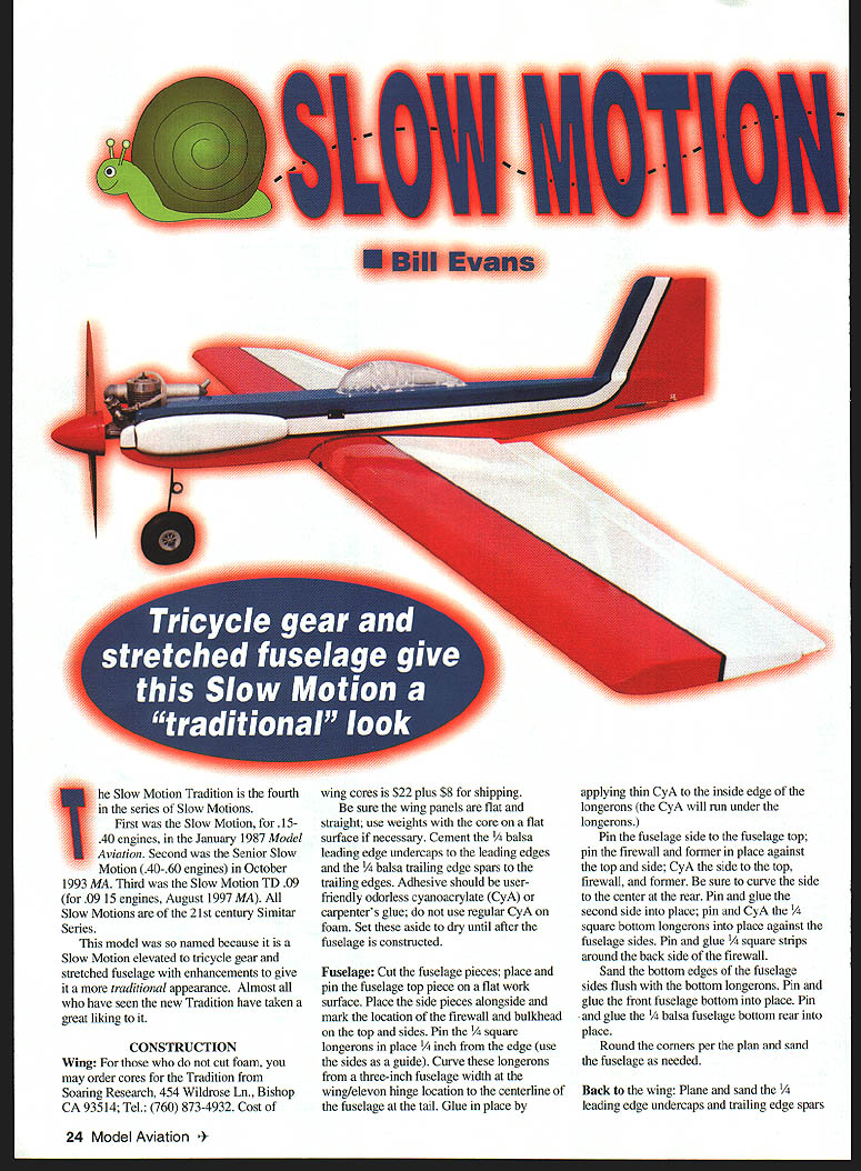 he Slow Motion Tradition fourth series Slow Motions First Slow Motion 1540 engines January 1987 Model Aviation Second Senior Slow Motion 40-60 engines October 1993 MA Third Slow Motion TD 09 09 15 engines August 1997 MA Slow Motions 21st century Simitar Series model named because Slow Motion elevated tricycle gear stretched fuselage enhancements give traditional appearance Almost have seen new Tradition have taken great liking CONSTRUCTION Wing cut foam may order cores Tradition Soaring Research 454 Wildrose Ln Bishop CA 93514 Tel 760 873-4932 Cost wing cores $22 plus $8 shipping sure wing panels flat straight use weights core flat surface necessary Cement a leading edge undercaps leading edges a trailing edge spars trailing edges Adhesive should user friendiy odorless cyanoacrylate CyA carpenters glue use regular CyA foam Set aside dry until after fuselage constructed Fuselage Cut fuselage pieces place pin fuselage top piece flat work surface Place side pieces alongside mark location firewall bulkhead top sides Pin re longerons place edge use sides guide Curve longerons three-inch fuselage width wing/elevon hinge location centerline fuselage tall Glue place applying thin CyA inside edge longerons CyA will run under longerons Pin fuselage side fuselage top pin firewall former place against top side CyA side top firewall former sure curve side center rear Pin glue second side place pin CyA square bottom longerons place against fuselage sides Pin glue re strips around back side firewall Sand bottom edges fuselage sides flush bottom longerons Pin glue front fuselage bottom place Pin glue a fuselage bottom rear place Round corners per plan sand fuselage needed Back wing Plane sand leading edge undercaps trailing edge spars 24 Model Aviation Slmltar following compilation flight characteristics Simitar Series aircraft result performance advantages over aircraft conventional horizontal stabilizer elevator 4 Simitar will tipstall As reduce power pull up elevator reaches point conventional model would try tipstall merely drops its nose continues fly straight ahead nose down bit So tail will never drop cause tip stall crash -4-i fl,, h rI VHow times have tried force stab model air stretch glide have tipstall crash will never happen Simitar Simitar has wider speed range Given same weight power wing area conventional model Simitar will fly slowly because has less drag will fly faster Smitar aerodynamically stable Hands-off ttle tap bit left aileron get right wing tip up bit let go Simitar will left-turn 360s until say Quit Anyone age can tap left right stick can fly Simitar until tank runs out never have touch up down elevator Since will stall pitch control required slow flying first-time fliers takeoff landing should done instructor Wind factor Simitar Adjust throttle maintain zero ground speed can hover ease off will fly backward Vertical takeoffs landings no problem Simitar will maneuvers conventional Pattern model can dobetter easier will tumble fore-and-aft well tip-totip Flat spins no problem Also tight turns News commentator Paul Harvey recently made statement Before too much longer no aircraft will built horizontal tails Bill Evans September 1998 25 Phil Greenberg prototype Tradition Fuselage has stretched bit version Wing area 710 square inches Photos Author Type RC Sport Wingspan 64 inches Engine 40 two-stroke Functions Elevon rudder throttle Flying weight 41/2 pounds Construction Built-up Covering/finish Film Slow Motion Tradition powered 40 two-stroke six- eightounce tank Steerable nose gear 1/8 music wire CONVENIENT WAY TO HOLD AND SUPPORT YOUR PLANE Sturdy steel tube construction Protective padded uprights EASY ON YOUR BACK NO NEED TO BEND OVER WHILE ASSEMBLING MODEL Sturdy steel tube construction Supports up 55 lbs weight Available Now Contact favorite hobby supplier pricing N INC 400 S Indiana St PO Box 564 Hobart IN 46342 800 348-3497 E-Mail Hits@midwestpmductscom sheeting will fit over sand core away Sheet wings used Coreflim apply AM sheeting leading edges trailing edges center section Sand leading edge sheeting flush undercap pin cement /4 x 1 leading edge cap leading edge Apply AM x capstrips two-inch centers end inboard sheeting tip wing Shape sand leading edge leading edge bottom nearly flat top curve fairly steep round leading edge maximum radius /16 desirable Attach wingtips carve sand airfoil shape Finish-sand wing panels join five-minute epoxy Fit elevons wing used X 26 Model Aviation lage sides inside cowl cheeks have pinned glued fuselage top Kt YOU I-I INb ULLAN AND COMFORTABLE LargelOs x 22 pad Water resistant Five-minute epoxy used join panels Pencil holes increase gluing area Jig Built Fuse est Grude Balsa Pre-Sheeted Tail Sections Aluminum Wing & Tail Tube Detailed Instrudiun Manual Epoxy Glass CuwI & Wheel Pants Sheeted Win s Life Ply& Balsa oust uleDatk&Hatch Remuvable Tail IStab inum Gear r Canopy 6202 has heen chases hy TAX flyers its setstasdisg fight aharasterishas hssh MAC sad fsee style eseats Its sleek fuselage sad sag tail mameat make far cesy smeath stable flyer Alse Available 33% Laser 200120 Extra 300 36% Edge 54037% 300L 25% Edge 5401/4 Scale Extra 120 Ultimate 300 Prufile Haudluflt Munukute avered tend Peinled Fiberglass Perfa 5350 120 Size Eel 300 120 Sian Ultimate wing pen lea eee iuee sq as LI La irie U re ne rir srrr ero1922 S Hannibal Ct Unit G Aurora CO 80013 Aw ___ Ph 303 367-9792 755-5826 ___Fax 303-306-1141 WORLD CLASS AIRCRAFT Hinges attach elevons use mechanical elevon mixing form install elevon control rods before attach elevons Cut cement end-grain balsa wing bolt location obviate crush wing bolt fuselage Fit /4 plywood wing plate leading edge wing center section Set wing wing plate place fuselage check fit before gluing wing plate wing Using waxed greased temporary 1/4 dowels set wing plate place align glue plate wing five-minute epoxy Place hardwood gear blocks correct location bottom wing mark area remove sheeting foam blocks flush she