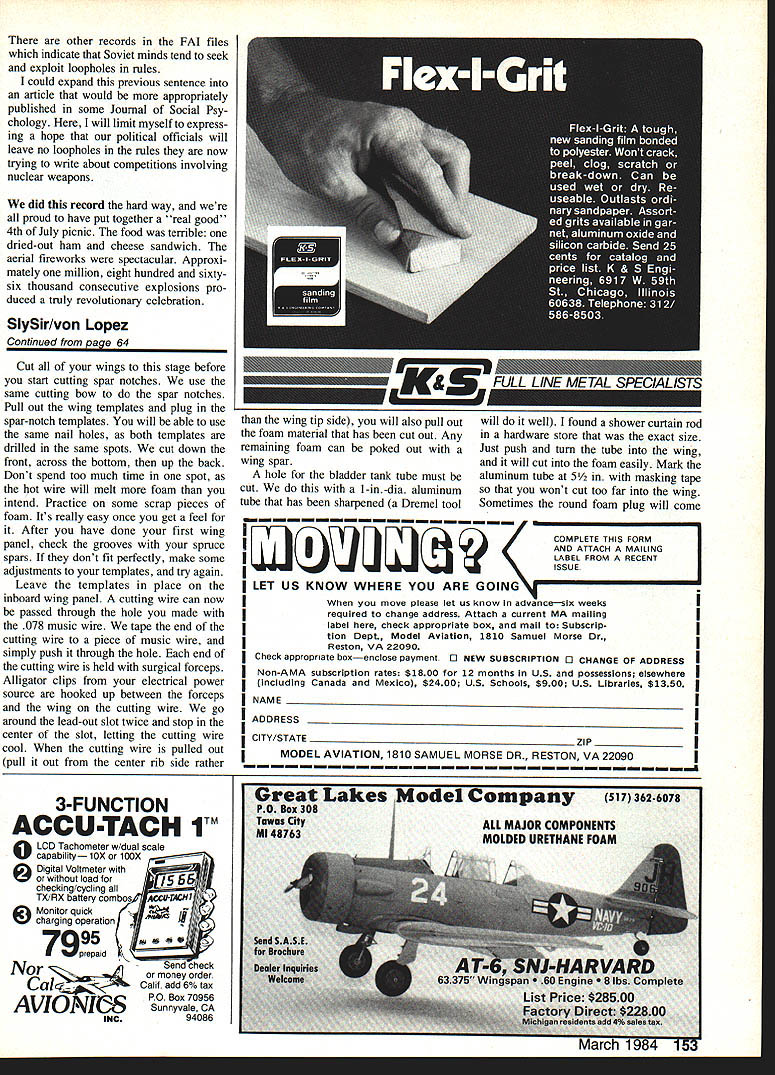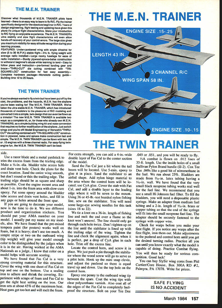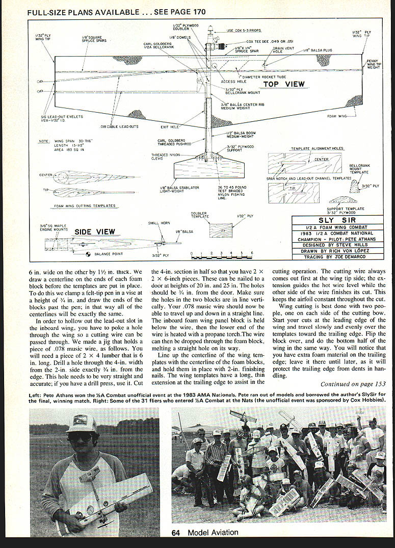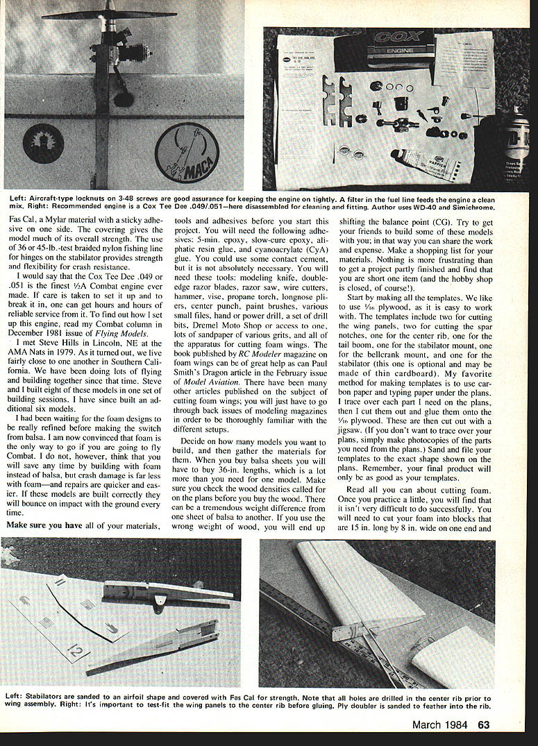 Build model time author says assure yourself always having practice models Shown four six SlySirs built session Foam-winged Combat models arent easier build open framework versions have other advantages THIS IS THE BEST around /2A Combat model has designed date opinion wooden Combat models will fly just well far crash resistance goes foam has over balsa models Thats quite statement believe true have flying Combat since 1965 have designed three Combat mod els have published produced kit can see have fair amount experience Steve Hills designer SlySir has flying since 1955 has also designed several Combat models though first design published great Combat pilots Southern California have long recognized soundness Steves foam designs have used year after year What makes design superior others Its strength light weight answers models come between 5 5 oz 180 sq wing area design features tapering trailing edges airfoil section reduce weight wing tips foam wings cored-out except lead-out slot inboard wing l-in-dia hole bladder tank tube outboard wing rocket tube glued place actually acts spar strengthen center model Foam gets its strength its lightweight solid mass coring-out wing will greatly reduce its strength advantage An other advantage foam wing over balsa structure no open bays can distort covering flexes foam airfoil will remain constant 8-in tapering front spar helps hold center section together absorbs vibration engine cover models Left particular model No 9 first Fresno CA meet October 23 1983 Outboard wing stripes done tempera waterbased paintto serve both decoration tip weight Right Designer Steve Hills holds SlySir No 6 against Pacific Ocean background beach flying site Playa del Rey Steve developed design help promote AA Combat encourage limited budgets A9 Mrv-iI Aviation Left Aircraft-type locknuts 3-48 screws good assurance keeping engine tightly filter fuel line feeds engine clean mix Right Recommended engine Cox Tee Dee 049/051here disassembled cleaning fitting Author uses WD-40 Simichrome Fas Cal Mylar material sticky adhe sive side covering gives model much its overall strength use 36 45-lb-test braided nylon fishing line hinges stabilator provides strength flexibility crash resistance would say Cox Tee Dee 049 051 finest Combat engine ever made care taken set up break can get hours hours reliable service find out set up engine read Combat column December 1981 issue Flying Models met Steve Hills Lincoln NE AMA Nats 1979 As turned out live fairly close another Southern Cali fornia have doing lots flying building together since time Steve built eight models set building sessions have since built ad ditional six models waiting foam designs really refined before making switch balsa am now convinced foam way go going fly Combat however think will save time building foam instead balsa crash damage far less foamand repairs quicker eas ier models built correctly will bounce impact ground time Make sure have materials tools adhesives before start project will need following adhe sives 5-mm epoxy slow-cure epoxy ali phatic resin glue cyanoacrylate CyA glue could use some contact cement absolutely necessary will need tools modeling knife doubleedge razor blades razor saw wire cutters hammer vise propane torch longnose pli ers center punch paint brushes various small files hand power drill set drill bits Dremel Moto Shop access lots sandpaper various grits apparatus cutting foam wings book published RC Modeler magazine foam wings can great help can Paul Smiths Dragon article February issue Model Aviation have other articles published subject cutting foam wings will just have go through back issues modeling magazines order thoroughly familiar different setups Decide models want build gather materials buy balsa sheets will have buy 36-in lengths lot need model Make sure check wood densities called plans before buy wood can tremendous weight difference sheet balsa another use wrong weight wood will end up shifting balance point CG Try get friends build some models way can share work expense Make shopping list materials Nothing frustrating get project partly finished find short item hobby shop closed course Start making templates like use /6 plywood easy work templates include two cutting wing panels two cutting spar notches center rib tail boom stabilator mount bellcrank mount stabilator optional may made thin cardboard favorite method making templates use car bon paper typing paper under plans trace over part need plans cut out glue onto 1/6 plywood cut out jigsaw dont want trace over plans simply make photocopies parts need plans Sand file templates exact shape shown plans Remember final product will good templates Read can about cutting foam Once practice little will find isnt very difficult successfully will need cut foam blocks 15 long 8 wide end Left Stabilators sanded airfoil shape covered Fas Cal strength Note holes drilled center rib prior wing assembly Right Its important test-fit wing panels center rib before gluing Ply doubler sanded feather rib March 1984 63 FULL-SIZE PLANS AVAILABLE . SEE PAGE 170 1/32 PLYWOOD DOUBLER __ USE COO 5-3 PROPS I/B DOWELS COO TEE DEE 049 OR 051 TrP /4DRAIN VENT SPRUCE SPAR-IDLEI/R BALSA PLUS 3 V DIAMETER ROCKET TUBE ACCESS HOLE TOP VIEW 3/3D PLY BELLCRANK MOUNT 015 LESS-OUT EYELETS IDA I/3D ID DIR CABLE LEAD OUTSEDIT I-IDLE NOTE WING SPAN 30-7/IS LENUTH 13-I/O AREA NT SO IN CENTER-,2I 27szzsaTIP- CARL DOLOBERS THREADED PUOBROD THREADED NYLON CLEVIS I/B BALSA STABILATOR LISHY-WEISHY 3/B BALSA CENTER RIB MEDIUM WEISHT FOAM WINS 1/2 BALSA BOOM MEDIUM-WEISHY 3/3D PLYWOOD SUPPORT 36 TO 45 POUND TEST BRAIDED NYLON FISHINS LINE FOAM WIND CUTTINS_TEMPLATES DOUBLER TEMPLATE 3/B SO MAPLE ENSINE MOUNTS / SIDE VIEW BALANCE POINT SMALL HORN OW BALSA 3/3D PLY I/3D PLY 0 D2456 TEMPLATE ALIONMENT HOLES CENTER BELLCRANK MOUNT TEMPLATE SPAR NOTCH AND LEAD-OUT CHANNEL TEMPLATEU 3/3D PLY TIP SUPPORT TEMPLATE 3/3D PLYWOOD SLY SIR 1/2 FOAM WING COMBAT 1983 I/2A COMBAT NAT