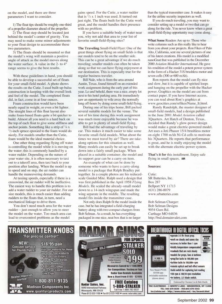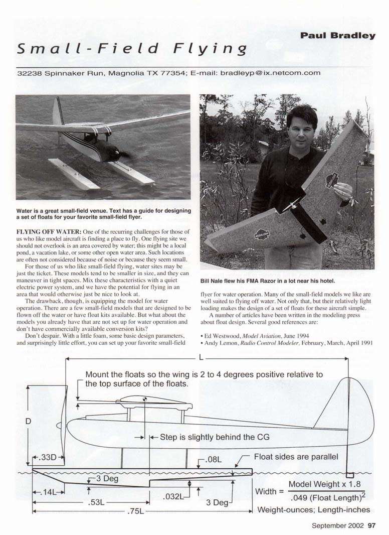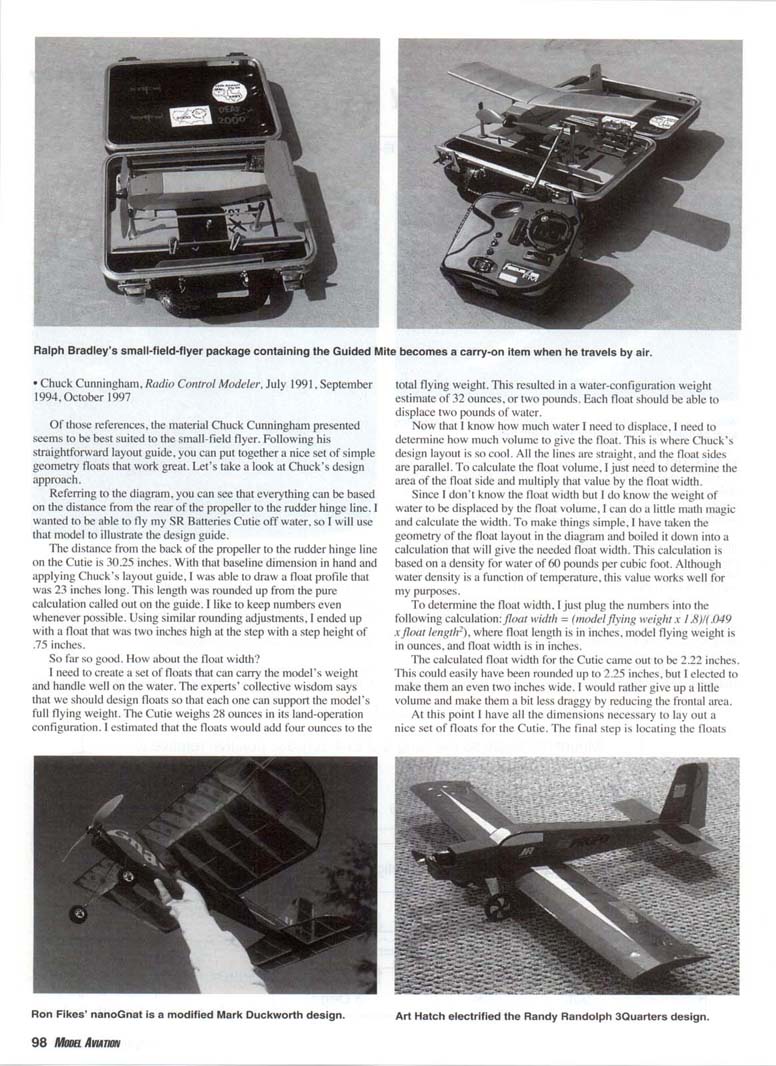 Water is a great small-field venue. Text has a guide for designing a set of floats for your favorite small-field flyer. FLYING OFF WATER: One of the recurring challenges for those of us who like model aircraft is finding a place to fly. One flying site we should not overlook is an area covered by water; this might be a local pond, a vacation lake, or some other open water area. Such locations are often not considered because of noise or because they seem small. For those of us who like small-field flying, water sites may be just the ticket. These models tend to be smaller in size, and they can maneuver in tight spaces. Mix these characteristics with a quiet electric power system, and we have the potential for flying in an area that would otherwise just be nice to look at. The drawback, though, is equipping the model for water operation. There are a few small-field models that are designed to be flown off the water or have float kits available. But what about the models you already have that are not set up for water operation and don't have commercially available conversion kits? Don't despair. With a little foam, some basic design parameters, and surprisingly little effort, you can set up your favorite small-field Bill Nale flew his FMA Razor in a lot near his hotel. flyer for water operation. Many of the small-field models we like are well suited to flying off water. Not only that, but their relatively light loading makes the design of a set of floats for these aircraft simple. A number of articles have been written in the modeling press about float design. Several good references are: • Ed Westwood, Model Aviation, June 1994 • Andy Lemon, Radio Control Modeler, February, March, April 1991 Mount the floats so the wing is 2 to 4 degrees positive relative to the top surface of the floats. Step is slightly behind the CG Float sides are parallel Model Weight x 1.8 .049 (Float Length)2 Weight-ounces; Length-inches. Ralph Bradley's small-field-flyer package containing the Guided Mite becomes a carry-on item when he travels by air. • Chuck Cunningham, Radio Control Modeler, July 1991, September 1994, October 1997 Of those references, the material Chuck Cunningham presented seems to be best suited to the small-field flyer. Following his straightforward layout guide, you can put together a nice set of simple geometry floats that work great. Let's take a look at Chuck's design approach. Referring to the diagram, you can see that everything can be based on the distance from the rear of the propeller to the rudder hinge line. I wanted to be able to fly my SR Batteries Cutie off water, so I will use that model to illustrate the design guide. The distance from the back of the propeller to the rudder hinge line on the Cutie is 30.25 inches. With that baseline dimension in hand and applying Chuck's layout guide, I was able to draw a float profile that was 23 inches long. This length was rounded up from the pure calculation called out on the guide. I like to keep numbers even whenever possible. Using similar rounding adjustments, I ended up with a float that was two inches high at the step with a step height of .75 inches. So far so good. How about the float width? I need to create a set of floats that can carry the model's weight and handle well on the water. The experts' collective wisdom says that we should design floats so that each one can support the model's full flying weight. The Cutie weighs 28 ounces in its land-operation configuration. 1 estimated that the floats would add four ounces to the total flying weight. This resulted in a water-configuration weight estimate of 32 ounces, or two pounds. Each float should be able to displace two pounds of water. Now that I know how much water I need to displace, I need to determine how much volume to give the float. This is where Chuck's design layout is so cool. All the lines are straight, and the float sides are parallel. To calculate the float volume. I just need to determine the area of the float side and multiply that value by the float width. Since I don't know the float width but I do know the weight of water to be displaced by the float volume. I can do a little math magic and calculate the width. To make things simple, I have taken the geometry of the float layout in the diagram and boiled it down into a calculation that will give the needed float width. This calculation is based on a density for water of 60 pounds per cubic foot. Although water density is a function of temperature, this value works well for my purposes. To determine the float width, I just plug the numbers into the following calculation: float width - (model flying weightx 1.8)/(.049 xfloat length-), where float length is in inches, model flying weight is in ounces, and float width is in inches. The calculated float width for the Cutie came out to be 2.22 inches. This could easily have been rounded up to 2.25 inches, but I elected to make them an even two inches wide. I would rather give up a little volume and make them a bit less draggy by reducing the frontal area. At this point I have all the dimensions necessary to lay out a nice set of floats for the Cutie. The final step is locating the floats Ron Pikes' nanoGnat is a modified Mark Duckworth design. Art Hatch electrified the Randy Randolph SQuarters design. on the model, and there are three parameters I want to consider. 1) The float tips should be roughly one-third of a propeller diameter ahead of the propeller. 2) The float step should be located just behind the model's center of gravity. You may need to make some minor adjustments to your float design to accommodate these two parameters. 3) The floats should be mounted so that the model's wing will maintain a positive angle of attack as the model moves along the water surface. A value in the 2- to 4° range seems to give the best results. With these guidelines in hand, you should be able to develop a successful set of floats for your small-field model. A photo 