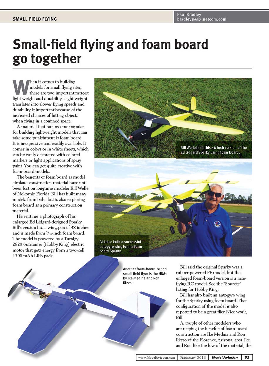 Bill also built a successful autogyro wing for his foam-board Sparky.Another foam-board-based small- eld flyer is the HIM1 by Ike Medina and Ron Rizzo.Small- eld flying and foam board go togetherW hen it comes to building models for small fl ying sites, there are two important factors: light weight and durability. Light weight translates into slower fl ying speeds and durability is important because of the increased chances of hitting objects when fl ying in a confi ned space. A material that has become popular for building lightweight models that can take some punishment is foam board. It is inexpensive and readily available. It comes in colors or in white sheets, which can be easily decorated with colored markers or light applications of spray paint. You can get quite creative with foam-board models. The benefi ts of foam board as model airplane construction material have not been lost on longtime modeler Bill Welle of Nokomis, Florida. Bill has built many models from balsa but is also exploring foam board as a primary construction material. He sent me a photograph of his enlarged Ed Lidgard-designed Sparky. Bill’s version has a wingspan of 48 inches and is made from 3/16-inch foam board. The model is powered by a Turnigy 2820 outrunner (Hobby King) electric motor that gets energy from a two-cell 1300 mAh LiPo pack. Bill said the original Sparky was a rubber-powered FF model, but the enlarged foam-board version is a nice-fl ying RC model. See the “Sources” listing for Hobby King. Bill has also built an autogyro wing for the Sparky using foam board. That confi guration of the model is also reported to be a great fl ier. Nice work, Bill! A couple of other modelers who are reaping the benefi ts of foam-board construction are Ike Medina and Ron Rizzo of the Florence, Arizona, area. Ike and Ron like the low of the material, the Bill Welle built this 48-inch version of the Ed Lidgard Sparky using foam board.